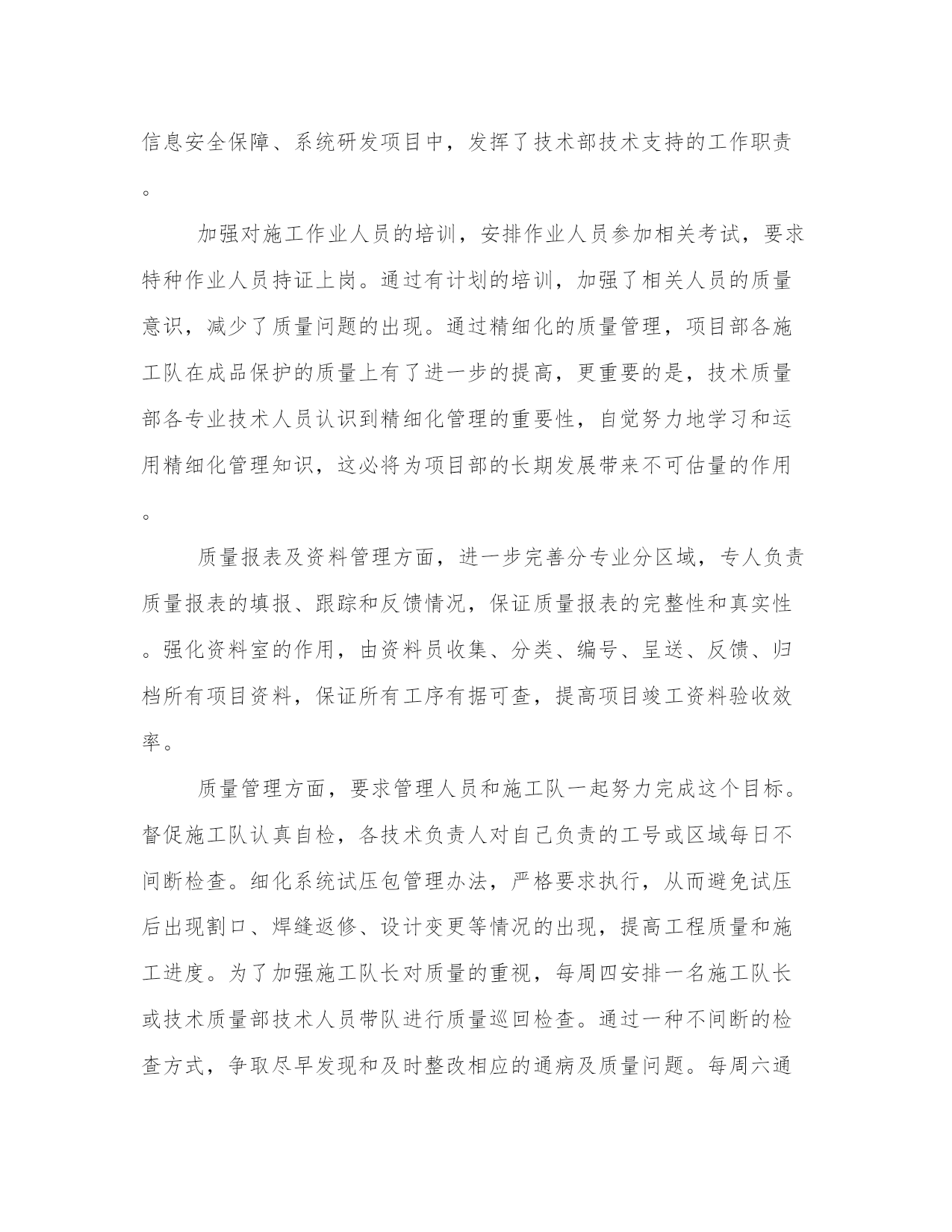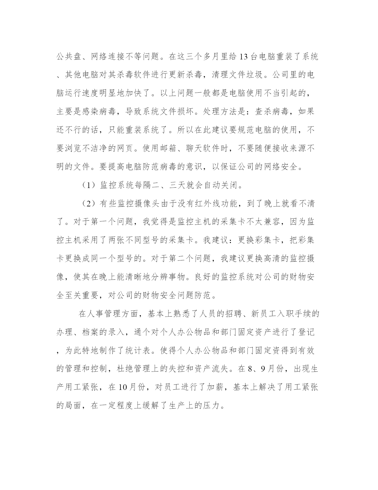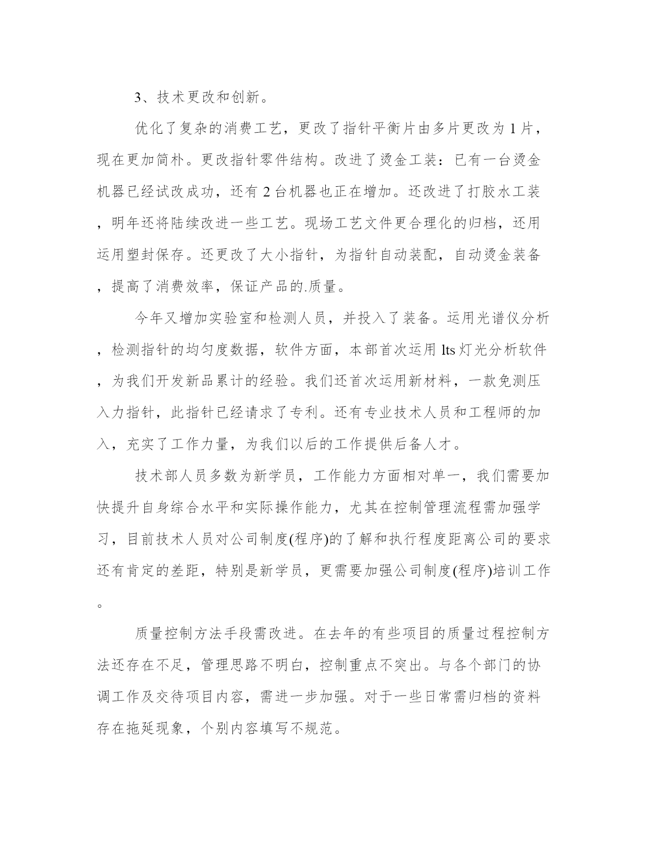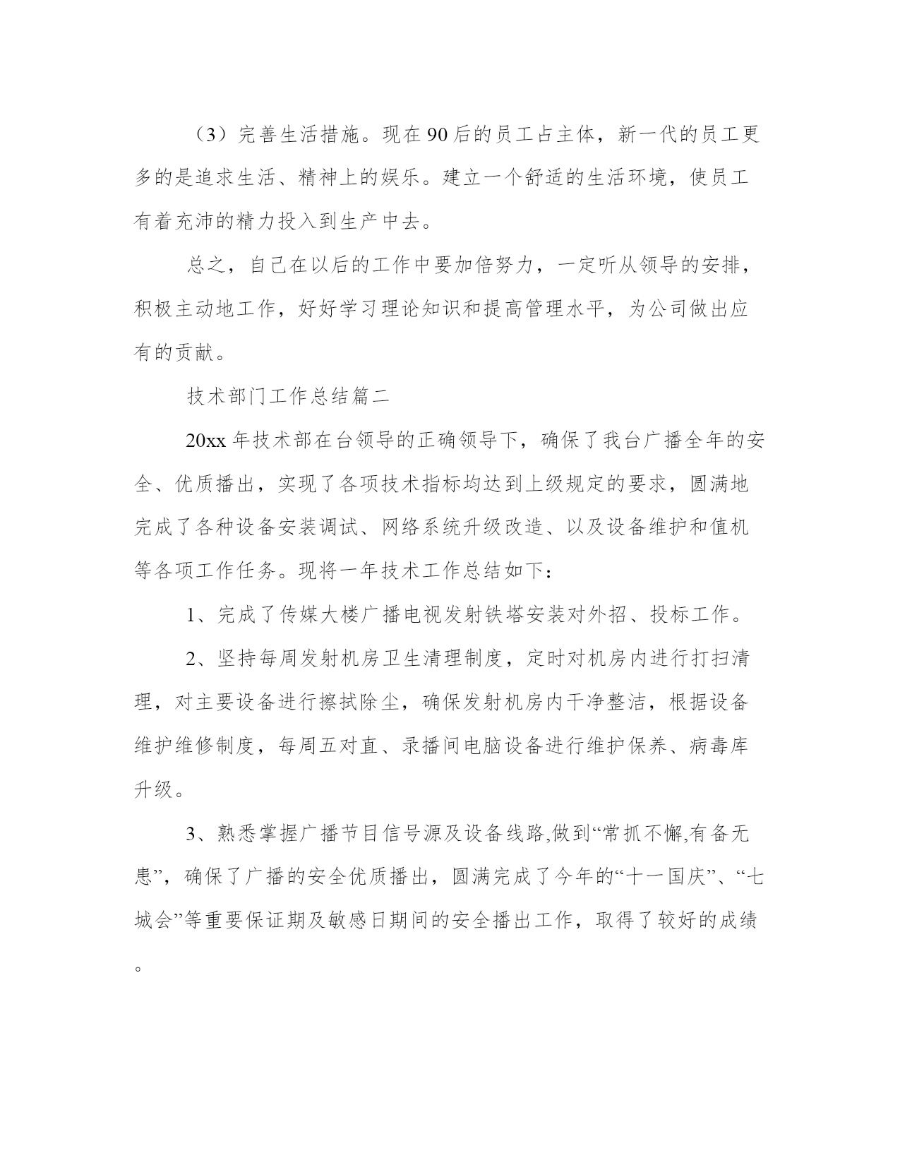 最新技术部门工作总结(通用19篇)总结是对我们所经历和所学习的内容进行概括和归纳,具有重要的学习和提升作用。写一篇完美的总结需要注意清晰的结构和条理,让读者能够理解和接受你的观点。小编为大家准备了一些优秀的总结范文,希望能够给大家提供一些启示和思路。技术部门工作总结篇一时间过得很快,xx—xx年已接近尾声,回顾从今年8月加入xx公司这个大家庭以来,在3个多月的时间里,慢慢地熟悉了本职的工作以及陌生环境的磨合,努力提高理论知识,踏实工作认真完成领导交办的各项工作任务,使自己渐渐的融入和适应到新的工作环境中。过去的几个月里在领导和同事们的悉心关怀和支持帮助下,通过自身的不懈努力,在思想、学习和工作等方面取得了新的进步。总结如下:刚进入公司的时候,对公司的服务器、监控系统以及局域网不是很熟悉,给工作带来了很多不便,渐渐在发现自己大脑对相关理论知识储量不够,通过到xx图书管查阅相关的书籍、网上查阅相关的资料以及向同事虚心请教,对服务器、监控系统以及局域网慢慢熟悉起来了,同时也发现了在it方面存在诸多问题。由于前任同事的原因,公司里多数电脑好久没有维护了,都出现电脑系统反应慢、接收不了邮件、k3系统无法连接服务器、访问不了公共盘、网络连接不等问题。在这三个多月里给13台电脑重装了系统、其他电脑对其杀毒软件进行更新杀毒,清理文件垃圾。公司里的电脑运行速度明显地加快了。以上问题一般都是电脑使用不当引起的,主要是感染病毒,导致系统文件损坏。处理方法是:查杀病毒,如果还不行的话,只能重装系统了。所以在此建议要规范电脑的使用,不要浏览不洁净的网页。使用邮箱、聊天软件时,不要随便接收来源不明的文件。要提高电脑防范病毒的意识,以保证公司的网络安全。(1)监控系统每隔二、三天就会自动关闭。(2)有些监控摄像头由于没有红外线功能,到了晚上就看不清了。对于第一个问题,我觉得是监控主机的采集卡不太兼容,因为监控主机采用了两张不同型号的采集卡。我建议:更换彩集卡,把彩集卡更换成同一个型号的。对于第二个问题,我建议更换高清的监控摄像,使其在晚上能清晰地分辨事物。良好的监控系统对公司的财物安全至关重要,对公司的财物安全问题防范。在人事管理方面,基本上熟悉了人员的招聘、新员工入职手续的办理、档案的录入,通个对个人办公物品和部门固定资产进行了登记,为此特地制作了统计表。使得个人办公物品和部门固定资得到有效的管理和控制,杜绝管理上的失控和资产流失。在8、9月份,出现生产用工紧张,在10月份,对员工进行了加薪,基本上解决了用工紧张的局面,在一定程度上缓解了生产上的压力。宿舍管理、办公用品采购,在许主管的帮助下,也有序进行。在宿舍方面,部份员工的卫生意识不强,室内卫生脏、乱、差。走廊过道处垃圾随处可见。可见,员工的卫生意识有待加强。刚接手办公用品采购,对控制办公物品的质量、数量不是太理想,今后在这个问题上会稍加注意。在3个多月中,也深深地认识到自己的不足:(1)理论知识准备不够。在工作中,现学现用,忙于查资料,浪费大量的工作时间。(2)工作思路不清晰,系统性不强。在工作任务繁忙的时候,工作容易出现混乱,有时候不知所措。(3)还需建立自我,追求小我,达到忘我。树立自己的目标,用公司的发展来实现个人的理想,使个人的利益与公司的利益紧密结合。对公司今后发展的几点建议:(1)用公司的管理制度来对公司管理。要使公司的管理理念深入人心,使员工自觉尊守公司的管理制度。而不是实行“家长式”管理:紧紧依靠管理者的个人威信和道德来对员工的管理。(2)建设企业核心文化。多开展活动,让员工了解对企业发展史的,组织向老员工、优秀员工学习,激励员工奋发向上。(3)完善生活措施。现在90后的员工占主体,新一代的员工更多的是追求生活、精神上的娱乐。建立一个舒适的生活环境,使员工有着充沛的精力投入到生产中去。总之,自己在以后的工作中要加倍努力,一定听从领导的安排,积极主动地工作,好好学习理论知识和提高管理水平,为公司做出应有的贡献。技术部门工作总结篇二20xx年技术部在台领导的正确领导下,确保了我台广播全年的安全、优质播出,实现了各项技术指标均达到上级规定的要求,圆满地完成了各种设备安装调试、网络系统升级改造、以及设备维护和值机等各项工作任务。现将一年技术工作总结如下:1、完成了传媒大楼广播电视发射铁塔安装对外招、投标工作。2、坚持每周发射机房卫生清理制度,定时对机房内进行打扫清理,对主要设备进行擦拭除尘,确保发射机房内干净整洁,根据设备维护维修制度,每周五对直、录播间电脑设备进行维护保养、病毒库升级。3、熟悉掌握广播节目信号源及设备线路,做到“常抓不懈,有备无患”,确保了广播的安全优质播出,圆满完成了今年的“十一国庆”、“七城会”等重要保证期及敏感日期间的安