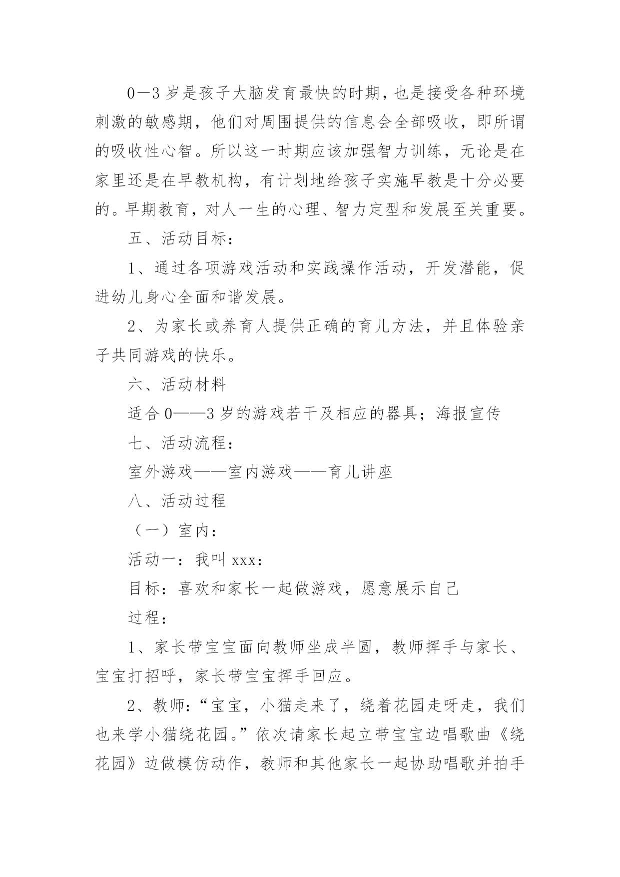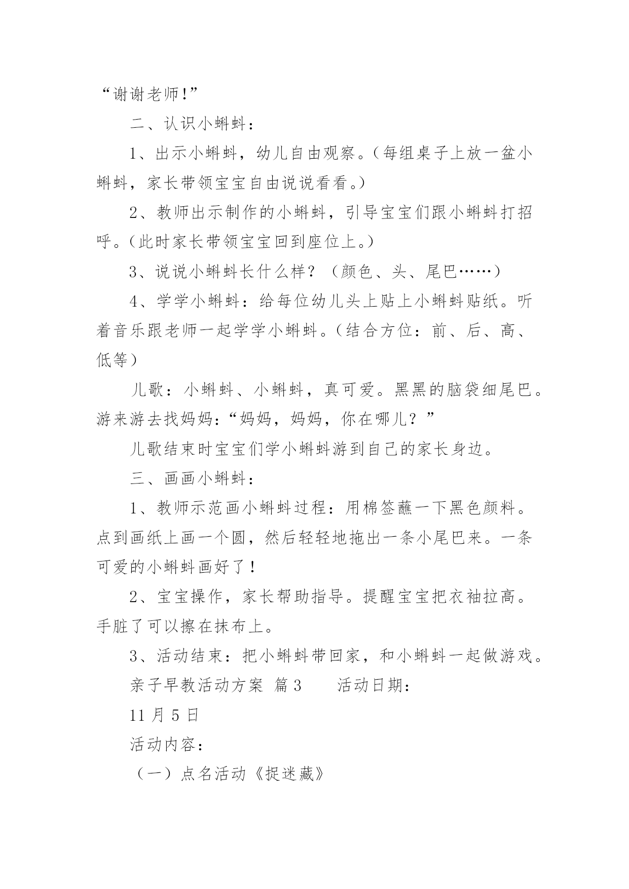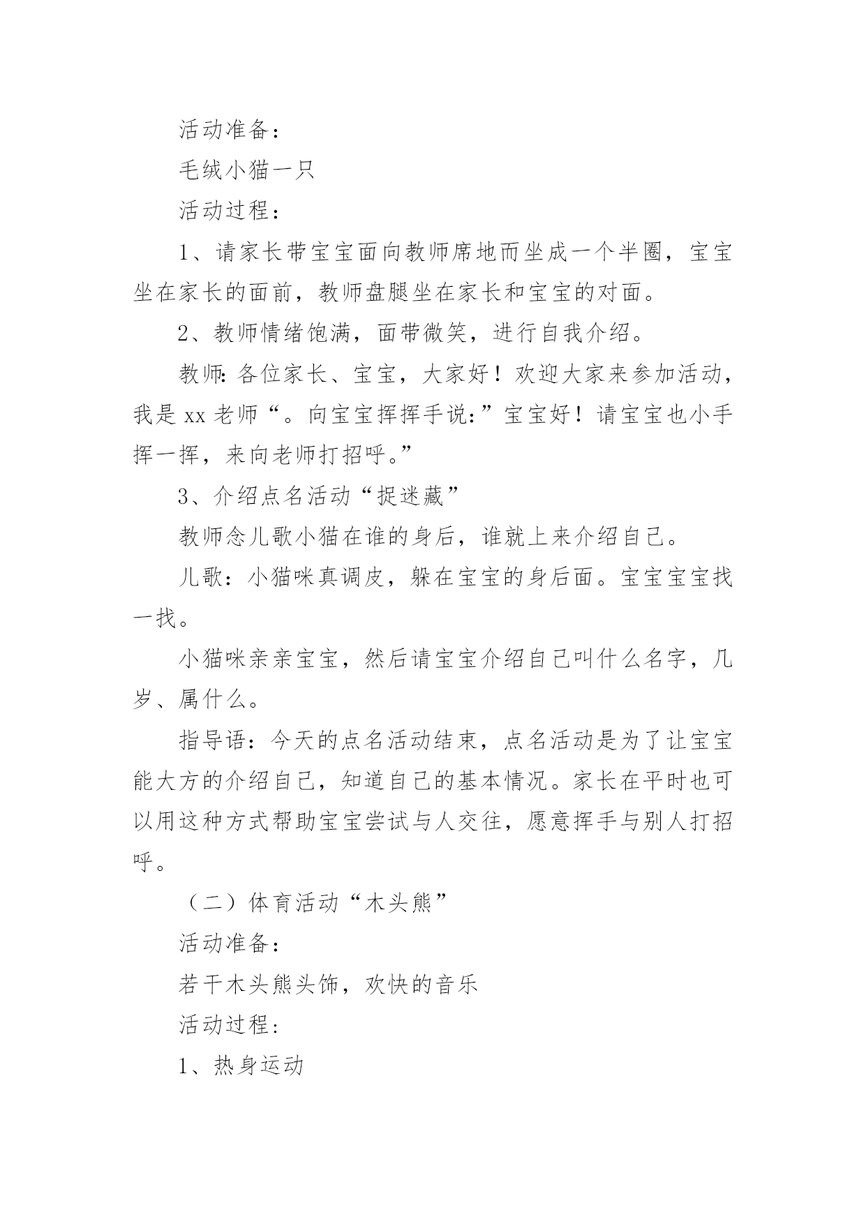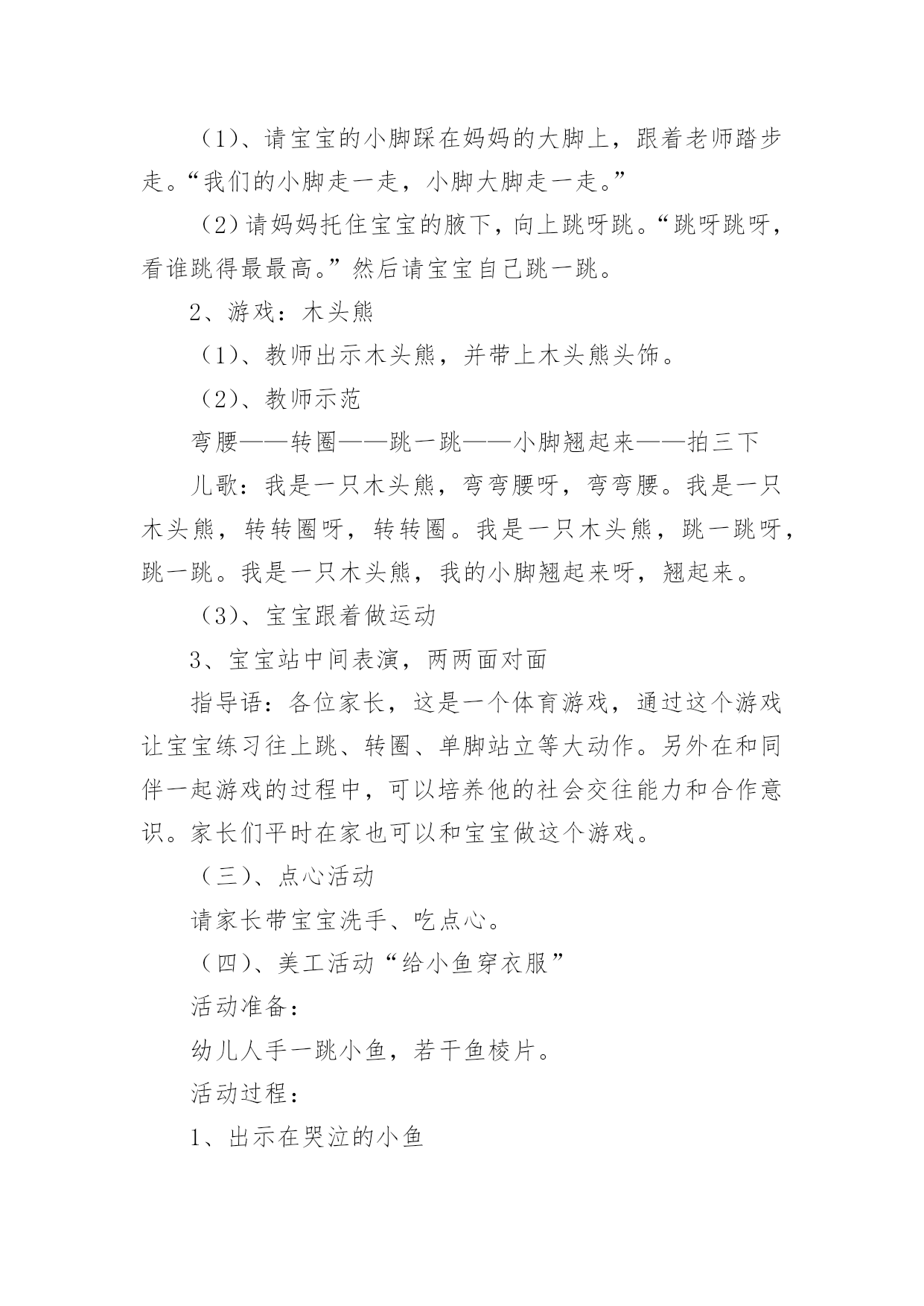 亲子早教活动方案亲子早教活动方案(精选11篇)为有力保证活动开展的质量水平,时常需要预先制定活动方案,活动方案可以对一个活动明确一个大概的方向。写活动方案需要注意哪些格式呢?下面是小编收集整理的亲子早教活动方案,供大家参考借鉴,希望可以帮助到有需要的朋友。亲子早教活动方案篇1“欢度中秋、情系你我”亲子游戏活动[活动时间]20xx年9月xx日(或9月29日)下午:6:00――8:00[活动场地]各班教室[活动形式]班级集体活动[邀约对象]幼儿园内全体家长及孩子[活动特点]此次活动主要籍中秋团圆节,增进家园互动和沟通,提升家长满意度。[物品准备]活动签到表、笔、照相机、DV、饮用水、一次性水杯、水果、月饼、果盘、眼罩、灯谜[活动流程]A、家长入园签到B、班级老师致辞,说明一下本次活动的意义及活动的流程。C、活动开始活动导入:妈妈故事会邀请一位妈妈给幼儿讲嫦娥奔月的故事,作为活动的导入。游戏一《齐心协力吃水果》1、请妈妈们手中有拿一个装有水果的果盘,站在教室内所指定的位置。2、将爸爸的眼睛蒙上,抱着孩子原地转三圈,爸爸在宝宝语言的提醒下去找妈妈,并吃到果盘中的水果,时间用时最短的一组为胜利者。游戏规则:1、参赛选手是全家三口,家庭成员不到三位的,班级老师可以参与进去。2、爸爸妈妈不要发出任何声音,任何人不要碰水果。3、4个家庭为一组,进行比赛。游戏二《猜灯谜》1、老师提前将若干灯谜藏在教室的各个角落2、请宝宝们站在教室中间,告诉宝宝们在教室内去寻找灯谜(并拿一个写有灯谜的卡片,让宝宝进行观察,知道去找什么样子的卡片)(1)有时落在山腰,有时挂在树梢,有时像圆盘,有时像镰刀---月亮(2)中秋归来---八归(3)嫦娥下凡---月季(4)中秋菊开---花好月圆(5)明月照我还---归有光(6)举杯邀明月---赏光(7)举头望明月---当归(药名)3、找到后,交到自己的爸爸妈妈的手中,请爸爸妈妈去猜灯谜,用时最短的家庭获胜。游戏结束:1、将准备好的水果和月饼切好,请家长和小朋友分享。2、全家福合影。3、结束本次的活动。亲子早教活动方案篇2活动名称:可爱的小蝌蚪活动目标:1、观察认识小蝌蚪的外形特征。2、愿意跟着老师一起说说、跳跳、画画,感受幼儿园活动的快乐。活动准备:供宝宝观察的小蝌蚪若干、小蝌蚪音乐、黑色即时贴剪的小蝌蚪若干、黑色颜料、棉签、抹手布、糖果若干。活动过程:一、问候游戏:(家长带领宝宝围成马蹄形入座)1、认识老师,跟老师打招呼。引导宝宝愿意说:“老师好!”2、说说自己的名字。鼓励宝宝大声说出自己的名字:“我叫xxx。”给宝宝发糖果奖励,并引导宝宝学说礼貌用语:“谢谢老师!”二、认识小蝌蚪:1、出示小蝌蚪,幼儿自由观察。(每组桌子上放一盆小蝌蚪,家长带领宝宝自由说说看看。)2、教师出示制作的小蝌蚪,引导宝宝们跟小蝌蚪打招呼。(此时家长带领宝宝回到座位上。)3、说说小蝌蚪长什么样?(颜色、头、尾巴……)4、学学小蝌蚪:给每位幼儿头上贴上小蝌蚪贴纸。听着音乐跟老师一起学学小蝌蚪。(结合方位:前、后、高、低等)儿歌:小蝌蚪、小蝌蚪,真可爱。黑黑的脑袋细尾巴。游来游去找妈妈:“妈妈,妈妈,你在哪儿?”儿歌结束时宝宝们学小蝌蚪游到自己的家长身边。三、画画小蝌蚪:1、教师示范画小蝌蚪过程:用棉签蘸一下黑色颜料。点到画纸上画一个圆,然后轻轻地拖出一条小尾巴来。一条可爱的小蝌蚪画好了!2、宝宝操作,家长帮助指导。提醒宝宝把衣袖拉高。手脏了可以擦在抹布上。3、活动结束:把小蝌蚪带回家,和小蝌蚪一起做游戏。亲子早教活动方案篇3活动日期:11月5日活动内容:(一)点名活动《捉迷藏》活动准备:毛绒小猫一只活动过程:1、请家长带宝宝面向教师席地而坐成一个半圈,宝宝坐在家长的面前,教师盘腿坐在家长和宝宝的对面。2、教师情绪饱满,面带微笑,进行自我介绍。教师:各位家长、宝宝,大家好!欢迎大家来参加活动,我是xx老师“。向宝宝挥挥手说:”宝宝好!请宝宝也小手挥一挥,来向老师打招呼。”3、介绍点名活动“捉迷藏”教师念儿歌小猫在谁的身后,谁就上来介绍自己。儿歌:小猫咪真调皮,躲在宝宝的身后面。宝宝宝宝找一找。小猫咪亲亲宝宝,然后请宝宝介绍自己叫什么名字,几岁、属什么。指导语:今天的点名活动结束,点名活动是为了让宝宝能大方的介绍自己,知道自己的基本情况。家长在平时也可以用这种方式帮助宝宝尝试与人交往,愿意挥手与别人打招呼。(二)体育活动“木头熊”活动准备:若干木头熊头饰,欢快的音乐活动过程:1、热身运动(1)、请宝宝的小脚踩在妈妈的大脚上,跟着老师踏步走。“我们的小脚走一走,小脚大脚走一走。”(2)请妈妈托住宝宝的腋下,向上跳呀跳。“跳呀跳呀,看谁跳得最最高。”然后请宝宝自己跳一跳。2、游戏:木头熊(1)、教师出示木头熊,并带上木头熊头饰。(2)、教师示范弯腰