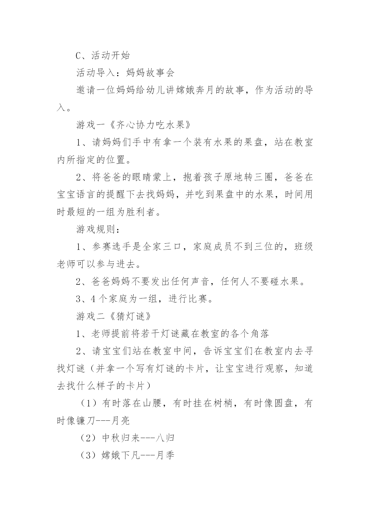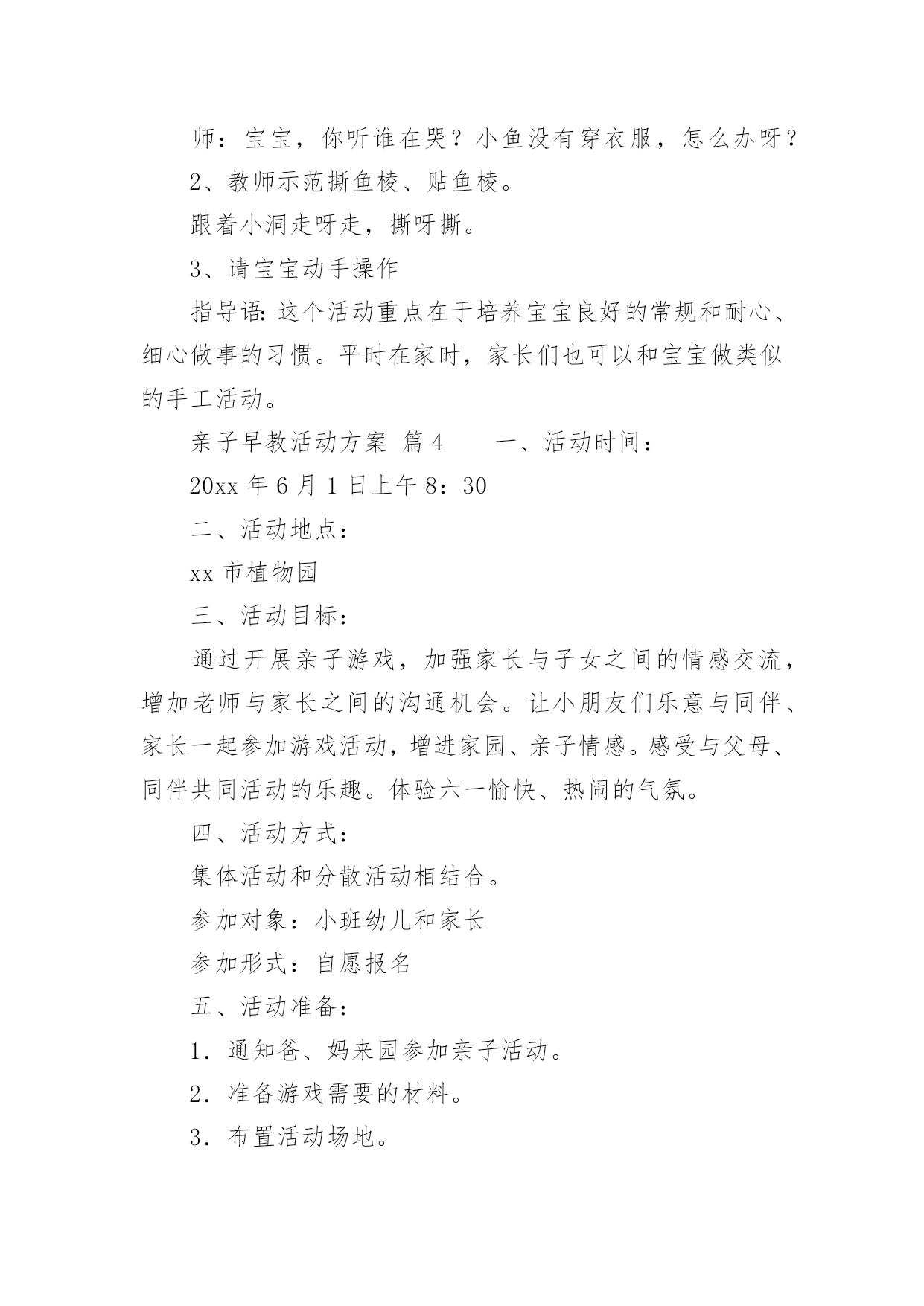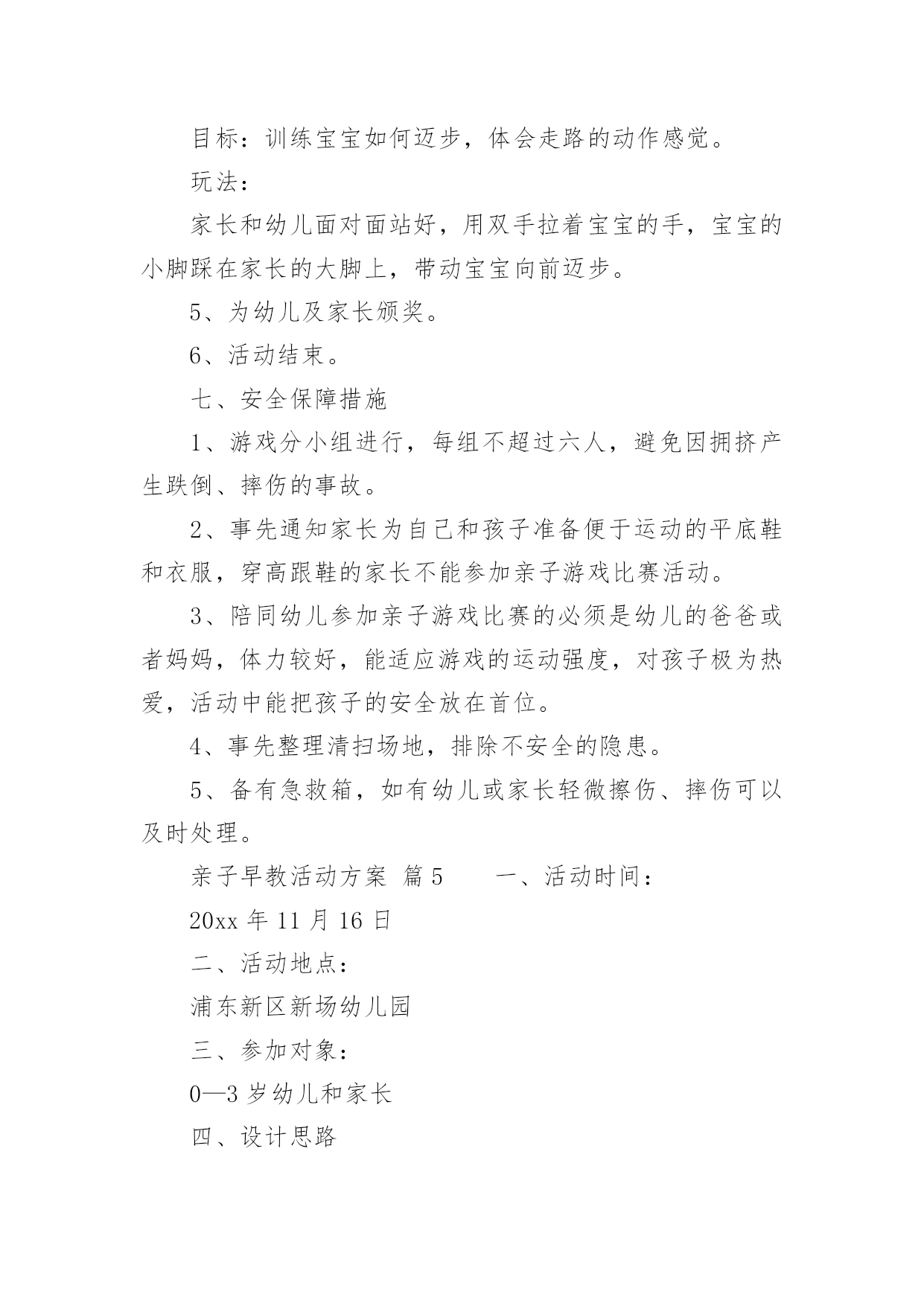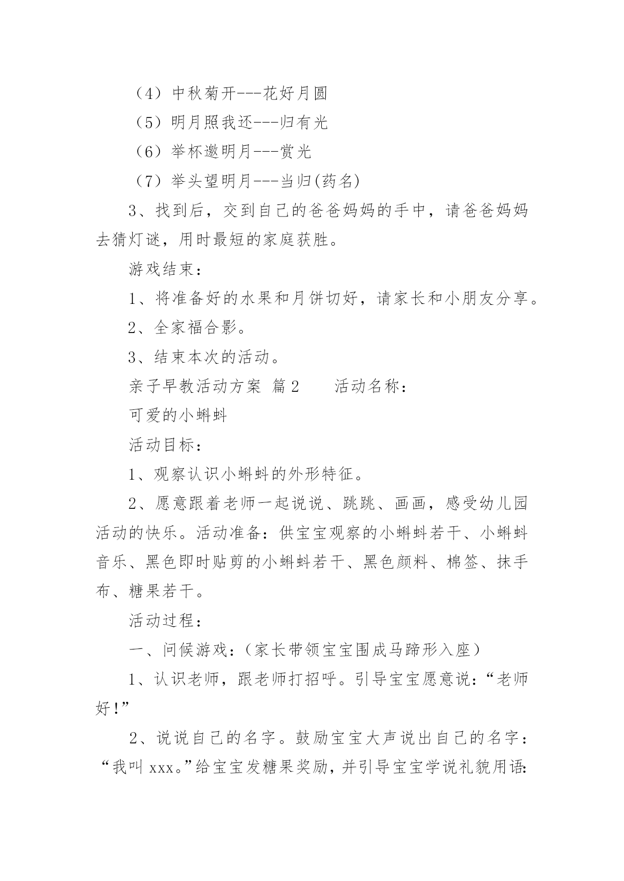 亲子早教活动方案亲子早教活动方案(精选11篇)为有力保证活动开展的质量水平,时常需要预先制定活动方案,活动方案可以对一个活动明确一个大概的方向。写活动方案需要注意哪些格式呢?下面是小编收集整理的亲子早教活动方案,供大家参考借鉴,希望可以帮助到有需要的朋友。亲子早教活动方案篇1“欢度中秋、情系你我”亲子游戏活动[活动时间]20xx年9月xx日(或9月29日)下午:6:00――8:00[活动场地]各班教室[活动形式]班级集体活动[邀约对象]幼儿园内全体家长及孩子[活动特点]此次活动主要籍中秋团圆节,增进家园互动和沟通,提升家长满意度。[物品准备]活动签到表、笔、照相机、DV、饮用水、一次性水杯、水果、月饼、果盘、眼罩、灯谜[活动流程]A、家长入园签到B、班级老师致辞,说明一下本次活动的意义及活动的流程。C、活动开始活动导入:妈妈故事会邀请一位妈妈给幼儿讲嫦娥奔月的故事,作为活动的导入。游戏一《齐心协力吃水果》1、请妈妈们手中有拿一个装有水果的果盘,站在教室内所指定的位置。2、将爸爸的眼睛蒙上,抱着孩子原地转三圈,爸爸在宝宝语言的提醒下去找妈妈,并吃到果盘中的水果,时间用时最短的一组为胜利者。游戏规则:1、参赛选手是全家三口,家庭成员不到三位的,班级老师可以参与进去。2、爸爸妈妈不要发出任何声音,任何人不要碰水果。3、4个家庭为一组,进行比赛。游戏二《猜灯谜》1、老师提前将若干灯谜藏在教室的各个角落2、请宝宝们站在教室中间,告诉宝宝们在教室内去寻找灯谜(并拿一个写有灯谜的卡片,让宝宝进行观察,知道去找什么样子的卡片)(1)有时落在山腰,有时挂在树梢,有时像圆盘,有时像镰刀---月亮(2)中秋归来---八归(3)嫦娥下凡---月季(4)中秋菊开---花好月圆(5)明月照我还---归有光(6)举杯邀明月---赏光(7)举头望明月---当归(药名)3、找到后,交到自己的爸爸妈妈的手中,请爸爸妈妈去猜灯谜,用时最短的家庭获胜。游戏结束:1、将准备好的水果和月饼切好,请家长和小朋友分享。2、全家福合影。3、结束本次的活动。亲子早教活动方案篇2活动名称:可爱的小蝌蚪活动目标:1、观察认识小蝌蚪的外形特征。2、愿意跟着老师一起说说、跳跳、画画,感受幼儿园活动的快乐。活动准备:供宝宝观察的小蝌蚪若干、小蝌蚪音乐、黑色即时贴剪的小蝌蚪若干、黑色颜料、棉签、抹手布、糖果若干。活动过程:一、问候游戏:(家长带领宝宝围成马蹄形入座)1、认识老师,跟老师打招呼。引导宝宝愿意说:“老师好!”2、说说自己的名字。鼓励宝宝大声说出自己的名字:“我叫xxx。”给宝宝发糖果奖励,并引导宝宝学说礼貌用语:“谢谢老师!”二、认识小蝌蚪:1、出示小蝌蚪,幼儿自由观察。(每组桌子上放一盆小蝌蚪,家长带领宝宝自由说说看看。)2、教师出示制作的小蝌蚪,引导宝宝们跟小蝌蚪打招呼。(此时家长带领宝宝回到座位上。)3、说说小蝌蚪长什么样?(颜色、头、尾巴……)4、学学小蝌蚪:给每位幼儿头上贴上小蝌蚪贴纸。听着音乐跟老师一起学学小蝌蚪。(结合方位:前、后、高、低等)儿歌:小蝌蚪、小蝌蚪,真可爱。黑黑的脑袋细尾巴。游来游去找妈妈:“妈妈,妈妈,你在哪儿?”儿歌结束时宝宝们学小蝌蚪游到自己的家长身边。三、画画小蝌蚪:1、教师示范画小蝌蚪过程:用棉签蘸一下黑色颜料。点到画纸上画一个圆,然后轻轻地拖出一条小尾巴来。一条可爱的小蝌蚪画好了!2、宝宝操作,家长帮助指导。提醒宝宝把衣袖拉高。手脏了可以擦在抹布上。3、活动结束:把小蝌蚪带回家,和小蝌蚪一起做游戏。亲子早教活动方案篇3活动日期:11月5日活动内容:(一)点名活动《捉迷藏》活动准备:毛绒小猫一只活动过程:1、请家长带宝宝面向教师席地而坐成一个半圈,宝宝坐在家长的面前,教师盘腿坐在家长和宝宝的对面。2、教师情绪饱满,面带微笑,进行自我介绍。教师:各位家长、宝宝,大家好!欢迎大家来参加活动,我是xx老师“。向宝宝挥挥手说:”宝宝好!请宝宝也小手挥一挥,来向老师打招呼。”3、介绍点名活动“捉迷藏”教师念儿歌小猫在谁的身后,谁就上来介绍自己。儿歌:小猫咪真调皮,躲在宝宝的身后面。宝宝宝宝找一找。小猫咪亲亲宝宝,然后请宝宝介绍自己叫什么名字,几岁、属什么。指导语:今天的点名活动结束,点名活动是为了让宝宝能大方的介绍自己,知道自己的基本情况。家长在平时也可以用这种方式帮助宝宝尝试与人交往,愿意挥手与别人打招呼。(二)体育活动“木头熊”活动准备:若干木头熊头饰,欢快的音乐活动过程:1、热身运动(1)、请宝宝的小脚踩在妈妈的大脚上,跟着老师踏步走。“我们的小脚走一走,小脚大脚走一走。”(2)请妈妈托住宝宝的腋下,向上跳呀跳。“跳呀跳呀,看谁跳得最最高。”然后请宝宝自己跳一跳。2、游戏:木头熊(1)、教师出示木头熊,并带上木头熊头饰。(2)、教师示范弯腰