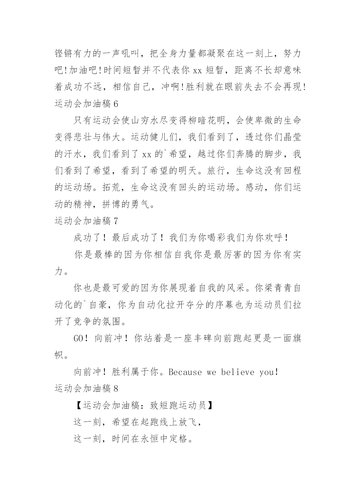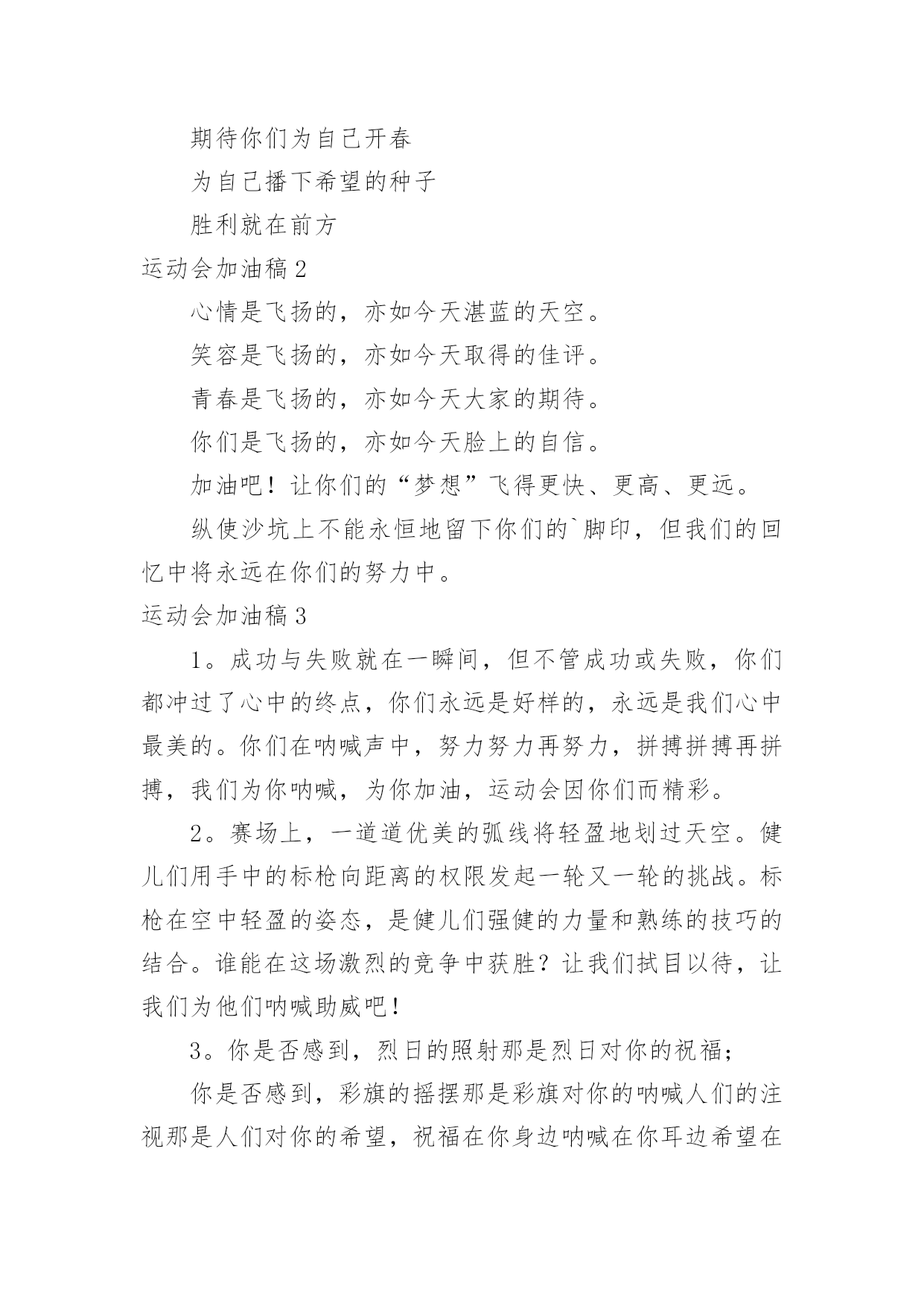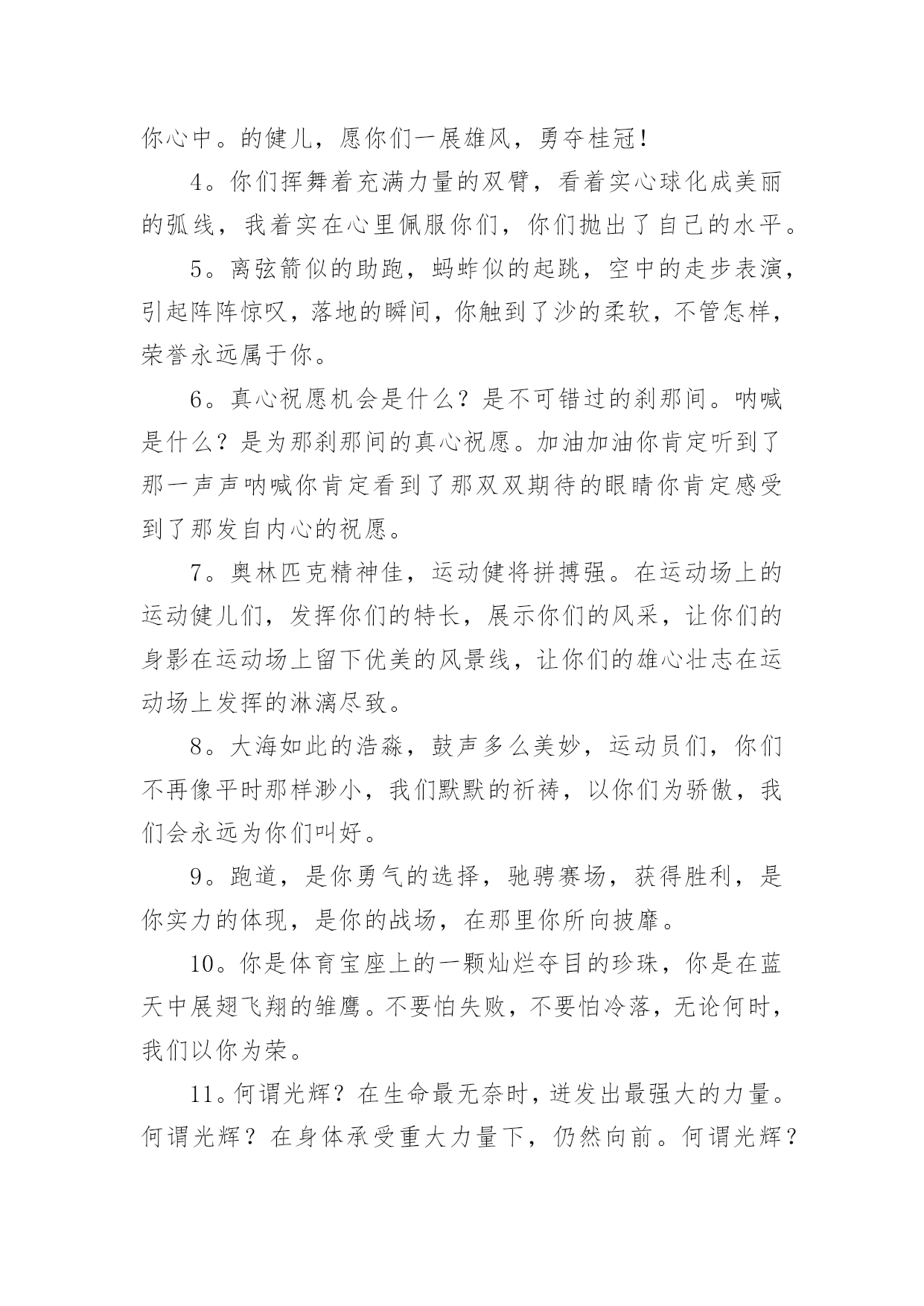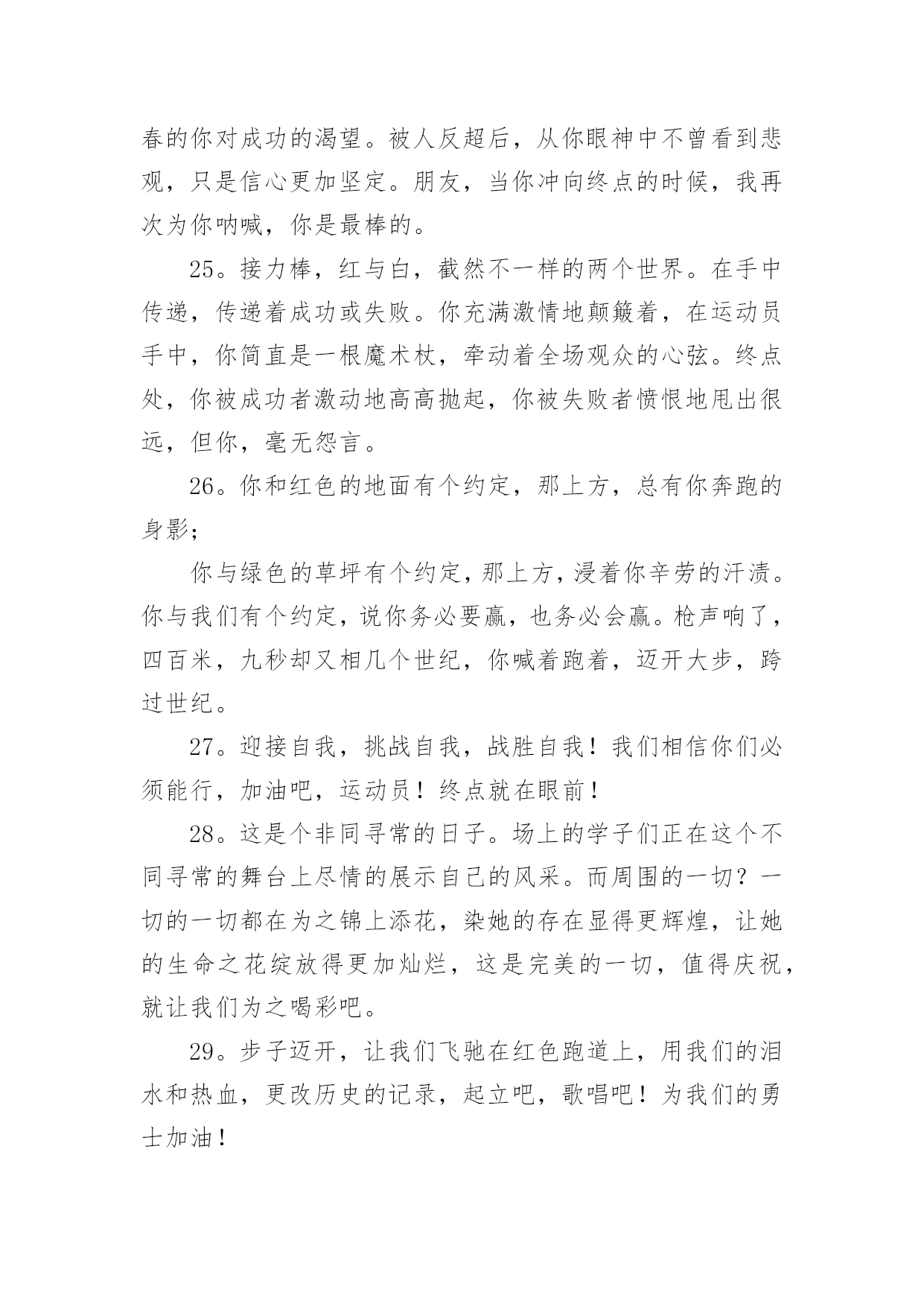 运动会加油稿运动会加油稿15篇【精】在日新月异的现代社会中,我们都可能会用到加油稿,加油稿是鼓励激励对方的文稿。那么你有了解过加油稿吗?下面是小编收集整理的运动会加油稿,希望能够帮助到大家。运动会加油稿1漫漫长路,的确令人忐忑然而我们知道,你们早已跑过多次早已在这红色的跑道上挥汗如雨劳累没有使你们退缩酸痛没有使你们放弃你们用毅力证明内心的渴望天气转凉,秋叶泛黄而你们便是那生生不息的.希望用倔强和坚持,用顽强的拼劲展现春的生气冬天快到了,春天还会远吗在起点焦灼等待的人儿啊扬帆起航吧,驶向春天驶向渴望,驶向美好的明天终点那里有专属于你们的土地期待你们为自己开春为自己播下希望的种子胜利就在前方运动会加油稿2心情是飞扬的,亦如今天湛蓝的天空。笑容是飞扬的,亦如今天取得的佳评。青春是飞扬的,亦如今天大家的期待。你们是飞扬的,亦如今天脸上的自信。加油吧!让你们的“梦想”飞得更快、更高、更远。纵使沙坑上不能永恒地留下你们的`脚印,但我们的回忆中将永远在你们的努力中。运动会加油稿31。成功与失败就在一瞬间,但不管成功或失败,你们都冲过了心中的终点,你们永远是好样的,永远是我们心中最美的。你们在呐喊声中,努力努力再努力,拼搏拼搏再拼搏,我们为你呐喊,为你加油,运动会因你们而精彩。2。赛场上,一道道优美的弧线将轻盈地划过天空。健儿们用手中的标枪向距离的权限发起一轮又一轮的挑战。标枪在空中轻盈的姿态,是健儿们强健的力量和熟练的技巧的结合。谁能在这场激烈的竞争中获胜?让我们拭目以待,让我们为他们呐喊助威吧!3。你是否感到,烈日的照射那是烈日对你的祝福;你是否感到,彩旗的摇摆那是彩旗对你的呐喊人们的注视那是人们对你的希望,祝福在你身边呐喊在你耳边希望在你心中。的健儿,愿你们一展雄风,勇夺桂冠!4。你们挥舞着充满力量的双臂,看着实心球化成美丽的弧线,我着实在心里佩服你们,你们抛出了自己的水平。5。离弦箭似的助跑,蚂蚱似的起跳,空中的走步表演,引起阵阵惊叹,落地的瞬间,你触到了沙的柔软,不管怎样,荣誉永远属于你。6。真心祝愿机会是什么?是不可错过的刹那间。呐喊是什么?是为那刹那间的真心祝愿。加油加油你肯定听到了那一声声呐喊你肯定看到了那双双期待的眼睛你肯定感受到了那发自内心的祝愿。7。奥林匹克精神佳,运动健将拼搏强。在运动场上的运动健儿们,发挥你们的特长,展示你们的风采,让你们的身影在运动场上留下优美的风景线,让你们的雄心壮志在运动场上发挥的淋漓尽致。8。大海如此的浩淼,鼓声多么美妙,运动员们,你们不再像平时那样渺小,我们默默的祈祷,以你们为骄傲,我们会永远为你们叫好。9。跑道,是你勇气的选择,驰骋赛场,获得胜利,是你实力的体现,是你的战场,在那里你所向披靡。10。你是体育宝座上的一颗灿烂夺目的珍珠,你是在蓝天中展翅飞翔的雏鹰。不要怕失败,不要怕冷落,无论何时,我们以你为荣。11。何谓光辉?在生命最无奈时,迸发出最强大的力量。何谓光辉?在身体承受重大力量下,仍然向前。何谓光辉?用上自己全部力量,创出一个新的纪录。何谓光辉?拼搏就是光辉,努力就是光辉。何谓光辉?运动员们就是光辉!为什么?因为他们努力过,奋斗过,付出过!12。天空中有道彩虹,它在雨后的天空中美丽夺目,生命中也有一道彩虹,那就是运动,他让生命丰富多彩。充满了生机青春的我们,青春的生命,青春的运动,使我们的心放飞年轻,没有失败,无论成败,运动的我们就是生活的彩虹。13。一声枪响伴着飒爽的秋风,你们亮出自己的风采,在这短短的'米中,你们与时间争分夺秒,只为了那最后的冲刺。不管结果如何,你们都是胜利者。因为,你们曾与时间竞赛。14。场上英姿显自豪,脚下步伐在飞奔。你们是骄傲。你们是自豪,跑道因你幻彩,应对红色跑道,你们挥洒自如,不惧一切冲向重点。15。虽然你们在场上的时间很短暂,但你们的身影依然停留在人们的脑海里,因为你们是赛场上最可爱的人。16。超越对手,超越自我,是我们的目标,是我们的信念,在清凉的初冬,在喧嚣的田径场上,你们点燃了似火的热情,无论成败,我们都为你们感到自豪,你们永远是我们的骄傲!17。不为鲜花的围绕,不为刹那的荣耀,只有执着的信念,化作不停的奔跑,心中燃烧着梦想,脚下不停的步伐。18。不长不短的距离,需要的是全身心全程投入,自始至终你们都在拼全力此时此刻,你们处在最风光的一刻,无论第几坚持胜利的信心,只要跑下来,你们就是英雄。19。数不请你跨出了多少坚实的步履,数不请你留下了多少汗滴。只有那悦耳的加油声,在你耳边环绕,激励你超越极限,超越自我。应对成功你从不自傲,应对失败你也只是轻轻一笑,你明白,你是我们永远的骄傲!20。这是速度与毅力的接力,这是期望与祈盼的接力,时间在那里凝固,几分几秒也变得如此漫长。千百双眼睛注视着你那矫健的身影,近了,近了,你可曾听到,那山呼海啸般的加