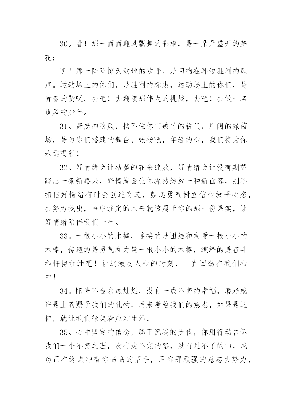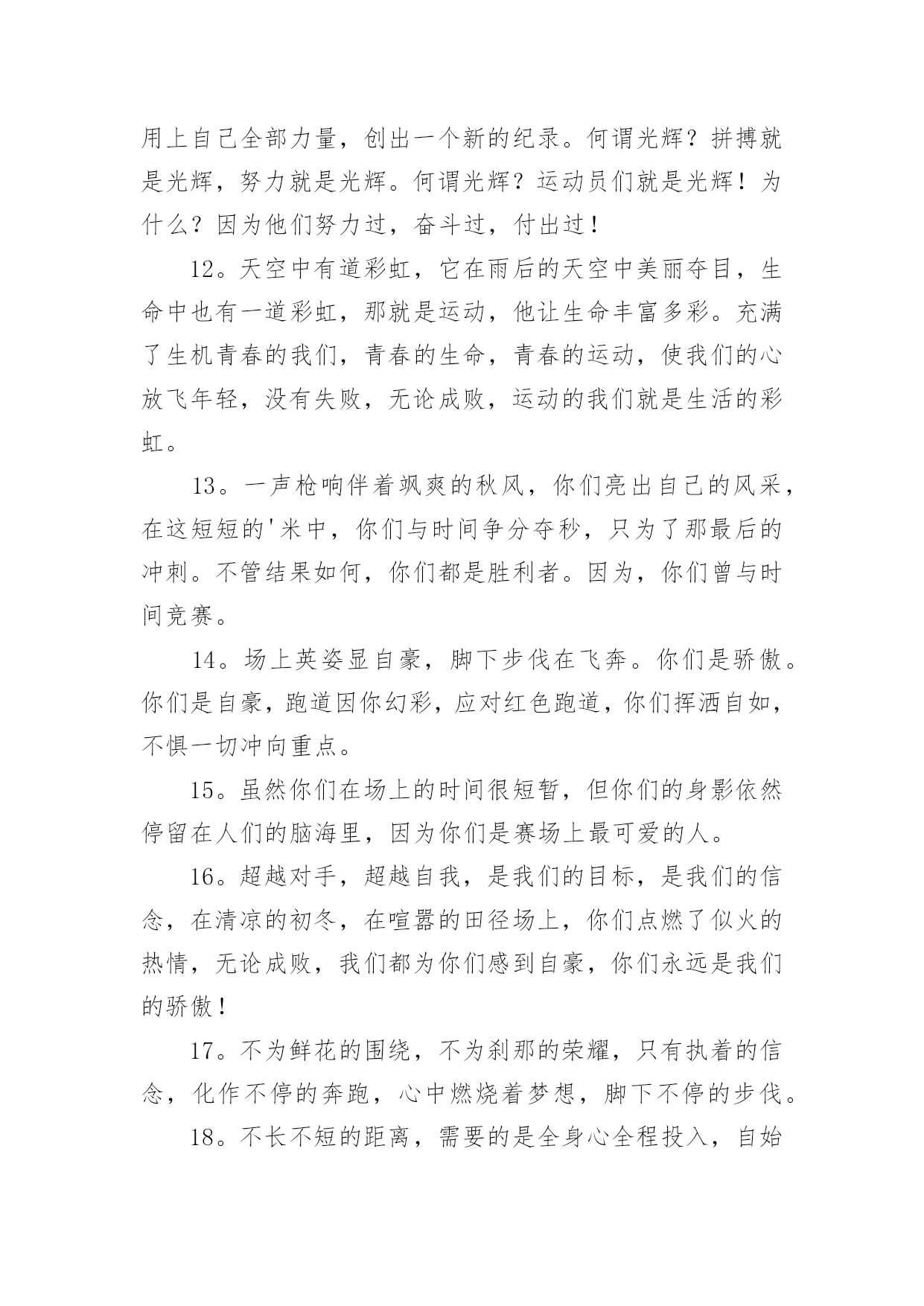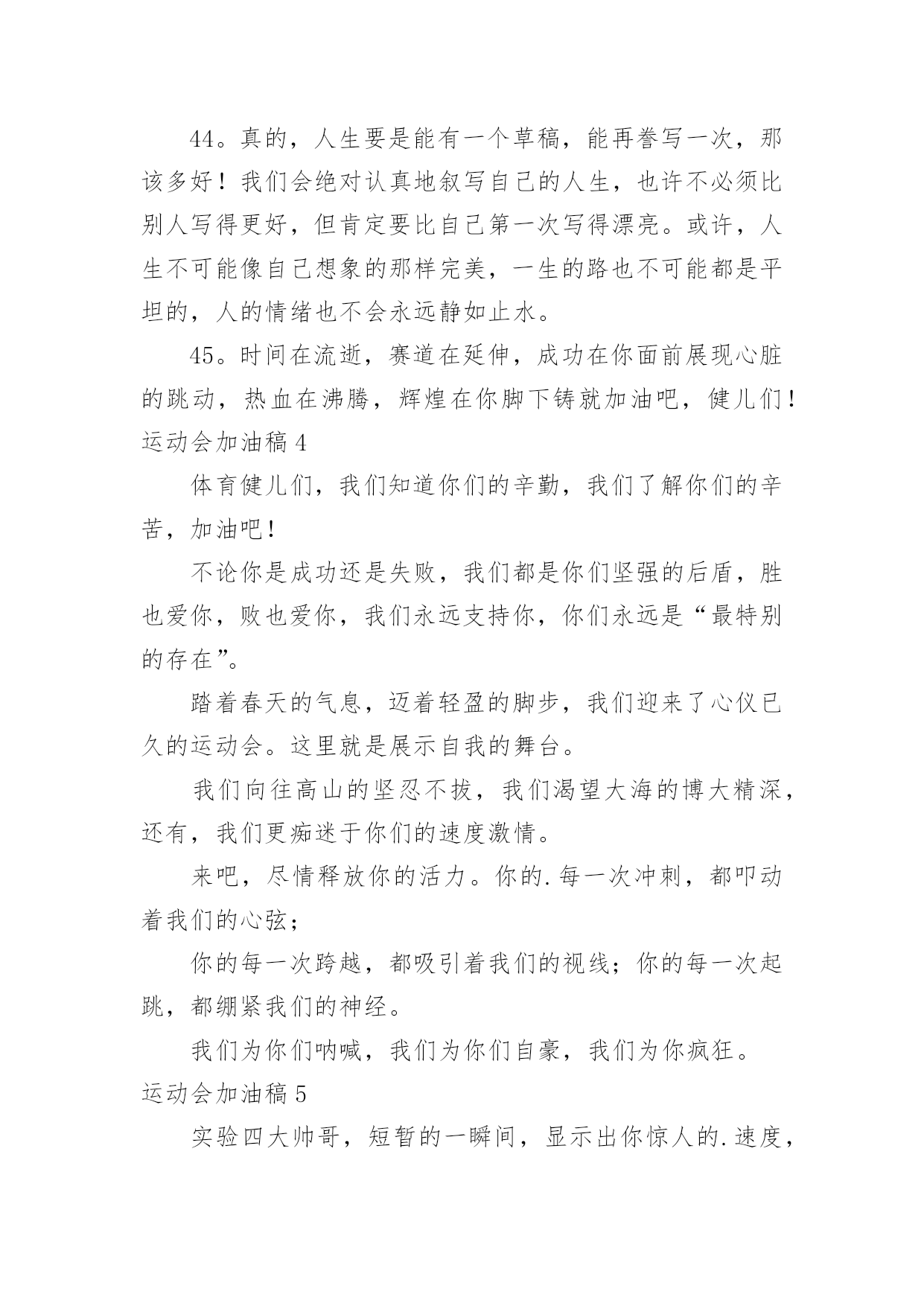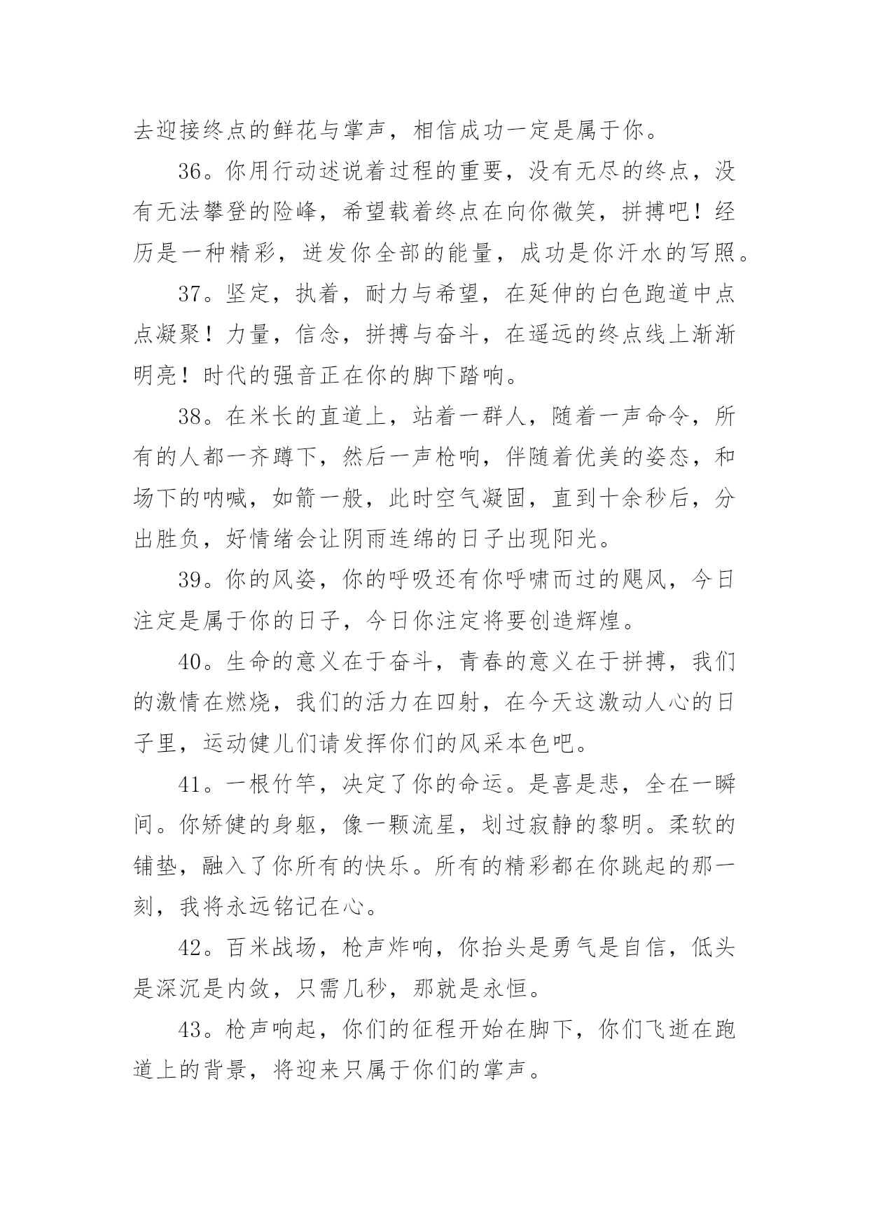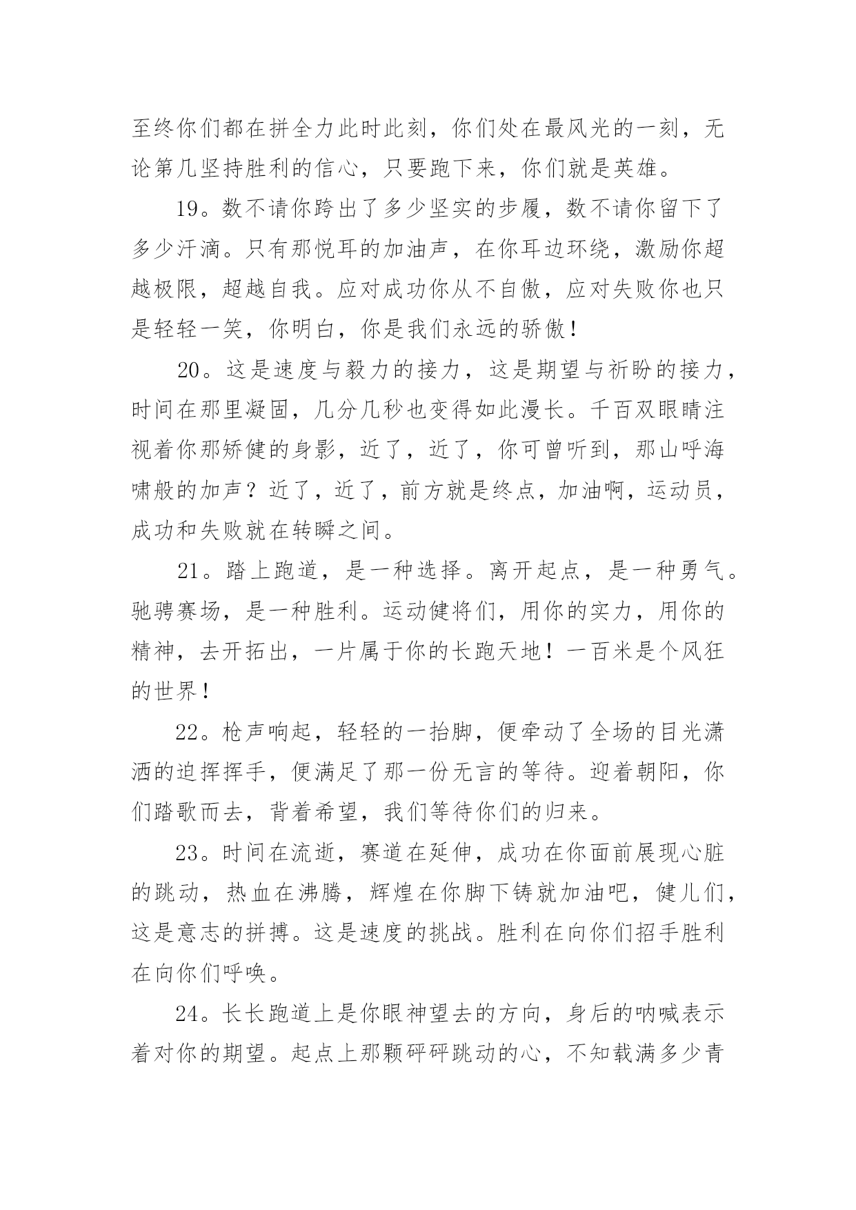 运动会加油稿运动会加油稿15篇【精】在日新月异的现代社会中,我们都可能会用到加油稿,加油稿是鼓励激励对方的文稿。那么你有了解过加油稿吗?下面是小编收集整理的运动会加油稿,希望能够帮助到大家。运动会加油稿1漫漫长路,的确令人忐忑然而我们知道,你们早已跑过多次早已在这红色的跑道上挥汗如雨劳累没有使你们退缩酸痛没有使你们放弃你们用毅力证明内心的渴望天气转凉,秋叶泛黄而你们便是那生生不息的.希望用倔强和坚持,用顽强的拼劲展现春的生气冬天快到了,春天还会远吗在起点焦灼等待的人儿啊扬帆起航吧,驶向春天驶向渴望,驶向美好的明天终点那里有专属于你们的土地期待你们为自己开春为自己播下希望的种子胜利就在前方运动会加油稿2心情是飞扬的,亦如今天湛蓝的天空。笑容是飞扬的,亦如今天取得的佳评。青春是飞扬的,亦如今天大家的期待。你们是飞扬的,亦如今天脸上的自信。加油吧!让你们的“梦想”飞得更快、更高、更远。纵使沙坑上不能永恒地留下你们的`脚印,但我们的回忆中将永远在你们的努力中。运动会加油稿31。成功与失败就在一瞬间,但不管成功或失败,你们都冲过了心中的终点,你们永远是好样的,永远是我们心中最美的。你们在呐喊声中,努力努力再努力,拼搏拼搏再拼搏,我们为你呐喊,为你加油,运动会因你们而精彩。2。赛场上,一道道优美的弧线将轻盈地划过天空。健儿们用手中的标枪向距离的权限发起一轮又一轮的挑战。标枪在空中轻盈的姿态,是健儿们强健的力量和熟练的技巧的结合。谁能在这场激烈的竞争中获胜?让我们拭目以待,让我们为他们呐喊助威吧!3。你是否感到,烈日的照射那是烈日对你的祝福;你是否感到,彩旗的摇摆那是彩旗对你的呐喊人们的注视那是人们对你的希望,祝福在你身边呐喊在你耳边希望在你心中。的健儿,愿你们一展雄风,勇夺桂冠!4。你们挥舞着充满力量的双臂,看着实心球化成美丽的弧线,我着实在心里佩服你们,你们抛出了自己的水平。5。离弦箭似的助跑,蚂蚱似的起跳,空中的走步表演,引起阵阵惊叹,落地的瞬间,你触到了沙的柔软,不管怎样,荣誉永远属于你。6。真心祝愿机会是什么?是不可错过的刹那间。呐喊是什么?是为那刹那间的真心祝愿。加油加油你肯定听到了那一声声呐喊你肯定看到了那双双期待的眼睛你肯定感受到了那发自内心的祝愿。7。奥林匹克精神佳,运动健将拼搏强。在运动场上的运动健儿们,发挥你们的特长,展示你们的风采,让你们的身影在运动场上留下优美的风景线,让你们的雄心壮志在运动场上发挥的淋漓尽致。8。大海如此的浩淼,鼓声多么美妙,运动员们,你们不再像平时那样渺小,我们默默的祈祷,以你们为骄傲,我们会永远为你们叫好。9。跑道,是你勇气的选择,驰骋赛场,获得胜利,是你实力的体现,是你的战场,在那里你所向披靡。10。你是体育宝座上的一颗灿烂夺目的珍珠,你是在蓝天中展翅飞翔的雏鹰。不要怕失败,不要怕冷落,无论何时,我们以你为荣。11。何谓光辉?在生命最无奈时,迸发出最强大的力量。何谓光辉?在身体承受重大力量下,仍然向前。何谓光辉?用上自己全部力量,创出一个新的纪录。何谓光辉?拼搏就是光辉,努力就是光辉。何谓光辉?运动员们就是光辉!为什么?因为他们努力过,奋斗过,付出过!12。天空中有道彩虹,它在雨后的天空中美丽夺目,生命中也有一道彩虹,那就是运动,他让生命丰富多彩。充满了生机青春的我们,青春的生命,青春的运动,使我们的心放飞年轻,没有失败,无论成败,运动的我们就是生活的彩虹。13。一声枪响伴着飒爽的秋风,你们亮出自己的风采,在这短短的'米中,你们与时间争分夺秒,只为了那最后的冲刺。不管结果如何,你们都是胜利者。因为,你们曾与时间竞赛。14。场上英姿显自豪,脚下步伐在飞奔。你们是骄傲。你们是自豪,跑道因你幻彩,应对红色跑道,你们挥洒自如,不惧一切冲向重点。15。虽然你们在场上的时间很短暂,但你们的身影依然停留在人们的脑海里,因为你们是赛场上最可爱的人。16。超越对手,超越自我,是我们的目标,是我们的信念,在清凉的初冬,在喧嚣的田径场上,你们点燃了似火的热情,无论成败,我们都为你们感到自豪,你们永远是我们的骄傲!17。不为鲜花的围绕,不为刹那的荣耀,只有执着的信念,化作不停的奔跑,心中燃烧着梦想,脚下不停的步伐。18。不长不短的距离,需要的是全身心全程投入,自始至终你们都在拼全力此时此刻,你们处在最风光的一刻,无论第几坚持胜利的信心,只要跑下来,你们就是英雄。19。数不请你跨出了多少坚实的步履,数不请你留下了多少汗滴。只有那悦耳的加油声,在你耳边环绕,激励你超越极限,超越自我。应对成功你从不自傲,应对失败你也只是轻轻一笑,你明白,你是我们永远的骄傲!20。这是速度与毅力的接力,这是期望与祈盼的接力,时间在那里凝固,几分几秒也变得如此漫长。千百双眼睛注视着你那矫健的身影,近了,近了,你可曾听到,那山呼海啸般的加