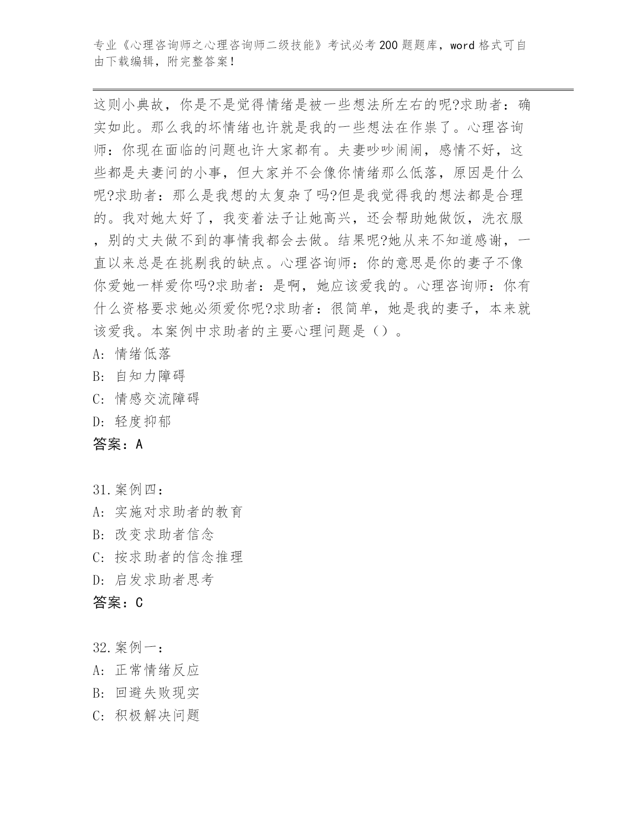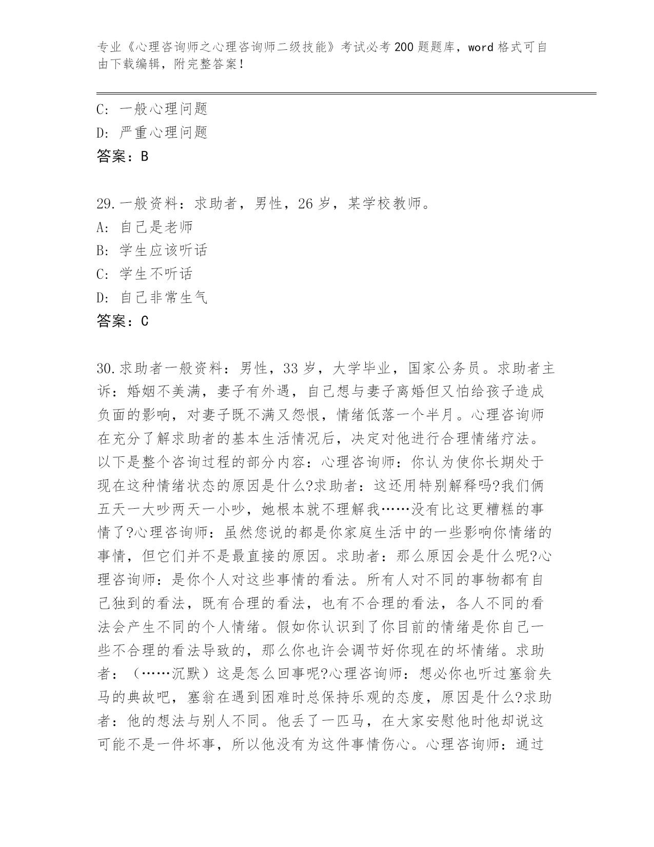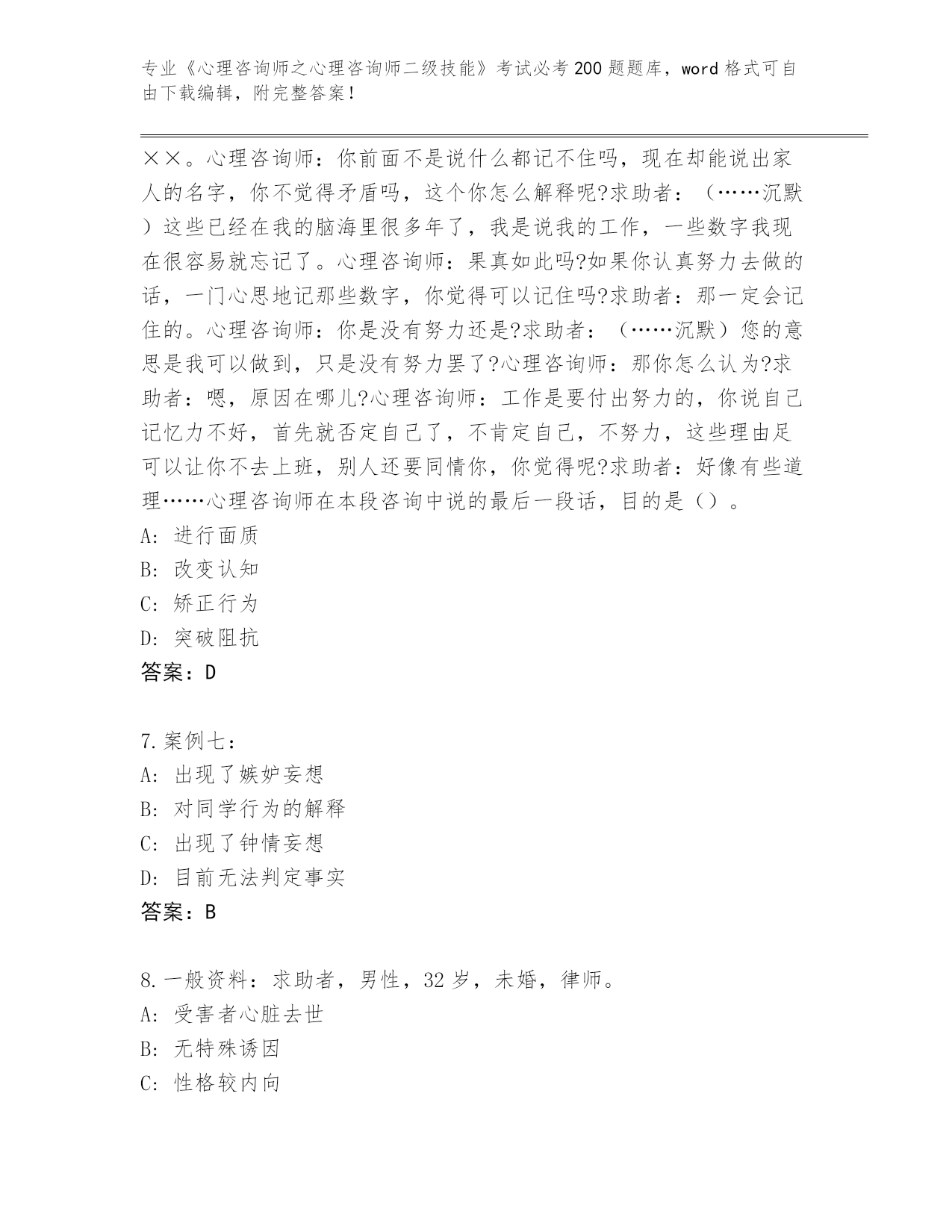 陕西省柞水县内部使用《心理咨询师之心理咨询师二级技能》考试必刷200题题库及答案(全国通用)