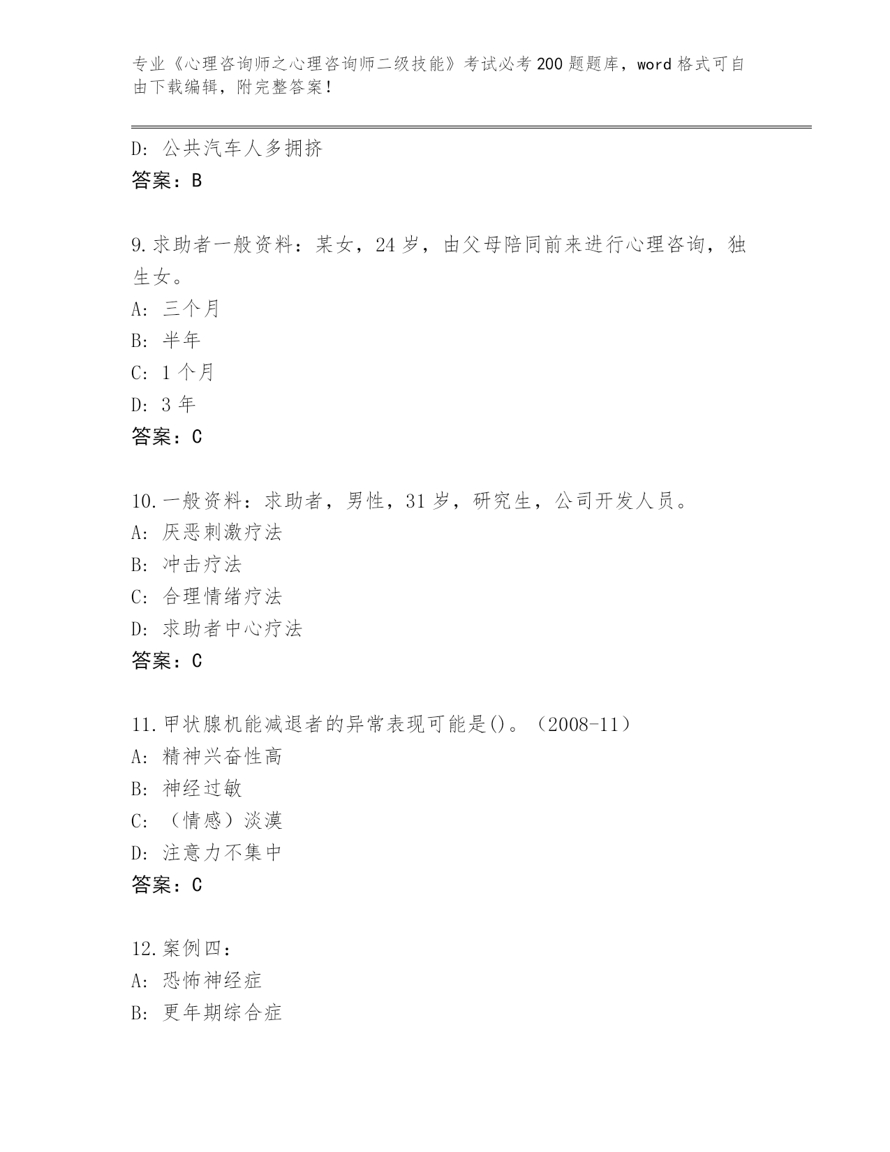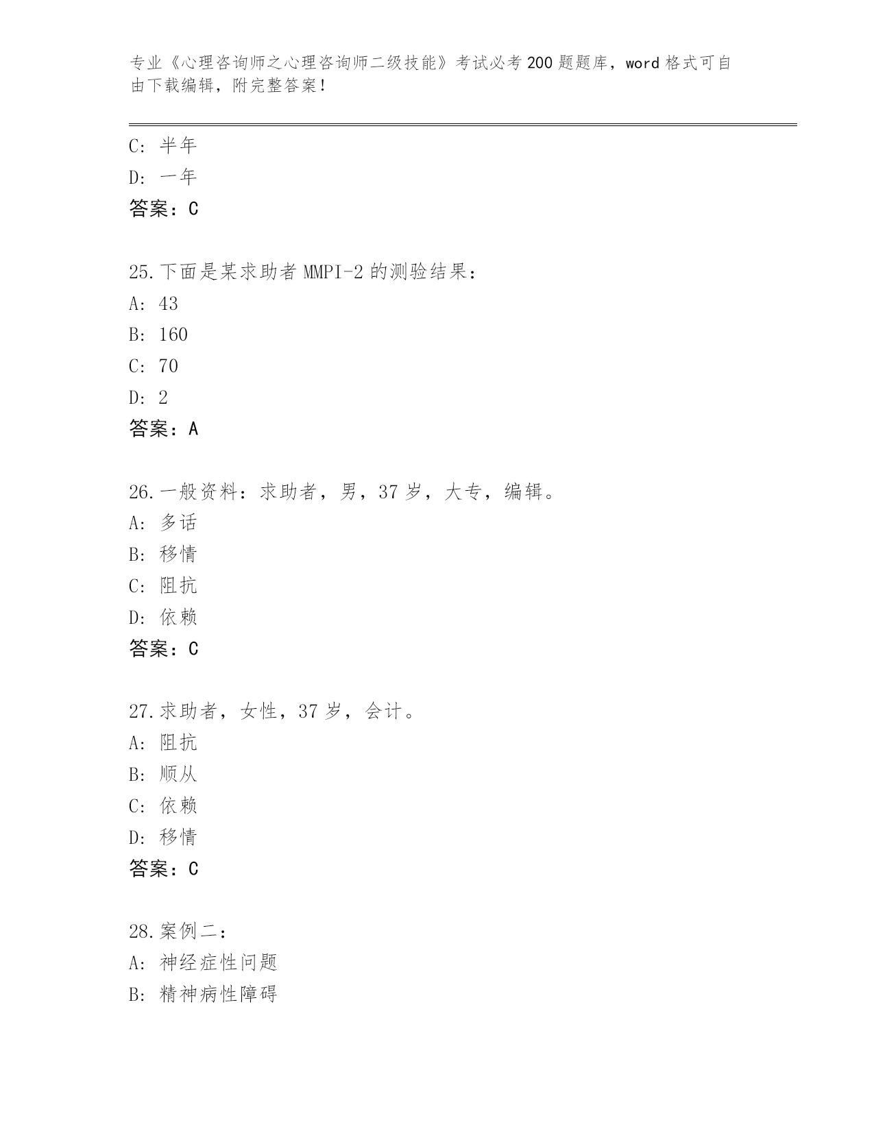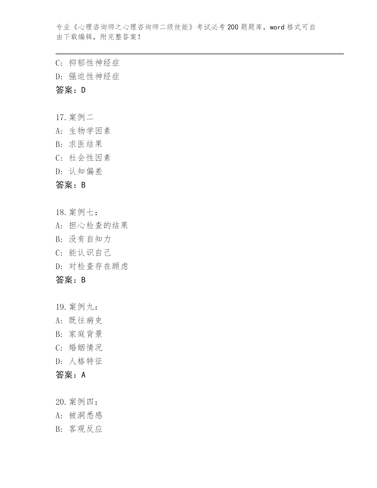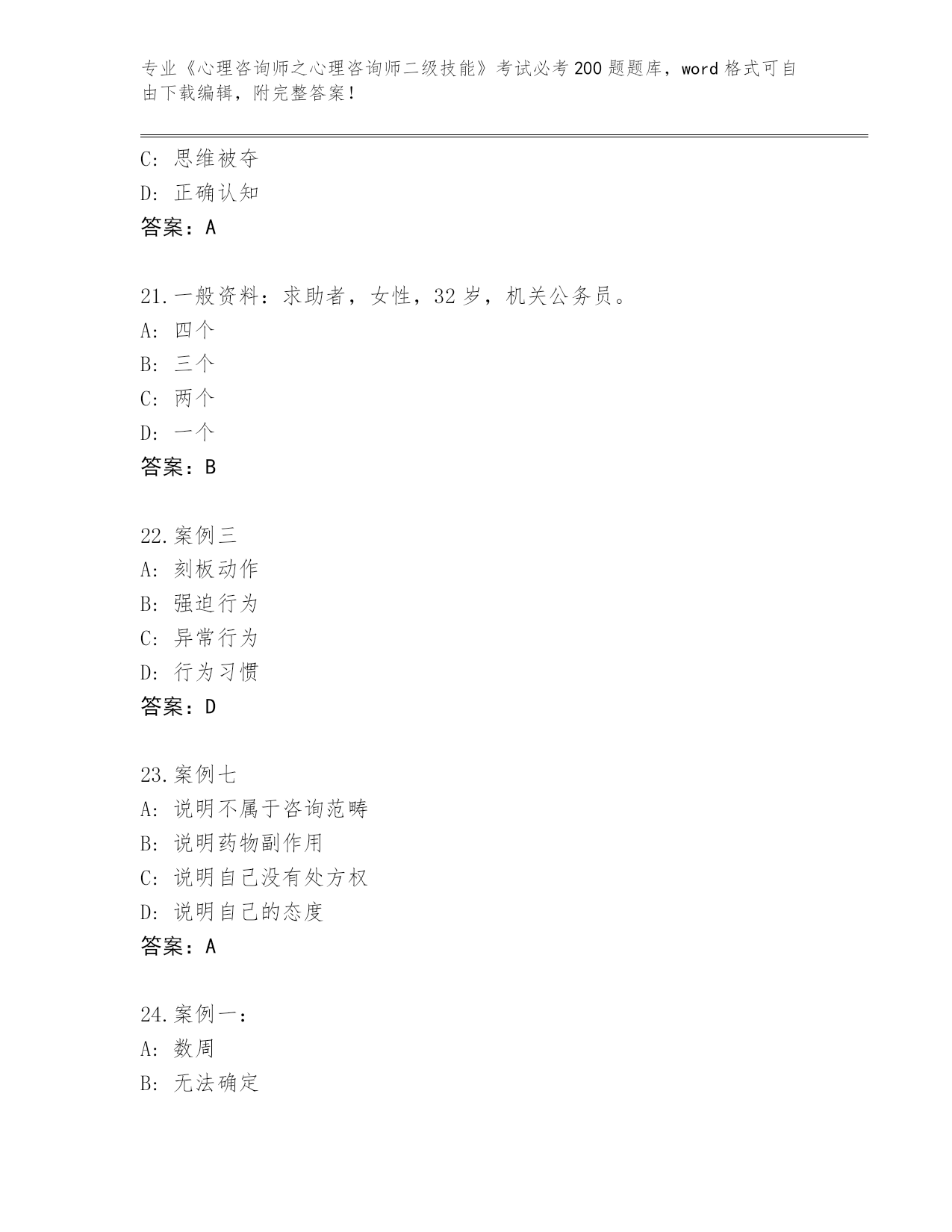 陕西省柞水县内部使用《心理咨询师之心理咨询师二级技能》考试必刷200题题库及答案(全国通用)