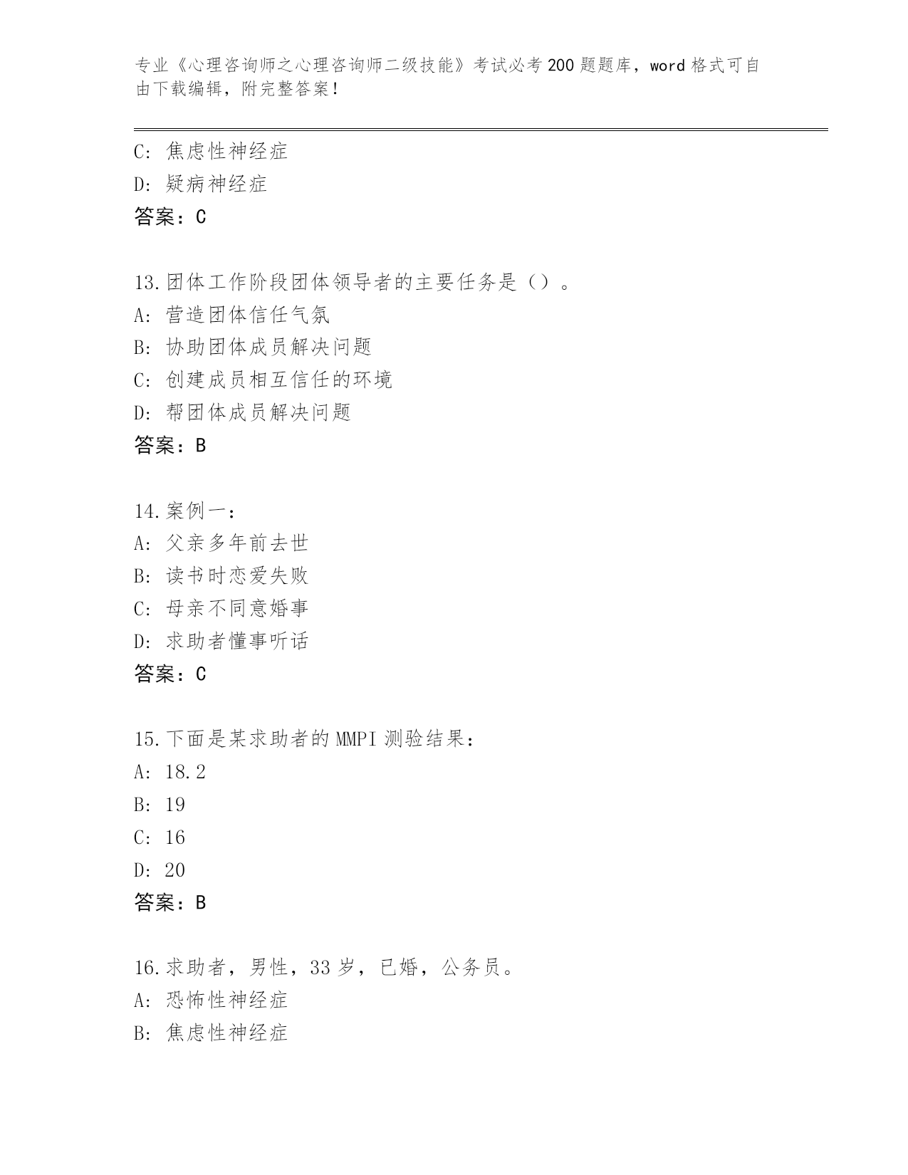 2024河南省《心理咨询师之心理咨询师二级技能》考试必考200题题库及参考答案(满分必刷)