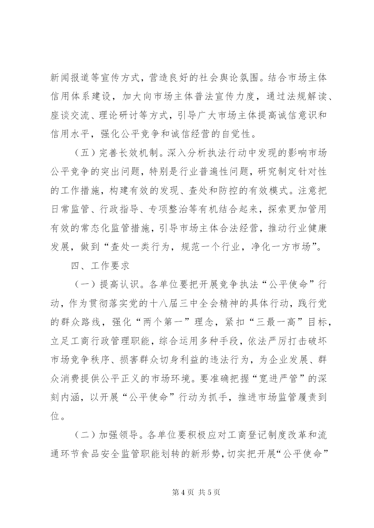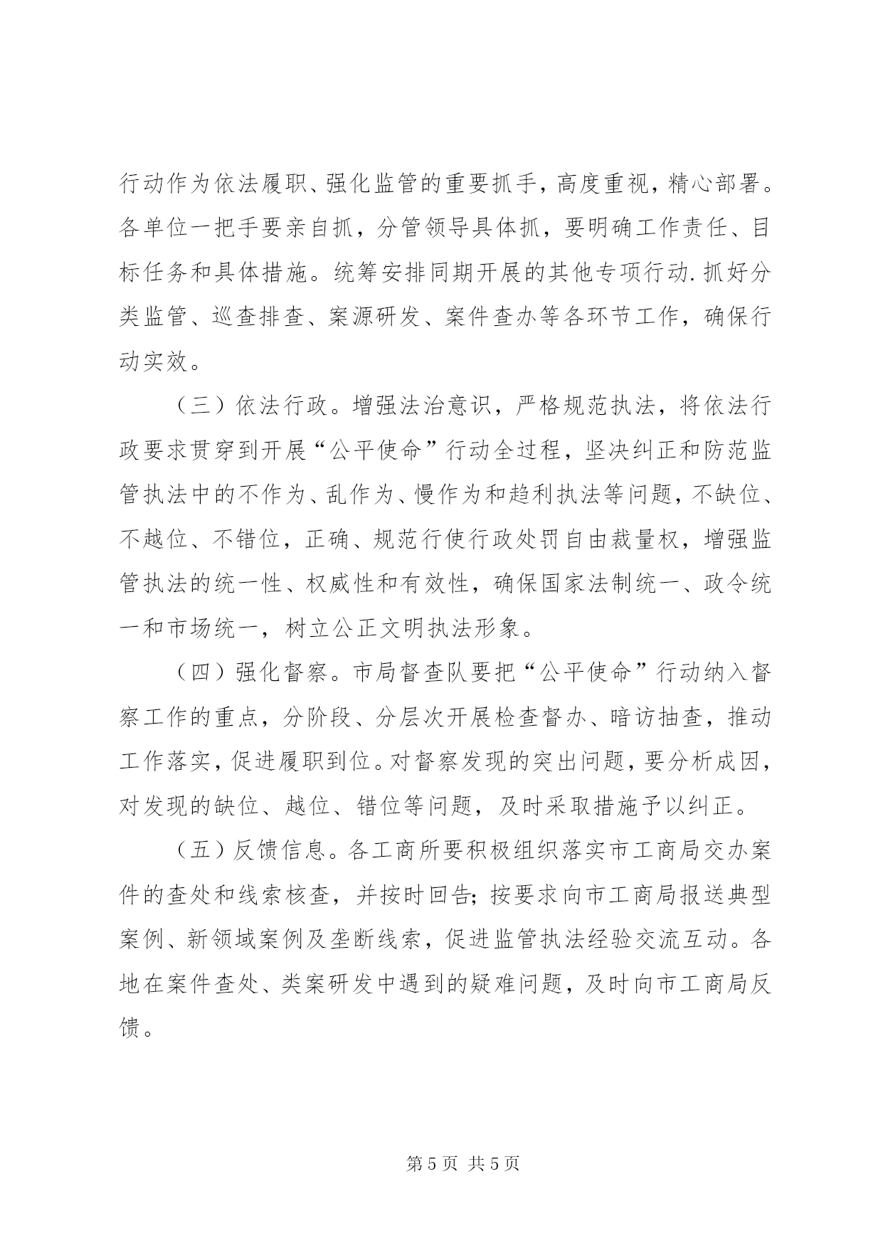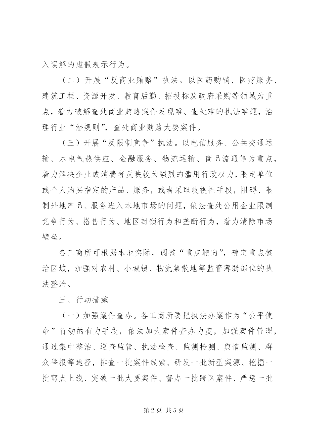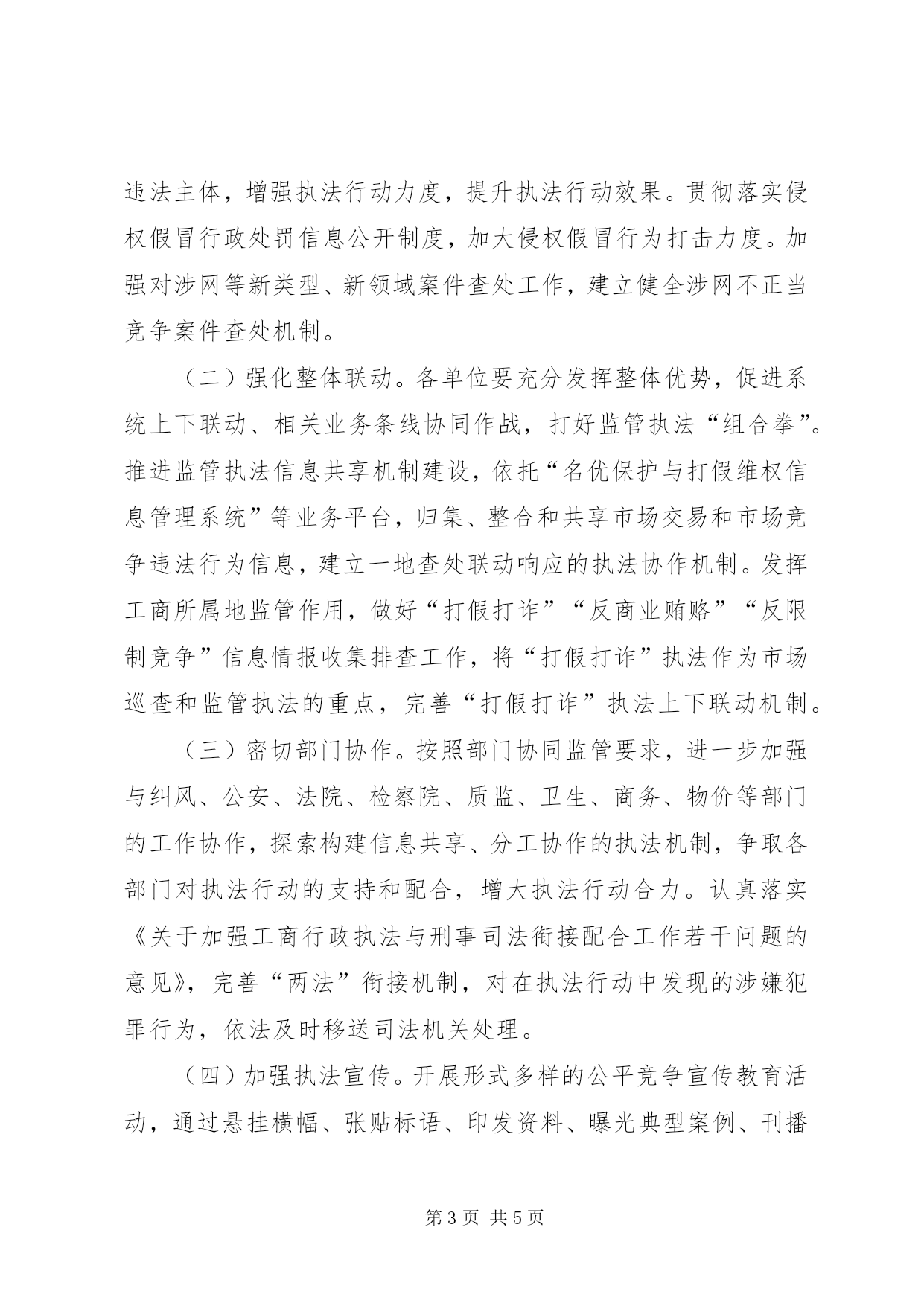 第PAGE\*Arabic\*MERGEFORMAT5页共NUMPAGES\*MERGEFORMAT5页工商系统竞争执法行动方案一、指导思想贯彻落实党的十八届三中全会精神,强化“两个第一”工作理念,以转变政府职能和工商登记制度改革为契机,按照实行“宽进严管”要求,发挥市场监管主力军作用,履行维护市场公平竞争职责,着力查处和治理妨碍公平竞争、损害群众利益、破坏市场诚信等不正当竞争行为,完善市场交易和竞争违法行为防控、发现和查处机制,促进统一开放、竞争有序的市场体系建设,让市场主体感到市场竞争环境明显改善,让人民群众感到“坑民害民”行为明显减少,让党委、政府感到工商履职作为明显增大,为“竞进提质,跨越赶超”保驾护航。二、行动重点以人民群众反映强烈、危害经济社会发展的领域为“重点靶向”,开展“一打两反”执法和整治。(一)开展“打假打诈”执法。以食品、药品、农资、建材、汽配、家用电器、服装等与人民群众日常生活息息相关的消费热点商品、季节性商品为重点,查处假冒他人注册商标、仿冒知名商品特有名称、包装、装潢和假冒他人企业名称或姓名等“傍名牌”行为;对商品的质量、制作成分、性能、用途、生产者、有效期限、产地等作引人误解的虚假宣传行为;在商品上伪造或冒用认证标志、名优标志等质量标志,伪造产地,对商品质量作引入误解的虚假表示行为。(二)开展“反商业贿赂”执法。以医药购销、医疗服务、建筑工程、资源开发、教育后勤、招投标及政府采购等领域为重点,着力破解查处商业贿赂案件发现难、查处难的执法难题,治理行业“潜规则”,查处商业贿赂大要案件。(三)开展“反限制竞争”执法。以电信服务、公共交通运输、水电气热供应、金融服务、物流运输、商品流通等为重点,着力解决企业或消费者反映较为强烈的滥用行政权力,限定单位或个人购买指定的产品、服务,或者采取歧视性手段,阻碍、限制外地产品、服务进入本地市场的问题,依法查处公用企业限制竞争行为、搭售行为、地区封锁行为和垄断行为,着力清除市场壁垒。各工商所可根据本地实际,调整“重点靶向”,确定重点整治区域,加强对农村、小城镇、物流集散地等监管薄弱部位的执法整治。三、行动措施(一)加强案件查办。各工商所要把执法办案作为“公平使命”行动的有力手段,依法加大案件查办力度,加强案件管理,通过集中整治、巡查监管、执法检查、监测检测、舆情监测、群众举报等途径,排查一批案件线索、研发一批新型案源、挖掘一批窝点上线、突破一批大要案件、督办一批跨区案件、严惩一批违法主体,增强执法行动力度,提升执法行动效果。贯彻落实侵权假冒行政处罚信息公开制度,加大侵权假冒行为打击力度。加强对涉网等新类型、新领域案件查处工作,建立健全涉网不正当竞争案件查处机制。(二)强化整体联动。各单位要充分发挥整体优势,促进系统上下联动、相关业务条线协同作战,打好监管执法“组合拳”。推进监管执法信息共享机制建设,依托“名优保护与打假维权信息管理系统”等业务平台,归集、整合和共享市场交易和市场竞争违法行为信息,建立一地查处联动响应的执法协作机制。发挥工商所属地监管作用,做好“打假打诈”“反商业贿赂”“反限制竞争”信息情报收集排查工作,将“打假打诈”执法作为市场巡查和监管执法的重点,完善“打假打诈”执法上下联动机制。(三)密切部门协作。按照部门协同监管要求,进一步加强与纠风、公安、法院、检察院、质监、卫生、商务、物价等部门的工作协作,探索构建信息共享、分工协作的执法机制,争取各部门对执法行动的支持和配合,增大执法行动合力。认真落实《关于加强工商行政执法与刑事司法衔接配合工作若干问题的意见》,完善“两法”衔接机制,对在执法行动中发现的涉嫌犯罪行为,依法及时移送司法机关处理。(四)加强执法宣传。开展形式多样的公平竞争宣传教育活动,通过悬挂横幅、张贴标语、印发资料、曝光典型案例、刊播新闻报道等宣传方式,营造良好的社会舆论氛围。结合市场主体信用体系建设,加大向市场主体普法宣传力度,通过法规解读、座谈交流、理论研讨等方式,引导广大市场主体提高诚信意识和信用水平,强化公平竞争和诚信经营的自觉性。(五)完善长效机制。深入分析执法行动中发现的影响市场公平竞争的突出问题,特别是行业普遍性问题,研究制定针对性的工作措施,构建有效的发现、查处和防控的有效模式。注意把日常监管、行政指导、专项整治等有机结合起来,探索更加管用有效的常态化监管措施,引导市场主体合法经营,推动行业健康发展,做到“查处一类行为,规范一个行业,净化一方市场”。四、工作要求(一)提高认识。各单位要把开展竞争执法“公平使命”行动,作为贯彻落实党的十八届三中全会精神的具体行动,践行党的群众路线,强化“两个第一”理念,紧扣“三最一高”目标,立足工商行政管理职能,综合运用多种手段,依法严厉打击破坏市场竞争秩序、损害群众