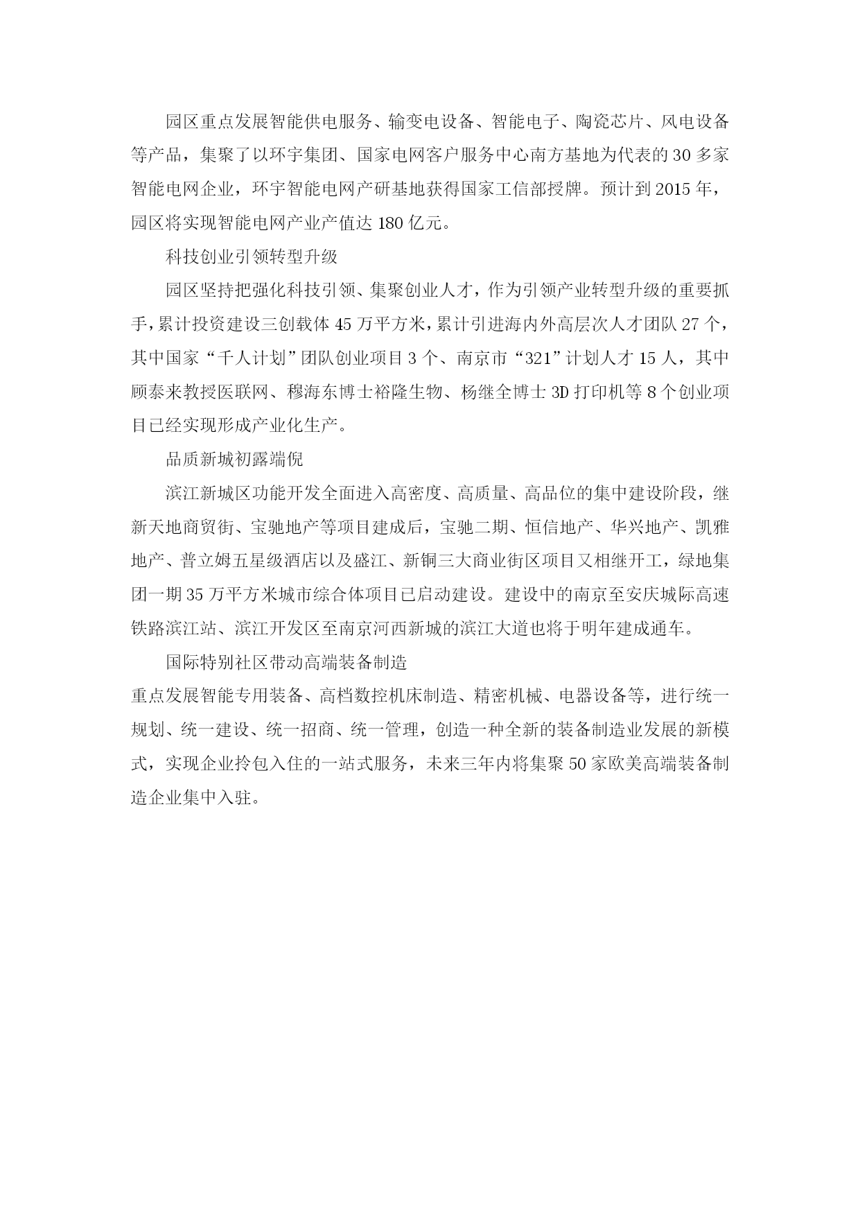 江宁滨江:独树一帜的先进制造业样板区成立于2003年10月的滨江开发区,从零起步,一路开疆扩土,高歌猛进,短短九年时间,完成了从无到有、从小到大、从工业“孤岛”到产业新城三大历史性任务,实现了从一个全省最年轻的省级开发区起步,迈向全市特色鲜明的先进制造业样板区、临港产业集聚区、现代化乐居品质新城区的目标,为世人呈现出一片充满青春活力的创业沃土。九年来,滨江开发区咬定“跻身一流省级开发区”目标不动摇,坚持走创新驱动、内生增长、绿色发展新路,形成产业、港口、新城“三大”开发组团齐头并进、竞相发展的全新格局,构建了以核电装备产业为龙头,以高端装备、智能电网、航运物流为支撑的“1+3”现代产业体系。全省首家核电装备科技产业园落户核电装备科技产业园发展核电站建设所需的核电主设备、辅助设备、动力技术应用和非动力技术应用四大领域产品,重点引进国内外核电产业龙头企业、制造厂商和研发机构,形成核电产业链和上下游配套产业,着力打造集研发、设计、安装、制造等于一体的核电装备科技产业园。园区编制了江苏首个核电装备产业发展规划,驻区企业中核动力核安全机械设备制造、中核华兴核电模块化基地、柳工集团预应力设备制造、中船重工719所核能设计研究院和宝色股份大型核电装备制造等重大项目年底前将建成投产。预计到2015年,园区将实现核电装备产业产值200亿元。集聚国内“五大重工”重点发展隧道盾构机等大型交通工程施工机械、城市轨道交通装备及其配套产品,以及大型石油化工装备产业。目前,三一重工(600031,股吧)工程机械制造、徐工集团工程机械制造、北方重工(南京)重大装备基地等国内著名重工集团项目汇聚滨江;南高齿高速列车齿轮、丹麦丹纳车钩系统、中航金鹰地效翼船等20多个行业领军企业和龙头型项目落户园区;生产大型石化设备的宝色股份已在创业板成功上市、天华科技也已进入上市程序。预计到2015年,高端装备制造产业将实现产值260亿元。智能电网产业异军突起园区重点发展智能供电服务、输变电设备、智能电子、陶瓷芯片、风电设备等产品,集聚了以环宇集团、国家电网客户服务中心南方基地为代表的30多家智能电网企业,环宇智能电网产研基地获得国家工信部授牌。预计到2015年,园区将实现智能电网产业产值达180亿元。科技创业引领转型升级园区坚持把强化科技引领、集聚创业人才,作为引领产业转型升级的重要抓手,累计投资建设三创载体45万平方米,累计引进海内外高层次人才团队27个,其中国家“千人计划”团队创业项目3个、南京市“321”计划人才15人,其中顾泰来教授医联网、穆海东博士裕隆生物、杨继全博士3D打印机等8个创业项目已经实现形成产业化生产。品质新城初露端倪滨江新城区功能开发全面进入高密度、高质量、高品位的集中建设阶段,继新天地商贸街、宝驰地产等项目建成后,宝驰二期、恒信地产、华兴地产、凯雅地产、普立姆五星级酒店以及盛江、新铜三大商业街区项目又相继开工,绿地集团一期35万平方米城市综合体项目已启动建设。建设中的南京至安庆城际高速铁路滨江站、滨江开发区至南京河西新城的滨江大道也将于明年建成通车。国际特别社区带动高端装备制造重点发展智能专用装备、高档数控机床制造、精密机械、电器设备等,进行统一规划、统一建设、统一招商、统一管理,创造一种全新的装备制造业发展的新模式,实现企业拎包入住的一站式服务,未来三年内将集聚50家欧美高端装备制造企业集中入驻。
