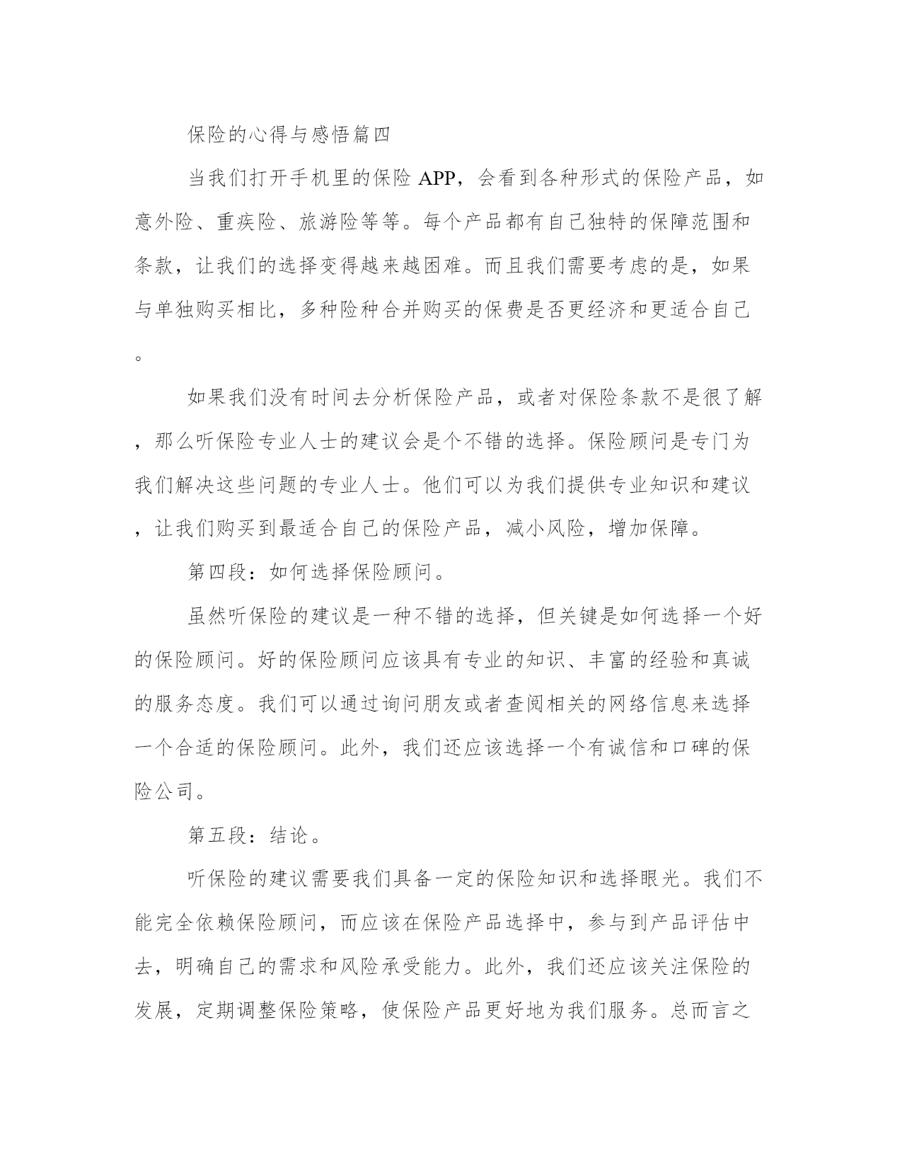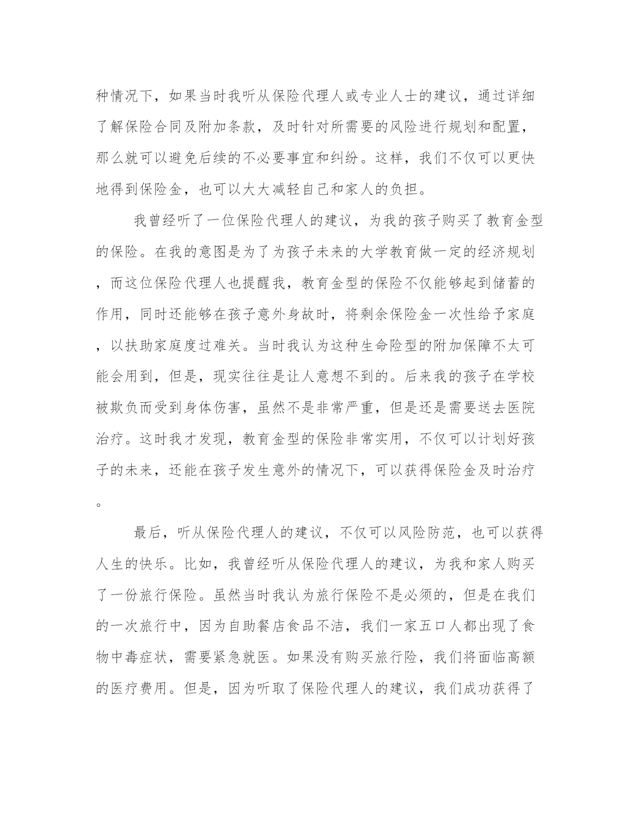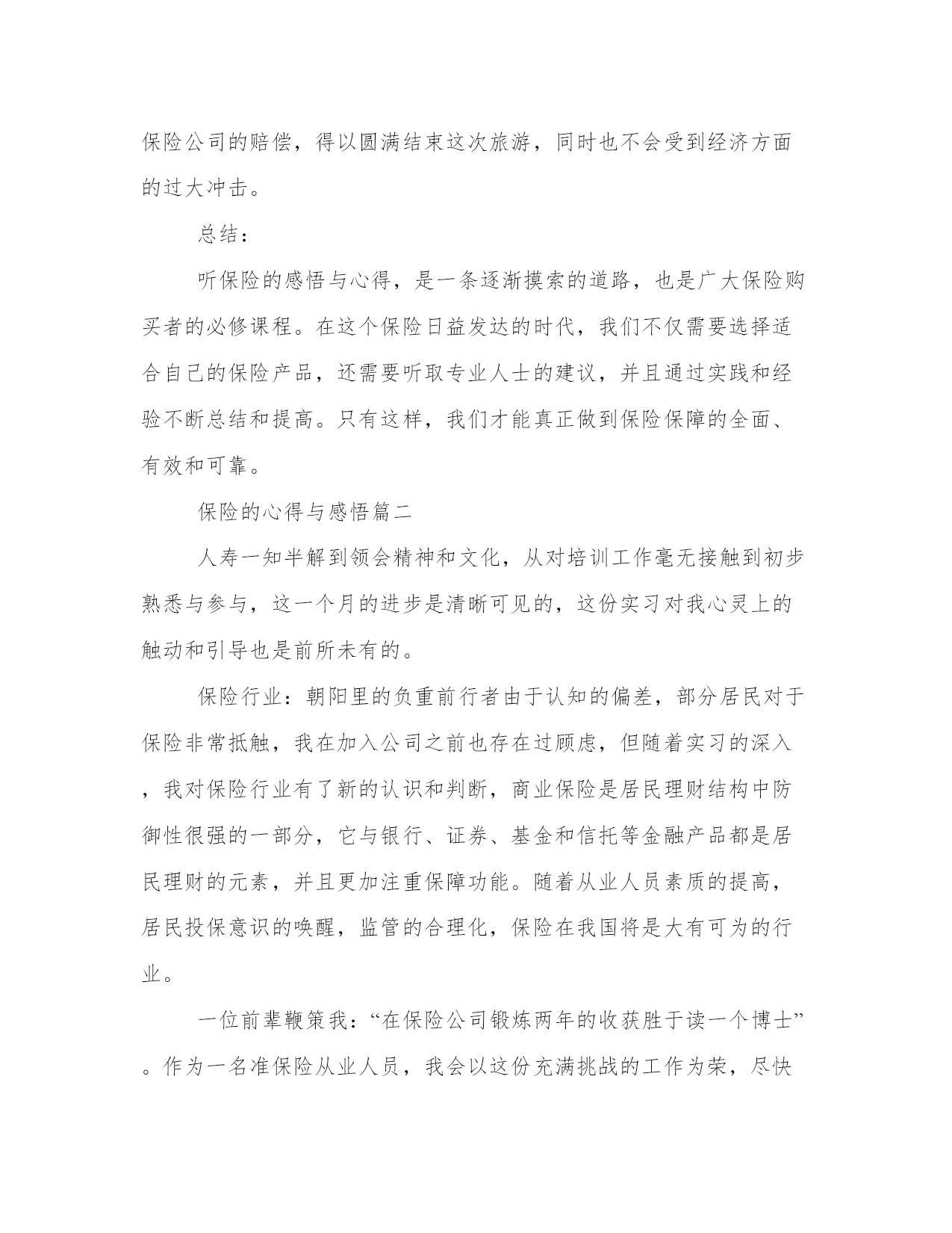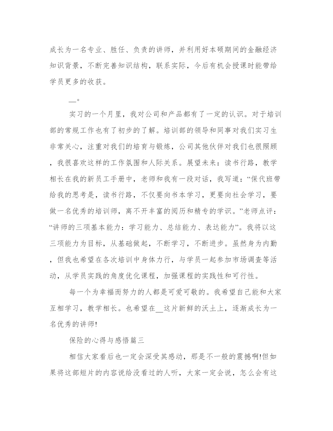 最新保险的心得与感悟(优秀19篇)我们在一些事情上受到启发后,应该马上记录下来,写一篇心得感悟,这样我们可以养成良好的总结方法。那么你知道心得感悟如何写吗?以下是我帮大家整理的最新心得感悟范文大全,希望能够帮助到大家,我们一起来看一看吧。保险的心得与感悟篇一现代人日益重视保险,保险行业也飞速发展。保险的本质是为了防范风险,但是在保险购买的过程中,我们也需要听从专业人员的建议,才能得到最适合自己的保险规划。在我多年的保险购买与理赔经历中,我深刻体会到了听保险的重要性,下面我就来分享一下我的感悟与心得。在保险的购买和理赔中,往往需要面对复杂的保险条款和附加条款,而且保险公司的千奇百怪的宣传也让人眼花缭乱。这时,听从专业的保险代理人的建议,可以帮我们更好地理解保险条款和附加条款,避免出现误解和纠纷。同时,保险代理人会根据我们的职业、收入、家庭状况等因素,为我们提供最合适的保险方案,帮助我们做到真正意义上的风险保障。第三段:听保险的经验。在我的保险购买历程中,我曾经因为对某些保险附加条款理解不足,而给我购买的某种保险增加了理赔难度,延长了理赔时间。在这种情况下,如果当时我听从保险代理人或专业人士的建议,通过详细了解保险合同及附加条款,及时针对所需要的风险进行规划和配置,那么就可以避免后续的不必要事宜和纠纷。这样,我们不仅可以更快地得到保险金,也可以大大减轻自己和家人的负担。我曾经听了一位保险代理人的建议,为我的孩子购买了教育金型的保险。在我的意图是为了为孩子未来的大学教育做一定的经济规划,而这位保险代理人也提醒我,教育金型的保险不仅能够起到储蓄的作用,同时还能够在孩子意外身故时,将剩余保险金一次性给予家庭,以扶助家庭度过难关。当时我认为这种生命险型的附加保障不太可能会用到,但是,现实往往是让人意想不到的。后来我的孩子在学校被欺负而受到身体伤害,虽然不是非常严重,但是还是需要送去医院治疗。这时我才发现,教育金型的保险非常实用,不仅可以计划好孩子的未来,还能在孩子发生意外的情况下,可以获得保险金及时治疗。最后,听从保险代理人的建议,不仅可以风险防范,也可以获得人生的快乐。比如,我曾经听从保险代理人的建议,为我和家人购买了一份旅行保险。虽然当时我认为旅行保险不是必须的,但是在我们的一次旅行中,因为自助餐店食品不洁,我们一家五口人都出现了食物中毒症状,需要紧急就医。如果没有购买旅行险,我们将面临高额的医疗费用。但是,因为听取了保险代理人的建议,我们成功获得了保险公司的赔偿,得以圆满结束这次旅游,同时也不会受到经济方面的过大冲击。总结:听保险的感悟与心得,是一条逐渐摸索的道路,也是广大保险购买者的必修课程。在这个保险日益发达的时代,我们不仅需要选择适合自己的保险产品,还需要听取专业人士的建议,并且通过实践和经验不断总结和提高。只有这样,我们才能真正做到保险保障的全面、有效和可靠。保险的心得与感悟篇二人寿一知半解到领会精神和文化,从对培训工作毫无接触到初步熟悉与参与,这一个月的进步是清晰可见的,这份实习对我心灵上的触动和引导也是前所未有的。保险行业:朝阳里的负重前行者由于认知的偏差,部分居民对于保险非常抵触,我在加入公司之前也存在过顾虑,但随着实习的深入,我对保险行业有了新的认识和判断,商业保险是居民理财结构中防御性很强的一部分,它与银行、证券、基金和信托等金融产品都是居民理财的元素,并且更加注重保障功能。随着从业人员素质的提高,居民投保意识的唤醒,监管的合理化,保险在我国将是大有可为的行业。一位前辈鞭策我:“在保险公司锻炼两年的收获胜于读一个博士”。作为一名准保险从业人员,我会以这份充满挑战的工作为荣,尽快成长为一名专业、胜任、负责的讲师,并利用好本硕期间的金融经济知识背景,不断完善知识结构,联系实际,今后有机会授课时能带给学员更多的收获。__。实习的一个月里,我对公司和产品都有了一定的认识。对于培训部的常规工作也有了初步的了解。培训部的领导和同事对我们实习生非常关心,注重对我们的培育与锻炼,公司其他伙伴对我们也很照顾,我很喜欢这样的工作氛围和人际关系。展望未来:读书行路,教学相长在我的新员工手册中,老师和我有一段对话,我写道:“保代班带给我的思考是,读书行路,不仅要向书本学习,更要向社会学习,要做一名优秀的培训师,离不开丰富的阅历和精专的学识。”老师点评:“讲师的三项基本能力:学习能力、总结能力、表达能力”。我将以这三项能力为目标,从基础做起,不断学习,不断进步。虽然身为内勤,但我也希望在各次培训中身体力行,与学员一起参加市场调查等活动,从学员实践的角度优化课程,加强课程的实践性和可行性。每一个为幸福而努力的人都是可爱可敬的。我希望自己能和大家互相学习,教学相长。也希望在__这片新鲜的沃土上,逐渐成长为一名