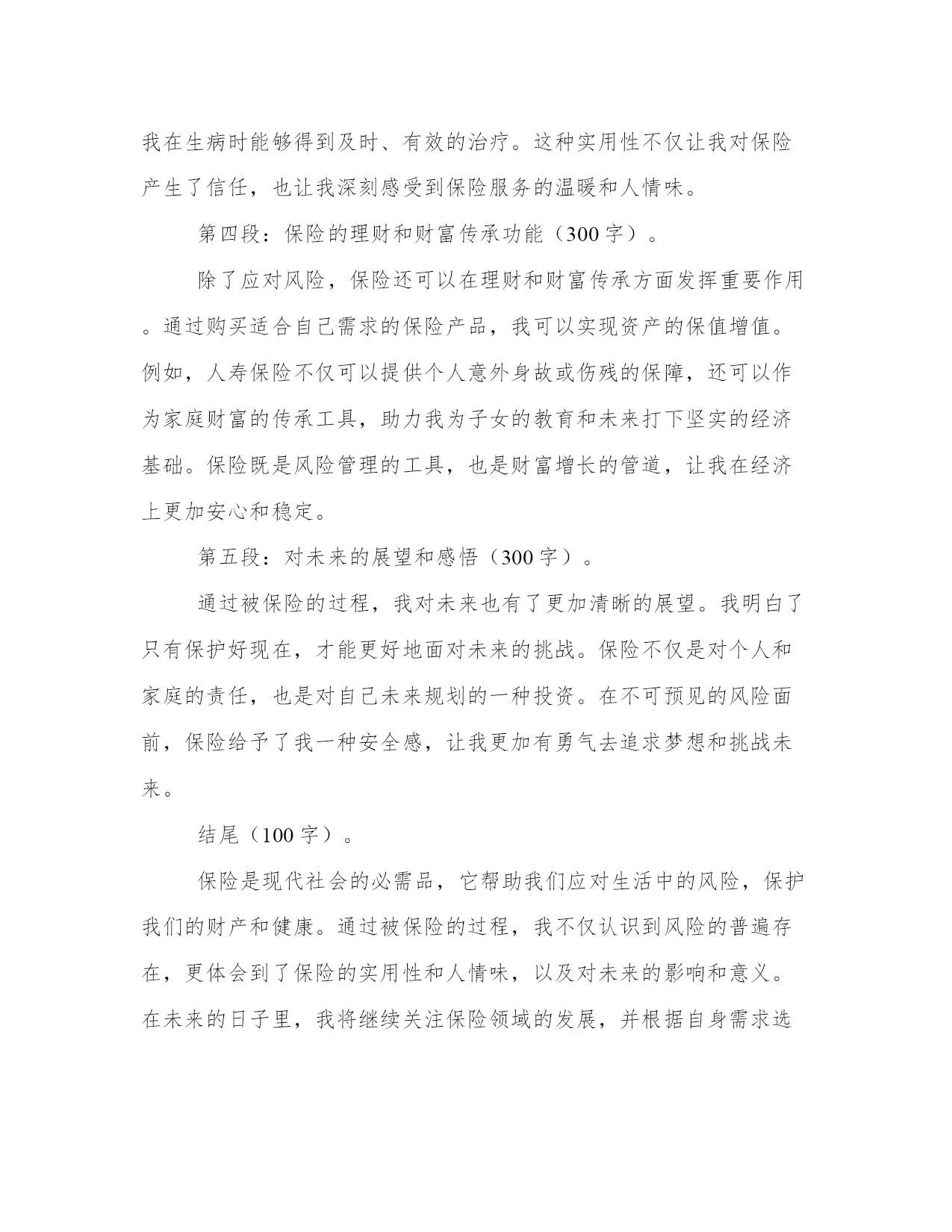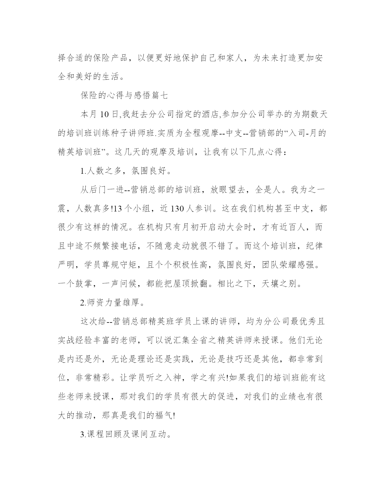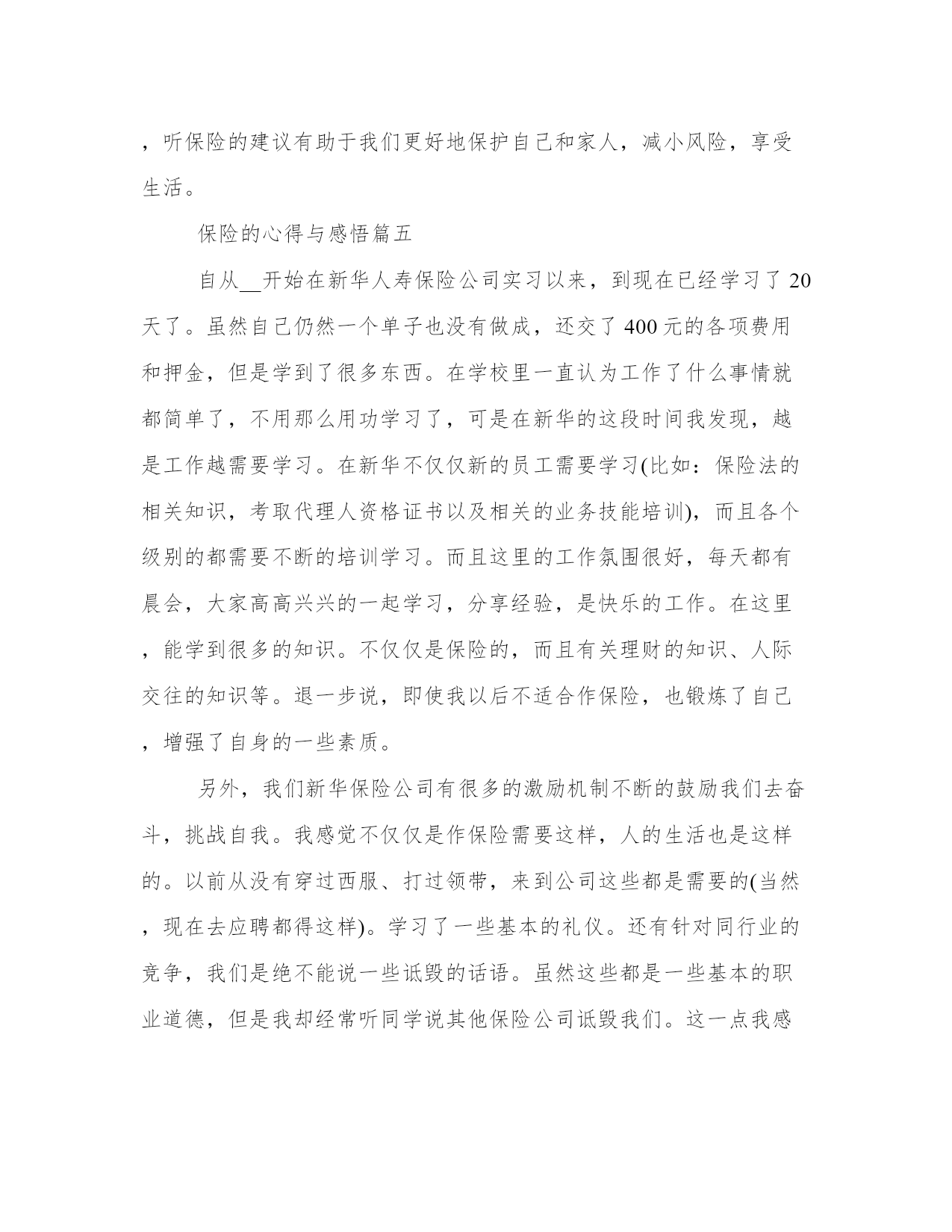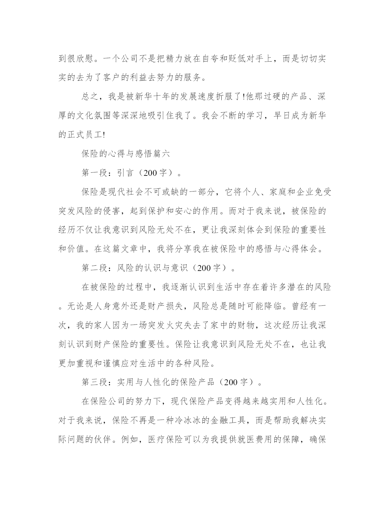 最新保险的心得与感悟(优秀19篇)我们在一些事情上受到启发后,应该马上记录下来,写一篇心得感悟,这样我们可以养成良好的总结方法。那么你知道心得感悟如何写吗?以下是我帮大家整理的最新心得感悟范文大全,希望能够帮助到大家,我们一起来看一看吧。保险的心得与感悟篇一现代人日益重视保险,保险行业也飞速发展。保险的本质是为了防范风险,但是在保险购买的过程中,我们也需要听从专业人员的建议,才能得到最适合自己的保险规划。在我多年的保险购买与理赔经历中,我深刻体会到了听保险的重要性,下面我就来分享一下我的感悟与心得。在保险的购买和理赔中,往往需要面对复杂的保险条款和附加条款,而且保险公司的千奇百怪的宣传也让人眼花缭乱。这时,听从专业的保险代理人的建议,可以帮我们更好地理解保险条款和附加条款,避免出现误解和纠纷。同时,保险代理人会根据我们的职业、收入、家庭状况等因素,为我们提供最合适的保险方案,帮助我们做到真正意义上的风险保障。第三段:听保险的经验。在我的保险购买历程中,我曾经因为对某些保险附加条款理解不足,而给我购买的某种保险增加了理赔难度,延长了理赔时间。在这种情况下,如果当时我听从保险代理人或专业人士的建议,通过详细了解保险合同及附加条款,及时针对所需要的风险进行规划和配置,那么就可以避免后续的不必要事宜和纠纷。这样,我们不仅可以更快地得到保险金,也可以大大减轻自己和家人的负担。我曾经听了一位保险代理人的建议,为我的孩子购买了教育金型的保险。在我的意图是为了为孩子未来的大学教育做一定的经济规划,而这位保险代理人也提醒我,教育金型的保险不仅能够起到储蓄的作用,同时还能够在孩子意外身故时,将剩余保险金一次性给予家庭,以扶助家庭度过难关。当时我认为这种生命险型的附加保障不太可能会用到,但是,现实往往是让人意想不到的。后来我的孩子在学校被欺负而受到身体伤害,虽然不是非常严重,但是还是需要送去医院治疗。这时我才发现,教育金型的保险非常实用,不仅可以计划好孩子的未来,还能在孩子发生意外的情况下,可以获得保险金及时治疗。最后,听从保险代理人的建议,不仅可以风险防范,也可以获得人生的快乐。比如,我曾经听从保险代理人的建议,为我和家人购买了一份旅行保险。虽然当时我认为旅行保险不是必须的,但是在我们的一次旅行中,因为自助餐店食品不洁,我们一家五口人都出现了食物中毒症状,需要紧急就医。如果没有购买旅行险,我们将面临高额的医疗费用。但是,因为听取了保险代理人的建议,我们成功获得了保险公司的赔偿,得以圆满结束这次旅游,同时也不会受到经济方面的过大冲击。总结:听保险的感悟与心得,是一条逐渐摸索的道路,也是广大保险购买者的必修课程。在这个保险日益发达的时代,我们不仅需要选择适合自己的保险产品,还需要听取专业人士的建议,并且通过实践和经验不断总结和提高。只有这样,我们才能真正做到保险保障的全面、有效和可靠。保险的心得与感悟篇二人寿一知半解到领会精神和文化,从对培训工作毫无接触到初步熟悉与参与,这一个月的进步是清晰可见的,这份实习对我心灵上的触动和引导也是前所未有的。保险行业:朝阳里的负重前行者由于认知的偏差,部分居民对于保险非常抵触,我在加入公司之前也存在过顾虑,但随着实习的深入,我对保险行业有了新的认识和判断,商业保险是居民理财结构中防御性很强的一部分,它与银行、证券、基金和信托等金融产品都是居民理财的元素,并且更加注重保障功能。随着从业人员素质的提高,居民投保意识的唤醒,监管的合理化,保险在我国将是大有可为的行业。一位前辈鞭策我:“在保险公司锻炼两年的收获胜于读一个博士”。作为一名准保险从业人员,我会以这份充满挑战的工作为荣,尽快成长为一名专业、胜任、负责的讲师,并利用好本硕期间的金融经济知识背景,不断完善知识结构,联系实际,今后有机会授课时能带给学员更多的收获。__。实习的一个月里,我对公司和产品都有了一定的认识。对于培训部的常规工作也有了初步的了解。培训部的领导和同事对我们实习生非常关心,注重对我们的培育与锻炼,公司其他伙伴对我们也很照顾,我很喜欢这样的工作氛围和人际关系。展望未来:读书行路,教学相长在我的新员工手册中,老师和我有一段对话,我写道:“保代班带给我的思考是,读书行路,不仅要向书本学习,更要向社会学习,要做一名优秀的培训师,离不开丰富的阅历和精专的学识。”老师点评:“讲师的三项基本能力:学习能力、总结能力、表达能力”。我将以这三项能力为目标,从基础做起,不断学习,不断进步。虽然身为内勤,但我也希望在各次培训中身体力行,与学员一起参加市场调查等活动,从学员实践的角度优化课程,加强课程的实践性和可行性。每一个为幸福而努力的人都是可爱可敬的。我希望自己能和大家互相学习,教学相长。也希望在__这片新鲜的沃土上,逐渐成长为一名