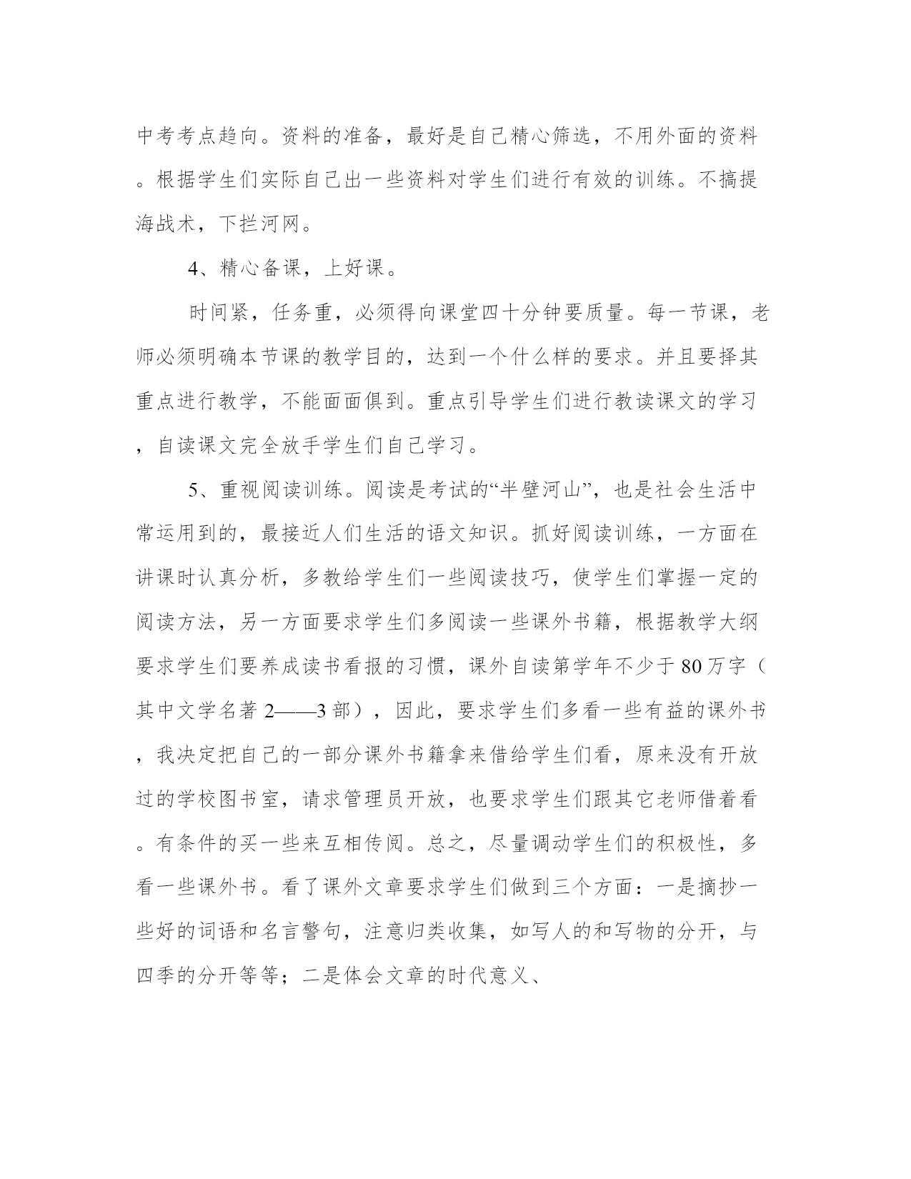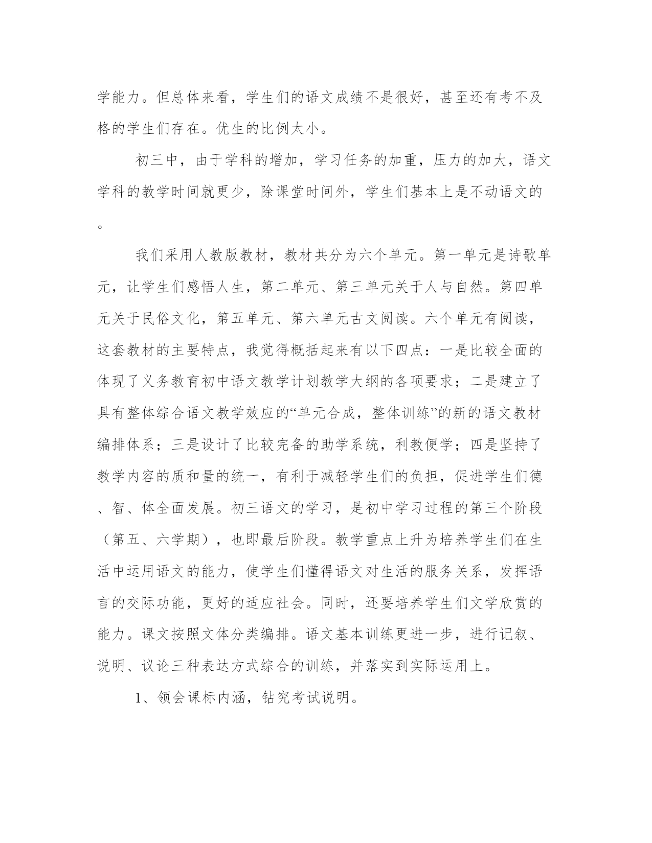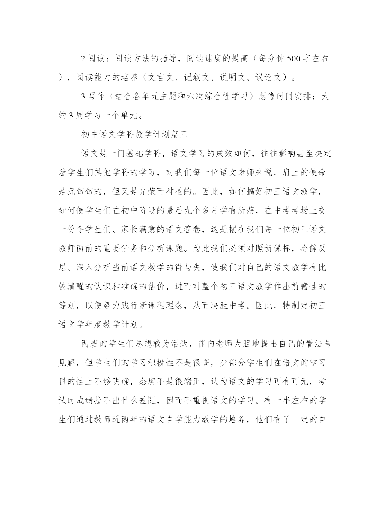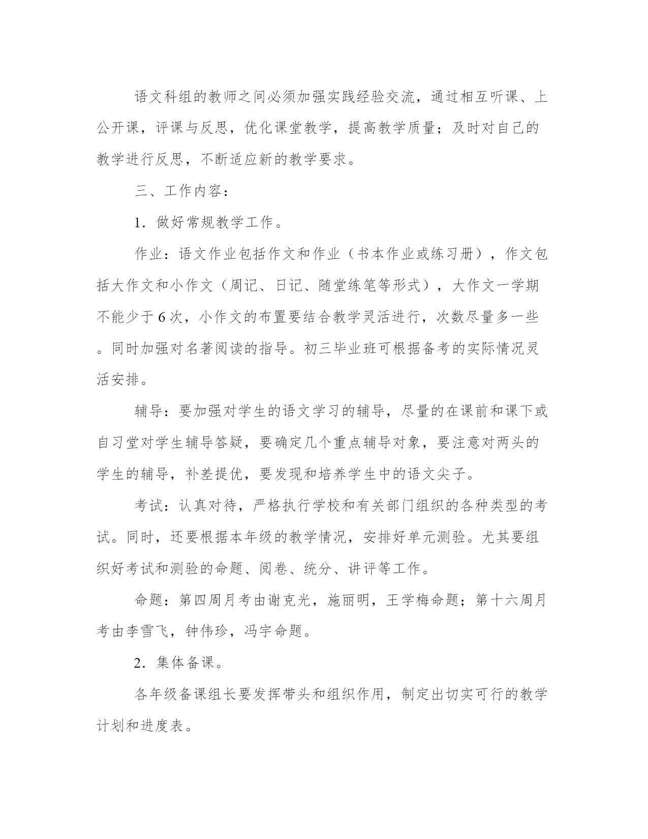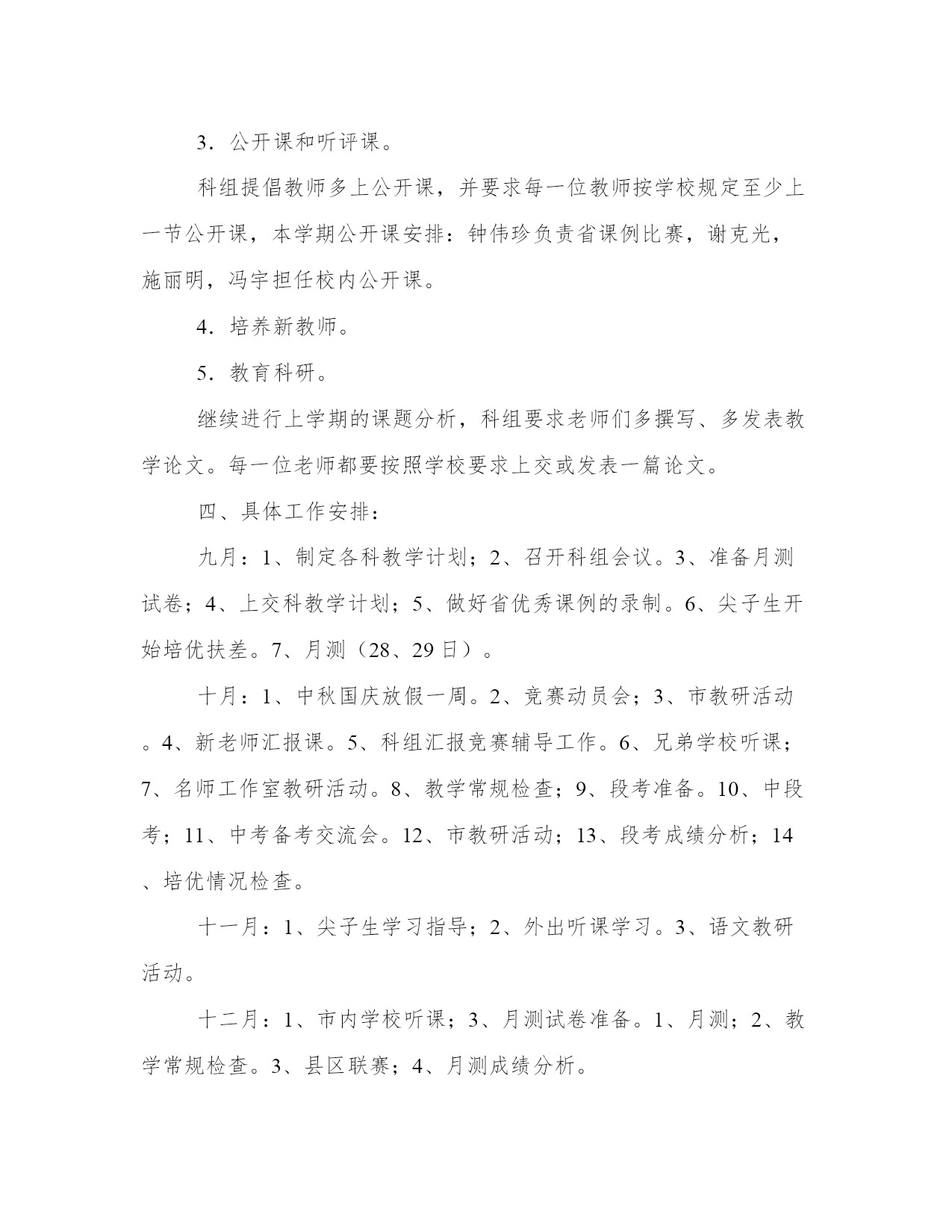 初中语文学科教学计划(精选11篇)计划的制定需要考虑目标的具体性、可行性和时限性。在制定计划时,我们需要充分了解相关知识和信息。计划是为了有条不紊地实现目标而做出的合理安排。没有计划,就很难有系统性地进行工作和学习。计划可以帮助我们合理安排时间,提高工作和学习的效率。那么我们该如何写一篇较为完美的计划呢?要写一篇较为完美的计划,首先需要明确目标和需求。在制定计划时,要考虑实际情况和可行性,不要盲目乐观或过于保守。以下是小编为大家收集的计划范文,供大家参考。初中语文学科教学计划篇一一、指导思想与工作目标:本学期继续探索新课程实验,推进教学理念、教学方法和教学手段的变革,构建以学生为主体的教学模式,提高课堂教学效率,做好科组各项工作。二、工作措施:(一)加强学习,提高自身素质和业务水平。利用科组活动的时间,组织教师加强理论学习,更新教育观念,提高自身的教育理论水平和教学业务能力。(二)加强实践交流,提高课堂教学质量。语文科组的教师之间必须加强实践经验交流,通过相互听课、上公开课,评课与反思,优化课堂教学,提高教学质量;及时对自己的教学进行反思,不断适应新的教学要求。三、工作内容:1.做好常规教学工作。作业:语文作业包括作文和作业(书本作业或练习册),作文包括大作文和小作文(周记、日记、随堂练笔等形式),大作文一学期不能少于6次,小作文的布置要结合教学灵活进行,次数尽量多一些。同时加强对名著阅读的指导。初三毕业班可根据备考的实际情况灵活安排。辅导:要加强对学生的语文学习的辅导,尽量的在课前和课下或自习堂对学生辅导答疑,要确定几个重点辅导对象,要注意对两头的学生的辅导,补差提优,要发现和培养学生中的语文尖子。考试:认真对待,严格执行学校和有关部门组织的各种类型的考试。同时,还要根据本年级的教学情况,安排好单元测验。尤其要组织好考试和测验的命题、阅卷、统分、讲评等工作。命题:第四周月考由谢克光,施丽明,王学梅命题;第十六周月考由李雪飞,钟伟珍,冯宇命题。2.集体备课。各年级备课组长要发挥带头和组织作用,制定出切实可行的教学计划和进度表。3.公开课和听评课。科组提倡教师多上公开课,并要求每一位教师按学校规定至少上一节公开课,本学期公开课安排:钟伟珍负责省课例比赛,谢克光,施丽明,冯宇担任校内公开课。4.培养新教师。5.教育科研。继续进行上学期的课题分析,科组要求老师们多撰写、多发表教学论文。每一位老师都要按照学校要求上交或发表一篇论文。四、具体工作安排:九月:1、制定各科教学计划;2、召开科组会议。3、准备月测试卷;4、上交科教学计划;5、做好省优秀课例的录制。6、尖子生开始培优扶差。7、月测(28、29日)。十月:1、中秋国庆放假一周。2、竞赛动员会;3、市教研活动。4、新老师汇报课。5、科组汇报竞赛辅导工作。6、兄弟学校听课;7、名师工作室教研活动。8、教学常规检查;9、段考准备。10、中段考;11、中考备考交流会。12、市教研活动;13、段考成绩分析;14、培优情况检查。十一月:1、尖子生学习指导;2、外出听课学习。3、语文教研活动。十二月:1、市内学校听课;3、月测试卷准备。1、月测;2、教学常规检查。3、县区联赛;4、月测成绩分析。一月:1、完成新授课;2、备考情况交流汇报。3、期末复习。1、期末考试;2、上交各类总结;3、放寒假。初中语文学科教学计划篇二一、指导思想:(一)、语文是一切学科的基础,要想全面提高学生的素质,首先必须让他们学好语文。所以,必须竭尽全力提高学生学习语文的爱好,提高课堂效率,提高学习成绩。(二)、以课文为有效载体,以训练学生的阅读能力为主线,阶段性地逐步提高学生语文学科的听、说、读、写四种能力,从而培养学生具有综合学习的意识和能力。二、教材分析:义务教育阶段的语文课本,旧的课本是按照文体的形式来编排的,分为小说单元、诗歌单元、散文单元、古文单元等等。而新的课程标准指导下的课本是按照主题的形式来编排的,每一个单元(或一组文章)围绕着一个主题,在文章的选择上尽量照顾到古今中外不同体裁的文章。一个主题一般是一个话题(也有的是文体,如童话;有的是写作技巧,如“观察与发现”“描写动物”等),围绕这个话题,从古今中外四个方面选择不同体裁和风格的文章(也有的单元不能全部照顾到这四个方面)。这与过去语文课本的编排有很大不同。过去按文体编排的文章,虽然体裁相同,但在文章的主题思想上差别很大,所以每篇文章都要归纳主题思想。现在既然一个单元就是一个主题,也用不着每篇文章都去归纳主题思想,一个单元的文章就是一个大的主题,只是每篇文章的侧重点不同而已,学习每篇文章时只要找出这些不同就行了。课本的编排体例变了,教学的方式也要变。教师要改变那种传统的教学思路,每