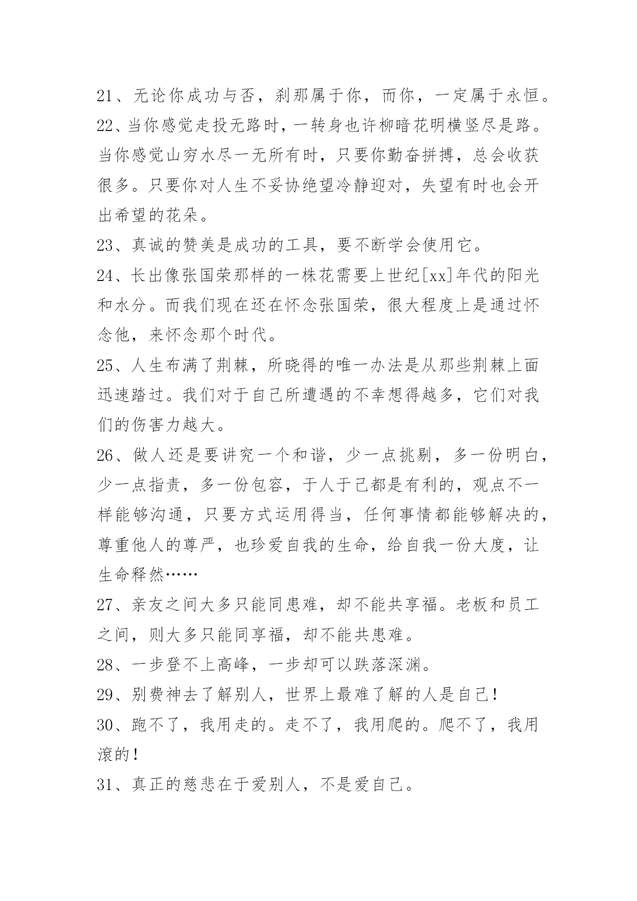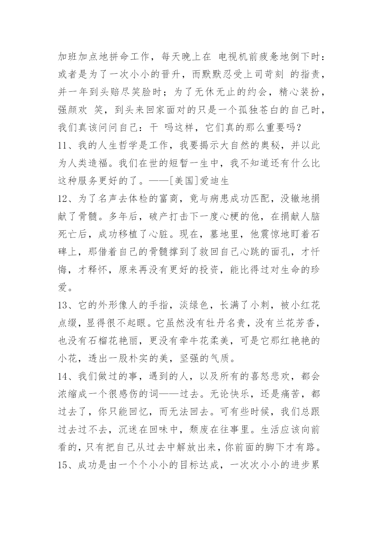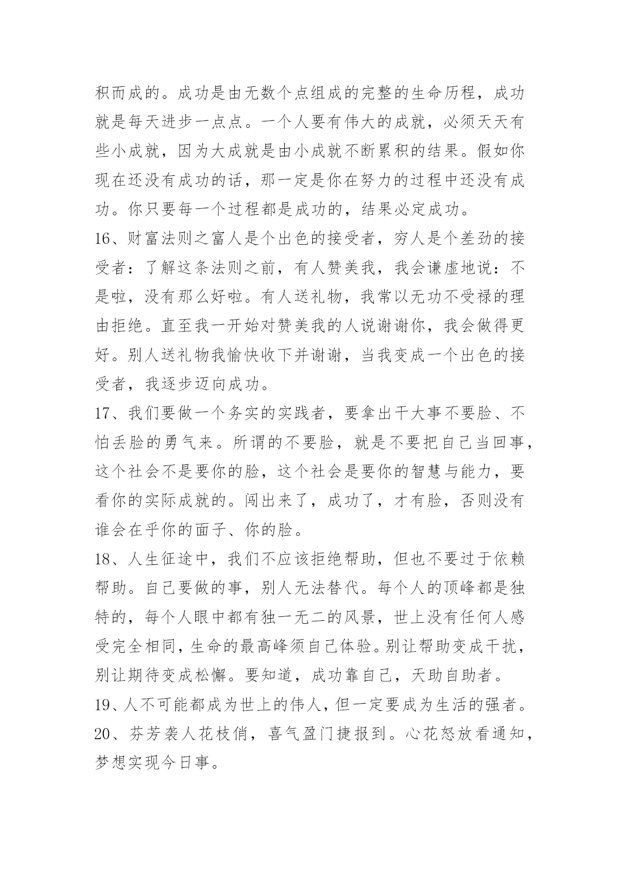 工作励志语录78条【推荐】2023年工作励志语录大合集78条要想赢,就一定不能怕输。不怕输,结果未必能赢。但是怕输,结果则一定是输。下面是关于工作励志语录78条,希望对大家有所帮助。1、人生得来不易,还能在路上忙碌着奔波着应该庆幸,至少我们还有这个资本和气力拼搏。每个人都是特殊而独一无二的,这样的生命,你会好好珍惜,路上的缘份,你也会且行且珍惜。来的走的,不早不晚,对或是错,不去躲闪。现实已不容你停步休息,只好一路微笑前行,放下世俗,也放过疲惫的自己。2、高级胸围有一个哲学,就是越少布料越贵。布料少代表性感,性感而不低俗是一种艺术。一个女人,能够令男人觉得她性感,而不觉得她低俗,便是成功。3、第一,你能尊重多少人,就有多少人尊重你;第二,你能信任多少人,就有多少人信任你;第三,你能跟多少人协作,就有多少人跟你协作;第四,你能让多少人成功,就有多少人帮助你成功。4、我不求必胜,但矢志真挚。我不一定求成功,但定必言行如一,坚持到底。我必将与正派人物并肩,是其所是,非其所非。5、每个成功的人都必然是善于学习的人,每个成功的人也都必然是坚持终身学习与自学自修的人。6、尊重他人,就是尊重自己每个人都想成功,都有可能成功,但如果没有良好的人际关系,却很难成功。尊重他人,便会多一些理解、宽容与与谐,少一些轻视、隔膜与排斥。这样,你的周围便会聚集一批尊重你、信任你与帮助你的人。同时,尊重每一个人才能服务好每一个人。7、人性最大的悲哀,是走不出心灵的迷茫;最坏的陋习,是丢弃了行进的方向。生活原本很苦,说出来的苦叫做软弱,若哭,只能哭给自己听;欢乐其实不多,埋于心的苦谓之坚强,若笑,那就笑给世界看。活着就是一场寂寞与孤独的修行,无论高尚与卑微,都要强烈追逐自己的命运,只有你想要,然后才可能拥有。8、人生的路上,我们只有咬紧牙关,用脚步丈量路途,用汗水辉映阳光,管它山高水远路长,前面就是心的方向。坚强是我们心灵的壳,维护着我们的脆弱。纷扰的尘世,冷漠的空间,我们唯有选择坚强,才能抗拒诱惑与寒流的侵袭,给精神一个支点,给心灵一个家园。你不坚强,没人替你掩饰忧伤。9、人应该有一种天不怕、地不怕的精神,想事就要想别人想不到的事,做事就要做别人不敢做的事,只有这样才能获得别人得不到的收获。一个不敢冒险的人,即使有再好的机会到来,他也不敢去抓住机会进行尝试,这样的做法固然没有失败的风险,但是也不会有成功的希望。10、简单,是平息外部无休无止的喧嚣,回归内在自我的唯一途径。当我们为拥有一幢豪华别墅、一辆漂亮小汽车而加班加点地拼命工作,每天晚上在电视机前疲惫地倒下时:或者是为了一次小小的晋升,而默默忍受上司苛刻的指责,并一年到头赔尽笑脸时;为了无休无止的约会,精心装扮,强颜欢笑,到头来回家面对的只是一个孤独苍白的自己时,我们真该问问自己:干吗这样,它们真的那么重要吗?11、我的人生哲学是工作,我要揭示大自然的奥秘,并以此为人类造福。我们在世的短暂一生中,我不知道还有什么比这种服务更好的了。——[美国]爱迪生12、为了名声去体检的富商,竟与病患成功匹配,没辙地捐献了骨髓。多年后,破产打击下一度心梗的他,在捐献人脑死亡后,成功移植了心脏。现在,墓地里,他震惊地盯着石碑上,那借着自己的骨髓撑到了救回自己心跳的面孔,才忏悔,才释怀,原来再没有更好的投资,能比得过对生命的珍爱。13、它的外形像人的手指,淡绿色,长满了小刺,被小红花点缀,显得很不起眼。它虽然没有牡丹名贵,没有兰花芳香,也没有石榴花艳丽,更没有牵牛花柔美,可是它那红艳艳的小花,透出一股朴实的美,坚强的气质。14、我们做过的事,遇到的人,以及所有的喜怒悲欢,都会浓缩成一个很感伤的词——过去。无论快乐,还是痛苦,都过去了,你只能回忆,而无法回去。可有些时候,我们总跟过去过不去,沉迷在回味中,颓废在往事里。生活应该向前看的,只有把自己从过去中解放出来,你前面的脚下才有路。15、成功是由一个个小小的目标达成,一次次小小的进步累积而成的。成功是由无数个点组成的完整的生命历程,成功就是每天进步一点点。一个人要有伟大的成就,必须天天有些小成就,因为大成就是由小成就不断累积的结果。假如你现在还没有成功的话,那一定是你在努力的过程中还没有成功。你只要每一个过程都是成功的,结果必定成功。16、财富法则之富人是个出色的接受者,穷人是个差劲的接受者:了解这条法则之前,有人赞美我,我会谦虚地说:不是啦,没有那么好啦。有人送礼物,我常以无功不受禄的理由拒绝。直至我一开始对赞美我的人说谢谢你,我会做得更好。别人送礼物我愉快收下并谢谢,当我变成一个出色的接受者,我逐步迈向成功。17、我们要做一个务实的实践者,要拿出干大事不要脸、不怕丢脸的勇气来。所谓的不要脸,就是不要把自己当回事,这个社会不是要你的脸,这个社会是要你的智慧与能力,要看你