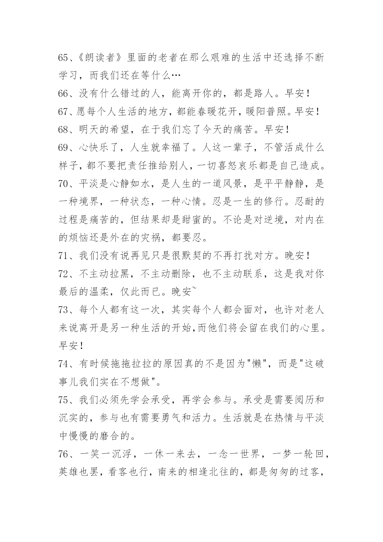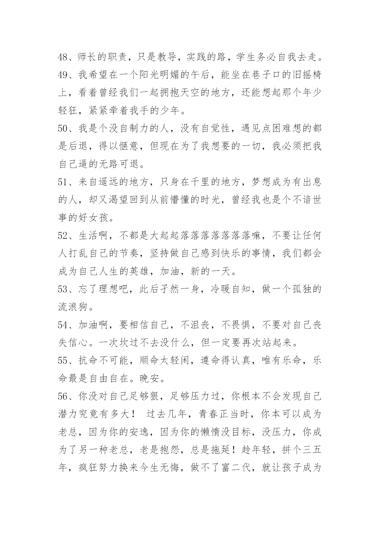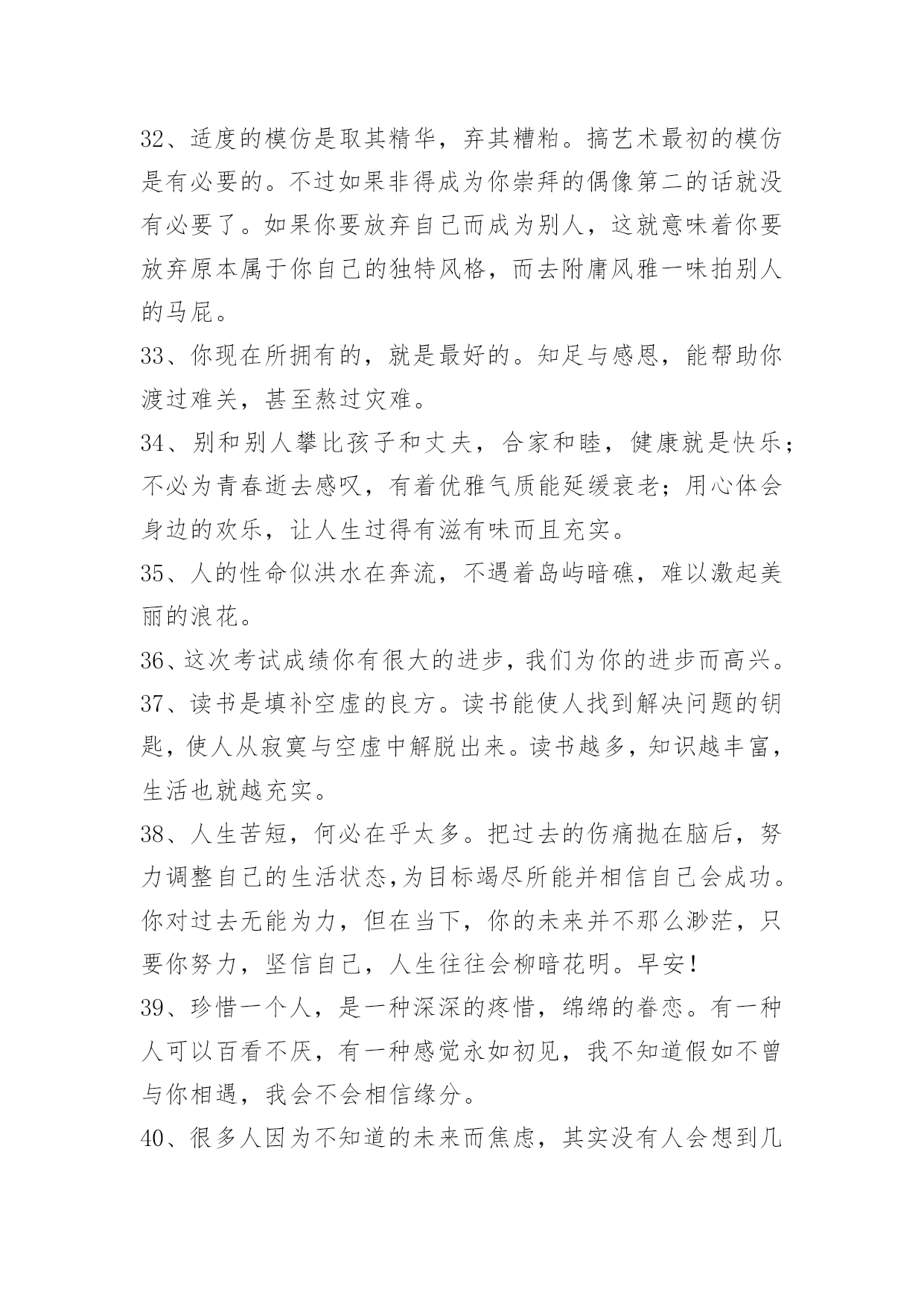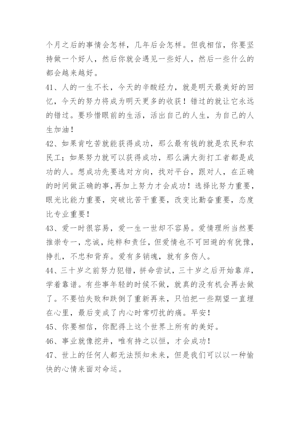 工作励志语录78条【推荐】2023年工作励志语录大合集78条要想赢,就一定不能怕输。不怕输,结果未必能赢。但是怕输,结果则一定是输。下面是关于工作励志语录78条,希望对大家有所帮助。1、人生得来不易,还能在路上忙碌着奔波着应该庆幸,至少我们还有这个资本和气力拼搏。每个人都是特殊而独一无二的,这样的生命,你会好好珍惜,路上的缘份,你也会且行且珍惜。来的走的,不早不晚,对或是错,不去躲闪。现实已不容你停步休息,只好一路微笑前行,放下世俗,也放过疲惫的自己。2、高级胸围有一个哲学,就是越少布料越贵。布料少代表性感,性感而不低俗是一种艺术。一个女人,能够令男人觉得她性感,而不觉得她低俗,便是成功。3、第一,你能尊重多少人,就有多少人尊重你;第二,你能信任多少人,就有多少人信任你;第三,你能跟多少人协作,就有多少人跟你协作;第四,你能让多少人成功,就有多少人帮助你成功。4、我不求必胜,但矢志真挚。我不一定求成功,但定必言行如一,坚持到底。我必将与正派人物并肩,是其所是,非其所非。5、每个成功的人都必然是善于学习的人,每个成功的人也都必然是坚持终身学习与自学自修的人。6、尊重他人,就是尊重自己每个人都想成功,都有可能成功,但如果没有良好的人际关系,却很难成功。尊重他人,便会多一些理解、宽容与与谐,少一些轻视、隔膜与排斥。这样,你的周围便会聚集一批尊重你、信任你与帮助你的人。同时,尊重每一个人才能服务好每一个人。7、人性最大的悲哀,是走不出心灵的迷茫;最坏的陋习,是丢弃了行进的方向。生活原本很苦,说出来的苦叫做软弱,若哭,只能哭给自己听;欢乐其实不多,埋于心的苦谓之坚强,若笑,那就笑给世界看。活着就是一场寂寞与孤独的修行,无论高尚与卑微,都要强烈追逐自己的命运,只有你想要,然后才可能拥有。8、人生的路上,我们只有咬紧牙关,用脚步丈量路途,用汗水辉映阳光,管它山高水远路长,前面就是心的方向。坚强是我们心灵的壳,维护着我们的脆弱。纷扰的尘世,冷漠的空间,我们唯有选择坚强,才能抗拒诱惑与寒流的侵袭,给精神一个支点,给心灵一个家园。你不坚强,没人替你掩饰忧伤。9、人应该有一种天不怕、地不怕的精神,想事就要想别人想不到的事,做事就要做别人不敢做的事,只有这样才能获得别人得不到的收获。一个不敢冒险的人,即使有再好的机会到来,他也不敢去抓住机会进行尝试,这样的做法固然没有失败的风险,但是也不会有成功的希望。10、简单,是平息外部无休无止的喧嚣,回归内在自我的唯一途径。当我们为拥有一幢豪华别墅、一辆漂亮小汽车而加班加点地拼命工作,每天晚上在电视机前疲惫地倒下时:或者是为了一次小小的晋升,而默默忍受上司苛刻的指责,并一年到头赔尽笑脸时;为了无休无止的约会,精心装扮,强颜欢笑,到头来回家面对的只是一个孤独苍白的自己时,我们真该问问自己:干吗这样,它们真的那么重要吗?11、我的人生哲学是工作,我要揭示大自然的奥秘,并以此为人类造福。我们在世的短暂一生中,我不知道还有什么比这种服务更好的了。——[美国]爱迪生12、为了名声去体检的富商,竟与病患成功匹配,没辙地捐献了骨髓。多年后,破产打击下一度心梗的他,在捐献人脑死亡后,成功移植了心脏。现在,墓地里,他震惊地盯着石碑上,那借着自己的骨髓撑到了救回自己心跳的面孔,才忏悔,才释怀,原来再没有更好的投资,能比得过对生命的珍爱。13、它的外形像人的手指,淡绿色,长满了小刺,被小红花点缀,显得很不起眼。它虽然没有牡丹名贵,没有兰花芳香,也没有石榴花艳丽,更没有牵牛花柔美,可是它那红艳艳的小花,透出一股朴实的美,坚强的气质。14、我们做过的事,遇到的人,以及所有的喜怒悲欢,都会浓缩成一个很感伤的词——过去。无论快乐,还是痛苦,都过去了,你只能回忆,而无法回去。可有些时候,我们总跟过去过不去,沉迷在回味中,颓废在往事里。生活应该向前看的,只有把自己从过去中解放出来,你前面的脚下才有路。15、成功是由一个个小小的目标达成,一次次小小的进步累积而成的。成功是由无数个点组成的完整的生命历程,成功就是每天进步一点点。一个人要有伟大的成就,必须天天有些小成就,因为大成就是由小成就不断累积的结果。假如你现在还没有成功的话,那一定是你在努力的过程中还没有成功。你只要每一个过程都是成功的,结果必定成功。16、财富法则之富人是个出色的接受者,穷人是个差劲的接受者:了解这条法则之前,有人赞美我,我会谦虚地说:不是啦,没有那么好啦。有人送礼物,我常以无功不受禄的理由拒绝。直至我一开始对赞美我的人说谢谢你,我会做得更好。别人送礼物我愉快收下并谢谢,当我变成一个出色的接受者,我逐步迈向成功。17、我们要做一个务实的实践者,要拿出干大事不要脸、不怕丢脸的勇气来。所谓的不要脸,就是不要把自己当回事,这个社会不是要你的脸,这个社会是要你的智慧与能力,要看你