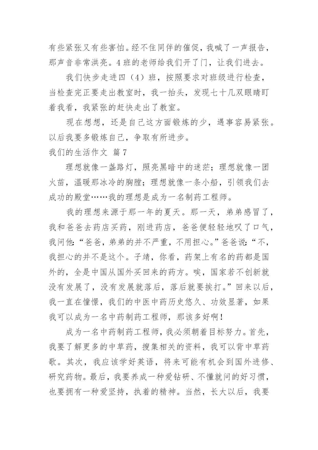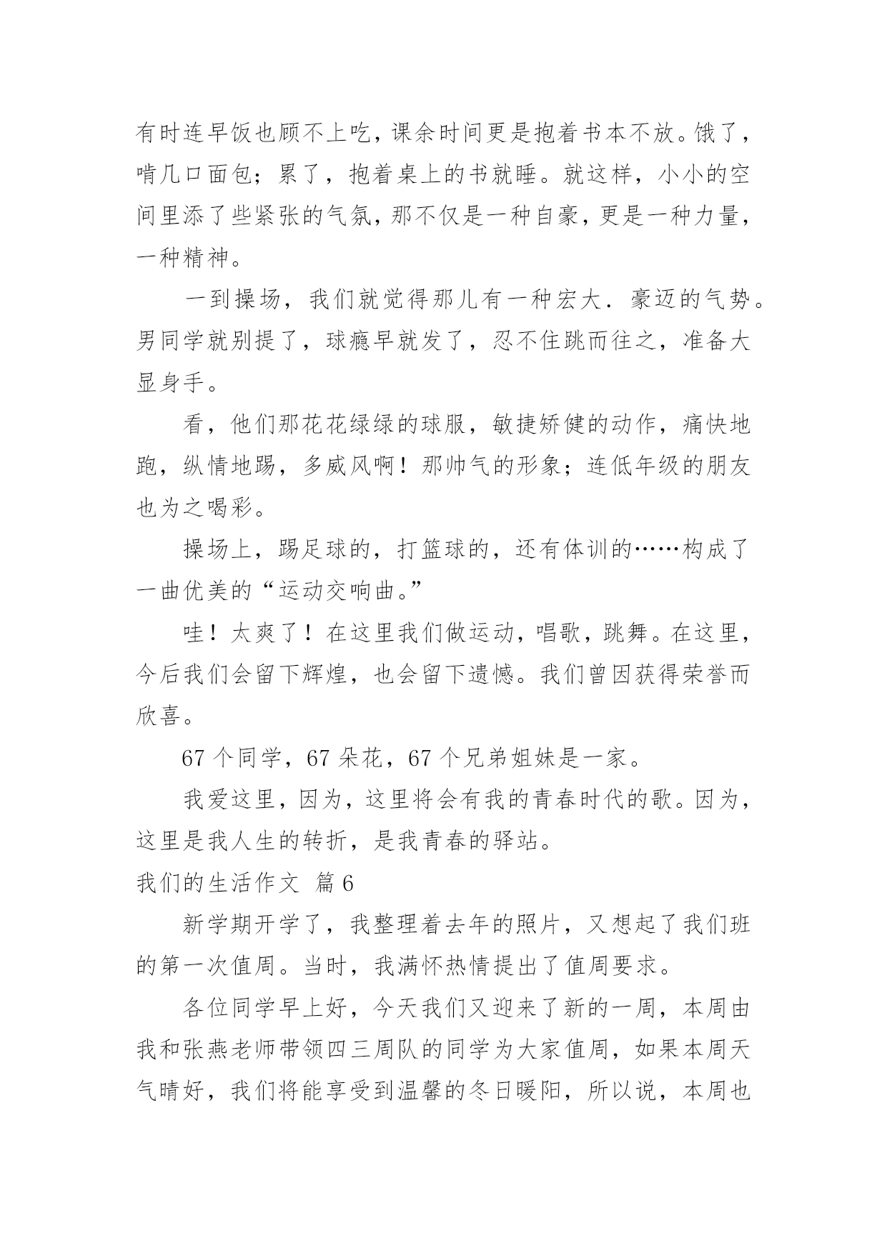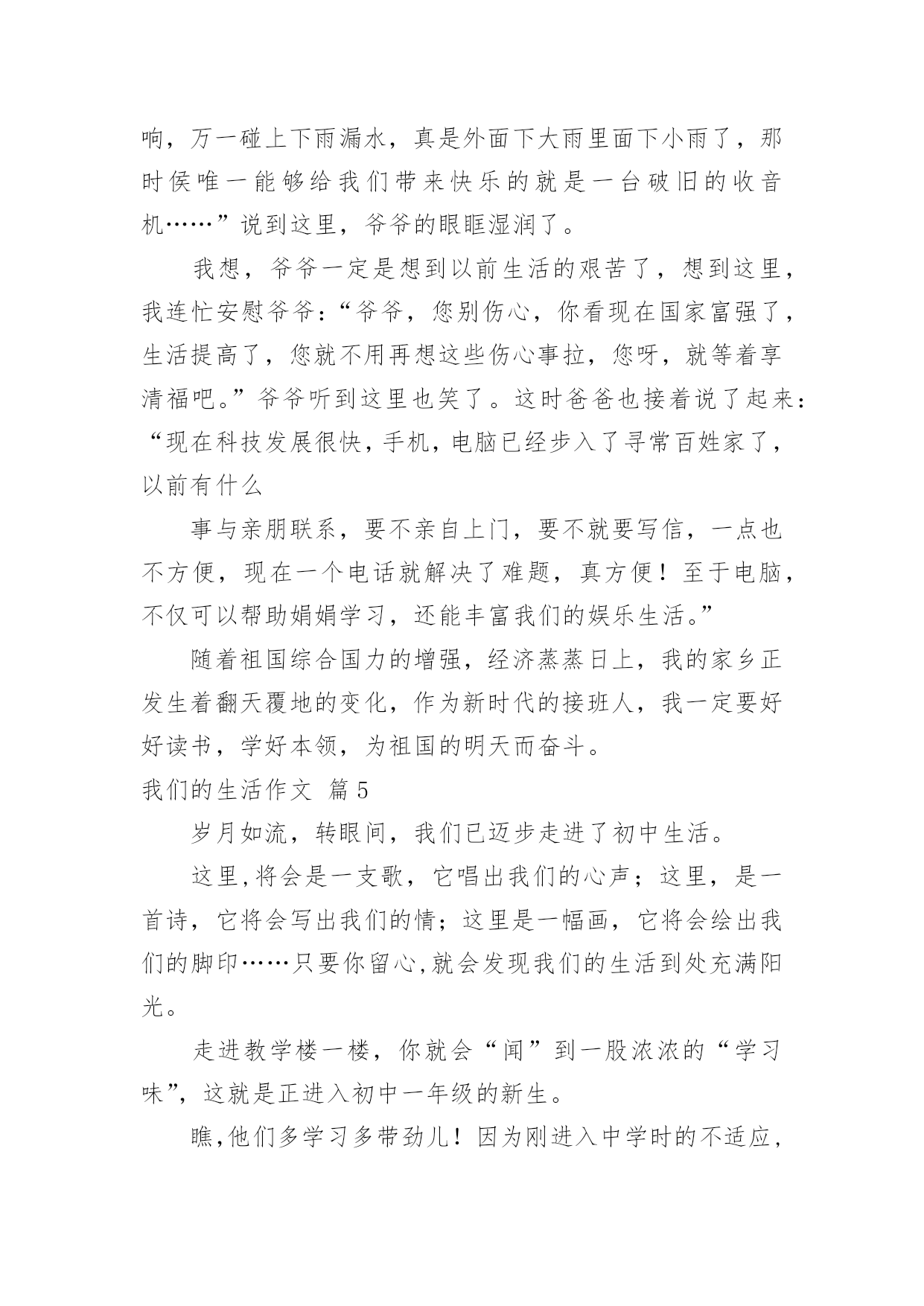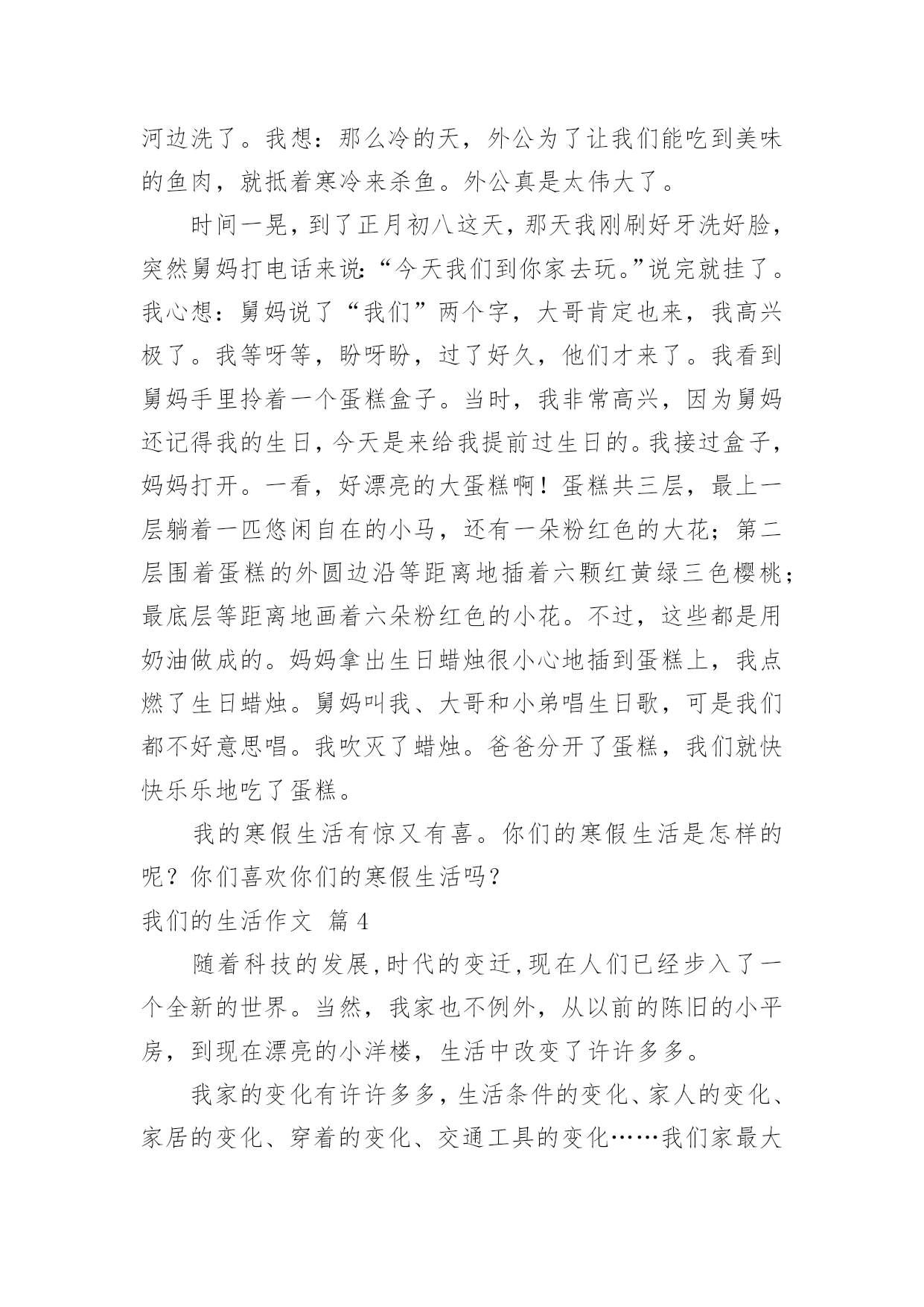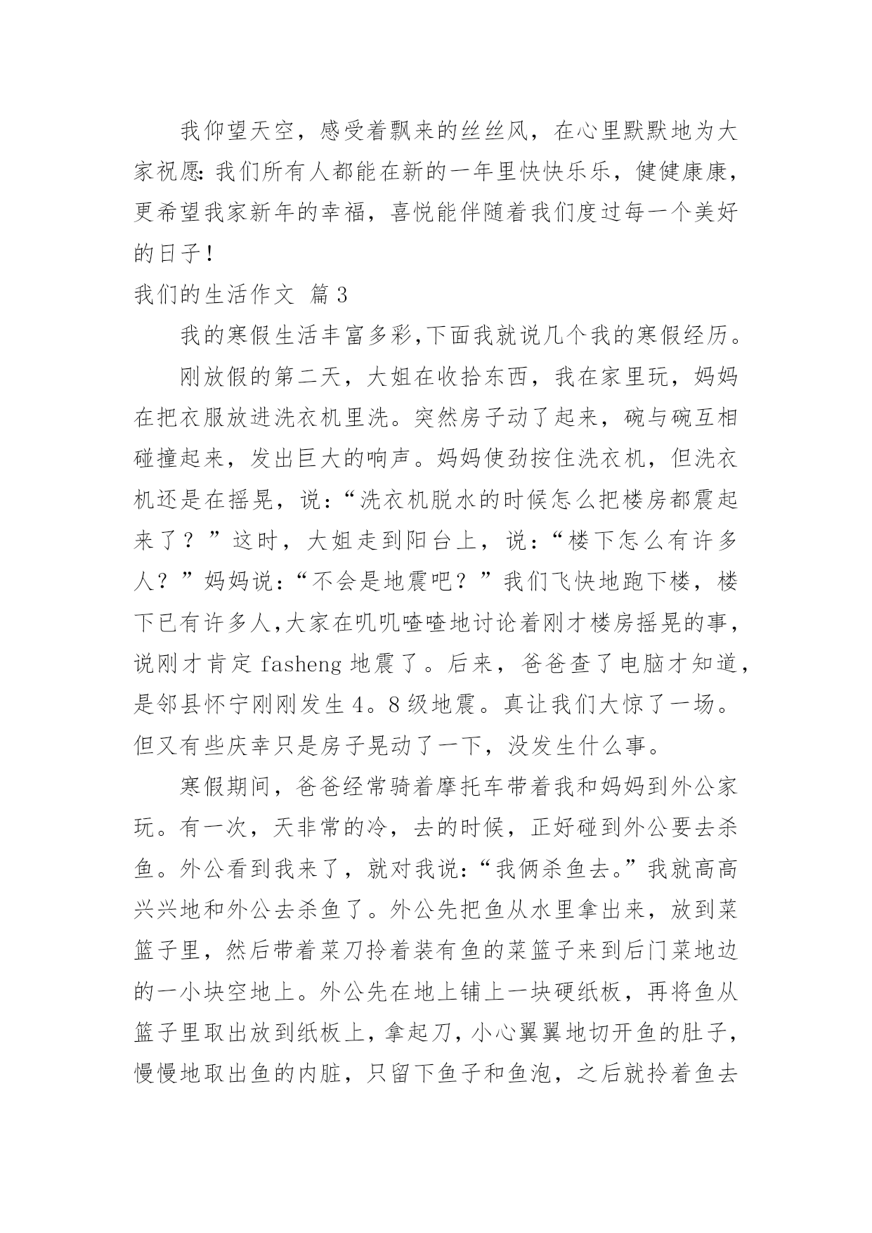 我们的生活作文我们的生活作文九篇在日常学习、工作和生活中,说到作文,大家肯定都不陌生吧,通过作文可以把我们那些零零散散的思想,聚集在一块。那么你知道一篇好的作文该怎么写吗?下面是小编为大家整理的我们的生活作文9篇,希望能够帮助到大家。我们的生活作文篇1在我们班,有一位数学特别好的同学,嘿嘿,他就是我的“死对头”同桌——罗一帆。罗一帆长着一个“国”字形的脑袋,一对炯炯有神的眼睛总在课堂上露出智慧之光。短短的头发给人一种十分帅气的感觉。别看他表面帅气,一张嘴巴,一颗颗和我一样参差不齐的牙齿就露了出来。一笑,两个浅浅的酒窝便挤了出来。我同桌可是一个“阴转晴”的高手。如果有一个同学惹了他,罗一帆就会像一头愤怒的小狮子,冲向那位同学,吓着那位同学连连道歉。班上的同学都知道,惹了罗一帆,他会生好大一会儿气。果然同桌愤怒地坐在位置上,嘟着嘴巴,不停地对惹他生气的同学翻白眼。我把我们班“著名”的笑星——李俊男请了过来,叫他给罗一帆消消气。“从前,从呀从呀那个从前……”李俊男连内容都没讲,就把罗一帆逗笑了,又回到刚才那副活泼样。我的同桌怎么样?嘿嘿,羡慕吧?我们的生活作文篇2“啪啦啦……”随着一声声清脆的鞭炮声,我们迎来了新的一年。新年到来之际,我们家热闹开了,人人都忙着为新年作准备。你瞧!母亲,姑姑,奶奶们正准备着美味的菜肴,让人看着都眼馋;你看!父亲,舅舅们跑东跑西——摆桌子,放椅子就是他们的活;你瞅!可爱的孩子们蹦来跑去,一起玩耍,嬉戏。这时,谁都放开了繁重的工作,新年的喜悦带走了大家心中所有的烦恼和不快,我们欢快的脸颊上都挂着会心的笑,笑得自然,笑得舒心。晚上吃团圆饭是过年最热闹的时候了!我们都围聚一堂,享受着难有的团聚的味道。此刻,大家都一边享受着菜桌上丰富,美味,最可口的饭菜,一边纷纷诉说一年生活中的喜怒哀乐。时而从桌子边飘出阵阵善意的笑声,时而却又听见爱护的“指责”,真是热闹非凡,大家都为即将过去的一年作总结,边笑边谈着自己的新年的新愿望。真是新年新气象哦!我最喜欢的就是吃完饭放烟花了。每一簇火苗带着我们新年的新愿望和祝福从烟花筒里窜出,伸向和我们心胸一样广阔无垠的天空,在空中绽放出美丽的烟花。虽然它在瞬间消失,但是给我留下的印象是永恒的,五彩的烟花酒向我们五彩的心境,有红的激情,蓝的遐想,紫的浪漫……让我情不自禁地久久沉浸在他给我们带来的快乐之中。美好的一天总是短暂的,在鞭炮声中开始的新年,又在烟花中慢慢的结束了,留给我们的是和烟花一样美好的,永恒的记忆。我仰望天空,感受着飘来的丝丝风,在心里默默地为大家祝愿:我们所有人都能在新的一年里快快乐乐,健健康康,更希望我家新年的幸福,喜悦能伴随着我们度过每一个美好的日子!我们的生活作文篇3我的寒假生活丰富多彩,下面我就说几个我的寒假经历。刚放假的第二天,大姐在收拾东西,我在家里玩,妈妈在把衣服放进洗衣机里洗。突然房子动了起来,碗与碗互相碰撞起来,发出巨大的响声。妈妈使劲按住洗衣机,但洗衣机还是在摇晃,说:“洗衣机脱水的时候怎么把楼房都震起来了?”这时,大姐走到阳台上,说:“楼下怎么有许多人?”妈妈说:“不会是地震吧?”我们飞快地跑下楼,楼下已有许多人,大家在叽叽喳喳地讨论着刚才楼房摇晃的事,说刚才肯定fasheng地震了。后来,爸爸查了电脑才知道,是邻县怀宁刚刚发生4。8级地震。真让我们大惊了一场。但又有些庆幸只是房子晃动了一下,没发生什么事。寒假期间,爸爸经常骑着摩托车带着我和妈妈到外公家玩。有一次,天非常的冷,去的时候,正好碰到外公要去杀鱼。外公看到我来了,就对我说:“我俩杀鱼去。”我就高高兴兴地和外公去杀鱼了。外公先把鱼从水里拿出来,放到菜篮子里,然后带着菜刀拎着装有鱼的菜篮子来到后门菜地边的一小块空地上。外公先在地上铺上一块硬纸板,再将鱼从篮子里取出放到纸板上,拿起刀,小心翼翼地切开鱼的肚子,慢慢地取出鱼的内脏,只留下鱼子和鱼泡,之后就拎着鱼去河边洗了。我想:那么冷的天,外公为了让我们能吃到美味的鱼肉,就抵着寒冷来杀鱼。外公真是太伟大了。时间一晃,到了正月初八这天,那天我刚刷好牙洗好脸,突然舅妈打电话来说:“今天我们到你家去玩。”说完就挂了。我心想:舅妈说了“我们”两个字,大哥肯定也来,我高兴极了。我等呀等,盼呀盼,过了好久,他们才来了。我看到舅妈手里拎着一个蛋糕盒子。当时,我非常高兴,因为舅妈还记得我的生日,今天是来给我提前过生日的。我接过盒子,妈妈打开。一看,好漂亮的大蛋糕啊!蛋糕共三层,最上一层躺着一匹悠闲自在的小马,还有一朵粉红色的大花;第二层围着蛋糕的外圆边沿等距离地插着六颗红黄绿三色樱桃;最底层等距离地画着六朵粉红色的小花。不过,这些都是用奶油做成的。妈妈拿出生日蜡烛很小心地插到蛋糕上,我点燃了生日蜡烛。舅妈叫我、大哥和小弟唱生日歌,可是我们都不好意思唱。我吹灭