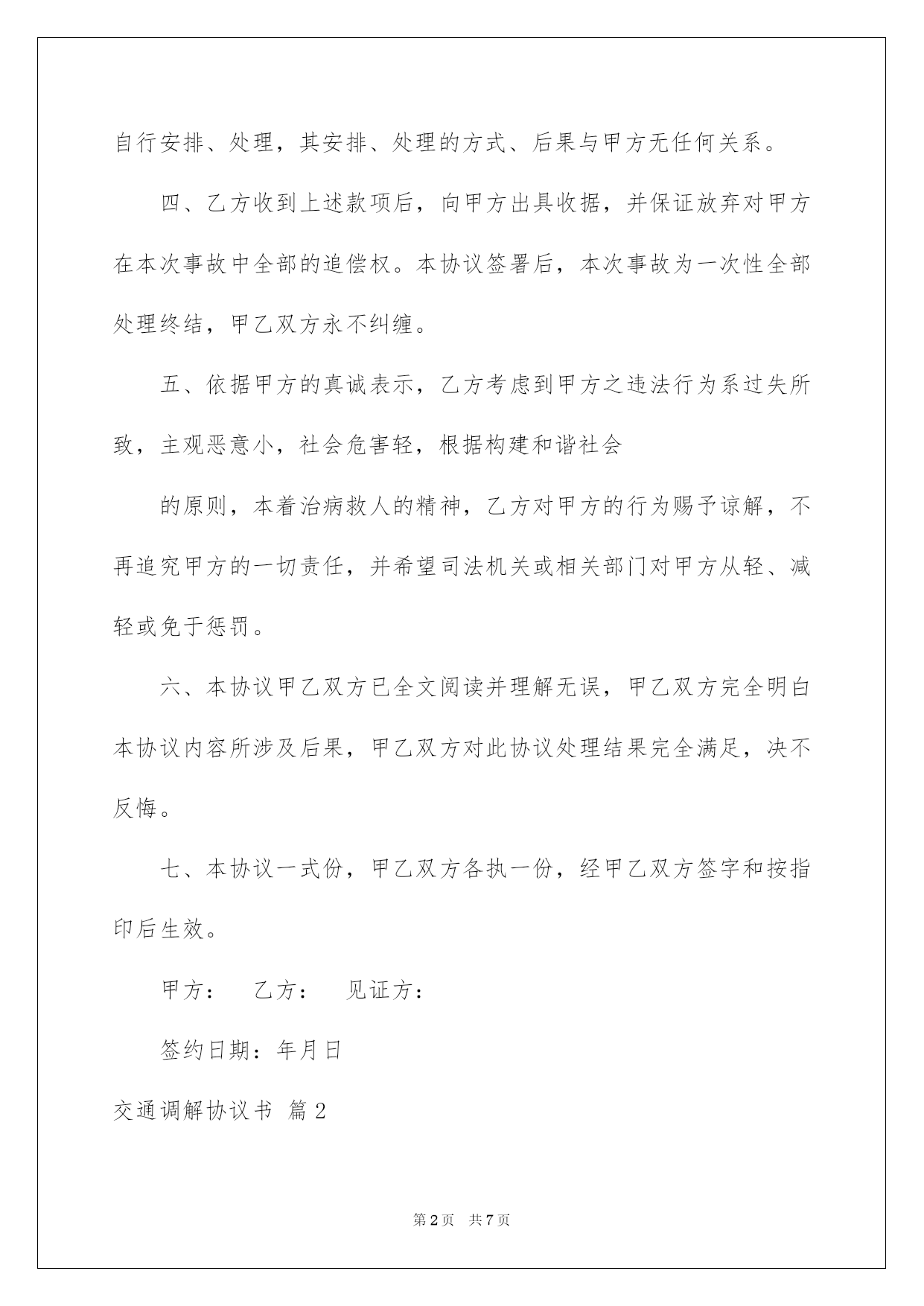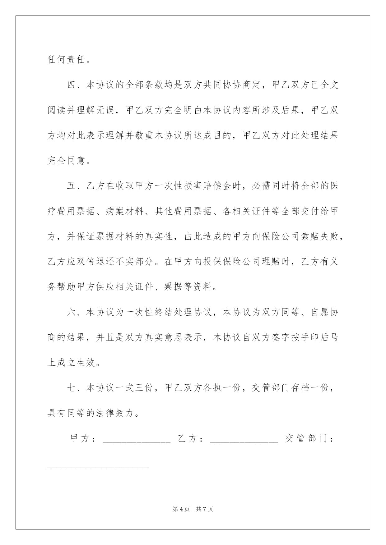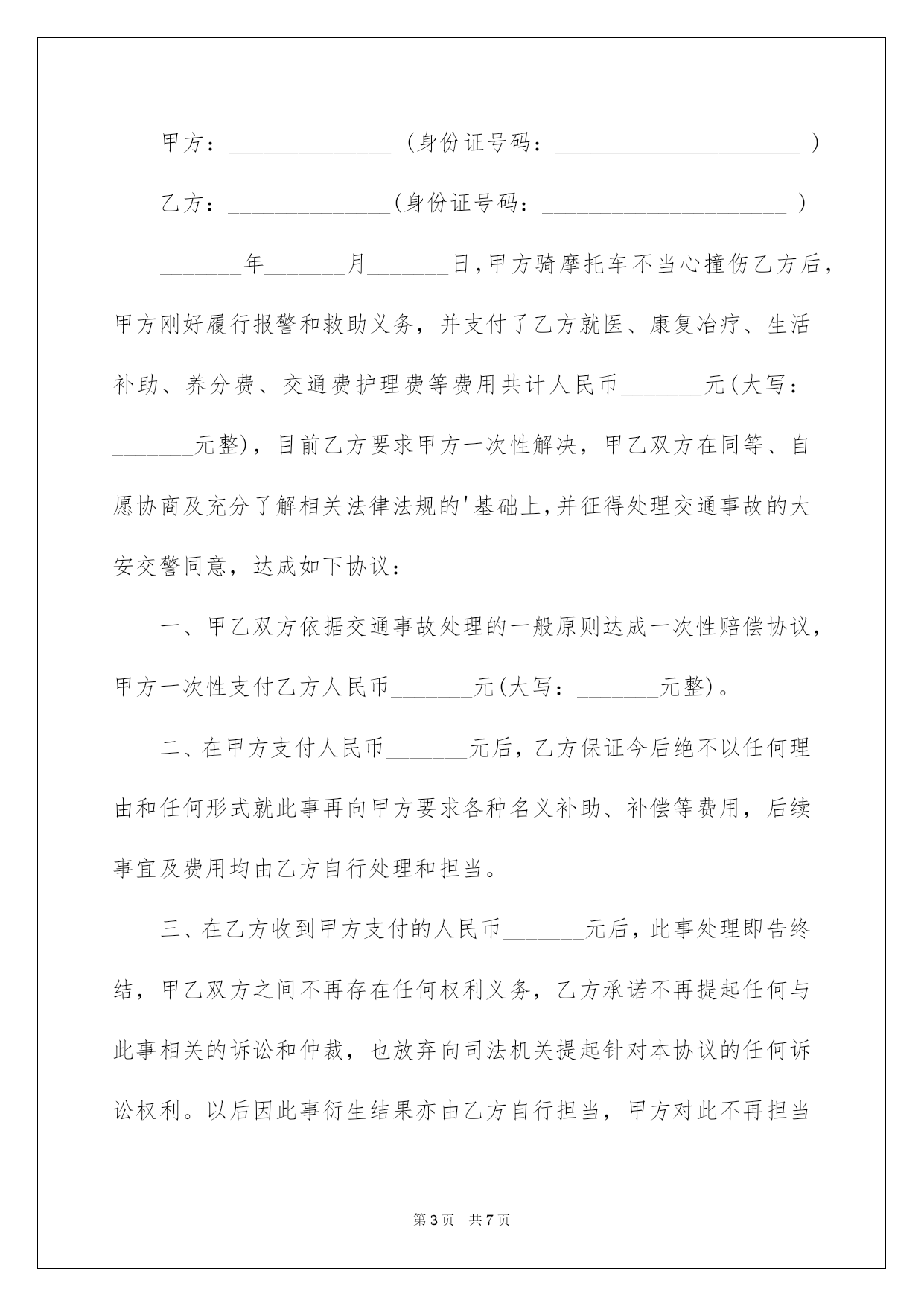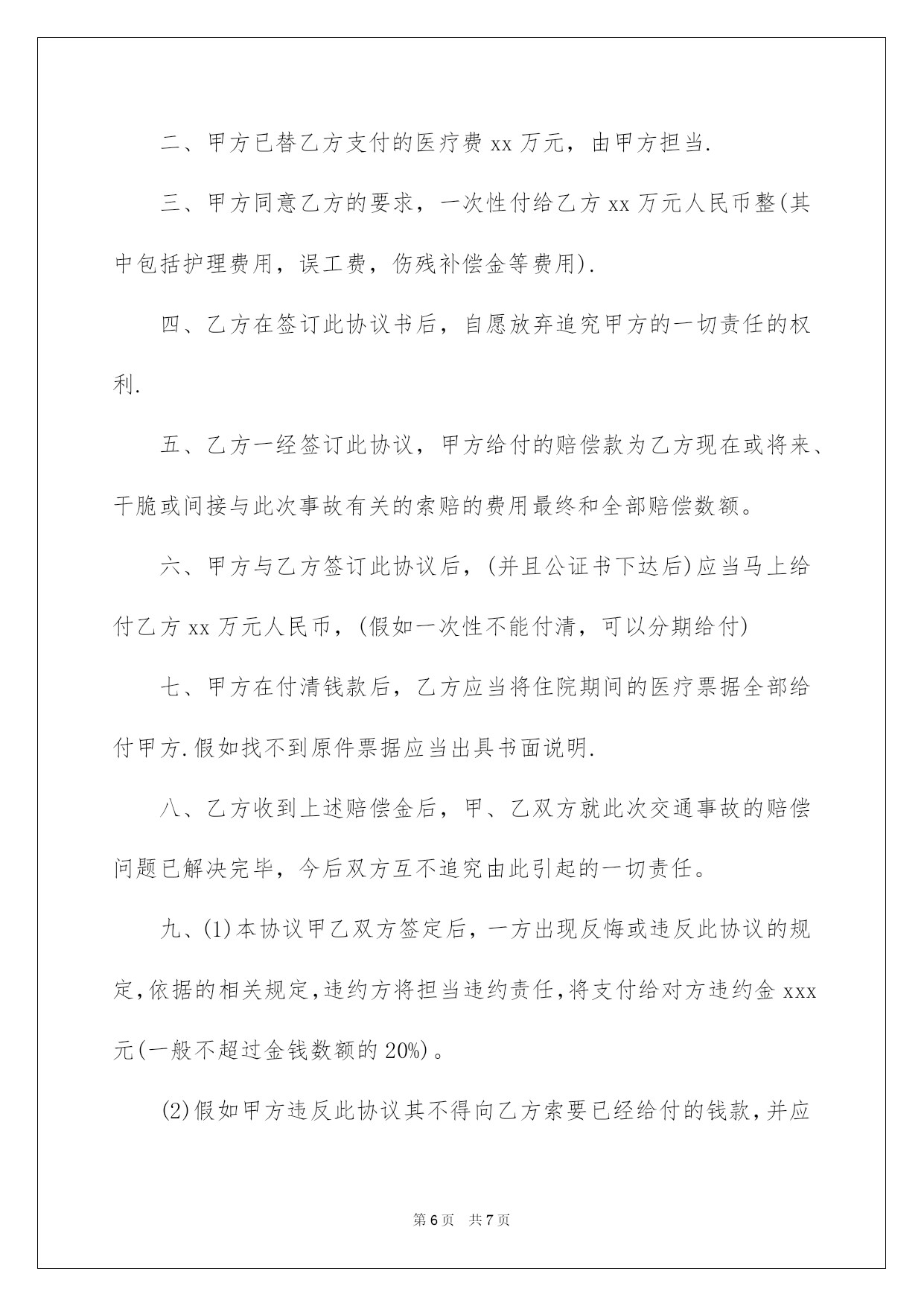 第PAGE\*Arabic\*MERGEFORMAT7页共NUMPAGES\*Arabic\*MERGEFORMAT7页第PAGE\*MERGEFORMAT7页共NUMPAGES\*MERGEFORMAT7页第PAGE\*MERGEFORMAT7页共NUMPAGES\*MERGEFORMAT7页第PAGE\*MERGEFORMAT7页共NUMPAGES\*MERGEFORMAT7页第PAGE\*MERGEFORMAT7页共NUMPAGES\*MERGEFORMAT7页第PAGE\*MERGEFORMAT7页共NUMPAGES\*MERGEFORMAT7页第PAGE\*MERGEFORMAT7页共NUMPAGES\*MERGEFORMAT7页第PAGE\*MERGEFORMAT7页共NUMPAGES\*MERGEFORMAT7页第PAGE\*MERGEFORMAT7页共NUMPAGES\*MERGEFORMAT7页第PAGE\*MERGEFORMAT7页共NUMPAGES\*MERGEFORMAT7页第PAGE\*MERGEFORMAT7页共NUMPAGES\*MERGEFORMAT7页2022交通调解协议书精选交通调解协议书3篇在现在社会,许多状况下我们须要用到协议,签订协议是解决纠纷的保障。什么样的协议才是有效的呢?下面是我为大家整理的交通调解协议书3篇,仅供参考,希望能够帮助到大家。交通调解协议书篇1甲方:(肇事者),托付代理人:乙方:(受害方),托付代理人:年月日时左右,甲方驾驶号车,在处发生道路交通事故,导致不幸死亡。现甲方和死者的全部近亲属(乙方)经友好协商,本着同等、自愿、公允的原则,达成如下协议:一、甲方一次性赔偿乙方医疗费、抢救费、误工费、交通费、住宿费、丧葬费、被抚养人生活费、老人赡养费、死亡赔偿金、精神损害抚慰金等各项赔偿款共计人民币(大写):圆整(元整)。二、死者的尸体由其家属自行安葬。三、上述款项支付给乙方全部近亲属后,由乙方全部近亲属内部自行安排、处理,其安排、处理的方式、后果与甲方无任何关系。四、乙方收到上述款项后,向甲方出具收据,并保证放弃对甲方在本次事故中全部的追偿权。本协议签署后,本次事故为一次性全部处理终结,甲乙双方永不纠缠。五、依据甲方的真诚表示,乙方考虑到甲方之违法行为系过失所致,主观恶意小,社会危害轻,根据构建和谐社会的原则,本着治病救人的精神,乙方对甲方的行为赐予谅解,不再追究甲方的一切责任,并希望司法机关或相关部门对甲方从轻、减轻或免于惩罚。六、本协议甲乙双方已全文阅读并理解无误,甲乙双方完全明白本协议内容所涉及后果,甲乙双方对此协议处理结果完全满足,决不反悔。七、本协议一式份,甲乙双方各执一份,经甲乙双方签字和按指印后生效。甲方:乙方:见证方:签约日期:年月日交通调解协议书篇2甲方:______________(身份证号码:_____________________)乙方:______________(身份证号码:_____________________)_______年_______月_______日,甲方骑摩托车不当心撞伤乙方后,甲方刚好履行报警和救助义务,并支付了乙方就医、康复冶疗、生活补助、养分费、交通费护理费等费用共计人民币_______元(大写:_______元整),目前乙方要求甲方一次性解决,甲乙双方在同等、自愿协商及充分了解相关法律法规的'基础上,并征得处理交通事故的大安交警同意,达成如下协议:一、甲乙双方依据交通事故处理的一般原则达成一次性赔偿协议,甲方一次性支付乙方人民币_______元(大写:_______元整)。二、在甲方支付人民币_______元后,乙方保证今后绝不以任何理由和任何形式就此事再向甲方要求各种名义补助、补偿等费用,后续事宜及费用均由乙方自行处理和担当。三、在乙方收到甲方支付的人民币_______元后,此事处理即告终结,甲乙双方之间不再存在任何权利义务,乙方承诺不再提起任何与此事相关的诉讼和仲裁,也放弃向司法机关提起针对本协议的任何诉讼权利。以后因此事衍生结果亦由乙方自行担当,甲方对此不再担当任何责任。四、本协议的全部条款均是双方共同协协商定,甲乙双方已全文阅读并理解无误,甲乙双方完全明白本协议内容所涉及后果,甲乙双方均对此表示理解并敬重本协议所达成目的,甲乙双方对此处理结果完全同意。五、乙方在收取甲方一次性损害赔偿金时,必需同时将全部的医疗费用票据、病案材料、其他费用票据、各相关证件等全部交付给甲方,并保证票据材料的真实性,由此造成的甲方向保险公司索赔失败,乙方应双倍退还不实部分。在