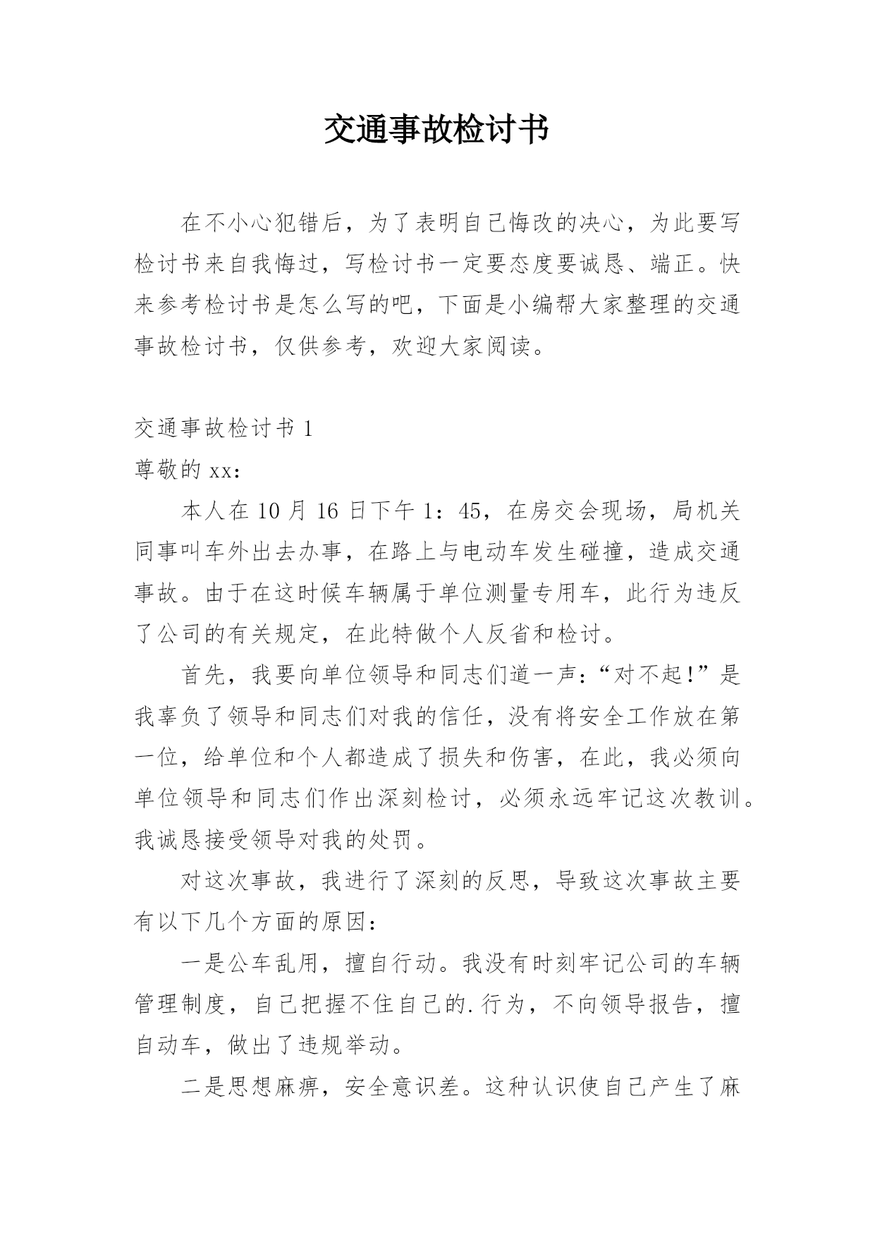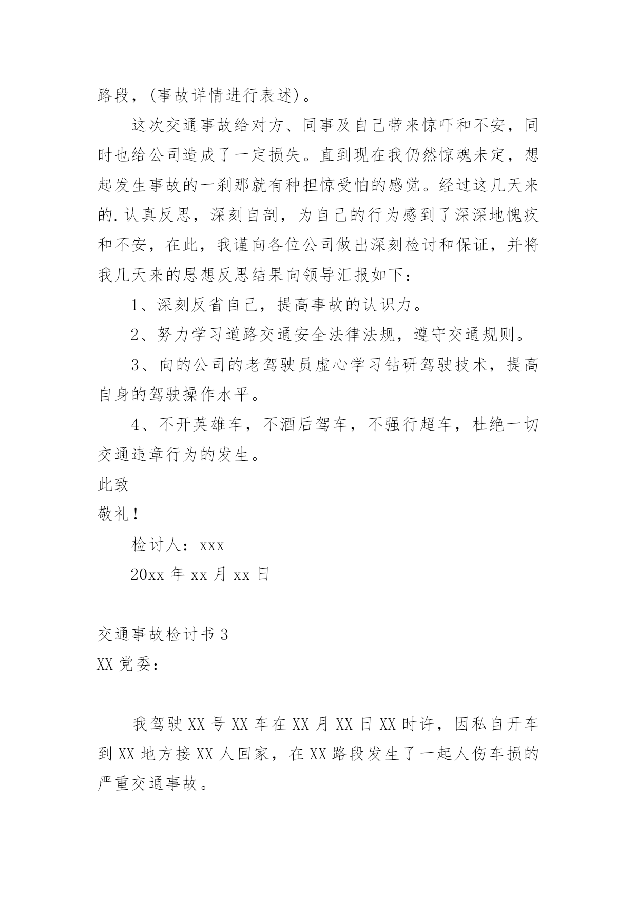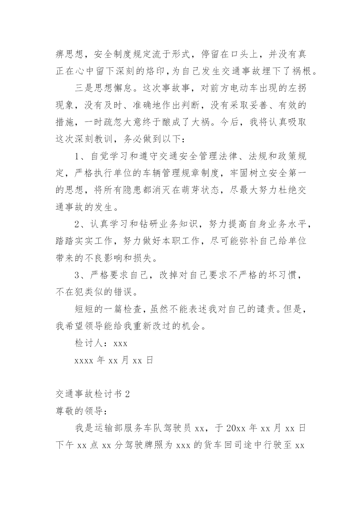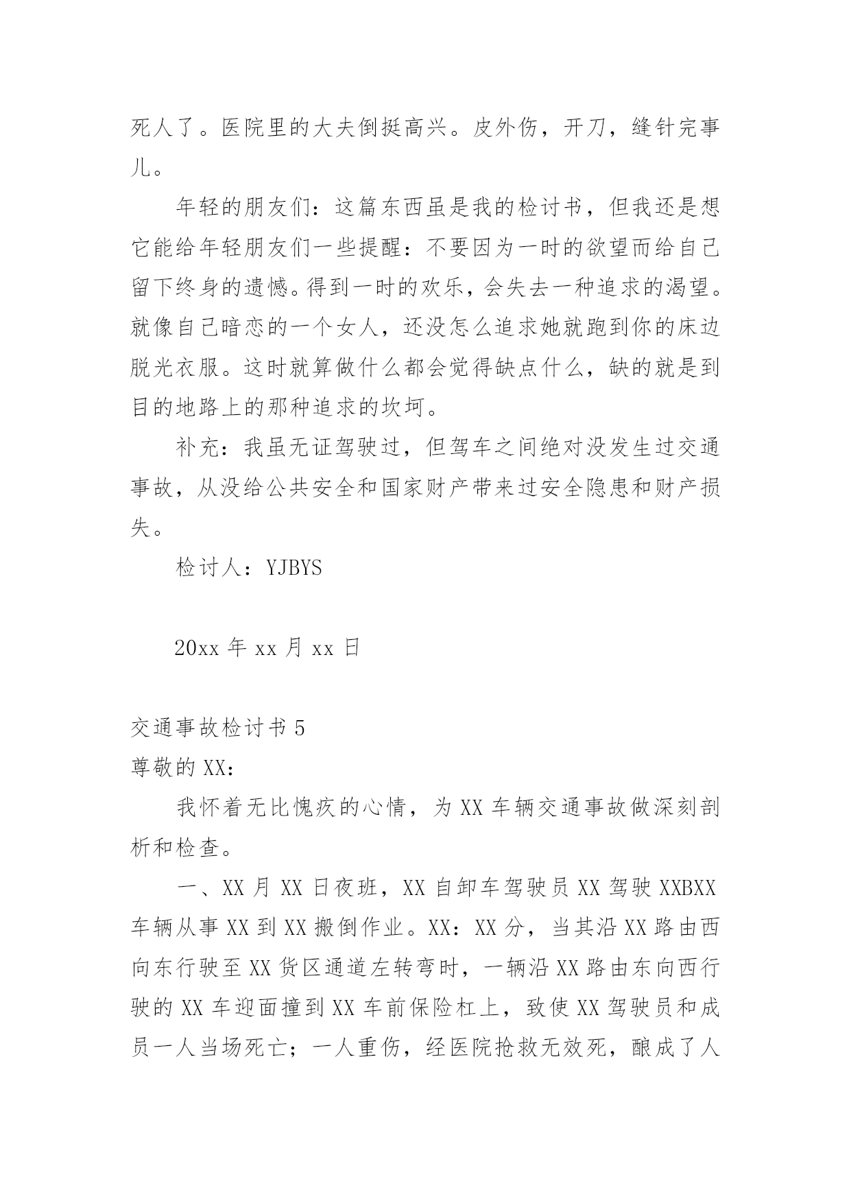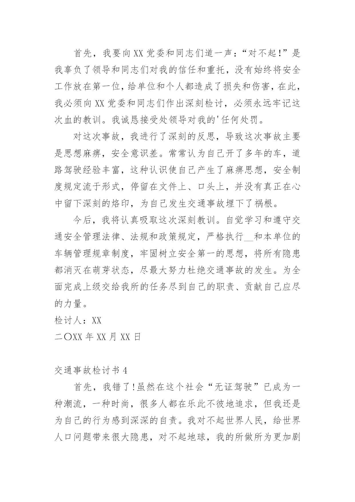 交通事故检讨书在不小心犯错后,为了表明自己悔改的决心,为此要写检讨书来自我悔过,写检讨书一定要态度要诚恳、端正。快来参考检讨书是怎么写的吧,下面是小编帮大家整理的交通事故检讨书,仅供参考,欢迎大家阅读。交通事故检讨书1尊敬的xx:本人在10月16日下午1:45,在房交会现场,局机关同事叫车外出去办事,在路上与电动车发生碰撞,造成交通事故。由于在这时候车辆属于单位测量专用车,此行为违反了公司的有关规定,在此特做个人反省和检讨。首先,我要向单位领导和同志们道一声:“对不起!”是我辜负了领导和同志们对我的信任,没有将安全工作放在第一位,给单位和个人都造成了损失和伤害,在此,我必须向单位领导和同志们作出深刻检讨,必须永远牢记这次教训。我诚恳接受领导对我的处罚。对这次事故,我进行了深刻的反思,导致这次事故主要有以下几个方面的原因:一是公车乱用,擅自行动。我没有时刻牢记公司的车辆管理制度,自己把握不住自己的.行为,不向领导报告,擅自动车,做出了违规举动。二是思想麻痹,安全意识差。这种认识使自己产生了麻痹思想,安全制度规定流于形式,停留在口头上,并没有真正在心中留下深刻的烙印,为自己发生交通事故埋下了祸根。三是思想懈怠。这次事故事,对前方电动车出现的左拐现象,没有及时、准确地作出判断,没有采取妥善、有效的措施,一时疏忽大意终于酿成了大祸。今后,我将认真吸取这次深刻教训,务必做到以下:1、自觉学习和遵守交通安全管理法律、法规和政策规定,严格执行单位的车辆管理规章制度,牢固树立安全第一的思想,将所有隐患都消灭在萌芽状态,尽最大努力杜绝交通事故的发生。2、认真学习和钻研业务知识,努力提高自身业务水平,踏踏实实工作,努力做好本职工作,尽可能弥补自己给单位带来的不良影响和损失。3、严格要求自己,改掉对自己要求不严格的坏习惯,不在犯类似的错误。短短的一篇检查,虽然不能表述我对自己的谴责。但是,我希望领导能给我重新改过的机会。检讨人:xxxxxxx年xx月xx日交通事故检讨书2尊敬的领导:我是运输部服务车队驾驶员xx,于20xx年xx月xx日下午xx点xx分驾驶牌照为xxx的货车回司途中行驶至xx路段,(事故详情进行表述)。这次交通事故给对方、同事及自己带来惊吓和不安,同时也给公司造成了一定损失。直到现在我仍然惊魂未定,想起发生事故的一刹那就有种担惊受怕的感觉。经过这几天来的.认真反思,深刻自剖,为自己的行为感到了深深地愧疚和不安,在此,我谨向各位公司做出深刻检讨和保证,并将我几天来的思想反思结果向领导汇报如下:1、深刻反省自己,提高事故的认识力。2、努力学习道路交通安全法律法规,遵守交通规则。3、向的公司的老驾驶员虚心学习钻研驾驶技术,提高自身的驾驶操作水平。4、不开英雄车,不酒后驾车,不强行超车,杜绝一切交通违章行为的发生。此致敬礼!检讨人:xxx20xx年xx月xx日交通事故检讨书3XX党委:我驾驶XX号XX车在XX月XX日XX时许,因私自开车到XX地方接XX人回家,在XX路段发生了一起人伤车损的严重交通事故。首先,我要向XX党委和同志们道一声:“对不起!”是我辜负了领导和同志们对我的信任和重托,没有始终将安全工作放在第一位,给单位和个人都造成了损失和伤害,在此,我必须向XX党委和同志们作出深刻检讨,必须永远牢记这次血的教训。我诚恳接受处领导对我的'任何处罚。对这次事故,我进行了深刻的反思,导致这次事故主要是思想麻痹,安全意识差。常常认为自己开了多年的车,道路驾驶经验丰富,这种认识使自己产生了麻痹思想,安全制度规定流于形式,停留在文件上、口头上,并没有真正在心中留下深刻的烙印,为自己发生交通事故埋下了祸根。今后,我将认真吸取这次深刻教训。自觉学习和遵守交通安全管理法律、法规和政策规定,严格执行__和本单位的车辆管理规章制度,牢固树立安全第一的思想,将所有隐患都消灭在萌芽状态,尽最大努力杜绝交通事故的发生。为全面完成上级交给我所的任务尽到自己的职责、贡献自己应尽的力量。检讨人:XX二〇XX年XX月XX日交通事故检讨书4首先,我错了!虽然在这个社会“无证驾驶”已成为一种潮流,一种时尚,很多人都在乐此不彼地追求,但我还是为自己的行为感到深深的自责。我对不起世界人民,给世界人口问题带来很大隐患,对不起地球,我的所做所为更加剧了地球的环境恶化,对不起整个宇宙空间…对不起我自己和他人的生命,甚至对不起胡同口那位刘大妈她二闺女。那次她要我开车送她上班。我因没证拒绝了她,害她被老板罚去二十块。我将为我的罪过负出我应有的责任。在这里我将认真的、深刻的、反复的、彻底的反省自己所做的一切。我是一名司机,不对,准确地充其量地说我只是个曾经“开过车”的。就像男人和女人即使在一起做了“所有”事儿没有“红本本”也不能称为夫妻一样。虽然我驾车已很有经验,但那还都是“地下工作”