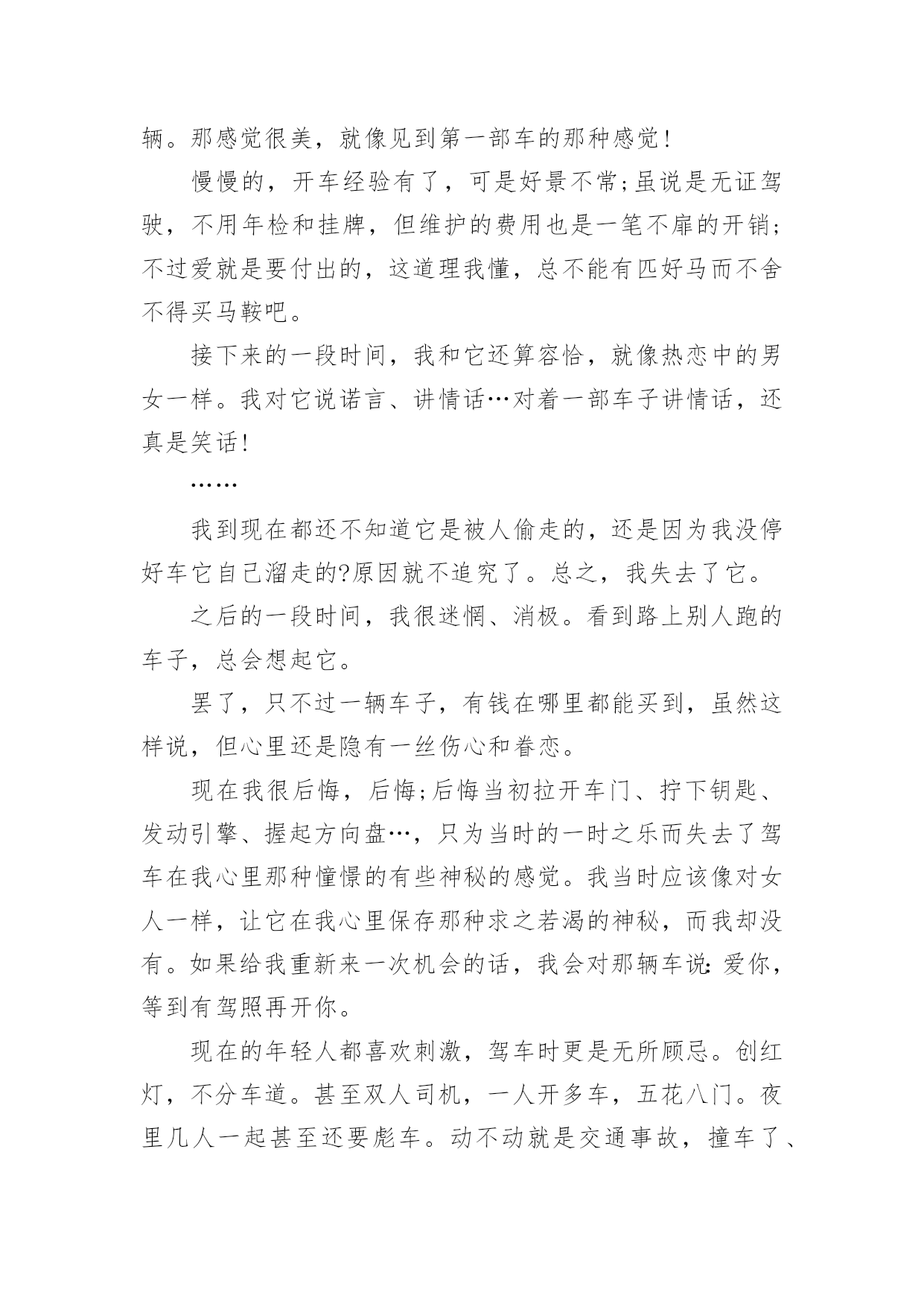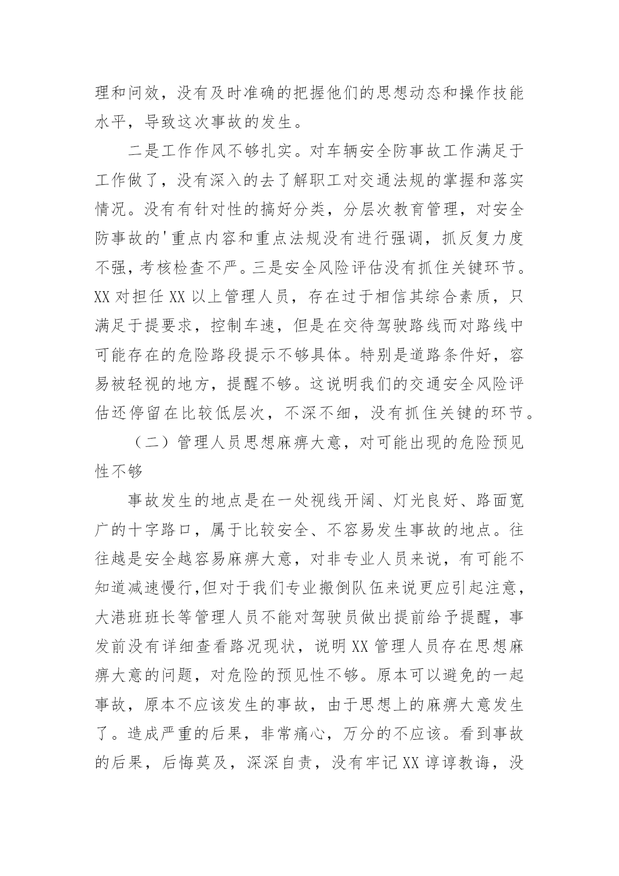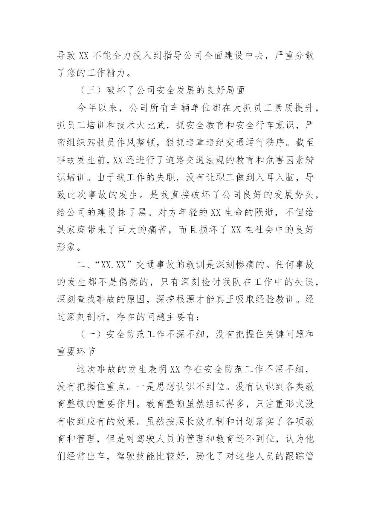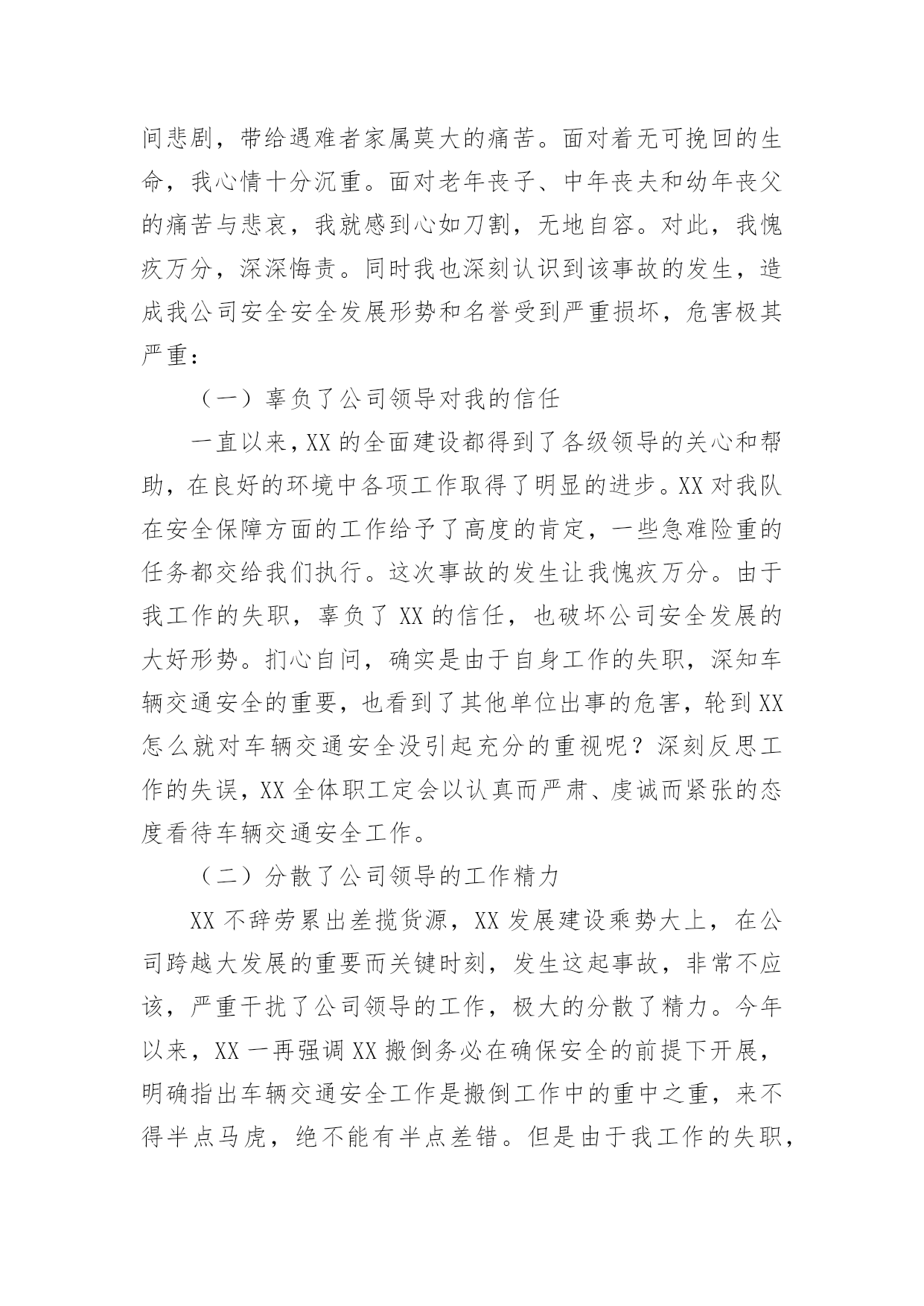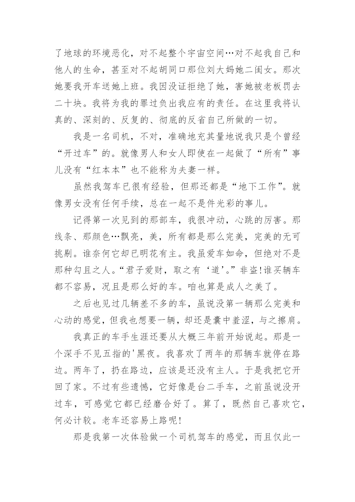 交通事故检讨书在不小心犯错后,为了表明自己悔改的决心,为此要写检讨书来自我悔过,写检讨书一定要态度要诚恳、端正。快来参考检讨书是怎么写的吧,下面是小编帮大家整理的交通事故检讨书,仅供参考,欢迎大家阅读。交通事故检讨书1尊敬的xx:本人在10月16日下午1:45,在房交会现场,局机关同事叫车外出去办事,在路上与电动车发生碰撞,造成交通事故。由于在这时候车辆属于单位测量专用车,此行为违反了公司的有关规定,在此特做个人反省和检讨。首先,我要向单位领导和同志们道一声:“对不起!”是我辜负了领导和同志们对我的信任,没有将安全工作放在第一位,给单位和个人都造成了损失和伤害,在此,我必须向单位领导和同志们作出深刻检讨,必须永远牢记这次教训。我诚恳接受领导对我的处罚。对这次事故,我进行了深刻的反思,导致这次事故主要有以下几个方面的原因:一是公车乱用,擅自行动。我没有时刻牢记公司的车辆管理制度,自己把握不住自己的.行为,不向领导报告,擅自动车,做出了违规举动。二是思想麻痹,安全意识差。这种认识使自己产生了麻痹思想,安全制度规定流于形式,停留在口头上,并没有真正在心中留下深刻的烙印,为自己发生交通事故埋下了祸根。三是思想懈怠。这次事故事,对前方电动车出现的左拐现象,没有及时、准确地作出判断,没有采取妥善、有效的措施,一时疏忽大意终于酿成了大祸。今后,我将认真吸取这次深刻教训,务必做到以下:1、自觉学习和遵守交通安全管理法律、法规和政策规定,严格执行单位的车辆管理规章制度,牢固树立安全第一的思想,将所有隐患都消灭在萌芽状态,尽最大努力杜绝交通事故的发生。2、认真学习和钻研业务知识,努力提高自身业务水平,踏踏实实工作,努力做好本职工作,尽可能弥补自己给单位带来的不良影响和损失。3、严格要求自己,改掉对自己要求不严格的坏习惯,不在犯类似的错误。短短的一篇检查,虽然不能表述我对自己的谴责。但是,我希望领导能给我重新改过的机会。检讨人:xxxxxxx年xx月xx日交通事故检讨书2尊敬的领导:我是运输部服务车队驾驶员xx,于20xx年xx月xx日下午xx点xx分驾驶牌照为xxx的货车回司途中行驶至xx路段,(事故详情进行表述)。这次交通事故给对方、同事及自己带来惊吓和不安,同时也给公司造成了一定损失。直到现在我仍然惊魂未定,想起发生事故的一刹那就有种担惊受怕的感觉。经过这几天来的.认真反思,深刻自剖,为自己的行为感到了深深地愧疚和不安,在此,我谨向各位公司做出深刻检讨和保证,并将我几天来的思想反思结果向领导汇报如下:1、深刻反省自己,提高事故的认识力。2、努力学习道路交通安全法律法规,遵守交通规则。3、向的公司的老驾驶员虚心学习钻研驾驶技术,提高自身的驾驶操作水平。4、不开英雄车,不酒后驾车,不强行超车,杜绝一切交通违章行为的发生。此致敬礼!检讨人:xxx20xx年xx月xx日交通事故检讨书3XX党委:我驾驶XX号XX车在XX月XX日XX时许,因私自开车到XX地方接XX人回家,在XX路段发生了一起人伤车损的严重交通事故。首先,我要向XX党委和同志们道一声:“对不起!”是我辜负了领导和同志们对我的信任和重托,没有始终将安全工作放在第一位,给单位和个人都造成了损失和伤害,在此,我必须向XX党委和同志们作出深刻检讨,必须永远牢记这次血的教训。我诚恳接受处领导对我的'任何处罚。对这次事故,我进行了深刻的反思,导致这次事故主要是思想麻痹,安全意识差。常常认为自己开了多年的车,道路驾驶经验丰富,这种认识使自己产生了麻痹思想,安全制度规定流于形式,停留在文件上、口头上,并没有真正在心中留下深刻的烙印,为自己发生交通事故埋下了祸根。今后,我将认真吸取这次深刻教训。自觉学习和遵守交通安全管理法律、法规和政策规定,严格执行__和本单位的车辆管理规章制度,牢固树立安全第一的思想,将所有隐患都消灭在萌芽状态,尽最大努力杜绝交通事故的发生。为全面完成上级交给我所的任务尽到自己的职责、贡献自己应尽的力量。检讨人:XX二〇XX年XX月XX日交通事故检讨书4首先,我错了!虽然在这个社会“无证驾驶”已成为一种潮流,一种时尚,很多人都在乐此不彼地追求,但我还是为自己的行为感到深深的自责。我对不起世界人民,给世界人口问题带来很大隐患,对不起地球,我的所做所为更加剧了地球的环境恶化,对不起整个宇宙空间…对不起我自己和他人的生命,甚至对不起胡同口那位刘大妈她二闺女。那次她要我开车送她上班。我因没证拒绝了她,害她被老板罚去二十块。我将为我的罪过负出我应有的责任。在这里我将认真的、深刻的、反复的、彻底的反省自己所做的一切。我是一名司机,不对,准确地充其量地说我只是个曾经“开过车”的。就像男人和女人即使在一起做了“所有”事儿没有“红本本”也不能称为夫妻一样。虽然我驾车已很有经验,但那还都是“地下工作”