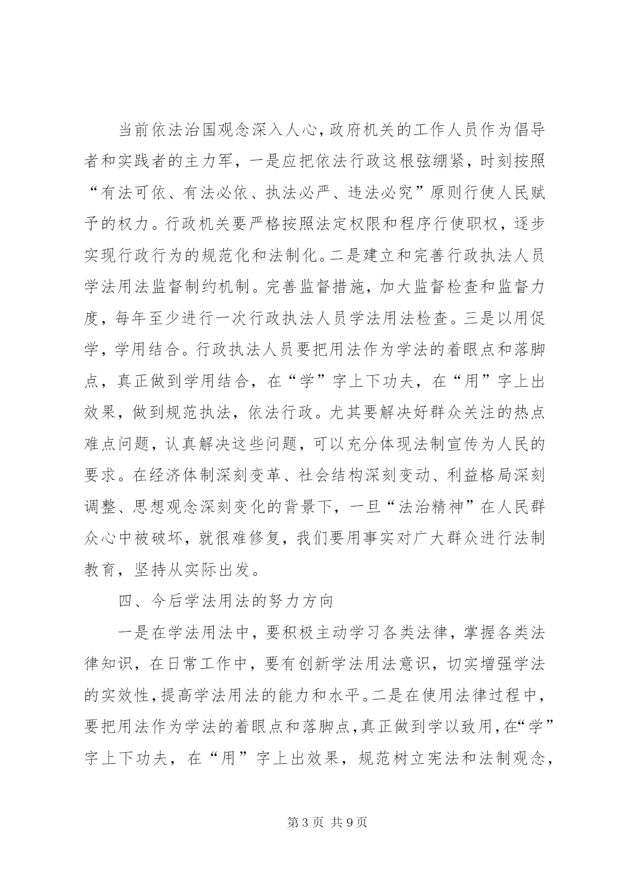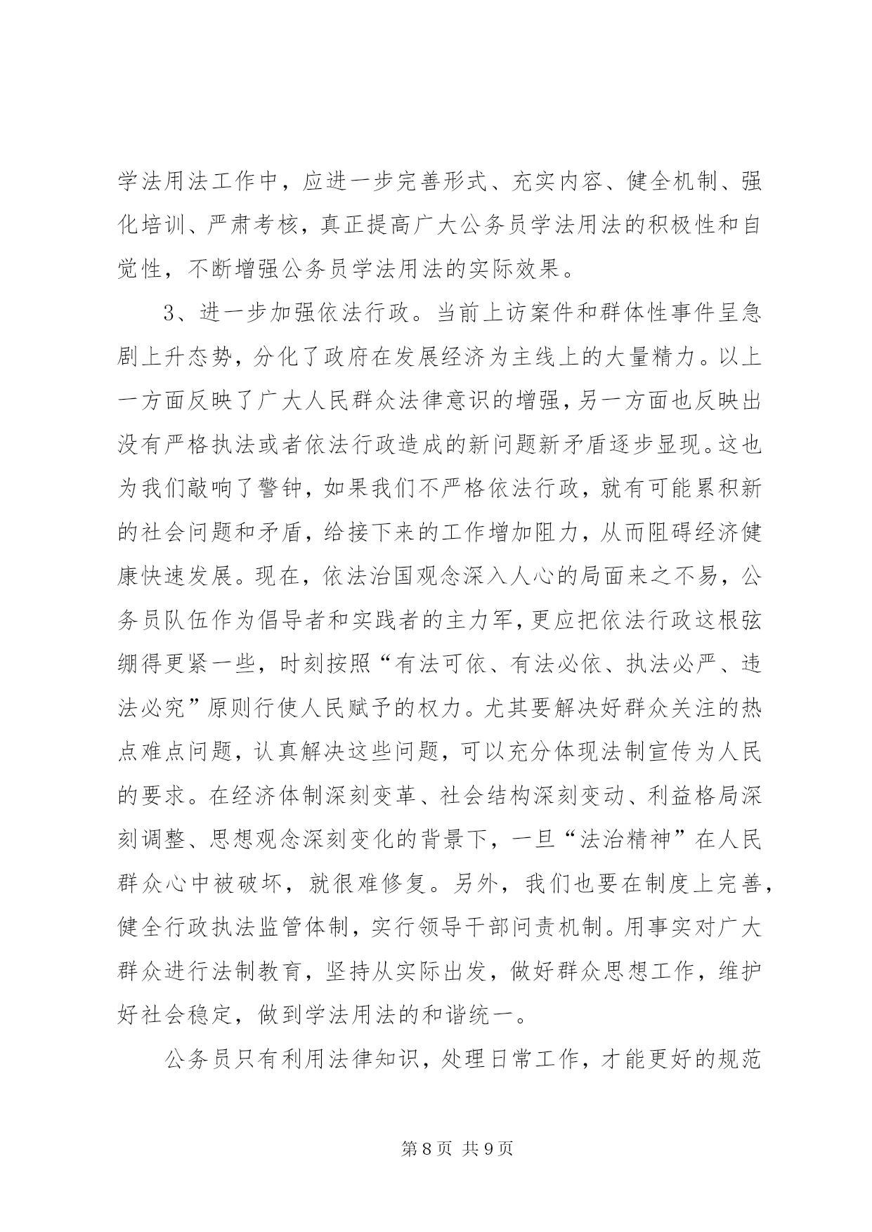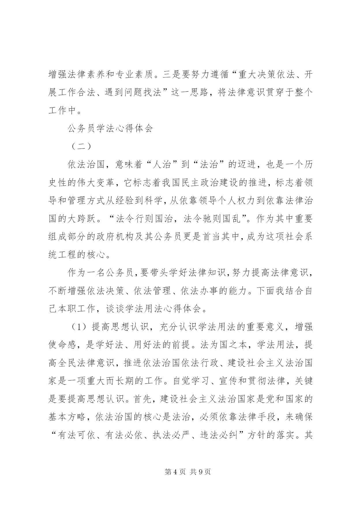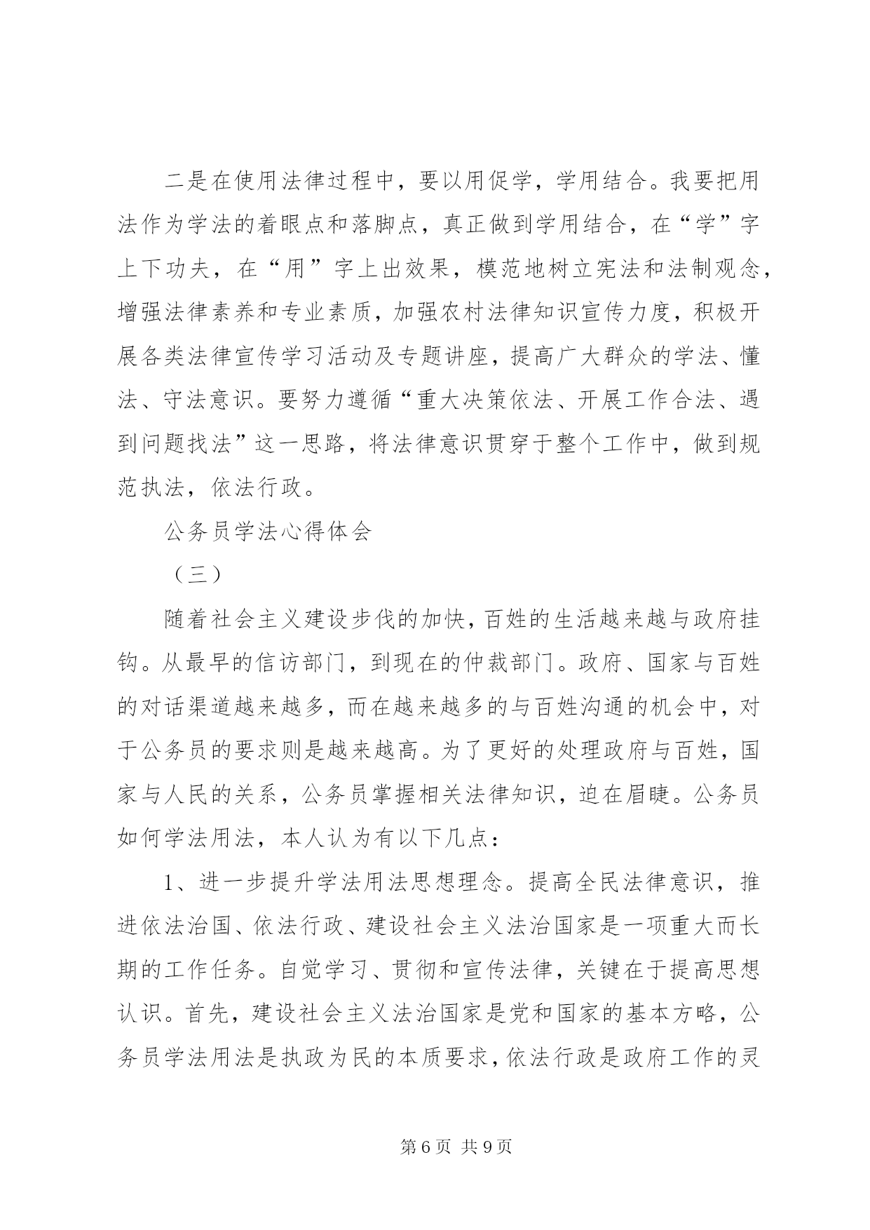 第PAGE\*Arabic\*MERGEFORMAT9页共NUMPAGES\*MERGEFORMAT9页公务员学法心得体会(一)今年是我国进入“六五”普法的第二个年头,经过多年的法制宣传教育,广大人民群众的法制观念、法治意识和法律素质得到了显着提高。然而在当前社会经济发展中,我们更应该清醒地看到,学法用法工作中仍存在不足之处,依法行政的意识和能力与学习实践科学发展观的要求相比还存在着差距。作为一名公务员,更要努力学好法律知识,提高法律意识,不断增强依法办事的能力,下面结合自己本职工作,谈谈学法用法心得体会:一、提升学法用法思想认识提高全民法律意识,推进依法治国、依法行政、建设社会主义法治国家是一项重大而长期的工作。自觉学习、贯彻和宣传法律,关键在于提高思想认识。一是领悟学法的重要性。建设社会主义法治国家是党和国家的基本方略,人民公仆学法用法是执政为民的本质要求,依法行政是政府工作的灵魂,是一切工作得以正常开展的基础和重要保证,因此必须充分掌握所需法律法规才能保证各项工作规范有序开展。二是坚持学法的自觉性。政府机关的工作人员首先应该是国家法律带头的执行者和遵守者,同时,积极地学法用法对整个社会引领作用也显而易见,如对规范社会秩序、培育公民品格、促进文化建设都起着不可忽视的作用,即维护了社会稳定,又促进了经济发展。三是广大人民群众的迫切愿望。随着法律知识的不断普及,公民法律意识的明显增强,广大人民群众要求社会依法行政、阳光行政,体现法律面前人人平等的呼声越来越高,作为一名在政府机关工作的人员,学好用好法律不单是个人的荣辱得失,而是与法治国家的实现紧密相联。二、增强学法用法实效学法的目的是为了更好地用法,因此,应进一步完善形式、充实内容、健全机制,真正提高广大公职人员学法用法的积极性和自觉性,不断增强学法用法的实际效果。一是坚持与时俱进,讲究学习方法,是学好法、用好法的重要基础。学法是知法、用法、守法的重要基础。在学法上,我坚持紧贴实际,持之以恒,与时俱进,扎实高效,法律素质得到不断提高。通过学习,我更加明确了社会主义现代化建设与民主法制的关系,提高了依法行政的能力和水平。二是坚持理论与实践相结合,严格依法办事,是学好法、用好法的关键。只有将学法与用法有机结合,才能推进事业健康发展。为此我坚持学用结合、学以致用,做到“三个坚持”:即坚持依法进行决策;坚持依法推动工作;坚持依法解决问题。三是解决好群众关注的热点难点问题。认真解决这些问题,可以充分体现法制宣传为人民的要求,用事实对广大群众进行法制教育,坚持从实际出发,做好群众思想工作,维护好社会稳定,做到了学法用法的和谐统一。三、积极推进依法行政当前依法治国观念深入人心,政府机关的工作人员作为倡导者和实践者的主力军,一是应把依法行政这根弦绷紧,时刻按照“有法可依、有法必依、执法必严、违法必究”原则行使人民赋予的权力。行政机关要严格按照法定权限和程序行使职权,逐步实现行政行为的规范化和法制化。二是建立和完善行政执法人员学法用法监督制约机制。完善监督措施,加大监督检查和监督力度,每年至少进行一次行政执法人员学法用法检查。三是以用促学,学用结合。行政执法人员要把用法作为学法的着眼点和落脚点,真正做到学用结合,在“学”字上下功夫,在“用”字上出效果,做到规范执法,依法行政。尤其要解决好群众关注的热点难点问题,认真解决这些问题,可以充分体现法制宣传为人民的要求。在经济体制深刻变革、社会结构深刻变动、利益格局深刻调整、思想观念深刻变化的背景下,一旦“法治精神”在人民群众心中被破坏,就很难修复,我们要用事实对广大群众进行法制教育,坚持从实际出发。四、今后学法用法的努力方向一是在学法用法中,要积极主动学习各类法律,掌握各类法律知识,在日常工作中,要有创新学法用法意识,切实增强学法的实效性,提高学法用法的能力和水平。二是在使用法律过程中,要把用法作为学法的着眼点和落脚点,真正做到学以致用,在“学”字上下功夫,在“用”字上出效果,规范树立宪法和法制观念,增强法律素养和专业素质。三是要努力遵循“重大决策依法、开展工作合法、遇到问题找法”这一思路,将法律意识贯穿于整个工作中。公务员学法心得体会(二)依法治国,意味着“人治”到“法治”的迈进,也是一个历史性的伟大变革,它标志着我国民主政治建设的推进,标志着领导和管理方式从经验到科学,从依靠领导个人权力到依靠法律治国的大跨跃。“法令行则国治,法令驰则国乱”。作为其中重要组成部分的政府机构及其公务员更是首当其中,成为这项社会系统工程的核心。作为一名公务员,要带头学好法律知识,努力提高法律意识,不断增强依法决策、依法管理、依法办事的能力。下面我结合自己本职工作,谈谈学法用法心得体会。(1)提高思想认识,充分认识学法用法的重要意义,增强使命感,
