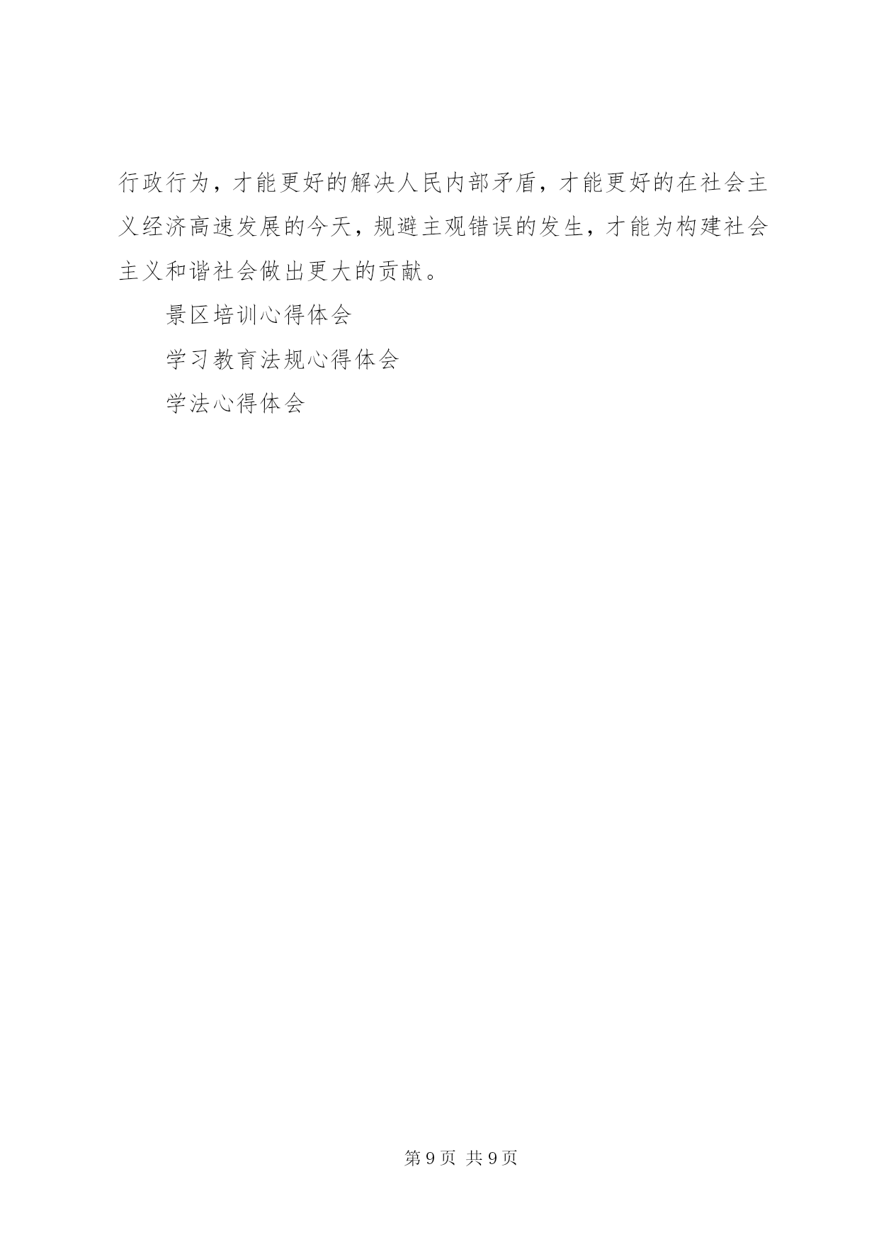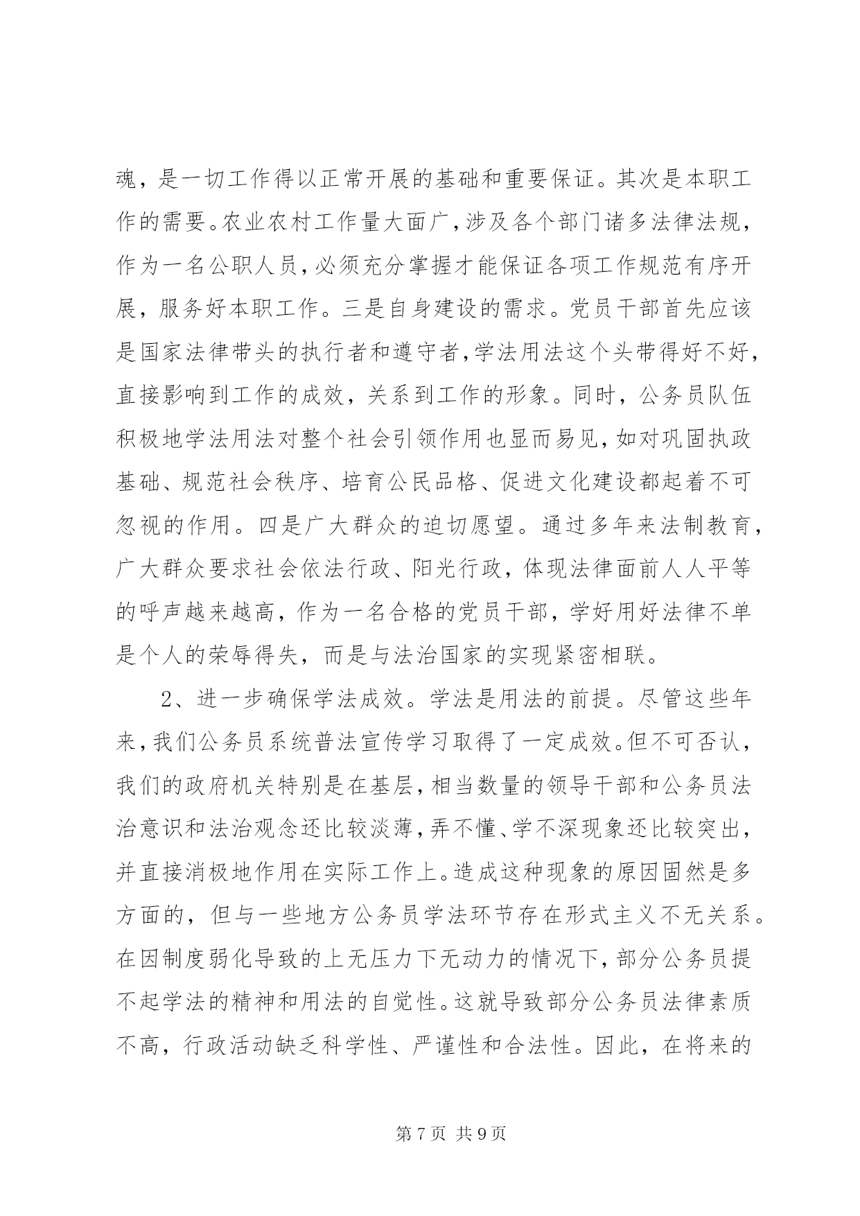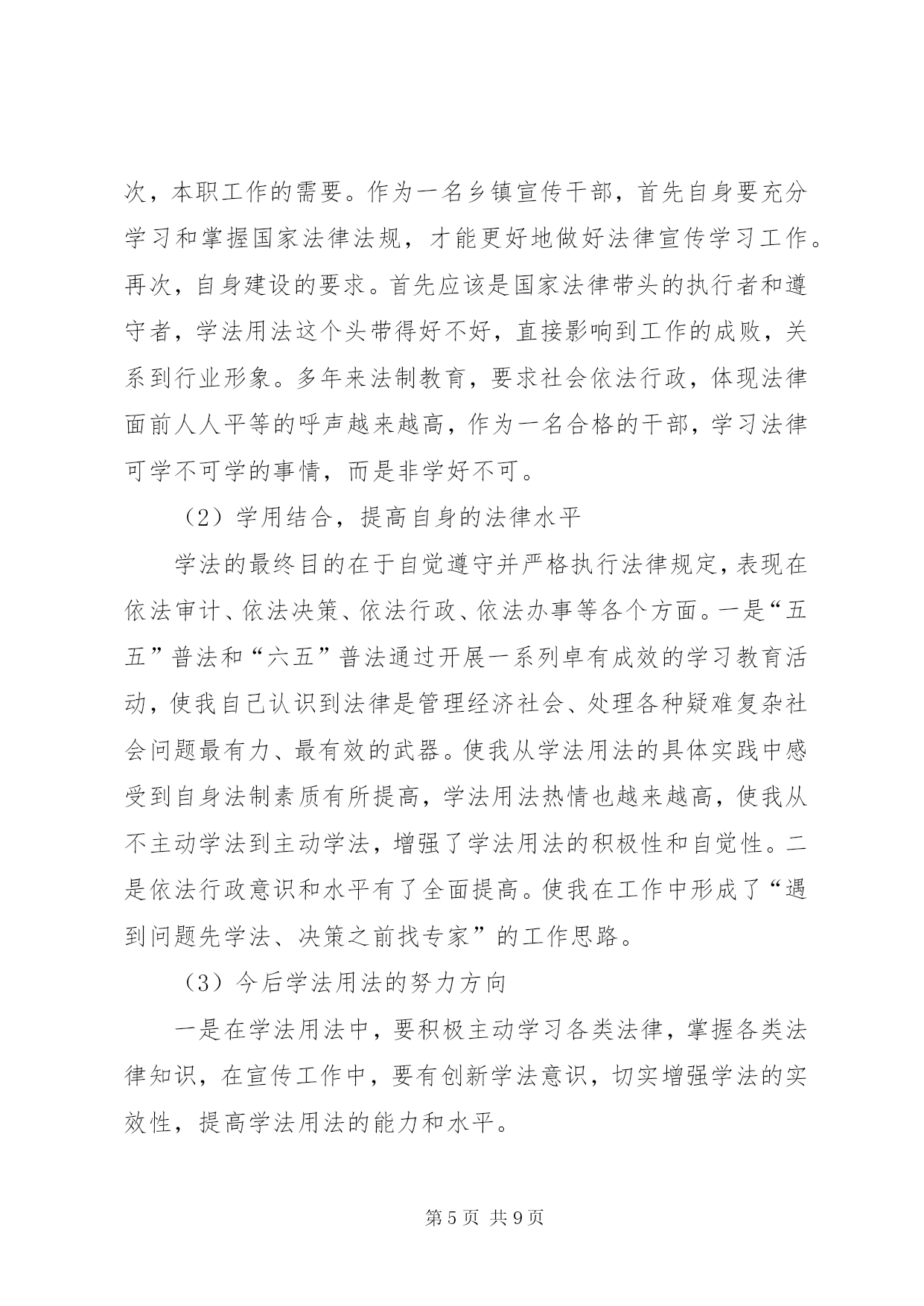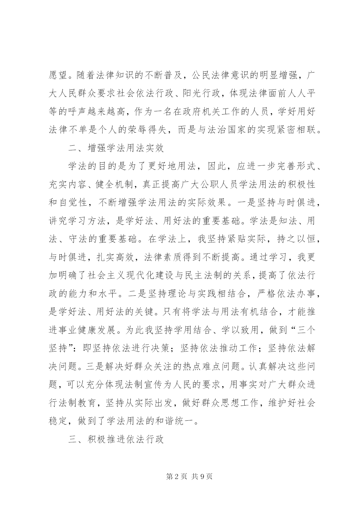 第PAGE\*Arabic\*MERGEFORMAT9页共NUMPAGES\*MERGEFORMAT9页公务员学法心得体会(一)今年是我国进入“六五”普法的第二个年头,经过多年的法制宣传教育,广大人民群众的法制观念、法治意识和法律素质得到了显着提高。然而在当前社会经济发展中,我们更应该清醒地看到,学法用法工作中仍存在不足之处,依法行政的意识和能力与学习实践科学发展观的要求相比还存在着差距。作为一名公务员,更要努力学好法律知识,提高法律意识,不断增强依法办事的能力,下面结合自己本职工作,谈谈学法用法心得体会:一、提升学法用法思想认识提高全民法律意识,推进依法治国、依法行政、建设社会主义法治国家是一项重大而长期的工作。自觉学习、贯彻和宣传法律,关键在于提高思想认识。一是领悟学法的重要性。建设社会主义法治国家是党和国家的基本方略,人民公仆学法用法是执政为民的本质要求,依法行政是政府工作的灵魂,是一切工作得以正常开展的基础和重要保证,因此必须充分掌握所需法律法规才能保证各项工作规范有序开展。二是坚持学法的自觉性。政府机关的工作人员首先应该是国家法律带头的执行者和遵守者,同时,积极地学法用法对整个社会引领作用也显而易见,如对规范社会秩序、培育公民品格、促进文化建设都起着不可忽视的作用,即维护了社会稳定,又促进了经济发展。三是广大人民群众的迫切愿望。随着法律知识的不断普及,公民法律意识的明显增强,广大人民群众要求社会依法行政、阳光行政,体现法律面前人人平等的呼声越来越高,作为一名在政府机关工作的人员,学好用好法律不单是个人的荣辱得失,而是与法治国家的实现紧密相联。二、增强学法用法实效学法的目的是为了更好地用法,因此,应进一步完善形式、充实内容、健全机制,真正提高广大公职人员学法用法的积极性和自觉性,不断增强学法用法的实际效果。一是坚持与时俱进,讲究学习方法,是学好法、用好法的重要基础。学法是知法、用法、守法的重要基础。在学法上,我坚持紧贴实际,持之以恒,与时俱进,扎实高效,法律素质得到不断提高。通过学习,我更加明确了社会主义现代化建设与民主法制的关系,提高了依法行政的能力和水平。二是坚持理论与实践相结合,严格依法办事,是学好法、用好法的关键。只有将学法与用法有机结合,才能推进事业健康发展。为此我坚持学用结合、学以致用,做到“三个坚持”:即坚持依法进行决策;坚持依法推动工作;坚持依法解决问题。三是解决好群众关注的热点难点问题。认真解决这些问题,可以充分体现法制宣传为人民的要求,用事实对广大群众进行法制教育,坚持从实际出发,做好群众思想工作,维护好社会稳定,做到了学法用法的和谐统一。三、积极推进依法行政当前依法治国观念深入人心,政府机关的工作人员作为倡导者和实践者的主力军,一是应把依法行政这根弦绷紧,时刻按照“有法可依、有法必依、执法必严、违法必究”原则行使人民赋予的权力。行政机关要严格按照法定权限和程序行使职权,逐步实现行政行为的规范化和法制化。二是建立和完善行政执法人员学法用法监督制约机制。完善监督措施,加大监督检查和监督力度,每年至少进行一次行政执法人员学法用法检查。三是以用促学,学用结合。行政执法人员要把用法作为学法的着眼点和落脚点,真正做到学用结合,在“学”字上下功夫,在“用”字上出效果,做到规范执法,依法行政。尤其要解决好群众关注的热点难点问题,认真解决这些问题,可以充分体现法制宣传为人民的要求。在经济体制深刻变革、社会结构深刻变动、利益格局深刻调整、思想观念深刻变化的背景下,一旦“法治精神”在人民群众心中被破坏,就很难修复,我们要用事实对广大群众进行法制教育,坚持从实际出发。四、今后学法用法的努力方向一是在学法用法中,要积极主动学习各类法律,掌握各类法律知识,在日常工作中,要有创新学法用法意识,切实增强学法的实效性,提高学法用法的能力和水平。二是在使用法律过程中,要把用法作为学法的着眼点和落脚点,真正做到学以致用,在“学”字上下功夫,在“用”字上出效果,规范树立宪法和法制观念,增强法律素养和专业素质。三是要努力遵循“重大决策依法、开展工作合法、遇到问题找法”这一思路,将法律意识贯穿于整个工作中。公务员学法心得体会(二)依法治国,意味着“人治”到“法治”的迈进,也是一个历史性的伟大变革,它标志着我国民主政治建设的推进,标志着领导和管理方式从经验到科学,从依靠领导个人权力到依靠法律治国的大跨跃。“法令行则国治,法令驰则国乱”。作为其中重要组成部分的政府机构及其公务员更是首当其中,成为这项社会系统工程的核心。作为一名公务员,要带头学好法律知识,努力提高法律意识,不断增强依法决策、依法管理、依法办事的能力。下面我结合自己本职工作,谈谈学法用法心得体会。(1)提高思想认识,充分认识学法用法的重要意义,增强使命感,