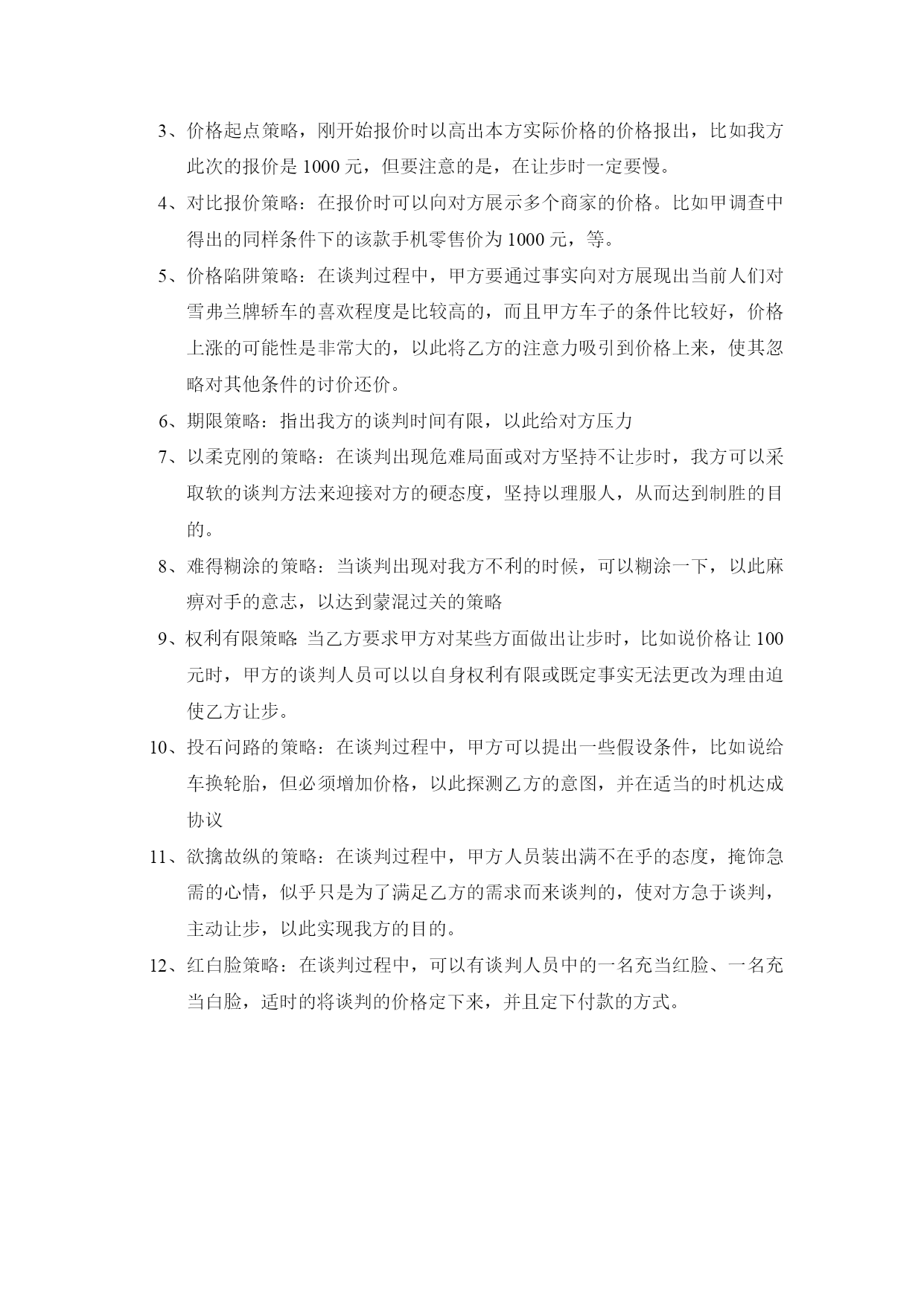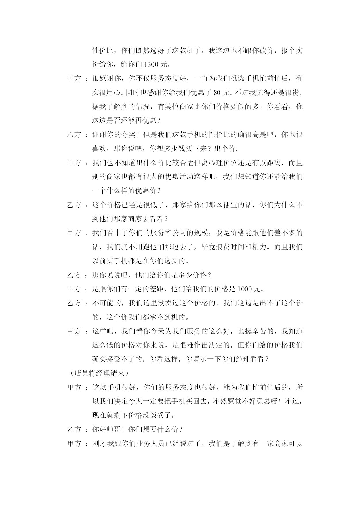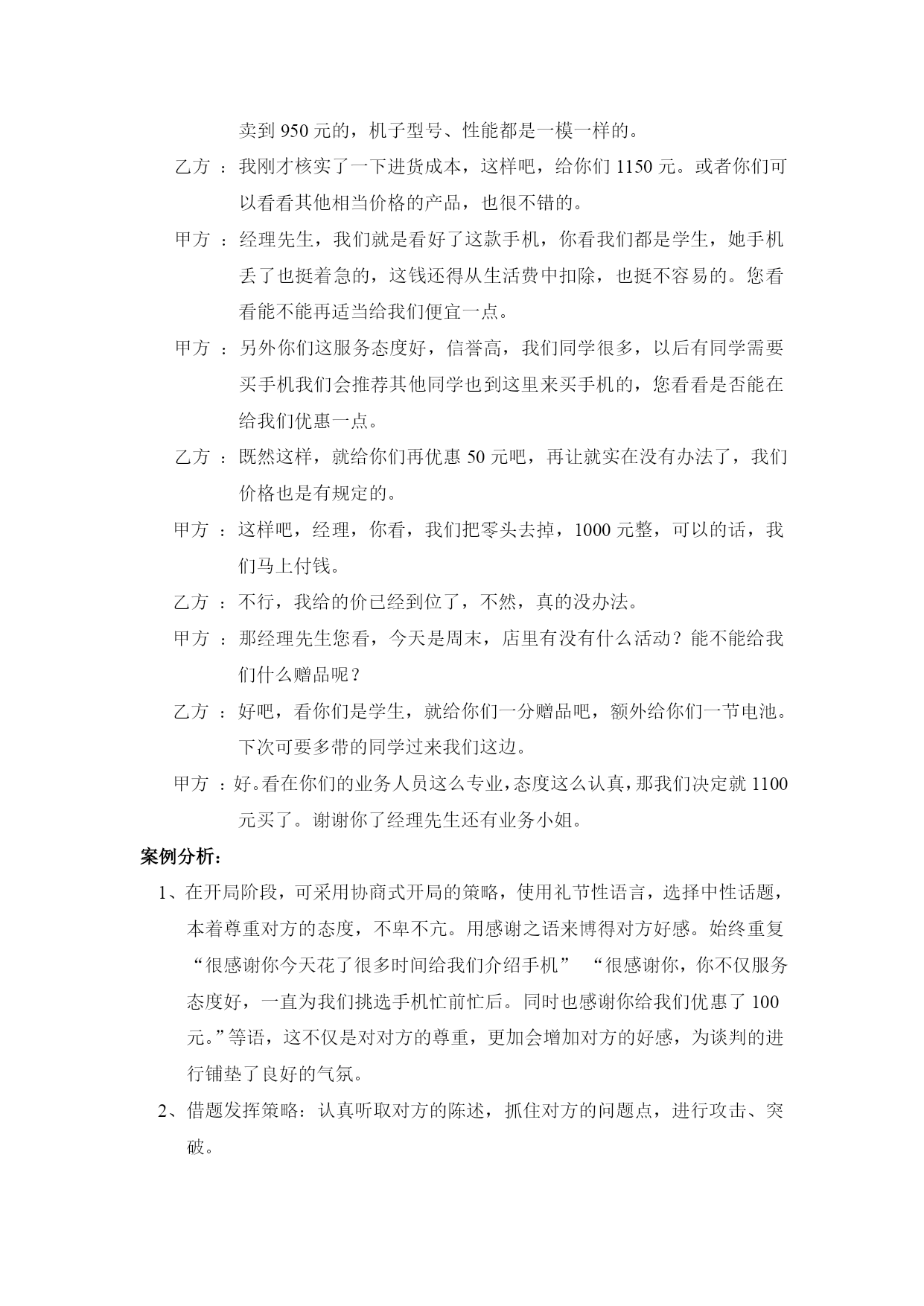 商务谈判实例分析谈判主题:与手机经销商谈判谈判背景以及准备:由于同学在坐公交车的时候不小心手机被偷走了,所以决定要买一款新手机,由于我对于手机市场比较了解,同学就让我陪同去市里购买手机。我建议同学先在京东商城或者中关村查看相关手机配置信息,找寻自己的意愿手机,最终相中诺基亚的一款手机并相当满意,网上京东报价1200元,天猫电器城报价1300元,相关经销商报价1100元,最终我们确定我们的意愿价格为1100元。但是考虑到网购有质量以及信用风险,我们决定去蚌埠市里购买。走访了蚌埠苏宁,国美以及“手机一条街”之后我们挑选了蚌埠市较大且信誉度较高的某手机卖场。据了解,不同品牌,不同价格手机可以砍掉的价格大不相同,此款手机在此卖场标价1380元,我方决定最高出价1100元。谈判人员:甲方:我乙方:某手机卖场业务员谈判了解阶段:我们在该手机卖场闲逛,对卖场所有机型都进行了查看,吸引业务员的注意,我们表现出购买手机的欲望并说出想要手机的基本概况,经业务员介绍我们才走向诺基亚专柜并锁定自己的意愿手机。并要求业务员拿出实机亲自感受了一下,感觉手机确实不错。确定要购买这款手机。对话部分:甲方:很感谢你今天花了很多时间给我们介绍这几款手机,现在我看中了这款手机,你看能以多大的幅度给我们优惠?乙方:嗯!不错,这款手机今年在卖场是买的最好,你们也是看中他的高性价比,你们既然选好了这款机子,我这边也不跟你砍价,报个实价给你,给你们1300元。甲方:很感谢你,你不仅服务态度好,一直为我们挑选手机忙前忙后,确实很用心。同时也感谢你给我们优惠了80元。不过我觉得还是很贵。据我了解到的情况,有其他商家比你们价格要低的多。你看看,你这边是否还能再优惠?乙方:谢谢你的夸奖!但是我们这款手机的性价比的确很高是吧,你也很喜欢,那你说吧,你想多少钱买下来?出个价。甲方:我们也不知道出什么价比较合适但离心理价位还是有点距离,而且别的商家也都有很大的优惠活动这样吧,我们想知道你还能给我们一个什么样的优惠价?乙方:这个价格已经是很低了,那家给你们那么便宜的话,你们为什么不到他们那家商家去看看?甲方:我们看中了你们的服务和公司的规模,要是价格能跟他们差不多的话,我们就不用跑他们那边去了,毕竟浪费时间和精力。而且我们以前买手机都是在你们这买的。乙方:那你说说吧,他们给你们是多少价格?甲方:是跟你们有一定的差距,他们给我们的价格是1000元。乙方:不可能的,我们这里没卖过这个价格的。我们这边是出不了这个价的,这个价我们都拿不到机的。甲方:这样吧,我们看你今天为我们服务的这么好,也挺辛苦的,我知道这么低的价格对你来说,是很难作出决定的,但你们给的价格我们确实接受不了的。你看这样,你请示一下你们经理看看?(店员将经理请来)甲方:这款手机很好,你们的服务态度也很好,能为我们忙前忙后的,所以我们决定今天一定要把手机买回去,不然感觉不好意思呀!不过,现在就剩下价格没谈妥了。乙方:你好帅哥!你们想要什么价?甲方:刚才我跟你们业务人员已经说过了,我们是了解到有一家商家可以卖到950元的,机子型号、性能都是一模一样的。乙方:我刚才核实了一下进货成本,这样吧,给你们1150元。或者你们可以看看其他相当价格的产品,也很不错的。甲方:经理先生,我们就是看好了这款手机,你看我们都是学生,她手机丢了也挺着急的,这钱还得从生活费中扣除,也挺不容易的。您看看能不能再适当给我们便宜一点。甲方:另外你们这服务态度好,信誉高,我们同学很多,以后有同学需要买手机我们会推荐其他同学也到这里来买手机的,您看看是否能在给我们优惠一点。乙方:既然这样,就给你们再优惠50元吧,再让就实在没有办法了,我们价格也是有规定的。甲方:这样吧,经理,你看,我们把零头去掉,1000元整,可以的话,我们马上付钱。乙方:不行,我给的价已经到位了,不然,真的没办法。甲方:那经理先生您看,今天是周末,店里有没有什么活动?能不能给我们什么赠品呢?乙方:好吧,看你们是学生,就给你们一分赠品吧,额外给你们一节电池。下次可要多带的同学过来我们这边。甲方:好。看在你们的业务人员这么专业,态度这么认真,那我们决定就1100元买了。谢谢你了经理先生还有业务小姐。案例分析:1、在开局阶段,可采用协商式开局的策略,使用礼节性语言,选择中性话题,本着尊重对方的态度,不卑不亢。用感谢之语来博得对方好感。始终重复“很感谢你今天花了很多时间给我们介绍手机”“很感谢你,你不仅服务态度好,一直为我们挑选手机忙前忙后。同时也感谢你给我们优惠了100元。”等语,这不仅是对对方的尊重,更加会增加对方的好感,为谈判的进行铺垫了良好的气氛。2、借题发挥策略:认真听取对方的陈述,抓住对方的问题点,进行攻击、突破。
