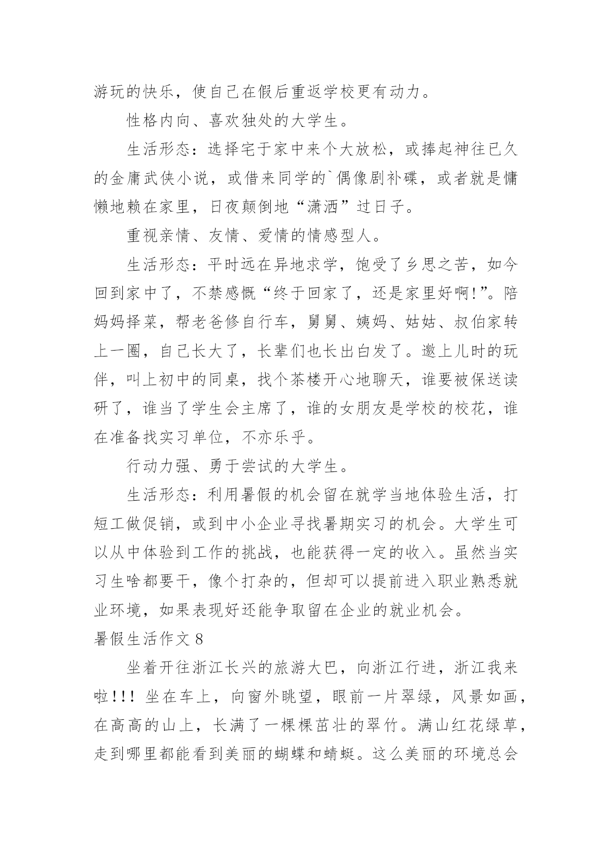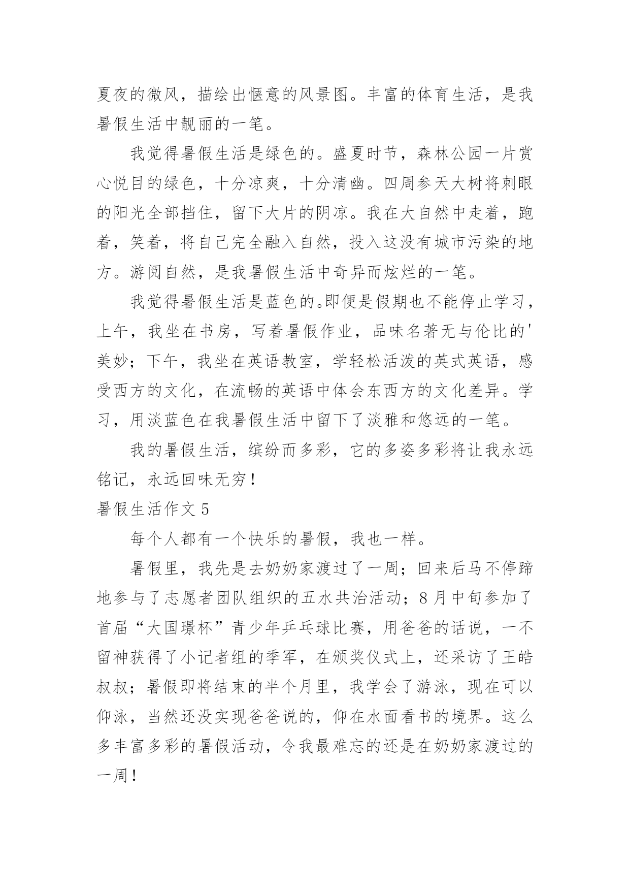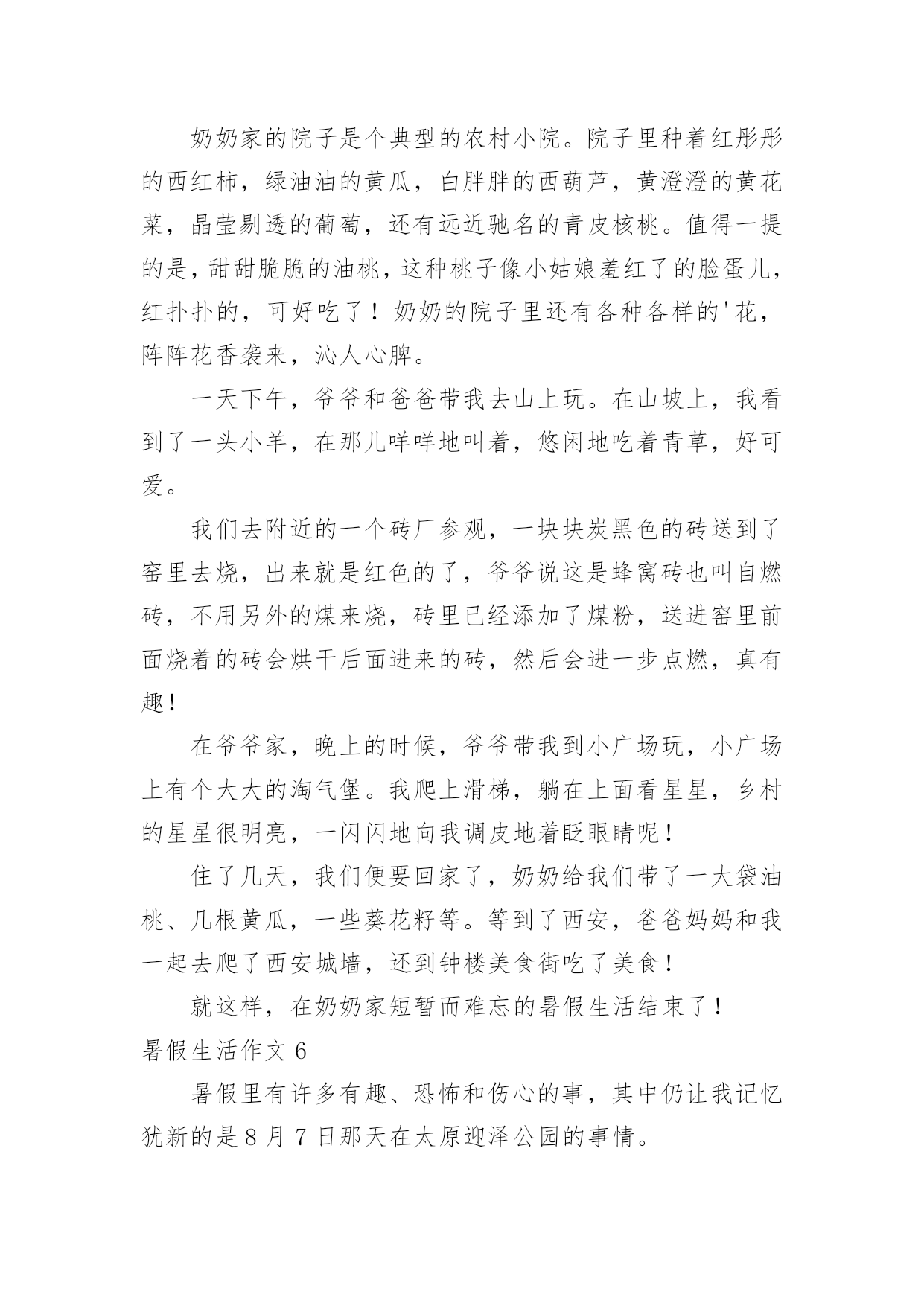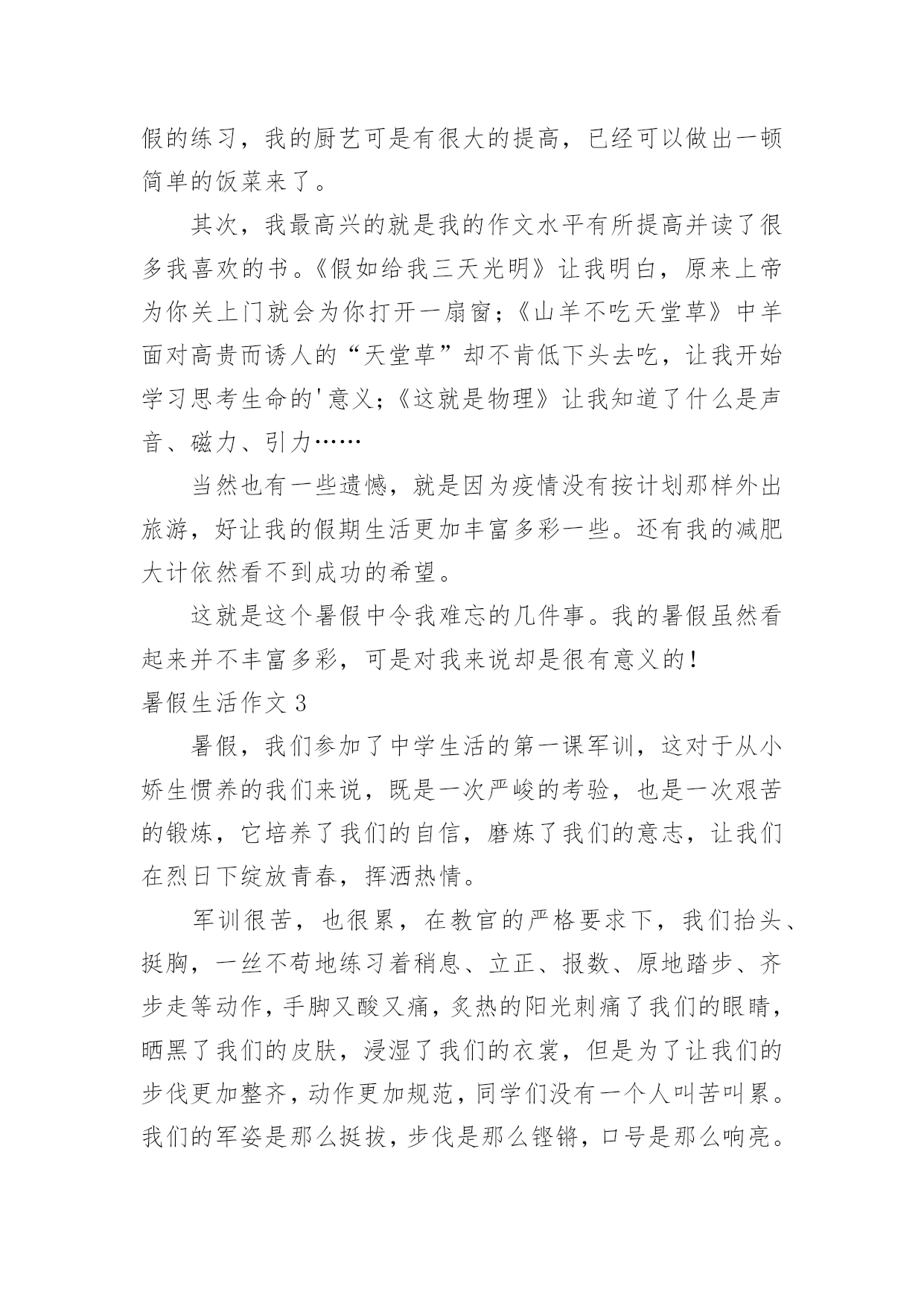 暑假生活作文暑假生活作文[热]在平平淡淡的日常中,大家都不可避免地要接触到作文吧,作文是通过文字来表达一个主题意义的记叙方法。相信很多朋友都对写作文感到非常苦恼吧,以下是小编帮大家整理的暑假生活作文,欢迎大家借鉴与参考,希望对大家有所帮助。暑假生活作文1我的暑假生活丰富多彩,跳舞、弹琴、旅行、散步样样都有。先说一说旅行吧!我去了青天河,那里山清水秀,湖里还有小鱼和小虾;更有蝴蝶、蜻蜓在翩翩起舞;还有小鸟在唱歌;那里的路有山路、平路、滑路;山有大山、小山,石山,土山;树有弯树、直树、高树和矮树;石有重石、轻石、扁石、大石;叶有圆叶、方形叶、三角叶还有菱形叶子,直是美极了。旅行是一种享受。再来讲一讲跳舞吧!妈妈给我报了一个舞蹈班,我每天都去跳舞,之前一段时间,老师给我们压胯时,总有一种巨痛。唉,只能忍耐一下了。后来时间长了,我坚持每天练功,也慢慢适应了。学会了《小小手》等好几个舞蹈呢。坚持就是胜利。还要重点讲一点弹琴!弹琴是我的专业课,已经学习一年多了,自从弹古筝后,我从不骄傲,越弹越有劲,很快从一级弹到了三级。今年暑假时要考级,妈妈给我报了名,在暑假里,我每天都要练习两个小时的'琴。考级当天,当我走进教室时,我很激动,也很紧张,可是慢慢的就正常发挥了。当我走出考场时,我感到无比光荣,因为我战胜了自己的恐惧心理,我胜利了,我对自己说:努力吧!战胜自己才能走向成功。最后说一说散步吧!每天妈妈都要带我到体育场,那里很热闹,还能做操,每次音乐一响,我和妈妈说开始跟着做,每次做完操我就精神百倍,散步对身体很有用处哦。养成一个良好的习惯对身体大有帮助呢。怎样,我的暑假生活还不错吧?暑假生活作文2今年的暑假,简单的用一句被我改编过的老话来说,就是“不听老妈言,吃亏在眼前。”老妈从刚开始放假的时候,就告诉我,要先苦后甜,先花个几天时间,把所有作业写个精光,然后放开了心,撒欢的玩一通,再收收心预习预习新学期的科目就行了。可我偏不听,我觉得,作业也就那么多嘛,再玩玩。可玩着玩着这暑假眼看就快该结束了,一看还有作业没完成,眼下在拼命补作业的同时,我也总结了一下,至少这暑假,过的还是蛮有意义的。首先这个暑假我最大的收获是学会了做饭。做饭可是不简单,不同的菜有不同的做法。在我刚学习做饭时连个炒蛋都炒不好,那可是我平时认为最简单的菜!但是经过一个暑假的练习,我的厨艺可是有很大的提高,已经可以做出一顿简单的饭菜来了。其次,我最高兴的就是我的作文水平有所提高并读了很多我喜欢的书。《假如给我三天光明》让我明白,原来上帝为你关上门就会为你打开一扇窗;《山羊不吃天堂草》中羊面对高贵而诱人的“天堂草”却不肯低下头去吃,让我开始学习思考生命的'意义;《这就是物理》让我知道了什么是声音、磁力、引力……当然也有一些遗憾,就是因为疫情没有按计划那样外出旅游,好让我的假期生活更加丰富多彩一些。还有我的减肥大计依然看不到成功的希望。这就是这个暑假中令我难忘的几件事。我的暑假虽然看起来并不丰富多彩,可是对我来说却是很有意义的!暑假生活作文3暑假,我们参加了中学生活的第一课军训,这对于从小娇生惯养的我们来说,既是一次严峻的考验,也是一次艰苦的锻炼,它培养了我们的自信,磨炼了我们的意志,让我们在烈日下绽放青春,挥洒热情。军训很苦,也很累,在教官的严格要求下,我们抬头、挺胸,一丝不苟地练习着稍息、立正、报数、原地踏步、齐步走等动作,手脚又酸又痛,炙热的阳光刺痛了我们的眼睛,晒黑了我们的皮肤,浸湿了我们的衣裳,但是为了让我们的步伐更加整齐,动作更加规范,同学们没有一个人叫苦叫累。我们的军姿是那么挺拔,步伐是那么铿锵,口号是那么响亮。在整齐有序的队列中我们感受到了作为集体一员的归属感和责任感,我们在愉快的活动和交流中被老师和同学感动,我们在精彩的报告中被博学多识而且睿智幽默的老师所折服。我们爱上了这美丽的校园,我们不禁开始憧憬着我们美好的`中学生活。通过五天的风雨和阳光,我们已经作好了准备,在即将开始的中学学习生活中,我们会严格遵守学校的各项规章制度,团结同学、尊敬师长,养成良好的学习生活习惯,做个有爱心和责任心的人;我们要珍惜大好时光,学习科学文化知识,坚持锻炼身体,努力成为合格型的人才;我们不怕困难,敢于挑战,我们要在这座美丽的校园中茁壮成长,做一名出色的十二中人,终有一天,我们要让十二中为我们感到自豪。暑假生活作文4随着蝉儿的鸣叫越来越响亮,已经进入了一年中最有热情与活力的季节,而一个学期的学习与生活也进入了尾声。放暑假了!这个名词是我们这些男孩子最渴望听到的,长达两个月的暑假,多么令人激动啊!暑假来了,我们的生活也由单调的学习变得丰富多彩起来。我觉得暑假生活是明黄色的,因为炎热的天气给人灌注了无限的活力与热情。傍晚我到广场上,在羽毛球网面前手握球拍,目不斜视地注视着对面大汗淋漓的