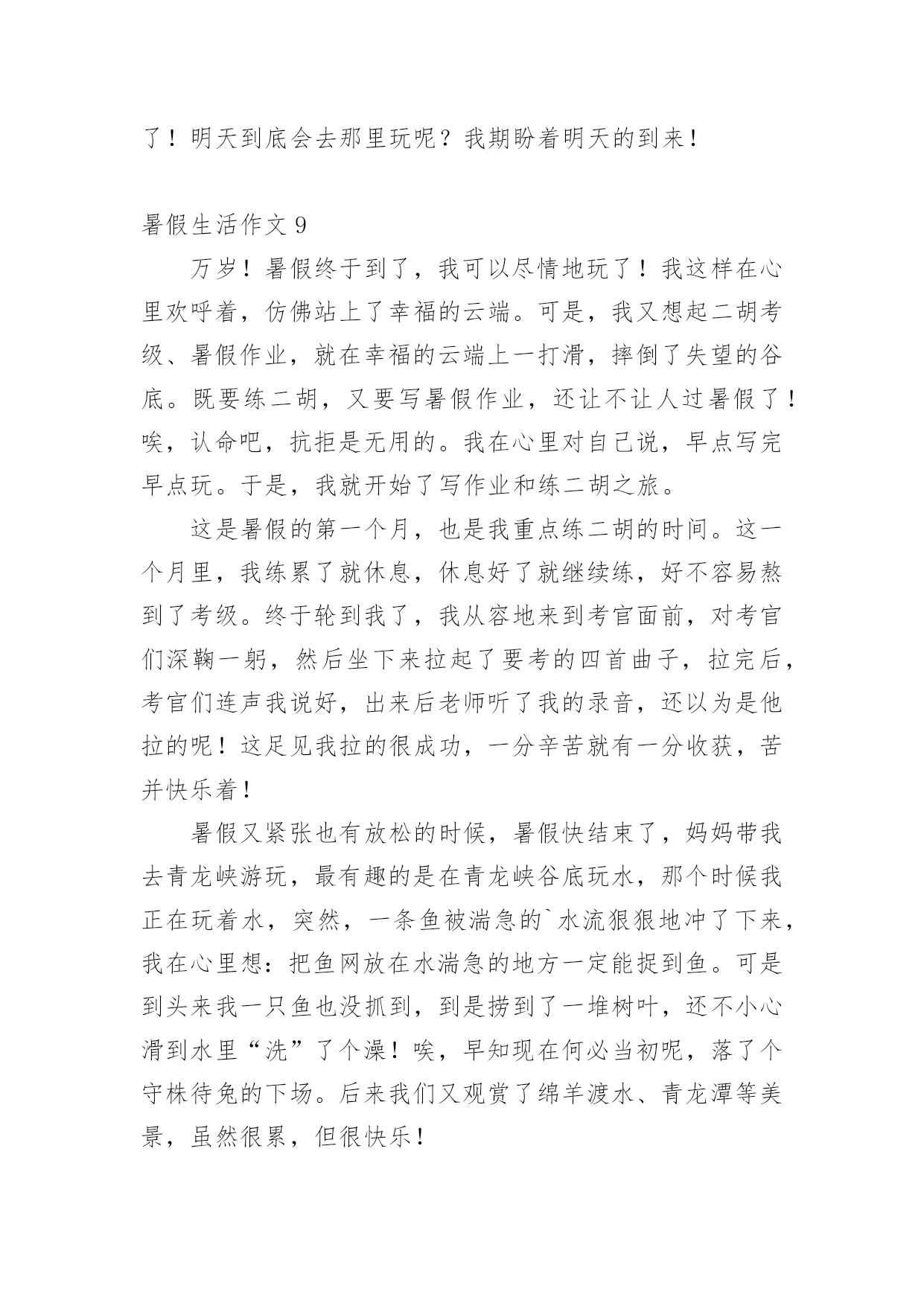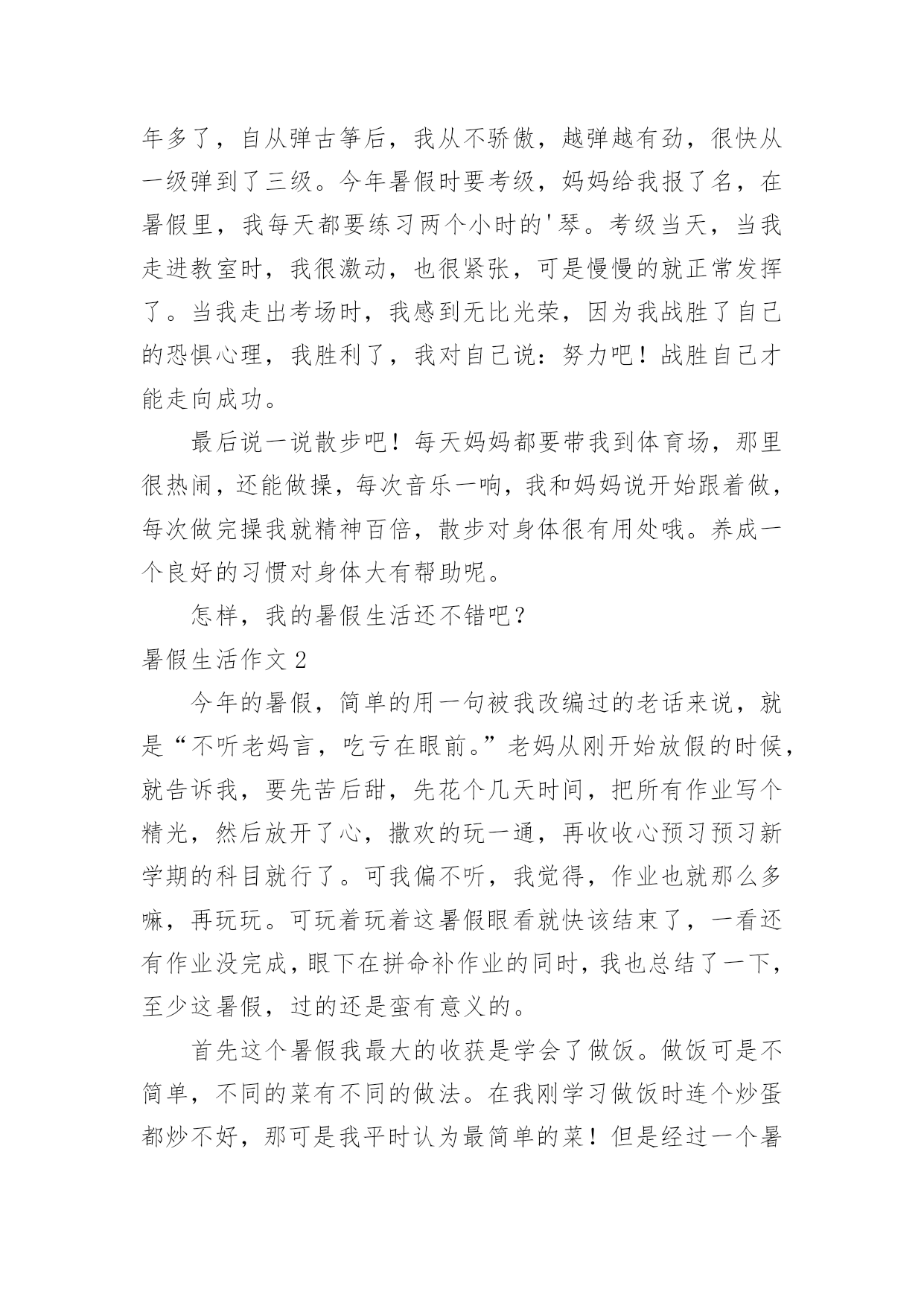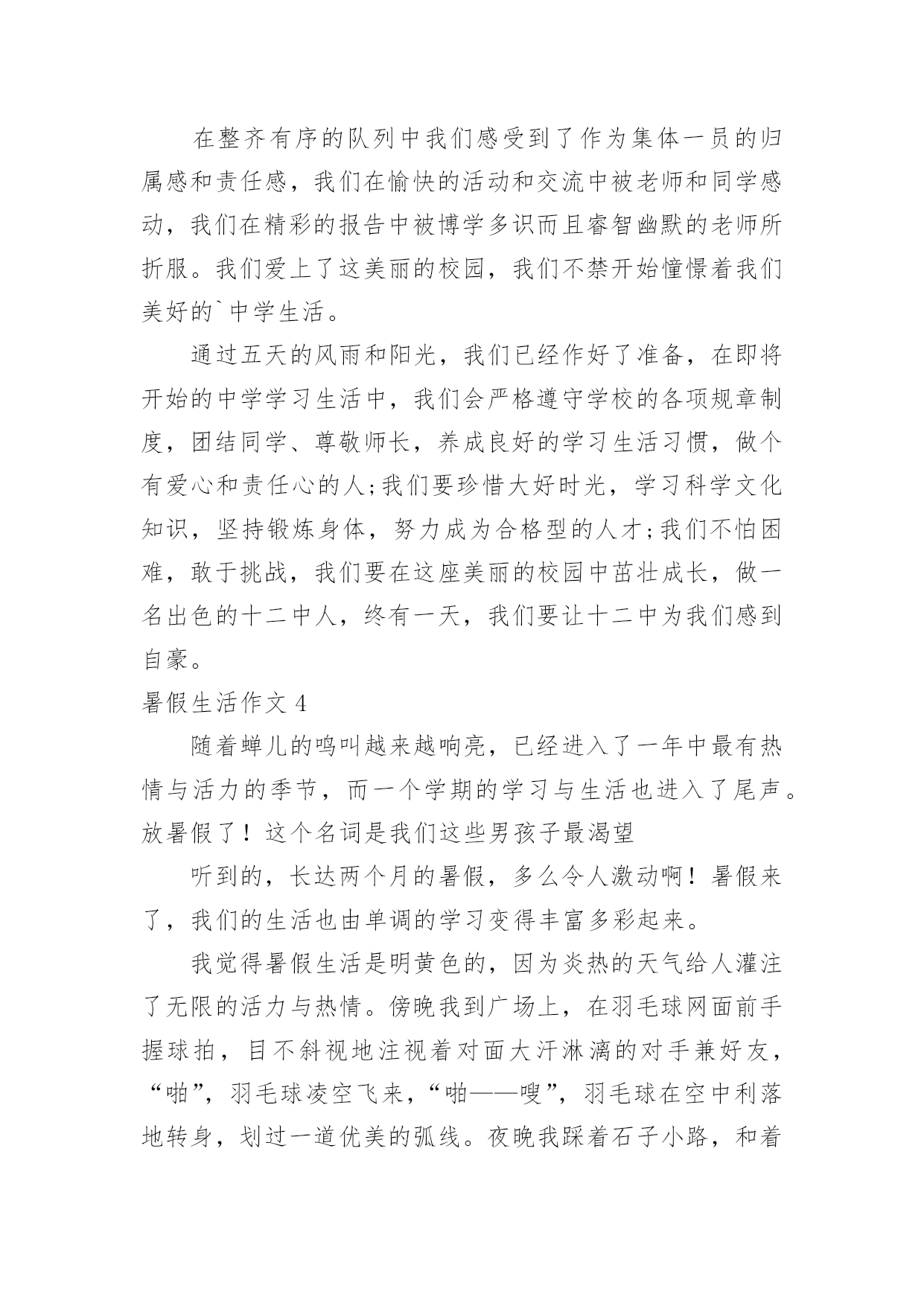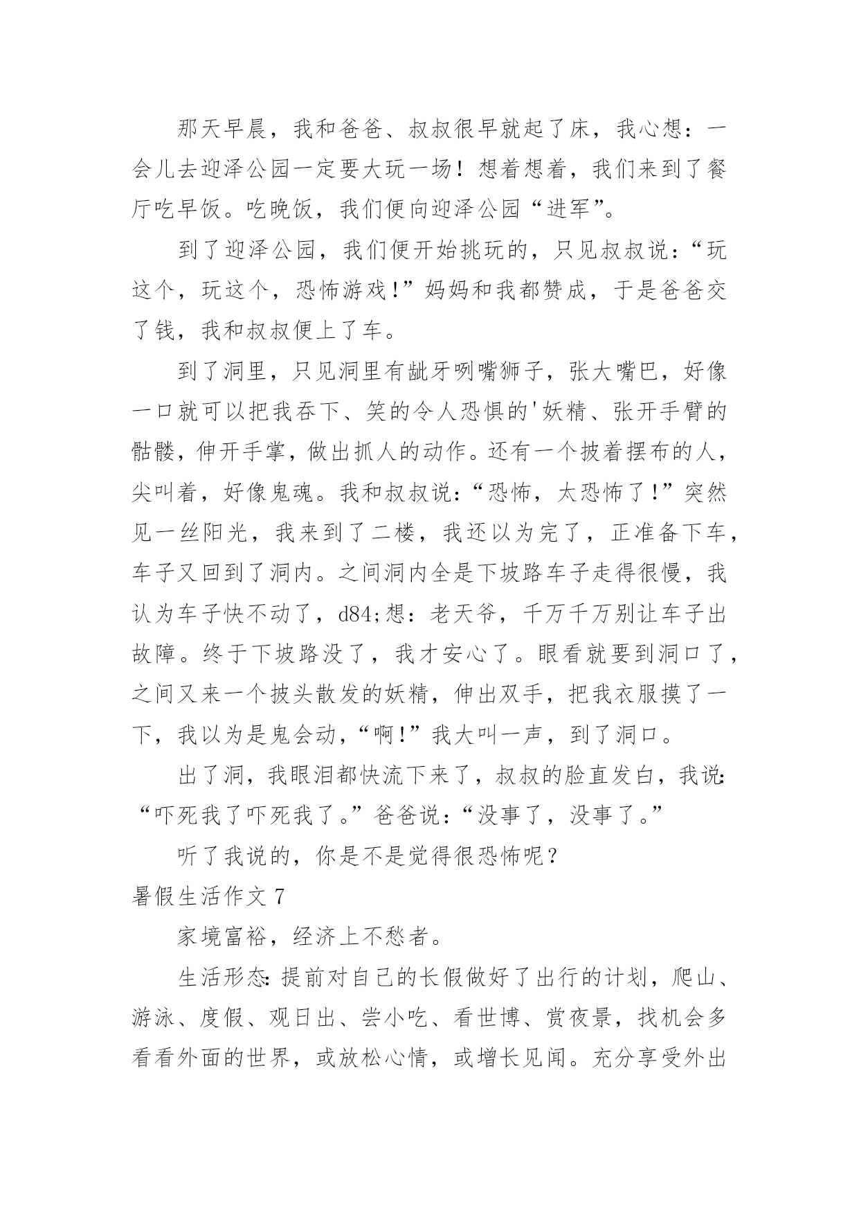 暑假生活作文暑假生活作文[热]在平平淡淡的日常中,大家都不可避免地要接触到作文吧,作文是通过文字来表达一个主题意义的记叙方法。相信很多朋友都对写作文感到非常苦恼吧,以下是小编帮大家整理的暑假生活作文,欢迎大家借鉴与参考,希望对大家有所帮助。暑假生活作文1我的暑假生活丰富多彩,跳舞、弹琴、旅行、散步样样都有。先说一说旅行吧!我去了青天河,那里山清水秀,湖里还有小鱼和小虾;更有蝴蝶、蜻蜓在翩翩起舞;还有小鸟在唱歌;那里的路有山路、平路、滑路;山有大山、小山,石山,土山;树有弯树、直树、高树和矮树;石有重石、轻石、扁石、大石;叶有圆叶、方形叶、三角叶还有菱形叶子,直是美极了。旅行是一种享受。再来讲一讲跳舞吧!妈妈给我报了一个舞蹈班,我每天都去跳舞,之前一段时间,老师给我们压胯时,总有一种巨痛。唉,只能忍耐一下了。后来时间长了,我坚持每天练功,也慢慢适应了。学会了《小小手》等好几个舞蹈呢。坚持就是胜利。还要重点讲一点弹琴!弹琴是我的专业课,已经学习一年多了,自从弹古筝后,我从不骄傲,越弹越有劲,很快从一级弹到了三级。今年暑假时要考级,妈妈给我报了名,在暑假里,我每天都要练习两个小时的'琴。考级当天,当我走进教室时,我很激动,也很紧张,可是慢慢的就正常发挥了。当我走出考场时,我感到无比光荣,因为我战胜了自己的恐惧心理,我胜利了,我对自己说:努力吧!战胜自己才能走向成功。最后说一说散步吧!每天妈妈都要带我到体育场,那里很热闹,还能做操,每次音乐一响,我和妈妈说开始跟着做,每次做完操我就精神百倍,散步对身体很有用处哦。养成一个良好的习惯对身体大有帮助呢。怎样,我的暑假生活还不错吧?暑假生活作文2今年的暑假,简单的用一句被我改编过的老话来说,就是“不听老妈言,吃亏在眼前。”老妈从刚开始放假的时候,就告诉我,要先苦后甜,先花个几天时间,把所有作业写个精光,然后放开了心,撒欢的玩一通,再收收心预习预习新学期的科目就行了。可我偏不听,我觉得,作业也就那么多嘛,再玩玩。可玩着玩着这暑假眼看就快该结束了,一看还有作业没完成,眼下在拼命补作业的同时,我也总结了一下,至少这暑假,过的还是蛮有意义的。首先这个暑假我最大的收获是学会了做饭。做饭可是不简单,不同的菜有不同的做法。在我刚学习做饭时连个炒蛋都炒不好,那可是我平时认为最简单的菜!但是经过一个暑假的练习,我的厨艺可是有很大的提高,已经可以做出一顿简单的饭菜来了。其次,我最高兴的就是我的作文水平有所提高并读了很多我喜欢的书。《假如给我三天光明》让我明白,原来上帝为你关上门就会为你打开一扇窗;《山羊不吃天堂草》中羊面对高贵而诱人的“天堂草”却不肯低下头去吃,让我开始学习思考生命的'意义;《这就是物理》让我知道了什么是声音、磁力、引力……当然也有一些遗憾,就是因为疫情没有按计划那样外出旅游,好让我的假期生活更加丰富多彩一些。还有我的减肥大计依然看不到成功的希望。这就是这个暑假中令我难忘的几件事。我的暑假虽然看起来并不丰富多彩,可是对我来说却是很有意义的!暑假生活作文3暑假,我们参加了中学生活的第一课军训,这对于从小娇生惯养的我们来说,既是一次严峻的考验,也是一次艰苦的锻炼,它培养了我们的自信,磨炼了我们的意志,让我们在烈日下绽放青春,挥洒热情。军训很苦,也很累,在教官的严格要求下,我们抬头、挺胸,一丝不苟地练习着稍息、立正、报数、原地踏步、齐步走等动作,手脚又酸又痛,炙热的阳光刺痛了我们的眼睛,晒黑了我们的皮肤,浸湿了我们的衣裳,但是为了让我们的步伐更加整齐,动作更加规范,同学们没有一个人叫苦叫累。我们的军姿是那么挺拔,步伐是那么铿锵,口号是那么响亮。在整齐有序的队列中我们感受到了作为集体一员的归属感和责任感,我们在愉快的活动和交流中被老师和同学感动,我们在精彩的报告中被博学多识而且睿智幽默的老师所折服。我们爱上了这美丽的校园,我们不禁开始憧憬着我们美好的`中学生活。通过五天的风雨和阳光,我们已经作好了准备,在即将开始的中学学习生活中,我们会严格遵守学校的各项规章制度,团结同学、尊敬师长,养成良好的学习生活习惯,做个有爱心和责任心的人;我们要珍惜大好时光,学习科学文化知识,坚持锻炼身体,努力成为合格型的人才;我们不怕困难,敢于挑战,我们要在这座美丽的校园中茁壮成长,做一名出色的十二中人,终有一天,我们要让十二中为我们感到自豪。暑假生活作文4随着蝉儿的鸣叫越来越响亮,已经进入了一年中最有热情与活力的季节,而一个学期的学习与生活也进入了尾声。放暑假了!这个名词是我们这些男孩子最渴望听到的,长达两个月的暑假,多么令人激动啊!暑假来了,我们的生活也由单调的学习变得丰富多彩起来。我觉得暑假生活是明黄色的,因为炎热的天气给人灌注了无限的活力与热情。傍晚我到广场上,在羽毛球网面前手握球拍,目不斜视地注视着对面大汗淋漓的