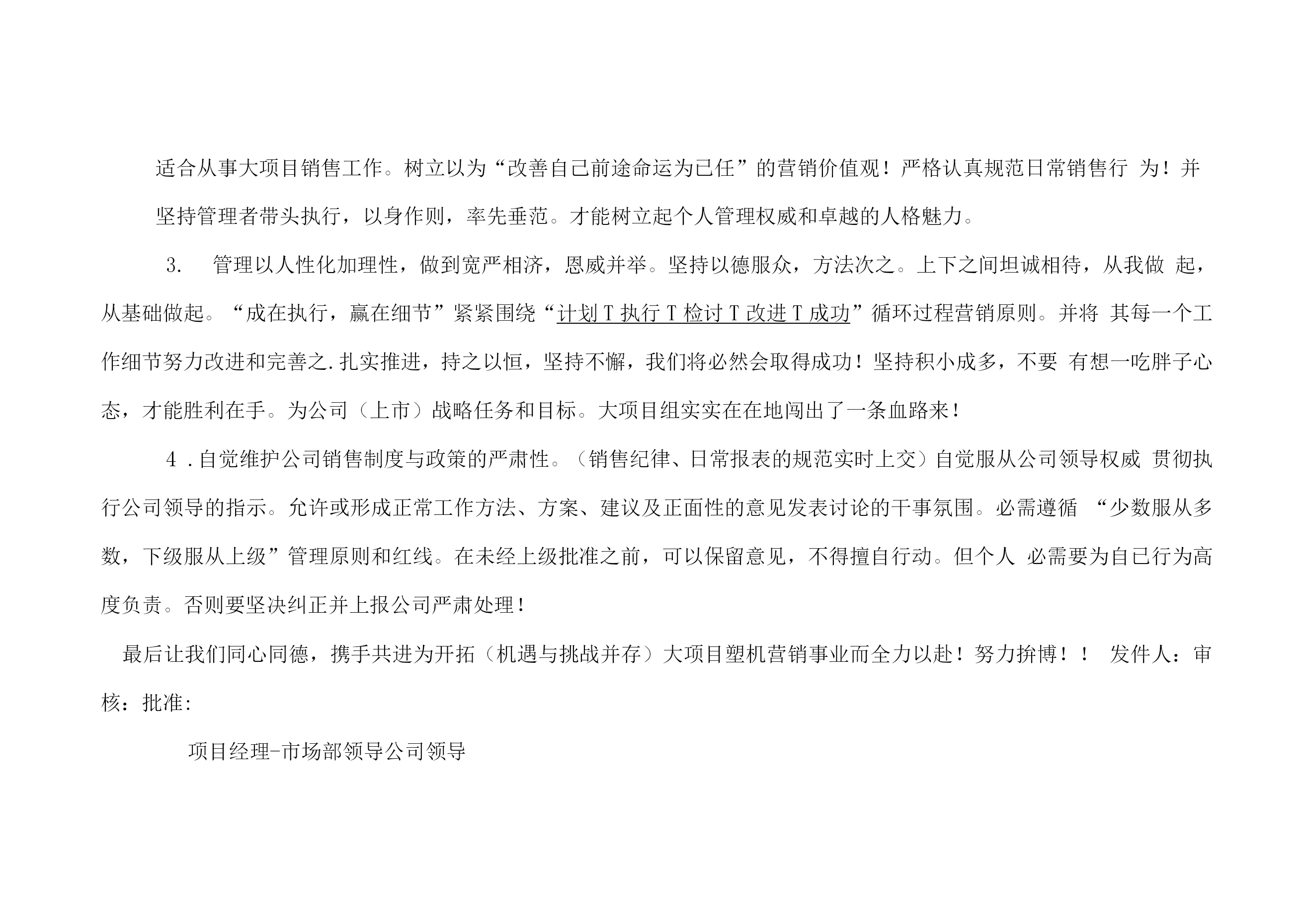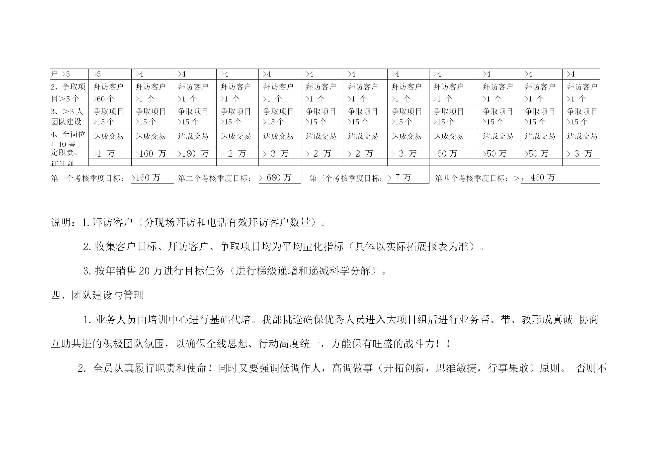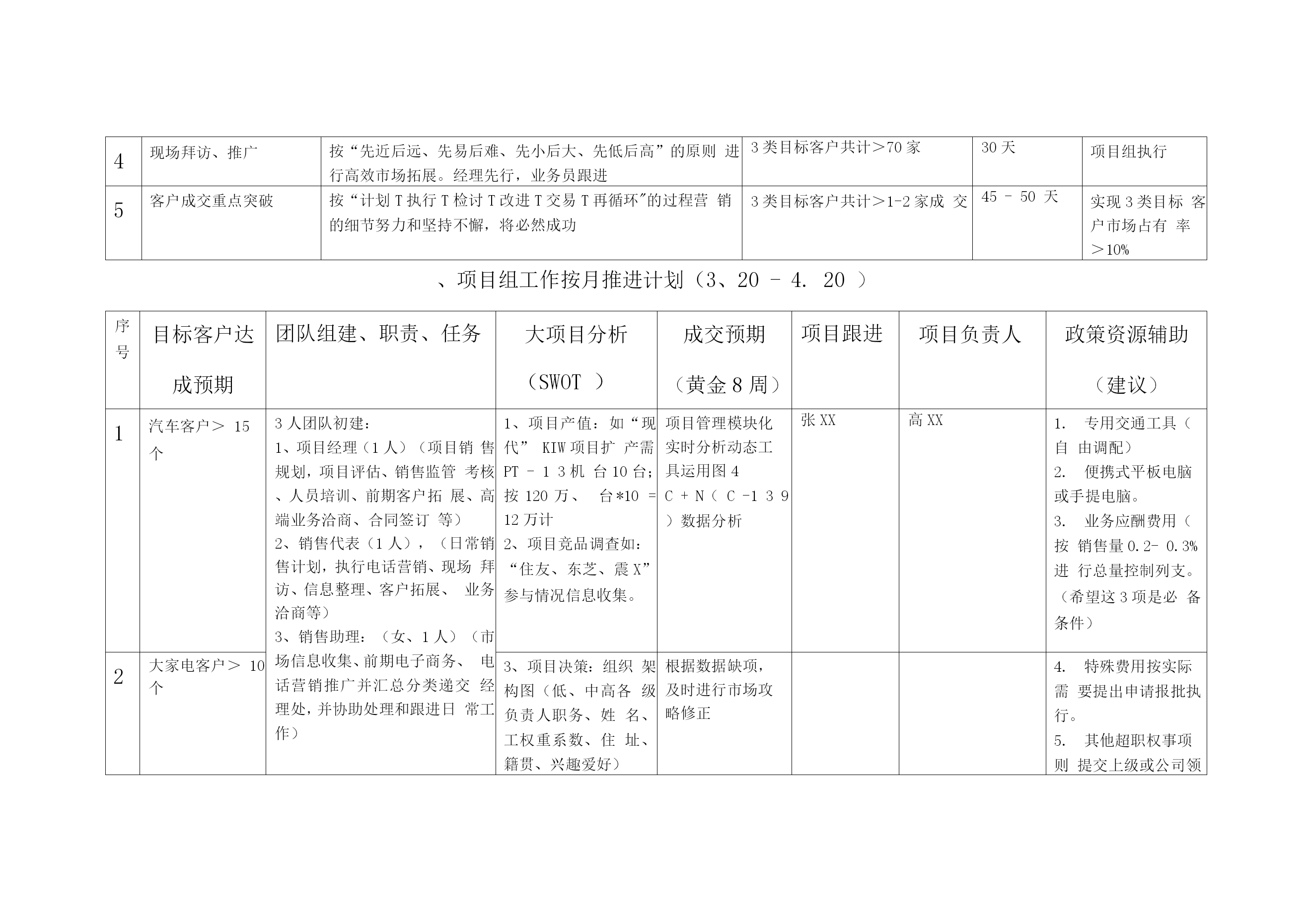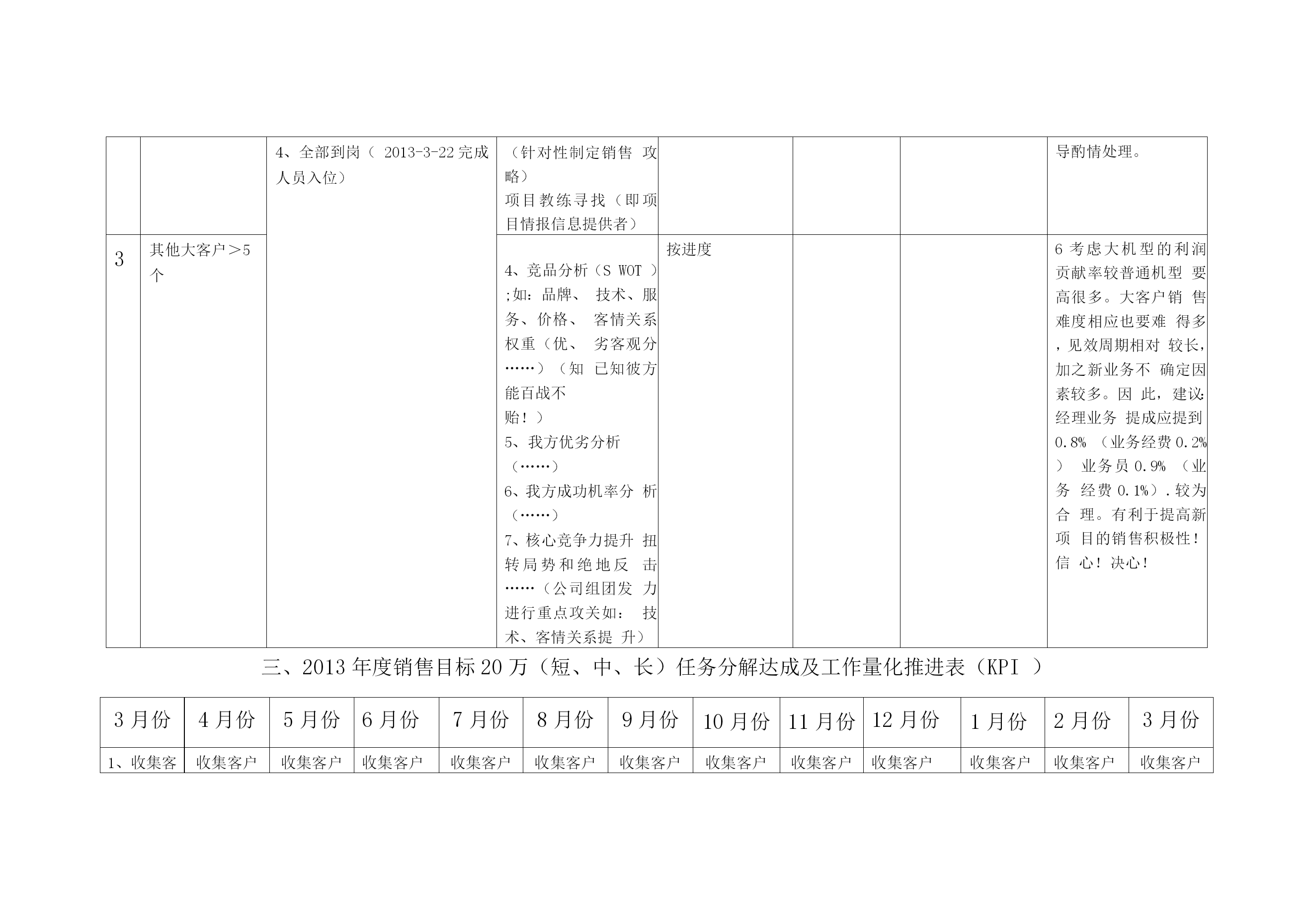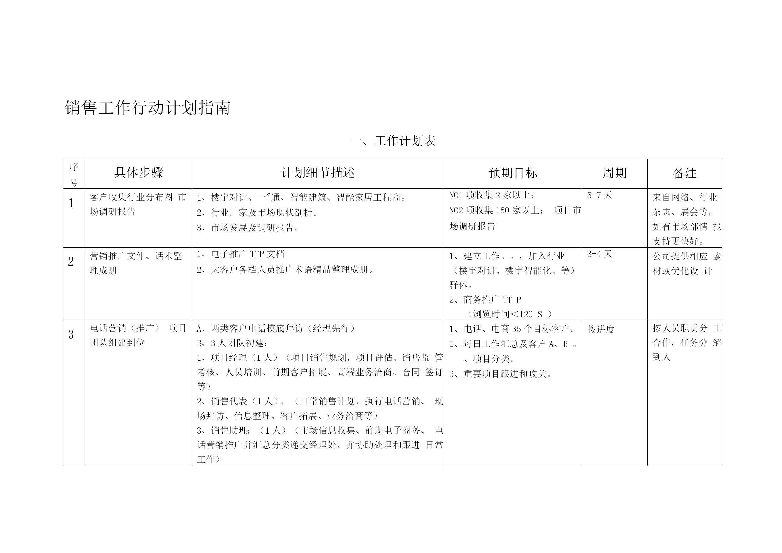 销售工作行动计划指南一、工作计划表序号具体步骤计划细节描述预期目标周期备注1客户收集行业分布图市场调研报告1、楼宇对讲、一"通、智能建筑、智能家居工程商。2、行业厂家及市场现状剖析。3、市场发展及调研报告。NO1项收集2家以上;NO2项收集150家以上;项目市场调研报告5-7天来自网络、行业杂志、展会等。如有市场部情报支持更快好。2营销推广文件、话术整理成册1、电子推广TTP文档2、大客户各档人员推广术语精品整理成册。1、建立工作。。,加入行业(楼宇对讲、楼宇智能化、等)群体。2、商务推广TTP(浏览时间<120S)3-4天公司提供相应素材或优化设计3电话营销(推广)项目团队组建到位A、两类客户电话摸底拜访(经理先行)B、3人团队初建:1、项目经理(1人)(项目销售规划,项目评估、销售监管考核、人员培训、前期客户拓展、高端业务洽商、合同签订等)2、销售代表(1人),(日常销售计划,执行电话营销、现场拜访、信息整理、客户拓展、业务洽商等)3、销售助理:(1人)(市场信息收集、前期电子商务、电话营销推广并汇总分类递交经理处,并协助处理和跟进日常工作)1、电话、电商35个目标客户。2、每日工作汇总及客户A、B。、项目分类。3、重要项目跟进和攻关。按进度按人员职责分工合作,任务分解到人4现场拜访、推广按“先近后远、先易后难、先小后大、先低后高”的原则进行高效市场拓展。经理先行,业务员跟进3类目标客户共计>70家30天项目组执行5客户成交重点突破按“计划T执行T检讨T改进T交易T再循环"的过程营销的细节努力和坚持不懈,将必然成功3类目标客户共计>1-2家成交45-50天实现3类目标客户市场占有率>10%、项目组工作按月推进计划(3、20-4.20)序号目标客户达成预期团队组建、职责、任务大项目分析(SWOT)成交预期(黄金8周)项目跟进项目负责人政策资源辅助(建议)1汽车客户>15个3人团队初建:1、项目经理(1人)(项目销售规划,项目评估、销售监管考核、人员培训、前期客户拓展、高端业务洽商、合同签订等)2、销售代表(1人),(日常销售计划,执行电话营销、现场拜访、信息整理、客户拓展、业务洽商等)3、销售助理:(女、1人)(市场信息收集、前期电子商务、电话营销推广并汇总分类递交经理处,并协助处理和跟进日常工作)1、项目产值:如“现代”KIW项目扩产需PT-13机台10台;按120万、台*10=12万计2、项目竞品调查如:“住友、东芝、震X”参与情况信息收集。项目管理模块化实时分析动态工具运用图4C+N(C-139)数据分析张XX高XX专用交通工具(自由调配)便携式平板电脑或手提电脑。业务应酬费用(按销售量0.2-0.3%进行总量控制列支。(希望这3项是必备条件)2大家电客户>10个3、项目决策:组织架构图(低、中高各级负责人职务、姓名、工权重系数、住址、籍贯、兴趣爱好)根据数据缺项,及时进行市场攻略修正特殊费用按实际需要提出申请报批执行。其他超职权事项则提交上级或公司领4、全部到岗(2013-3-22完成人员入位)(针对性制定销售攻略)项目教练寻找(即项目情报信息提供者)导酌情处理。3其他大客户>5个4、竞品分析(SWOT);如:品牌、技术、服务、价格、客情关系权重(优、劣客观分……)(知已知彼方能百战不贻!)5、我方优劣分析(……)6、我方成功机率分析(……)7、核心竞争力提升扭转局势和绝地反击……(公司组团发力进行重点攻关如:技术、客情关系提升)按进度6考虑大机型的利润贡献率较普通机型要高很多。大客户销售难度相应也要难得多,见效周期相对较长,加之新业务不确定因素较多。因此,建议:经理业务提成应提到0.8%(业务经费0.2%)业务员0.9%(业务经费0.1%).较为合理。有利于提高新项目的销售积极性!信心!决心!三、2013年度销售目标20万(短、中、长)任务分解达成及工作量化推进表(KPI)3月份4月份5月份6月份7月份8月份9月份10月份11月份12月份1月份2月份3月份1、收集客收集客户收集客户收集客户收集客户收集客户收集客户收集客户收集客户收集客户收集客户收集客户收集客户户>3>3>4>4>4>4>4>4>4>4>4>4>42、争取项拜访客户拜访客户拜访客户拜访客户拜访客户拜访客户拜访客户拜访客户拜访客户拜访客户拜访客户拜访客户目>5个>60个>1个>1个>1个>1个>1个>1个>1个>1个>1个>1个>1个3、>3人争取项目争取项目争取项目争取项目争取项目争取项目争取项目争取项目争取项目争取项目争取项目争取项目团队建设>15个>15个>15个>15个>15个>15个>15个>15个>15个>15个>15个>15个4、全岗位+TO害达成交易