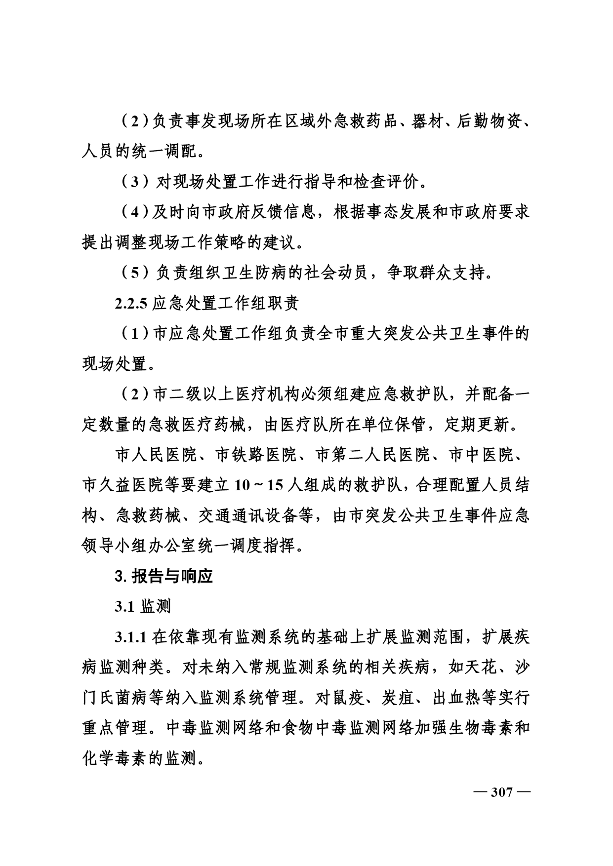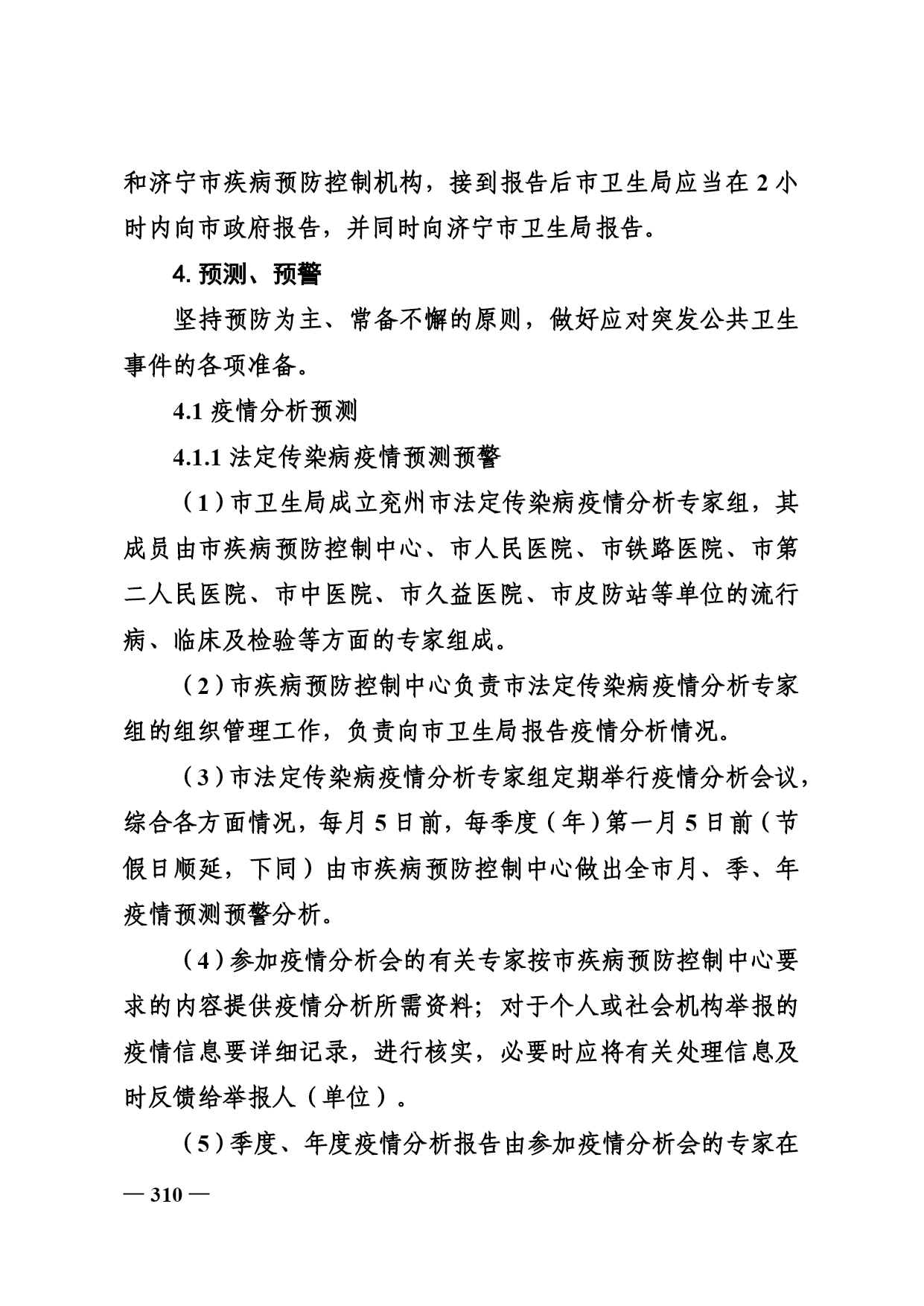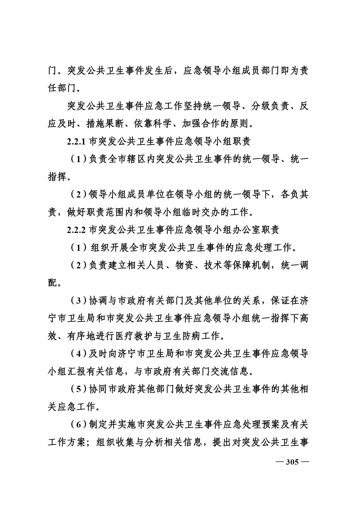 ——兖州市突发公共卫生事件应急预案1.总则1.1为及时、高效、妥善处置发生在我市行政区域内的突发公共卫生事件,做好疾病控制和医疗救护工作,最大限度地减少人员伤亡和财产损失,保障人民群众健康安全,维护社会稳定。根据《中华人民共和国传染病防治法》、《突发公共卫生事件应急条例》等有关法律法规,制定本预案。1.2本预案适用于发生在我市行政区域内的突发公共卫生事件。突发公共卫生事件是指:突然发生、造成或者可能造成社会公众健康严重损害的重大传染病疫情、群体性不明原因疾病、重大食物和职业中毒以及其他严重影响公众健康的事件。1.3本预案将根据情况变化进行修订。2.组织机构和部门职责2.1组织机构2.1.1市突发公共卫生事件应急领导小组市政府成立市突发公共卫生事件应急领导小组,组长由市政府分管领导担任,副组长由市政府办公室分管主任和市卫生局局长担任,成员由市委宣传部、市发展和改革局、市经贸局、市商贸局、市教育局、市科技局、市公安局、市财政局、市建设局、市交通局、市农业局、市卫生局、市人口计生局、市工商局、市食品药品监督管理局、市旅游局、市外侨办有关负责同志担任。2.1.2市突发公共卫生事件应急领导小组办公室市突发公共卫生事件应急领导小组下设办公室,办公室设在市卫生局,市卫生局局长兼任主任,承担市突发公共卫生事件应急领导小组的日常工作。市突发公共卫生事件应急领导小组办公室下设疫情控制、医疗救护、物资保障、专家咨询等工作组,成员由市直医疗卫生单位相关专家组成,分别承担情况调查、现场控制、扩散预防、医疗救治和后勤保障等工作。2.1.3临时现场指挥部一旦发生突发公共卫生事件,市突发公共卫生事件应急领导小组立即成立由领导小组成员、专家咨询工作组人员等组成的临时现场指挥部,赶赴现场。2.1.4应急处置工作组市卫生局要成立针对突发公共卫生事件的应急处置工作组,人员由流行病学、临床救护、急诊医学、卫生监督、实验室检测、消杀灭、后勤保障等方面专家和训练有素的工作人员组成。根据工作需要可分为现场处置分队、后勤保障分队、检验检测分队、医疗救护分队等。2.2突发公共卫生事件应急职责市政府及政府有关部门是我市突发公共卫生事件的责任部门。突发公共卫生事件发生后,应急领导小组成员部门即为责任部门。突发公共卫生事件应急工作坚持统一领导、分级负责、反应及时、措施果断、依靠科学、加强合作的原则。2.2.1市突发公共卫生事件应急领导小组职责(1)负责全市辖区内突发公共卫生事件的统一领导、统一指挥。(2)领导小组成员单位在领导小组的统一领导下,各负其责,做好职责范围内和领导小组临时交办的工作。2.2.2市突发公共卫生事件应急领导小组办公室职责(1)组织开展全市突发公共卫生事件的应急处理工作。(2)负责建立相关人员、物资、技术等保障机制,统一调配。(3)协调与市政府有关部门及其他单位的关系,保证在济宁市卫生局和市突发公共卫生事件应急领导小组统一指挥下高效、有序地进行医疗救护与卫生防病工作。(4)及时向济宁市卫生局和市突发公共卫生事件应急领导小组汇报有关信息,与市政府有关部门交流信息。(5)协同市政府其他部门做好突发公共卫生事件的其他相关应急工作。(6)制定并实施市突发公共卫生事件应急处理预案及有关工作方案;组织收集与分析相关信息,提出对突发公共卫生事件进行预警与现场处理建议。(7)督促建立全市突发公共卫生事件应急处理信息的交流网络,保证信息畅通。(8)组织人员培训、物资储备、后勤保障、社会动员等相关工作。(9)负责与新闻单位沟通,使各新闻媒体能够主动配合应急处理工作。2.2.3专家咨询工作组职责(1)负责全市突发公共卫生事件的技术咨询与指导,向市突发公共卫生事件应急领导小组提出建议和工作策略。(2)收集整理突发公共卫生事件相关信息,答复社会关注问题。(3)负责收集相关材料,组织编制教材,开展相关业务技术培训与考核。(4)开展相关的实验室技术和现场控制策略的研究。(5)对全市突发公共卫生事件现场处置进行评价,并提出改进措施。2.2.4临时现场指挥部职责(1)临时现场指挥部是受市突发公共卫生事件应急领导小组或领导小组办公室委派的临时组织,在突发公共卫生事件应急领导小组的领导下,按照属地管理的原则,做好现场的应急工作。(2)负责事发现场所在区域外急救药品、器材、后勤物资、人员的统一调配。(3)对现场处置工作进行指导和检查评价。(4)及时向市政府反馈信息,根据事态发展和市政府要求提出调整现场工作策略的建议。(5)负责组织卫生防病的社会动员,争取群众支持。2.2.5应急处置工作组职责(1)市应急处置工作组负责全市重大突发公共卫生事件的现场处置。(2)市二级以上医疗机构必须组建应急救护队,并配备