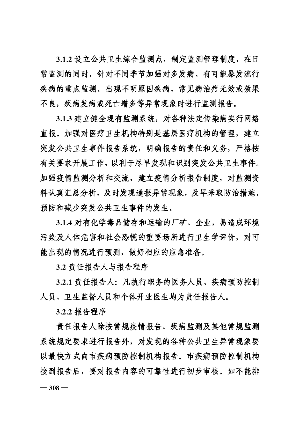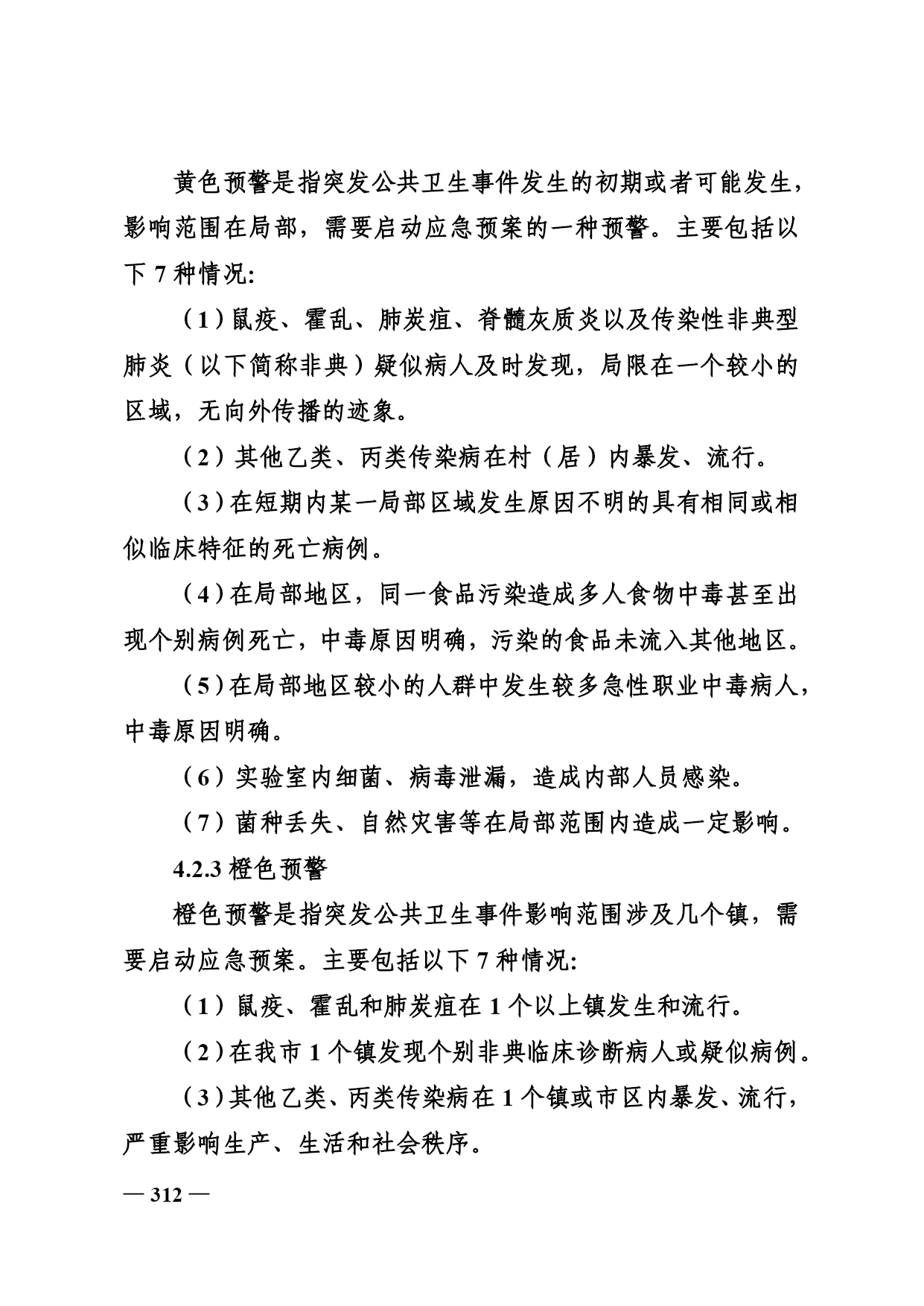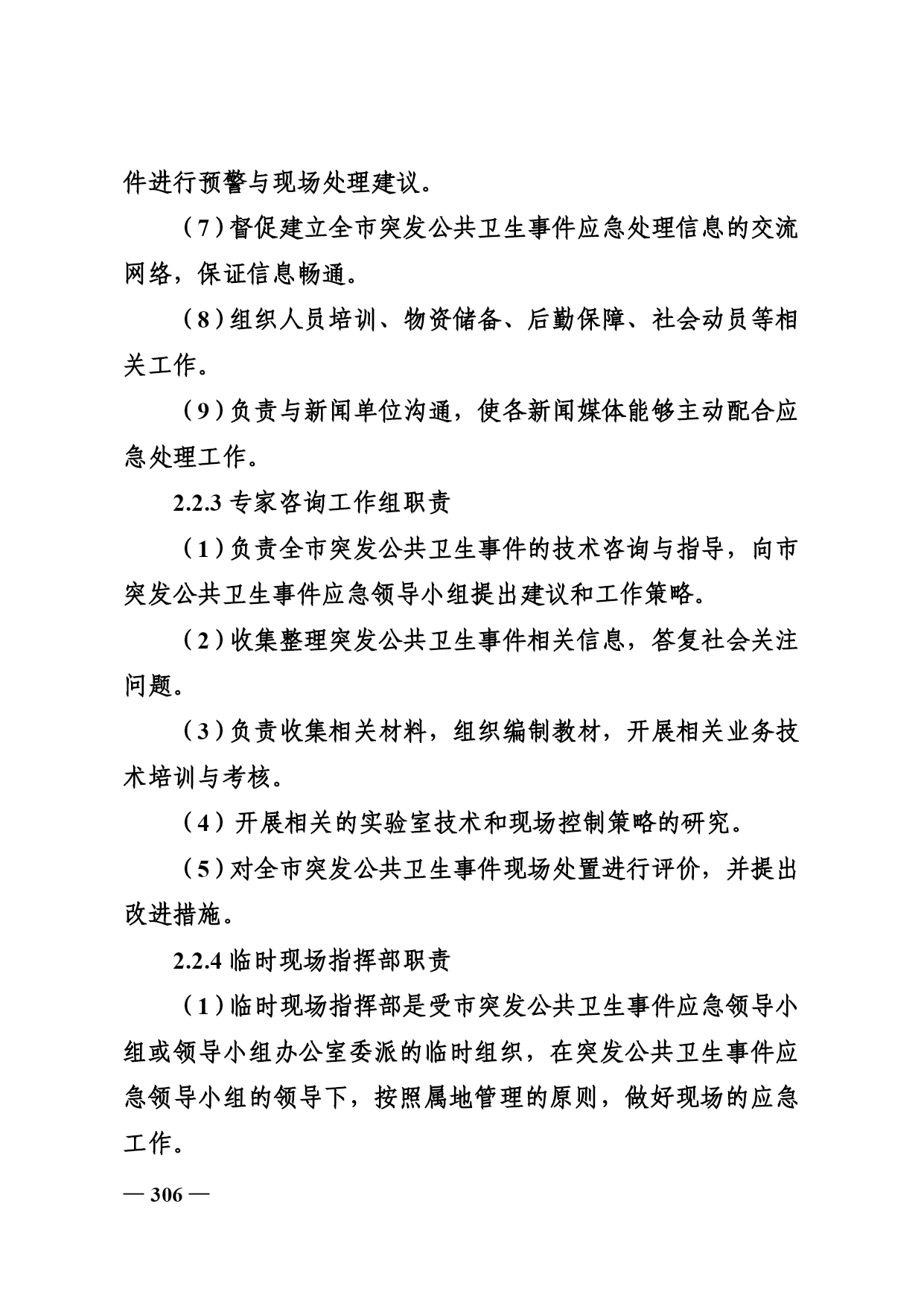 ——兖州市突发公共卫生事件应急预案1.总则1.1为及时、高效、妥善处置发生在我市行政区域内的突发公共卫生事件,做好疾病控制和医疗救护工作,最大限度地减少人员伤亡和财产损失,保障人民群众健康安全,维护社会稳定。根据《中华人民共和国传染病防治法》、《突发公共卫生事件应急条例》等有关法律法规,制定本预案。1.2本预案适用于发生在我市行政区域内的突发公共卫生事件。突发公共卫生事件是指:突然发生、造成或者可能造成社会公众健康严重损害的重大传染病疫情、群体性不明原因疾病、重大食物和职业中毒以及其他严重影响公众健康的事件。1.3本预案将根据情况变化进行修订。2.组织机构和部门职责2.1组织机构2.1.1市突发公共卫生事件应急领导小组市政府成立市突发公共卫生事件应急领导小组,组长由市政府分管领导担任,副组长由市政府办公室分管主任和市卫生局局长担任,成员由市委宣传部、市发展和改革局、市经贸局、市商贸局、市教育局、市科技局、市公安局、市财政局、市建设局、市交通局、市农业局、市卫生局、市人口计生局、市工商局、市食品药品监督管理局、市旅游局、市外侨办有关负责同志担任。2.1.2市突发公共卫生事件应急领导小组办公室市突发公共卫生事件应急领导小组下设办公室,办公室设在市卫生局,市卫生局局长兼任主任,承担市突发公共卫生事件应急领导小组的日常工作。市突发公共卫生事件应急领导小组办公室下设疫情控制、医疗救护、物资保障、专家咨询等工作组,成员由市直医疗卫生单位相关专家组成,分别承担情况调查、现场控制、扩散预防、医疗救治和后勤保障等工作。2.1.3临时现场指挥部一旦发生突发公共卫生事件,市突发公共卫生事件应急领导小组立即成立由领导小组成员、专家咨询工作组人员等组成的临时现场指挥部,赶赴现场。2.1.4应急处置工作组市卫生局要成立针对突发公共卫生事件的应急处置工作组,人员由流行病学、临床救护、急诊医学、卫生监督、实验室检测、消杀灭、后勤保障等方面专家和训练有素的工作人员组成。根据工作需要可分为现场处置分队、后勤保障分队、检验检测分队、医疗救护分队等。2.2突发公共卫生事件应急职责市政府及政府有关部门是我市突发公共卫生事件的责任部门。突发公共卫生事件发生后,应急领导小组成员部门即为责任部门。突发公共卫生事件应急工作坚持统一领导、分级负责、反应及时、措施果断、依靠科学、加强合作的原则。2.2.1市突发公共卫生事件应急领导小组职责(1)负责全市辖区内突发公共卫生事件的统一领导、统一指挥。(2)领导小组成员单位在领导小组的统一领导下,各负其责,做好职责范围内和领导小组临时交办的工作。2.2.2市突发公共卫生事件应急领导小组办公室职责(1)组织开展全市突发公共卫生事件的应急处理工作。(2)负责建立相关人员、物资、技术等保障机制,统一调配。(3)协调与市政府有关部门及其他单位的关系,保证在济宁市卫生局和市突发公共卫生事件应急领导小组统一指挥下高效、有序地进行医疗救护与卫生防病工作。(4)及时向济宁市卫生局和市突发公共卫生事件应急领导小组汇报有关信息,与市政府有关部门交流信息。(5)协同市政府其他部门做好突发公共卫生事件的其他相关应急工作。(6)制定并实施市突发公共卫生事件应急处理预案及有关工作方案;组织收集与分析相关信息,提出对突发公共卫生事件进行预警与现场处理建议。(7)督促建立全市突发公共卫生事件应急处理信息的交流网络,保证信息畅通。(8)组织人员培训、物资储备、后勤保障、社会动员等相关工作。(9)负责与新闻单位沟通,使各新闻媒体能够主动配合应急处理工作。2.2.3专家咨询工作组职责(1)负责全市突发公共卫生事件的技术咨询与指导,向市突发公共卫生事件应急领导小组提出建议和工作策略。(2)收集整理突发公共卫生事件相关信息,答复社会关注问题。(3)负责收集相关材料,组织编制教材,开展相关业务技术培训与考核。(4)开展相关的实验室技术和现场控制策略的研究。(5)对全市突发公共卫生事件现场处置进行评价,并提出改进措施。2.2.4临时现场指挥部职责(1)临时现场指挥部是受市突发公共卫生事件应急领导小组或领导小组办公室委派的临时组织,在突发公共卫生事件应急领导小组的领导下,按照属地管理的原则,做好现场的应急工作。(2)负责事发现场所在区域外急救药品、器材、后勤物资、人员的统一调配。(3)对现场处置工作进行指导和检查评价。(4)及时向市政府反馈信息,根据事态发展和市政府要求提出调整现场工作策略的建议。(5)负责组织卫生防病的社会动员,争取群众支持。2.2.5应急处置工作组职责(1)市应急处置工作组负责全市重大突发公共卫生事件的现场处置。(2)市二级以上医疗机构必须组建应急救护队,并配备