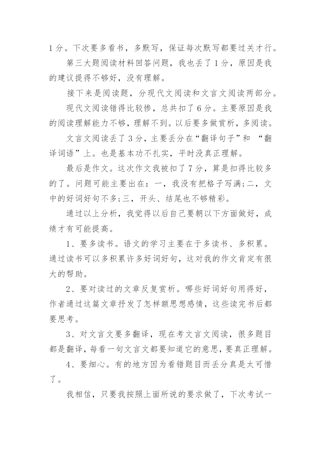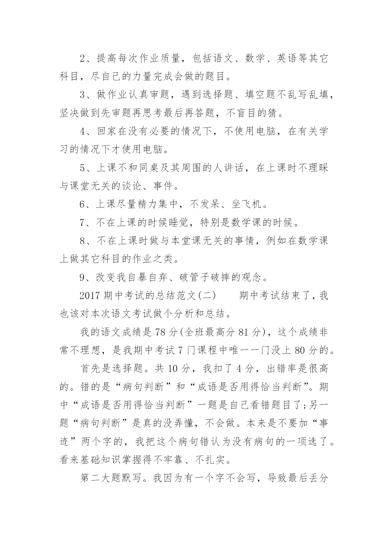 期中考试的总结2017期中考试的总结范文期中考试已经结束,此次考试自己发挥得如何?有哪些不足呢?我们可以通过总结记录下来,以下是小编为大家准备的2017期中考试的总结范文,仅供参考!2017期中考试的总结范文(一)期中考试考完了,还没等成绩出来,我已经预料到了这次考试的惨败,我认为让这次考试惨败和这几点有关:1、考试前没有好好复习。2、考试时心理状态不佳,非常紧张。3、考试时精神状态异常不好,没精打采,根本没有心思考试,只想赶快把题做完,结束考试。4、在考试的时候有部分题目不会做,放在了后面来做,结果后面没有了时间,也忘记了还有这些剩余的题目。成绩次日就下来了,结果非常令人惊讶,简直不可思议,卷子错误连篇,叉叉随处可见,上次期末222名,这次中期考试竟然409名,直线下降187名,接近翻番,如果在后半期还是这样的状态,留在宏志班是没有希望、完全不可能的.,因为在我后面还有许许多多的人想到宏志班来,而我在后退,他们在前进,所以我在后半期一定要努力,做到这几点:1、每天所有的课余时间均拿来学习、做作业、看书,上厕所除外。2、提高每次作业质量,包括语文、数学、英语等其它科目,尽自己的力量完成会做的题目。3、做作业认真审题,遇到选择题、填空题不乱写乱填,坚决做到先审题再思考最后再答题,不盲目的猜。4、回家在没有必要的情况下,不使用电脑,在有关学习的情况下才使用电脑。5、上课不和同桌及其周围的人讲话,在上课时不理睬与课堂无关的谈论、事件。6、上课尽量精力集中,不发呆、坐飞机。7、不在上课的时候睡觉,特别是数学课的时候。8、不在上课时做与本堂课无关的事情,例如在数学课上做其它科目的作业之类。9、改变我自暴自弃、破管子破摔的观念。2017期中考试的总结范文(二)期中考试结束了,我也该对本次语文考试做个分析和总结。我的语文成绩是78分(全班最高分81分),这个成绩非常不理想,是我期中考试7门课程中唯一一门没上80分的。首先是选择题。共10分,我扣了4分,出错率是很高的。错的是“病句判断”和“成语是否用得恰当判断”。期中“成语是否用得恰当判断”一题是自己看错题目了;另一题“病句判断”是真的没弄懂,不会做。本来是不要加“事迹”两个字的,我把这个病句错认为没有病句的一项选了。看来基础知识掌握得不牢靠、不扎实。第二大题默写。我因为有一个字不会写,导致最后丢分1分。下次要多看书,多默写,保证每次默写都要过关才行。第三大题阅读材料回答问题,我也丢了1分,原因是我的建议提得不够好,没有理解。接下来是阅读题,分现代文阅读和文言文阅读两部分。现代文阅读错得比较惨,总共扣了6分。主要原因是我的阅读理解能力不够,理解不到。以后要多做赏析,多阅读。文言文阅读丢了3分,主要丢分在“翻译句子”和“翻译词语”上。也是基本功不扎实,平时没真正理解。最后是作文。这次作文我被扣了7分,算是扣得比较多的了。问题可能主要出在:一,我没有把格子写满;二,文中的好词好句不多;三,开头、结尾也不够精彩。通过以上分析,我觉得以后自己要朝以下方面做好,成绩才有可能提高。1、要多读书。语文的学习主要在于多读书、多积累。通过读书可以多积累许多好词好句,这对我的作文肯定有很大的帮助。2、要对读过的文章反复赏析。哪些好词好句用得好,作者通过这篇文章抒发了怎样额思想感情,这些读完书后都要思考。3、对文言文要多翻译,现在考文言文阅读,很多题目都是翻译,每看一句文言文都要知道它的意思,要真正理解。4、要细心。有的地方因为看错题目而丢分真是太可惜了。我相信,只要我按照上面所说的要求做了,下次考试一定能比这次考得好。