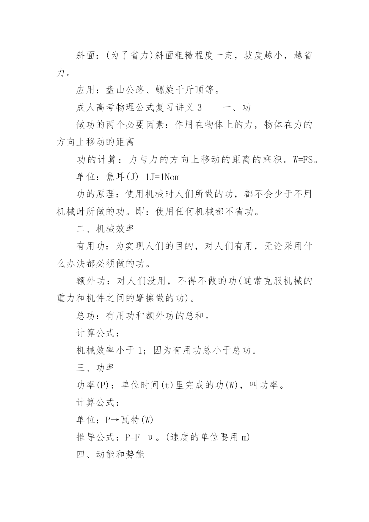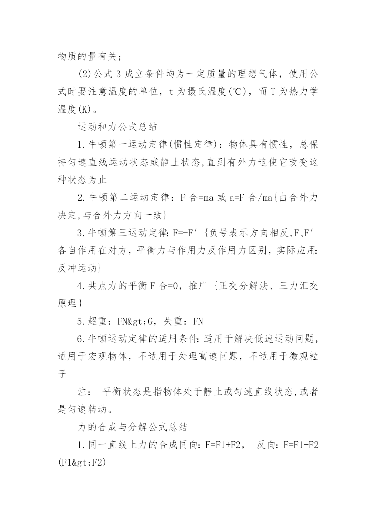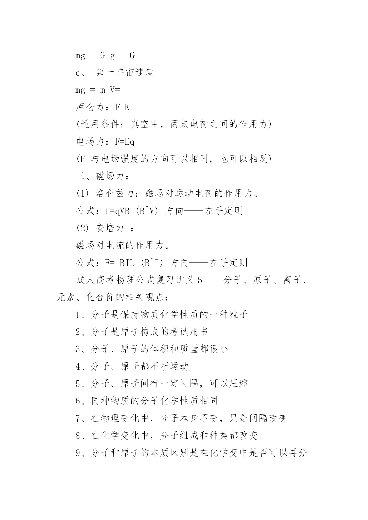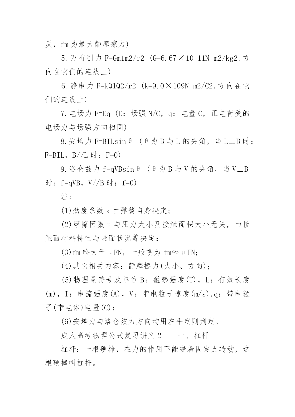 成人高考物理公式复习讲义2022成人高考物理公式复习讲义物理公式是考好物理考试的基础,因此我们在成考物理考试前应该复习好相应的复习。那么关于成人高考物理公式复习讲义有哪些呢?下面百分网小编为大家整理的成人高考物理公式复习讲义,希望大家喜欢。成人高考物理公式复习讲义1气体的性质公式总结1.气体的状态参量:温度:宏观上,物体的冷热程度;微观上,物体内部分子无规则运动的剧烈程度的标志热力学温度与摄氏温度关系:T=t+273{T:热力学温度(K),t:摄氏温度(℃)}体积V:气体分子所能占据的空间,单位换算:1m3=103L=106mL压强p:单位面积上,大量气体分子频繁撞击器壁而产生持续、均匀的压力,标准大气压:1atm=1.013×105Pa=76cmHg(1Pa=1N/m2)2.气体分子运动的特点:分子间空隙大;除了碰撞的瞬间外,相互作用力微弱;分子运动速率很大3.理想气体的状态方程:p1V1/T1=p2V2/T2{PV/T=恒量,T为热力学温度(K)}注:(1)理想气体的内能与理想气体的体积无关,与温度和物质的量有关;(2)公式3成立条件均为一定质量的理想气体,使用公式时要注意温度的单位,t为摄氏温度(℃),而T为热力学温度(K)。运动和力公式总结1.牛顿第一运动定律(惯性定律):物体具有惯性,总保持匀速直线运动状态或静止状态,直到有外力迫使它改变这种状态为止2.牛顿第二运动定律:F合=ma或a=F合/ma{由合外力决定,与合外力方向一致}3.牛顿第三运动定律:F=-F′{负号表示方向相反,F、F′各自作用在对方,平衡力与作用力反作用力区别,实际应用:反冲运动}4.共点力的平衡F合=0,推广{正交分解法、三力汇交原理}5.超重:FN>G,失重:FN6.牛顿运动定律的适用条件:适用于解决低速运动问题,适用于宏观物体,不适用于处理高速问题,不适用于微观粒子注:平衡状态是指物体处于静止或匀速直线状态,或者是匀速转动。力的合成与分解公式总结1.同一直线上力的合成同向:F=F1+F2,反向:F=F1-F2(F1>F2)2.互成角度力的合成:F=(F12+F22+2F1F2cosα)1/2(余弦定理)F1⊥F2时:F=(F12+F22)1/23.合力大小范围:|F1-F2|≤F≤|F1+F2|4.力的正交分解:Fx=Fcosβ,Fy=Fsinβ(β为合力与x轴之间的夹角tgβ=Fy/Fx)注:(1)力(矢量)的合成与分解遵循平行四边形定则;(2)合力与分力的关系是等效替代关系,可用合力替代分力的共同作用,反之也成立;(3)除公式法外,也可用作图法求解,此时要选择标度,严格作图;(4)F1与F2的值一定时,F1与F2的夹角(α角)越大,合力越小;(5)同一直线上力的合成,可沿直线取正方向,用正负号表示力的方向,化简为代数运算。常见的力公式总结1.重力G=mg(方向竖直向下,g=9.8m/s2≈10m/s2,作用点在重心,适用于地球表面附近)2.胡克定律F=kx{方向沿恢复形变方向,k:劲度系数(N/m),x:形变量(m)}3.滑动摩擦力F=μFN{与物体相对运动方向相反,μ:摩擦因数,FN:正压力(N)}4.静摩擦力0≤f静≤fm(与物体相对运动趋势方向相反,fm为最大静摩擦力)5.万有引力F=Gm1m2/r2(G=6.67×10-11Nm2/kg2,方向在它们的连线上)6.静电力F=kQ1Q2/r2(k=9.0×109Nm2/C2,方向在它们的连线上)7.电场力F=Eq(E:场强N/C,q:电量C,正电荷受的电场力与场强方向相同)8.安培力F=BILsinθ(θ为B与L的夹角,当L⊥B时:F=BIL,B//L时:F=0)9.洛仑兹力f=qVBsinθ(θ为B与V的夹角,当V⊥B时:f=qVB,V//B时:f=0)注:(1)劲度系数k由弹簧自身决定;(2)摩擦因数μ与压力大小及接触面积大小无关,由接触面材料特性与表面状况等决定;(3)fm略大于μFN,一般视为fm≈μFN;(4)其它相关内容:静摩擦力(大小、方向);(5)物理量符号及单位B:磁感强度(T),L:有效长度(m),I:电流强度(A),V:带电粒子速度(m/s),q:带电粒子(带电体)电量(C);(6)安培力与洛仑兹力方向均用左手定则判定。成人高考物理公式复习讲义2一、杠杆杠杆:一根硬棒,在力的作用下能绕着固定点转动,这根硬棒叫杠杆。杠杆的五要素:1、支点:杠杆绕着转动的点;2、动力:作用在杠杆上,使杠杆转动的力;3、阻力:作用在杠杆上,阻碍杠杆转动的力;4、动力臂:支点到动力作用线的`距离;5、阻力臂:支点到阻力作用线的距离。杠杆的平衡条件:三种杠杠杆:(1)省力杠杆:L1>L2,平衡时F1F2。特点是费力,但省距离。(如钓鱼杠,理发剪刀等)(2)等臂杠杆