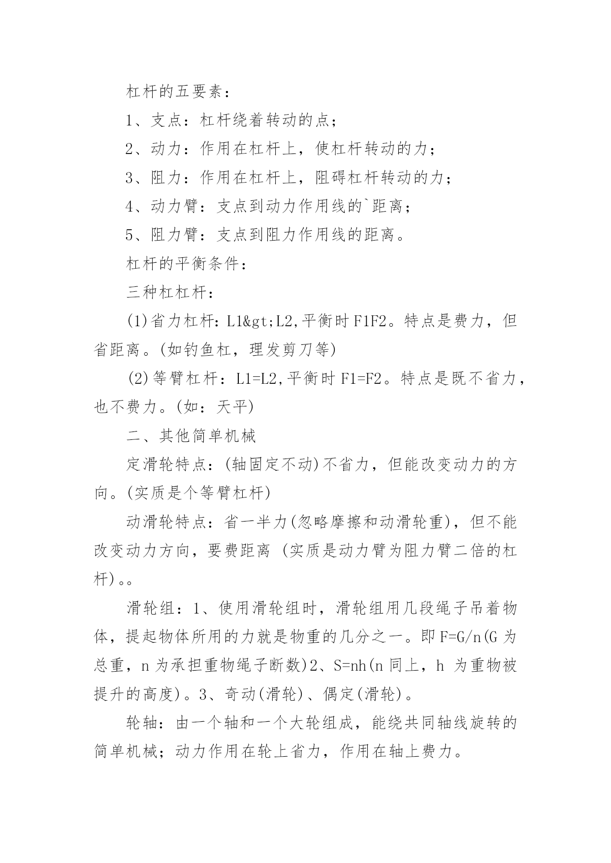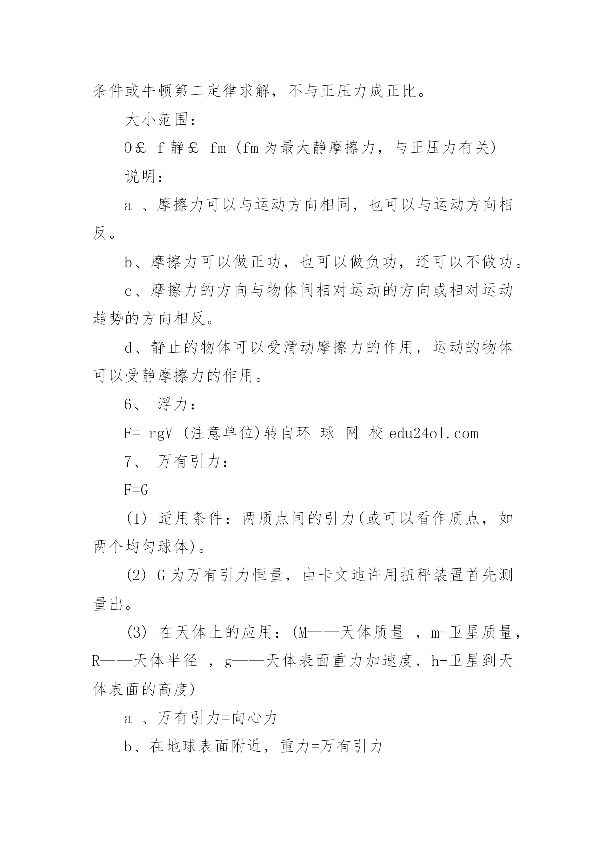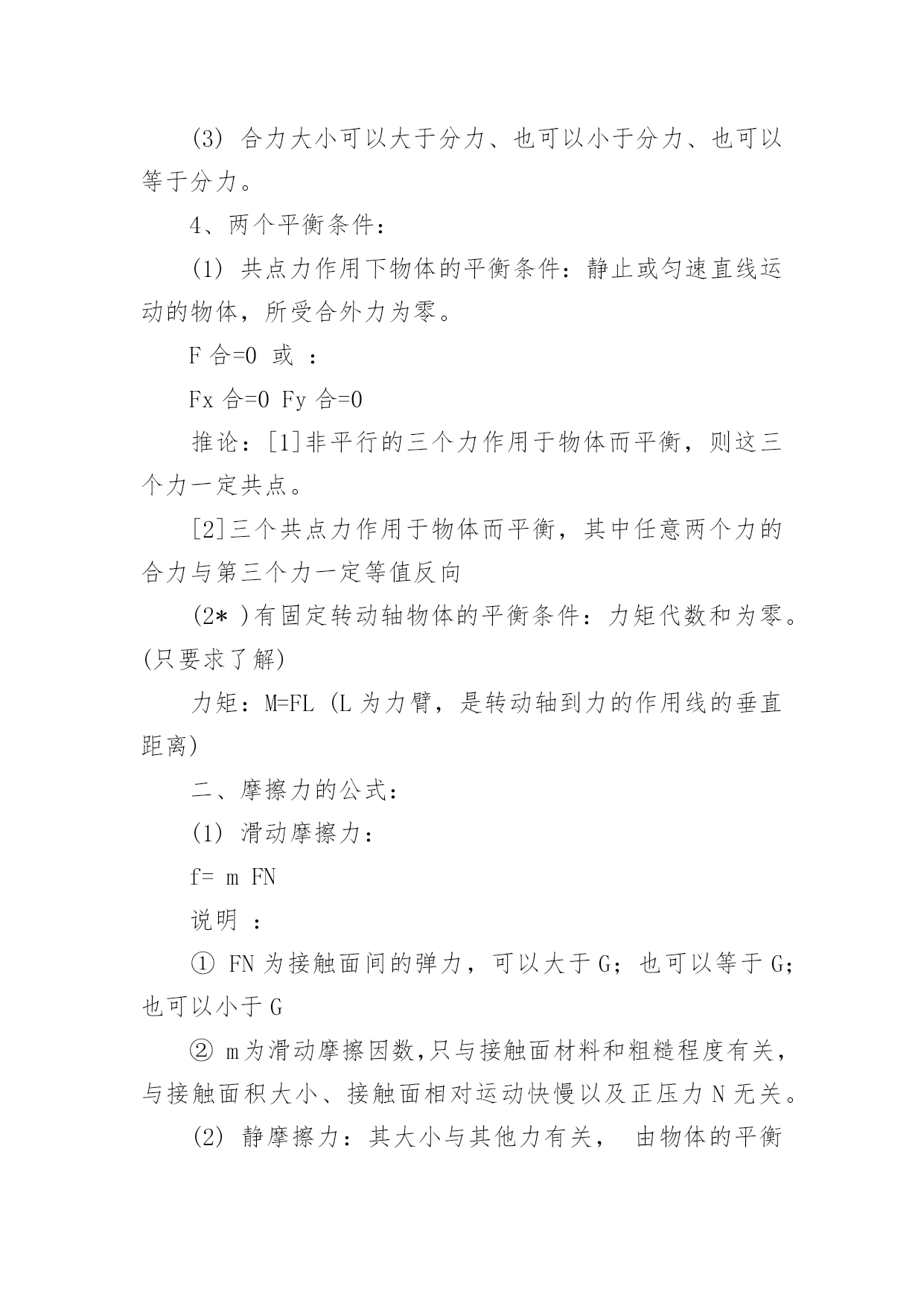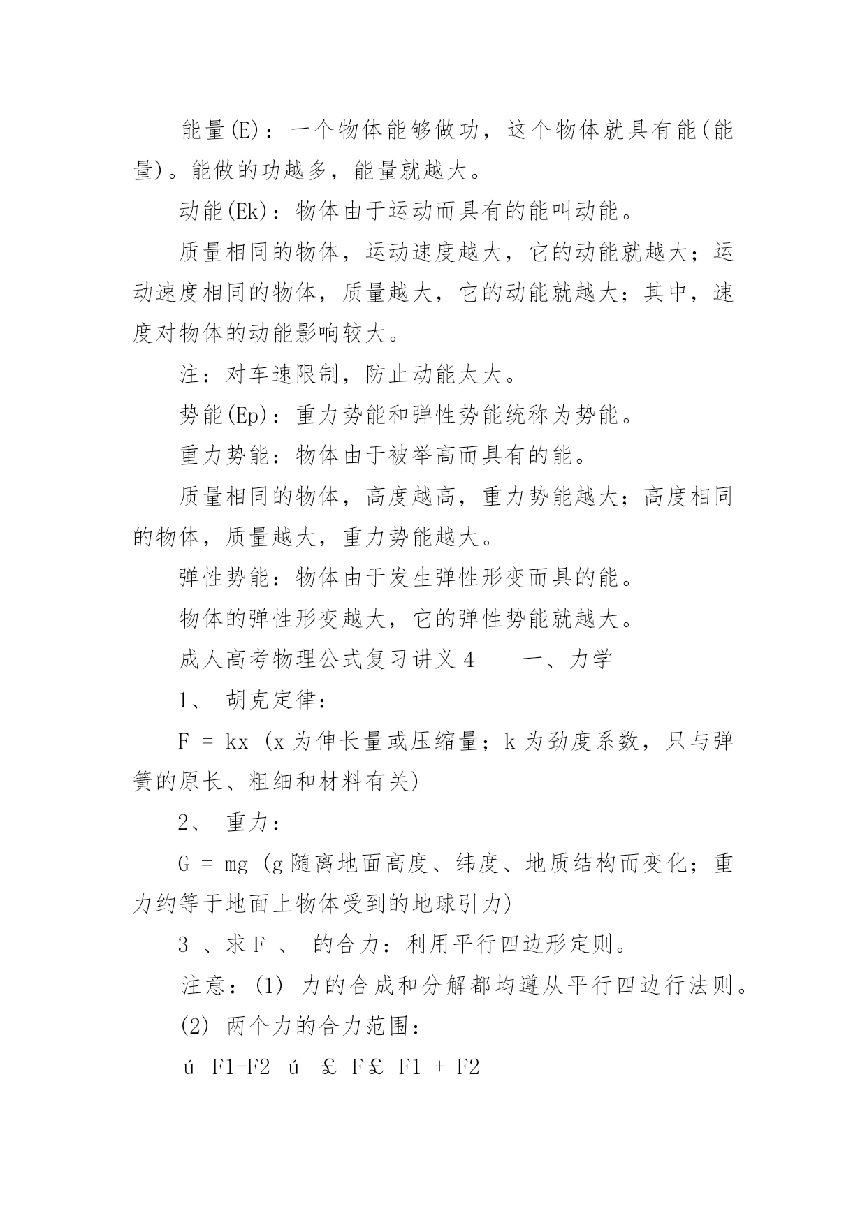成人高考物理公式复习讲义2022成人高考物理公式复习讲义物理公式是考好物理考试的基础,因此我们在成考物理考试前应该复习好相应的复习。那么关于成人高考物理公式复习讲义有哪些呢?下面百分网小编为大家整理的成人高考物理公式复习讲义,希望大家喜欢。成人高考物理公式复习讲义1气体的性质公式总结1.气体的状态参量:温度:宏观上,物体的冷热程度;微观上,物体内部分子无规则运动的剧烈程度的标志热力学温度与摄氏温度关系:T=t+273{T:热力学温度(K),t:摄氏温度(℃)}体积V:气体分子所能占据的空间,单位换算:1m3=103L=106mL压强p:单位面积上,大量气体分子频繁撞击器壁而产生持续、均匀的压力,标准大气压:1atm=1.013×105Pa=76cmHg(1Pa=1N/m2)2.气体分子运动的特点:分子间空隙大;除了碰撞的瞬间外,相互作用力微弱;分子运动速率很大3.理想气体的状态方程:p1V1/T1=p2V2/T2{PV/T=恒量,T为热力学温度(K)}注:(1)理想气体的内能与理想气体的体积无关,与温度和物质的量有关;(2)公式3成立条件均为一定质量的理想气体,使用公式时要注意温度的单位,t为摄氏温度(℃),而T为热力学温度(K)。运动和力公式总结1.牛顿第一运动定律(惯性定律):物体具有惯性,总保持匀速直线运动状态或静止状态,直到有外力迫使它改变这种状态为止2.牛顿第二运动定律:F合=ma或a=F合/ma{由合外力决定,与合外力方向一致}3.牛顿第三运动定律:F=-F′{负号表示方向相反,F、F′各自作用在对方,平衡力与作用力反作用力区别,实际应用:反冲运动}4.共点力的平衡F合=0,推广{正交分解法、三力汇交原理}5.超重:FN>G,失重:FN6.牛顿运动定律的适用条件:适用于解决低速运动问题,适用于宏观物体,不适用于处理高速问题,不适用于微观粒子注:平衡状态是指物体处于静止或匀速直线状态,或者是匀速转动。力的合成与分解公式总结1.同一直线上力的合成同向:F=F1+F2,反向:F=F1-F2(F1>F2)2.互成角度力的合成:F=(F12+F22+2F1F2cosα)1/2(余弦定理)F1⊥F2时:F=(F12+F22)1/23.合力大小范围:|F1-F2|≤F≤|F1+F2|4.力的正交分解:Fx=Fcosβ,Fy=Fsinβ(β为合力与x轴之间的夹角tgβ=Fy/Fx)注:(1)力(矢量)的合成与分解遵循平行四边形定则;(2)合力与分力的关系是等效替代关系,可用合力替代分力的共同作用,反之也成立;(3)除公式法外,也可用作图法求解,此时要选择标度,严格作图;(4)F1与F2的值一定时,F1与F2的夹角(α角)越大,合力越小;(5)同一直线上力的合成,可沿直线取正方向,用正负号表示力的方向,化简为代数运算。常见的力公式总结1.重力G=mg(方向竖直向下,g=9.8m/s2≈10m/s2,作用点在重心,适用于地球表面附近)2.胡克定律F=kx{方向沿恢复形变方向,k:劲度系数(N/m),x:形变量(m)}3.滑动摩擦力F=μFN{与物体相对运动方向相反,μ:摩擦因数,FN:正压力(N)}4.静摩擦力0≤f静≤fm(与物体相对运动趋势方向相反,fm为最大静摩擦力)5.万有引力F=Gm1m2/r2(G=6.67×10-11Nm2/kg2,方向在它们的连线上)6.静电力F=kQ1Q2/r2(k=9.0×109Nm2/C2,方向在它们的连线上)7.电场力F=Eq(E:场强N/C,q:电量C,正电荷受的电场力与场强方向相同)8.安培力F=BILsinθ(θ为B与L的夹角,当L⊥B时:F=BIL,B//L时:F=0)9.洛仑兹力f=qVBsinθ(θ为B与V的夹角,当V⊥B时:f=qVB,V//B时:f=0)注:(1)劲度系数k由弹簧自身决定;(2)摩擦因数μ与压力大小及接触面积大小无关,由接触面材料特性与表面状况等决定;(3)fm略大于μFN,一般视为fm≈μFN;(4)其它相关内容:静摩擦力(大小、方向);(5)物理量符号及单位B:磁感强度(T),L:有效长度(m),I:电流强度(A),V:带电粒子速度(m/s),q:带电粒子(带电体)电量(C);(6)安培力与洛仑兹力方向均用左手定则判定。成人高考物理公式复习讲义2一、杠杆杠杆:一根硬棒,在力的作用下能绕着固定点转动,这根硬棒叫杠杆。杠杆的五要素:1、支点:杠杆绕着转动的点;2、动力:作用在杠杆上,使杠杆转动的力;3、阻力:作用在杠杆上,阻碍杠杆转动的力;4、动力臂:支点到动力作用线的`距离;5、阻力臂:支点到阻力作用线的距离。杠杆的平衡条件:三种杠杠杆:(1)省力杠杆:L1>L2,平衡时F1F2。特点是费力,但省距离。(如钓鱼杠,理发剪刀等)(2)等臂杠杆