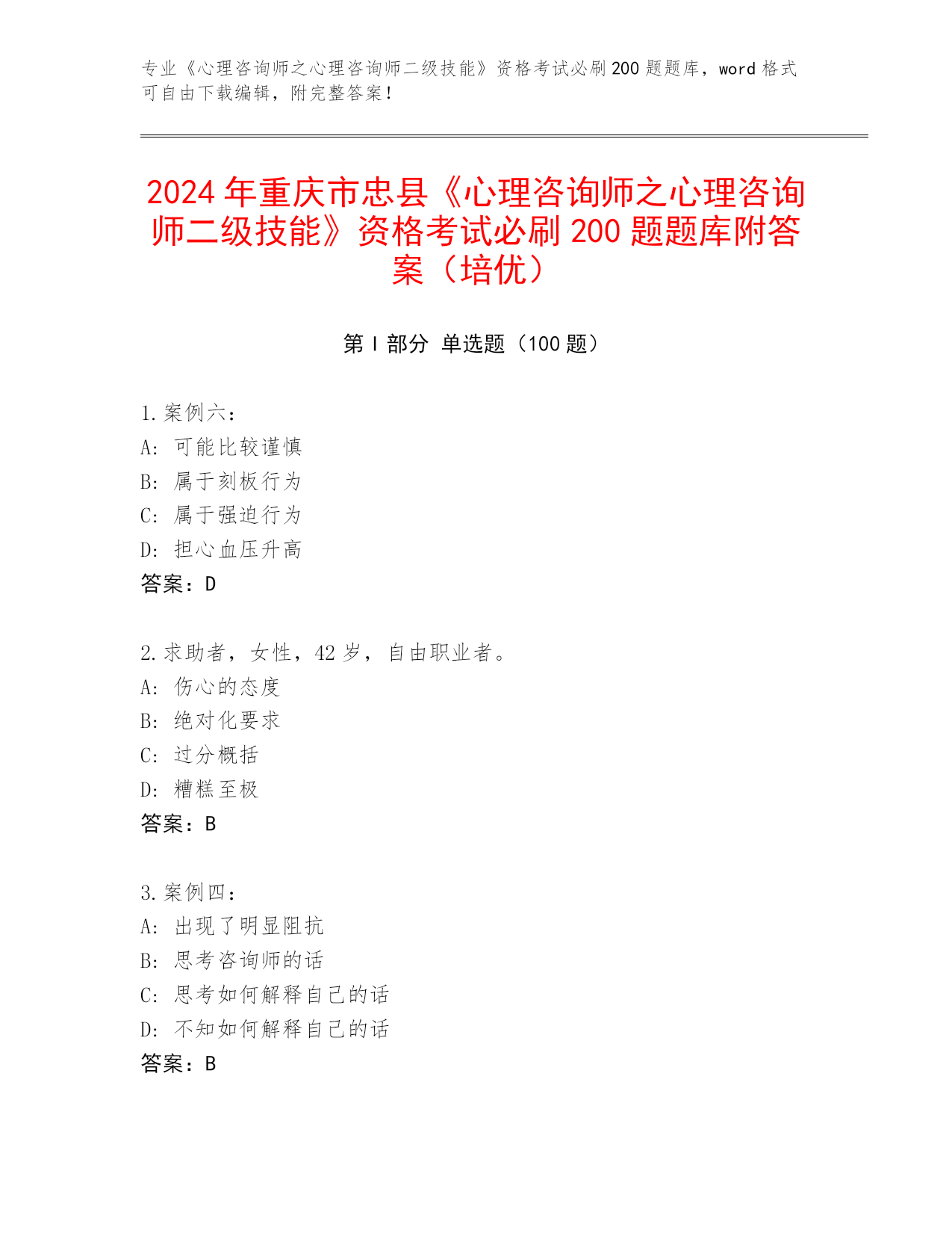 2024年重庆市忠县《心理咨询师之心理咨询师二级技能》资格考试必背200题内部题库【培优A卷】