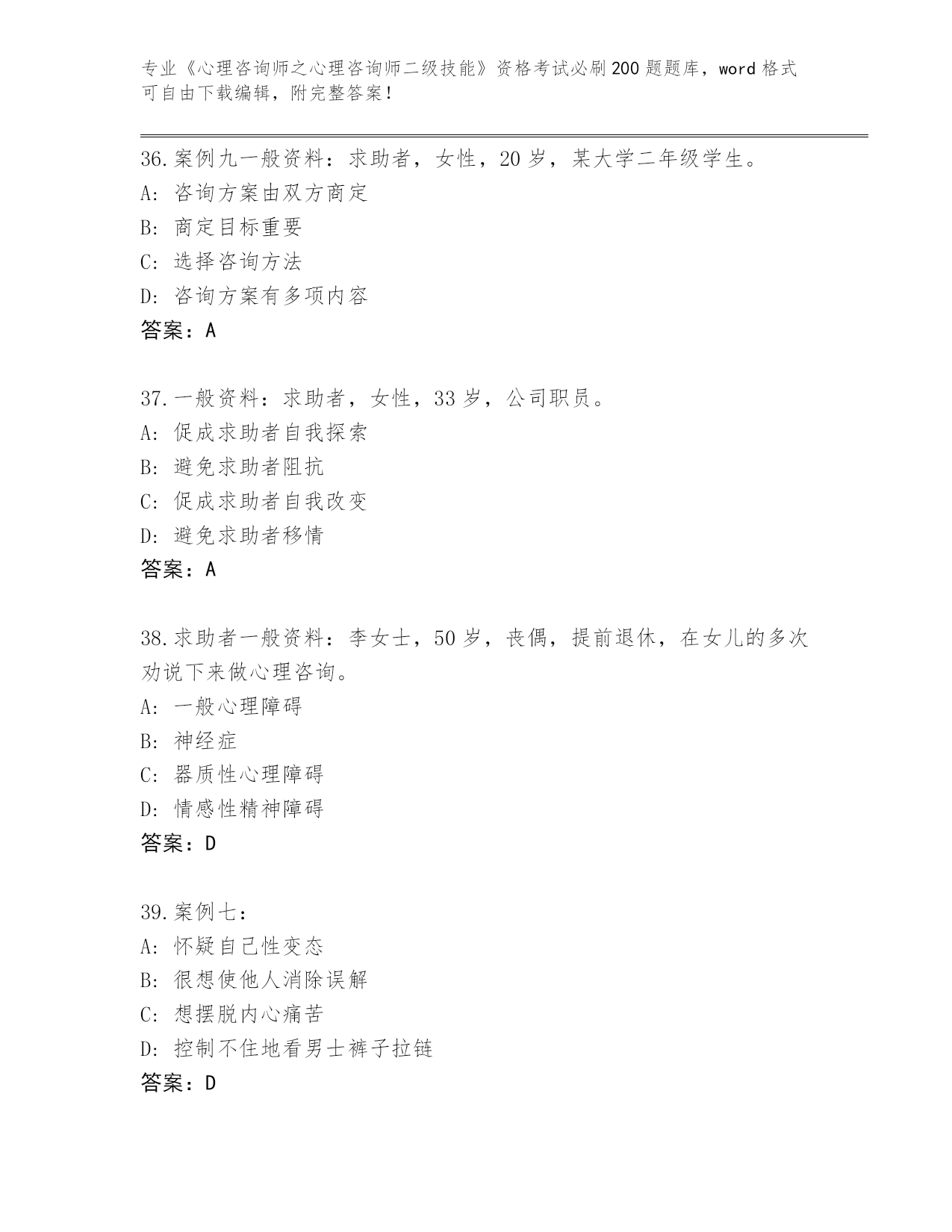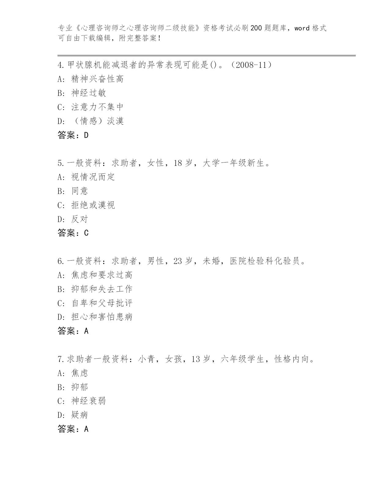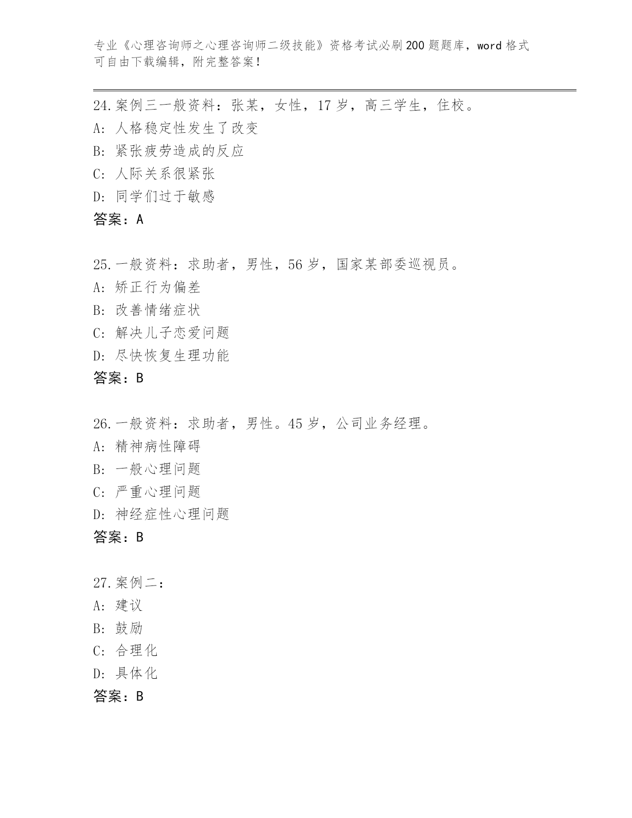 重庆市忠县2024年《心理咨询师之心理咨询师二级技能》资格考试必刷200题真题及答案【全国使用】