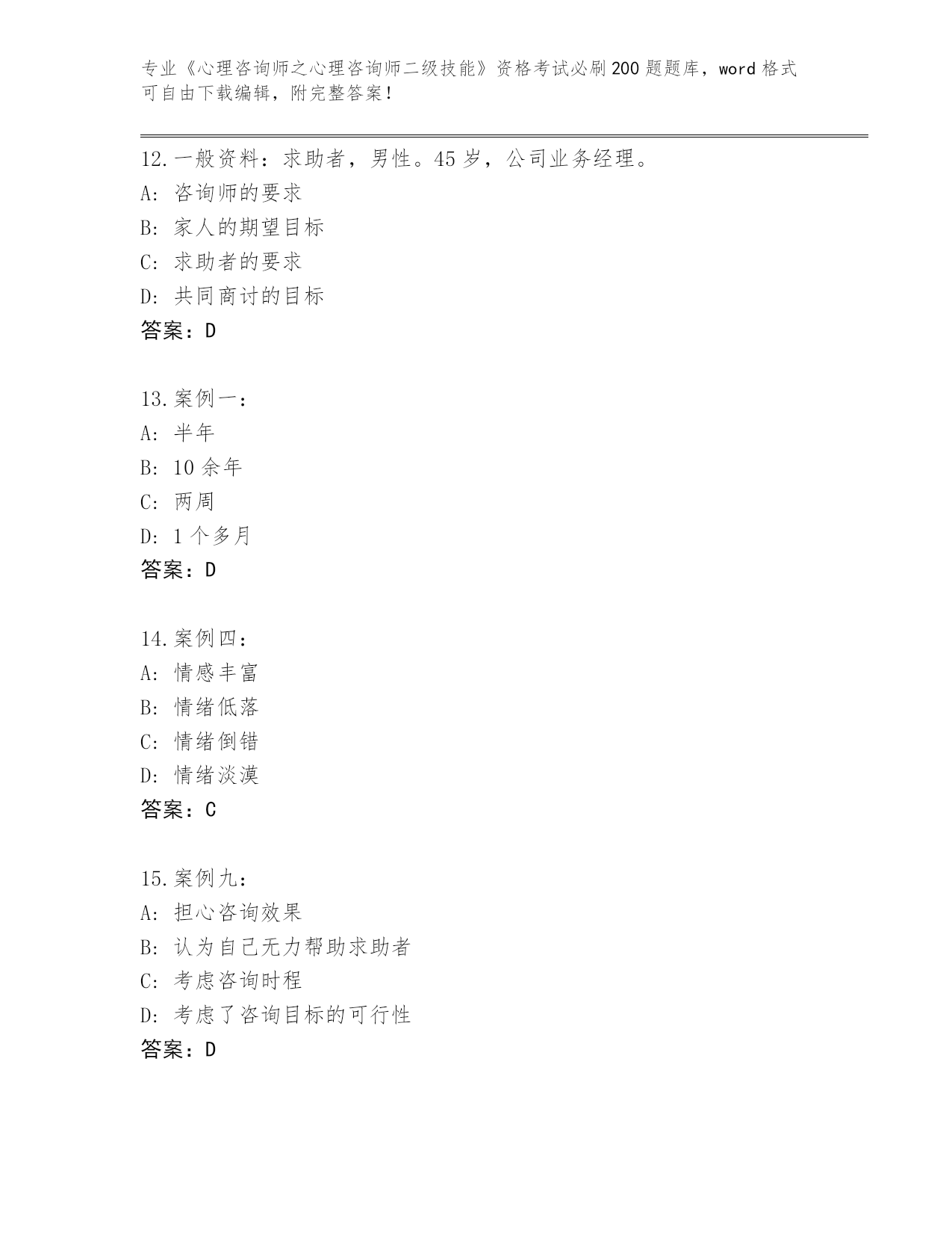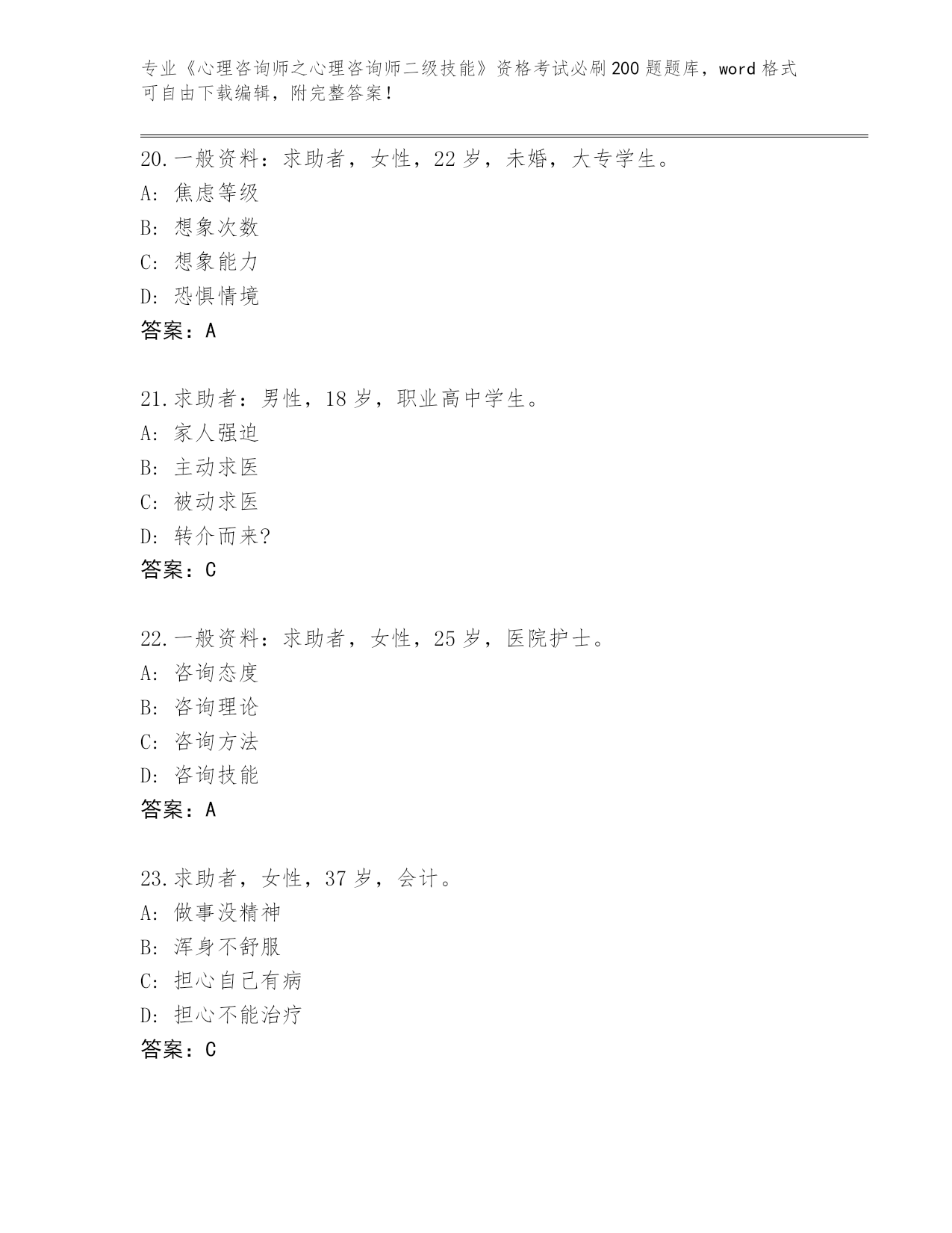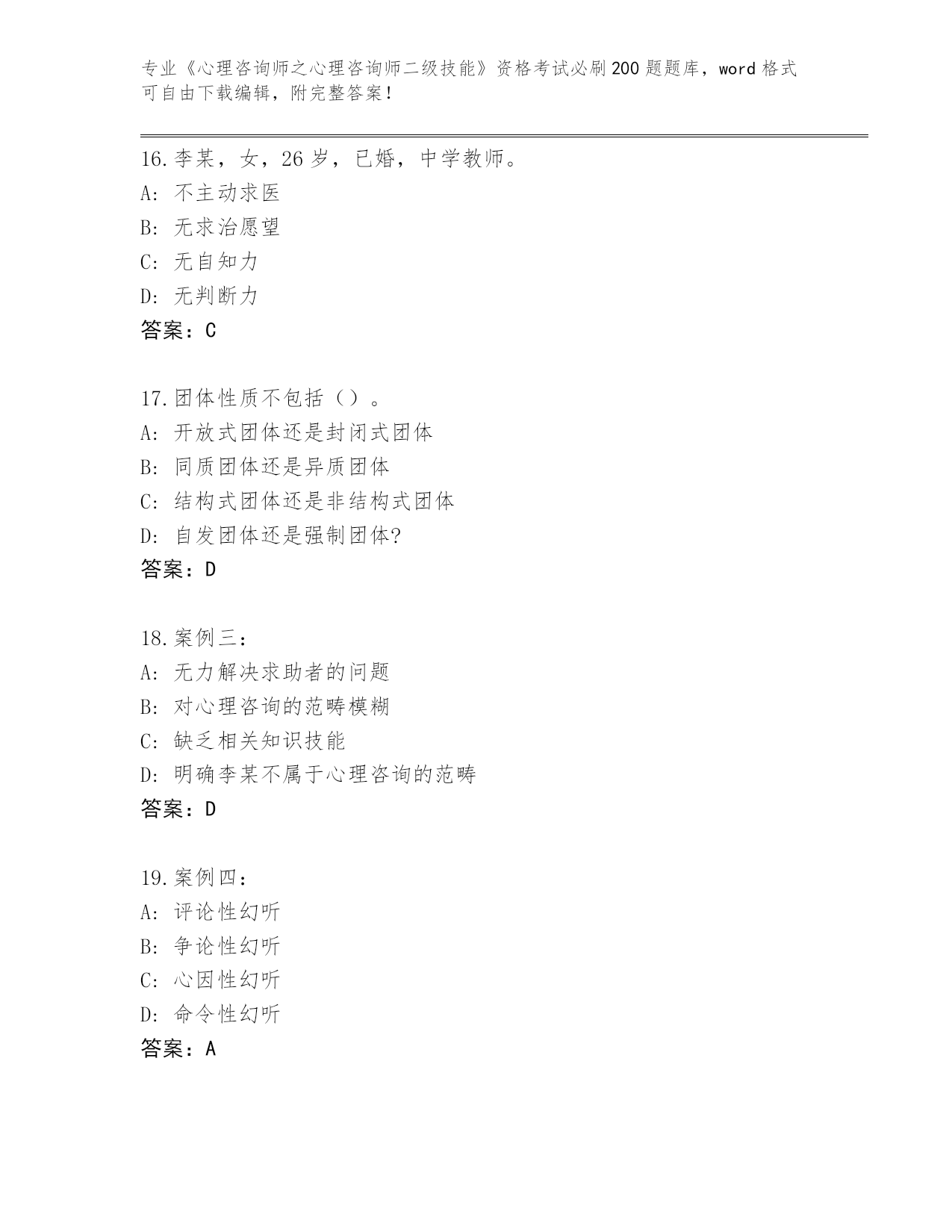 重庆市忠县整理《心理咨询师之心理咨询师二级技能》资格考试必背200题真题附参考答案(名师推荐)