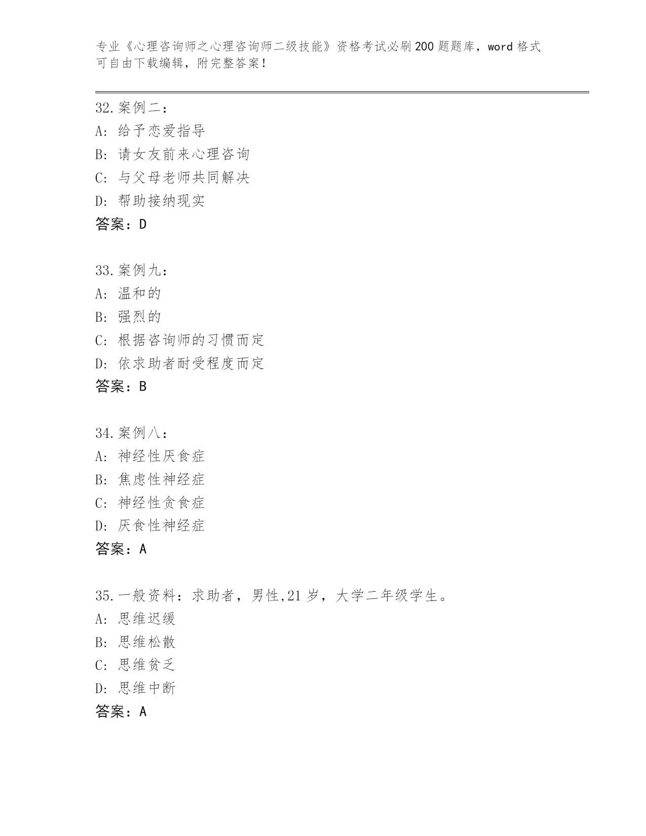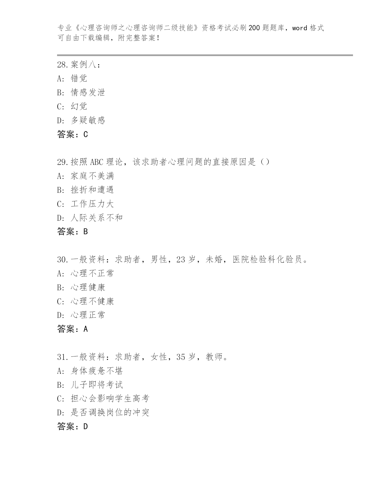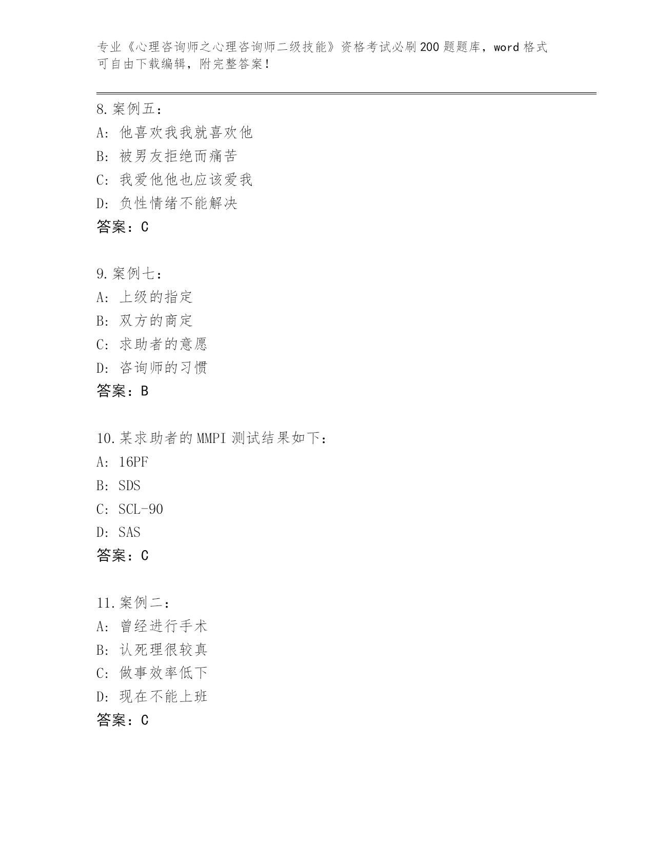 重庆市忠县整理《心理咨询师之心理咨询师二级技能》资格考试必背200题真题附参考答案(名师推荐)