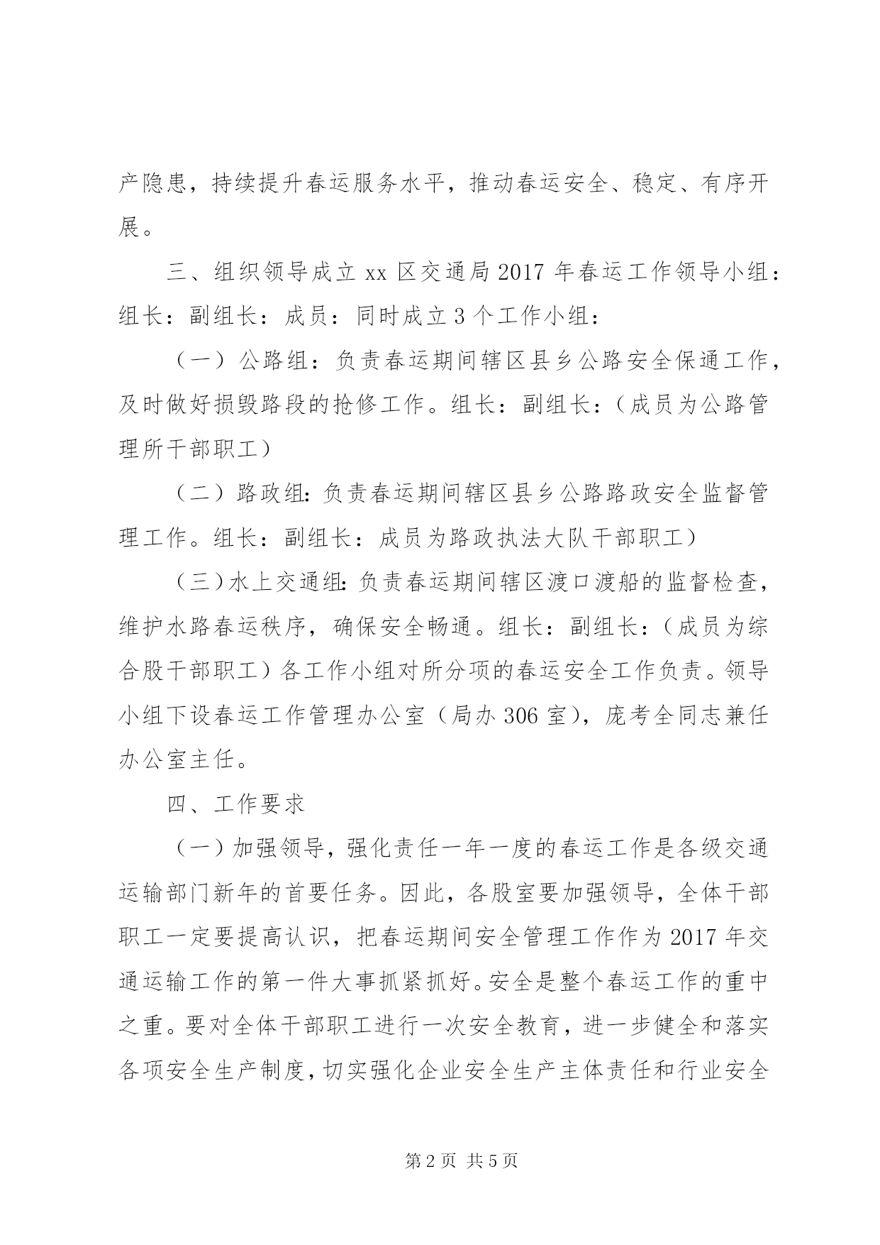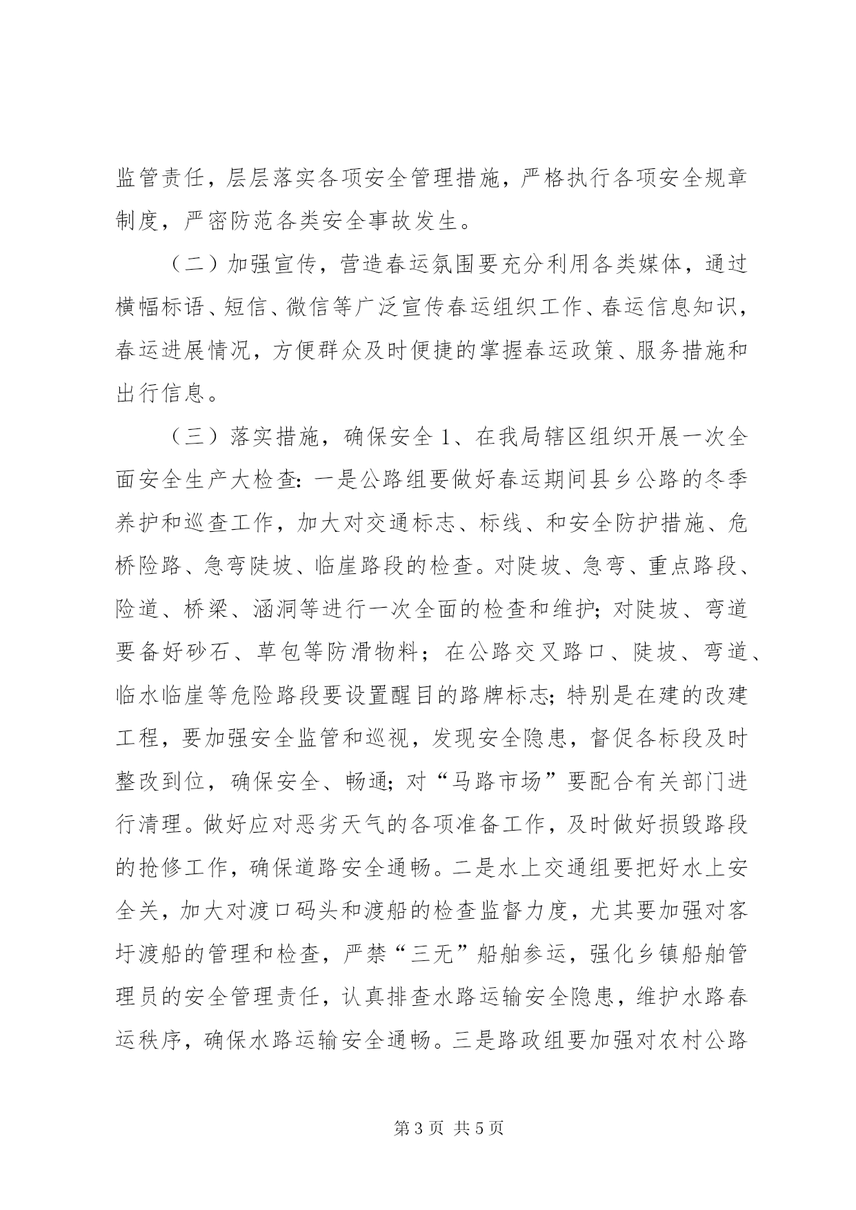 第PAGE\*Arabic\*MERGEFORMAT5页共NUMPAGES\*MERGEFORMAT5页交通局XX年春运工作方案2017年春运从1月13日开始至2月21日止,为期40天。为确保人民群众生命财产安全,严防各类事故发生,根据区政府和市交通运输局的要求,经局党组研究决定,特制定xx区交通局2017年春运工作方案如下:一、指导思想按照《交通运输部关于开展2017年春运检查工作的通知》(x办运函〔2016〕x号、《xx区交通运输厅关于开展2017年春运检查工作的通知》(x交明电〔2017〕x号以及《XX市交通运输局关于开展2017年春运检查工作的通知》(x交运输〔2017〕x号)等文件的要求,结合2017年1月9日XX市春运工作会议精神,坚持安全第一、以人为本的总体要求,狠抓安全生产管理,提升运输服务质量,圆满完成2017年xx区交通局春运工作各项任务。二、工作目标按照文件要求,从安全工作部署和落实、便民服务、运输市场监管、运输组织调度、公路水路保通、应急运输组织等六个方面情况内容,统筹组织开展2017年xx区交通局春运工作,严格落实各项安全生产管理制度,紧紧围绕运输安全生产主线,以提高运输服务品质,查隐患、找问题、促整改为目标,通过自检自查、重点检查等形式,落实安全生产责任主体,全面排查安全生产隐患,持续提升春运服务水平,推动春运安全、稳定、有序开展。三、组织领导成立xx区交通局2017年春运工作领导小组:组长:副组长:成员:同时成立3个工作小组:(一)公路组:负责春运期间辖区县乡公路安全保通工作,及时做好损毁路段的抢修工作。组长:副组长:(成员为公路管理所干部职工)(二)路政组:负责春运期间辖区县乡公路路政安全监督管理工作。组长:副组长:成员为路政执法大队干部职工)(三)水上交通组:负责春运期间辖区渡口渡船的监督检查,维护水路春运秩序,确保安全畅通。组长:副组长:(成员为综合股干部职工)各工作小组对所分项的春运安全工作负责。领导小组下设春运工作管理办公室(局办306室),庞考全同志兼任办公室主任。四、工作要求(一)加强领导,强化责任一年一度的春运工作是各级交通运输部门新年的首要任务。因此,各股室要加强领导,全体干部职工一定要提高认识,把春运期间安全管理工作作为2017年交通运输工作的第一件大事抓紧抓好。安全是整个春运工作的重中之重。要对全体干部职工进行一次安全教育,进一步健全和落实各项安全生产制度,切实强化企业安全生产主体责任和行业安全监管责任,层层落实各项安全管理措施,严格执行各项安全规章制度,严密防范各类安全事故发生。(二)加强宣传,营造春运氛围要充分利用各类媒体,通过横幅标语、短信、微信等广泛宣传春运组织工作、春运信息知识,春运进展情况,方便群众及时便捷的掌握春运政策、服务措施和出行信息。(三)落实措施,确保安全1、在我局辖区组织开展一次全面安全生产大检查:一是公路组要做好春运期间县乡公路的冬季养护和巡查工作,加大对交通标志、标线、和安全防护措施、危桥险路、急弯陡坡、临崖路段的检查。对陡坡、急弯、重点路段、险道、桥梁、涵洞等进行一次全面的检查和维护;对陡坡、弯道要备好砂石、草包等防滑物料;在公路交叉路口、陡坡、弯道、临水临崖等危险路段要设置醒目的路牌标志;特别是在建的改建工程,要加强安全监管和巡视,发现安全隐患,督促各标段及时整改到位,确保安全、畅通;对“马路市场”要配合有关部门进行清理。做好应对恶劣天气的各项准备工作,及时做好损毁路段的抢修工作,确保道路安全通畅。二是水上交通组要把好水上安全关,加大对渡口码头和渡船的检查监督力度,尤其要加强对客圩渡船的管理和检查,严禁“三无”船舶参运,强化乡镇船舶管理员的安全管理责任,认真排查水路运输安全隐患,维护水路春运秩序,确保水路运输安全通畅。三是路政组要加强对农村公路路况的巡查监管工作,对影响行车安全的路段与桥梁及时采取防控措施,确保车辆及人员的安全,并协调相关部门对发现的威胁行车安全的问题及时解决,对在公路及公路用地范围内施工、修建建筑、摆摊设点、堆放物品、倾倒垃圾、设置障碍和影响公路畅通的违法行为,依法予以处罚、取缔。满足广大农村群众走亲访友出行需求。四是春运期间从局综合股和路政大队抽调执法人员,配合上级交通运输主管部门开展春运期间客货道路运输企业和客货水路运输企业的监督管理检查。五是各股室要组织对本部门进行一次全面的安全检查,防火、防盗、防触电、防交通事故和食物中毒,认真做好干部职工的思想工作,确保稳定。2、春运期间从局综合股和路政大队抽调执法人员,配合上级交通运输主管部门和xx区委区政府开展“冬日暖阳”活动,协助有关部门和志愿者设立春运道路休息服务点,通过为春运期间广东回乡的摩托大军提供免费热水、快食面、热粥姜茶,及时提供天气查询服务