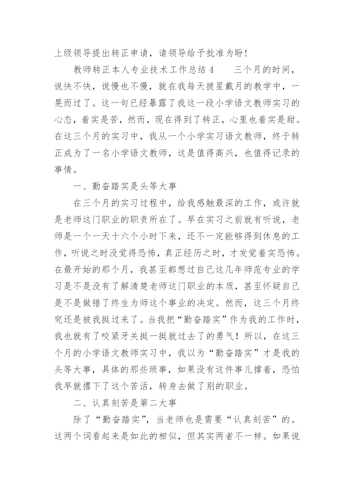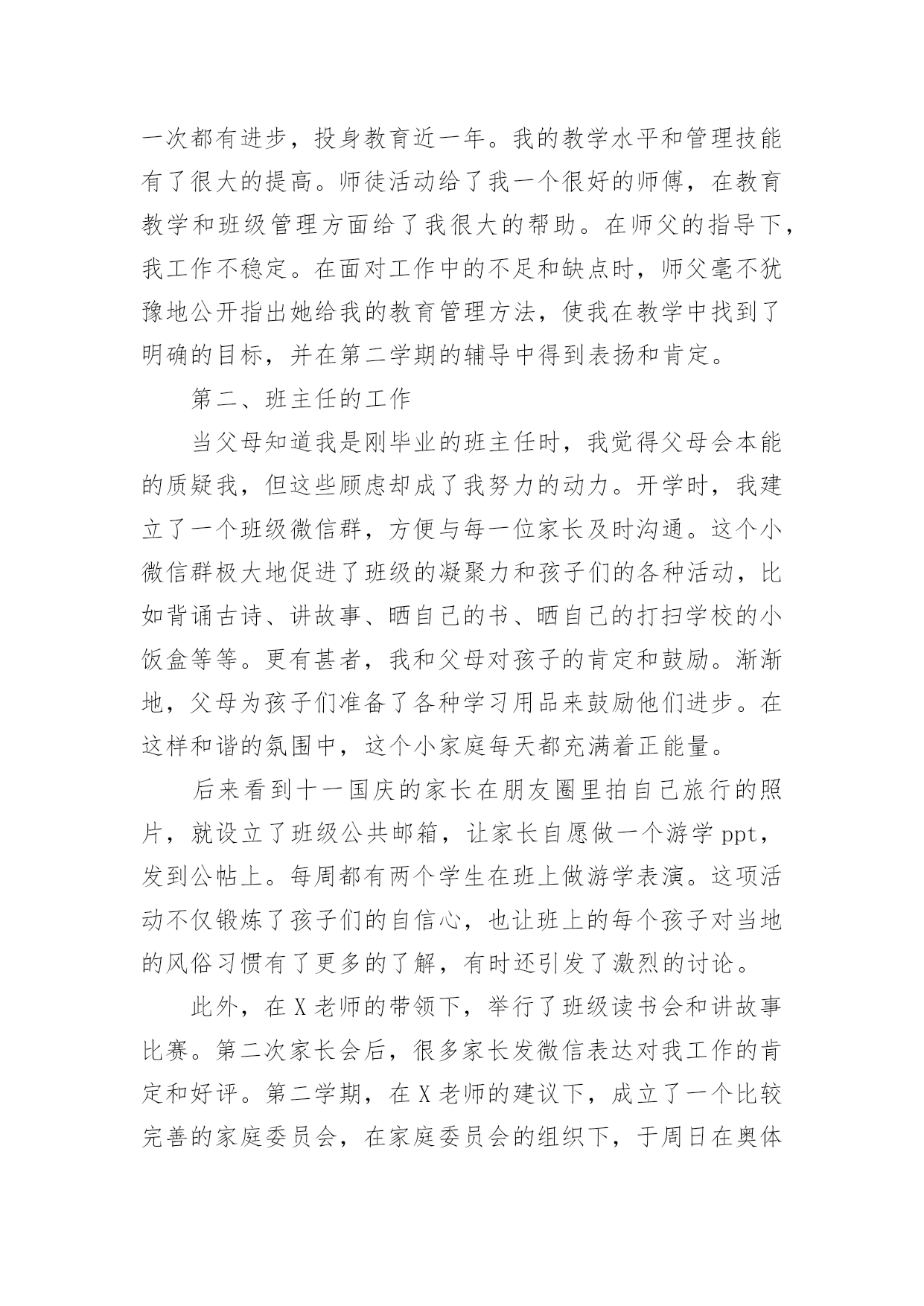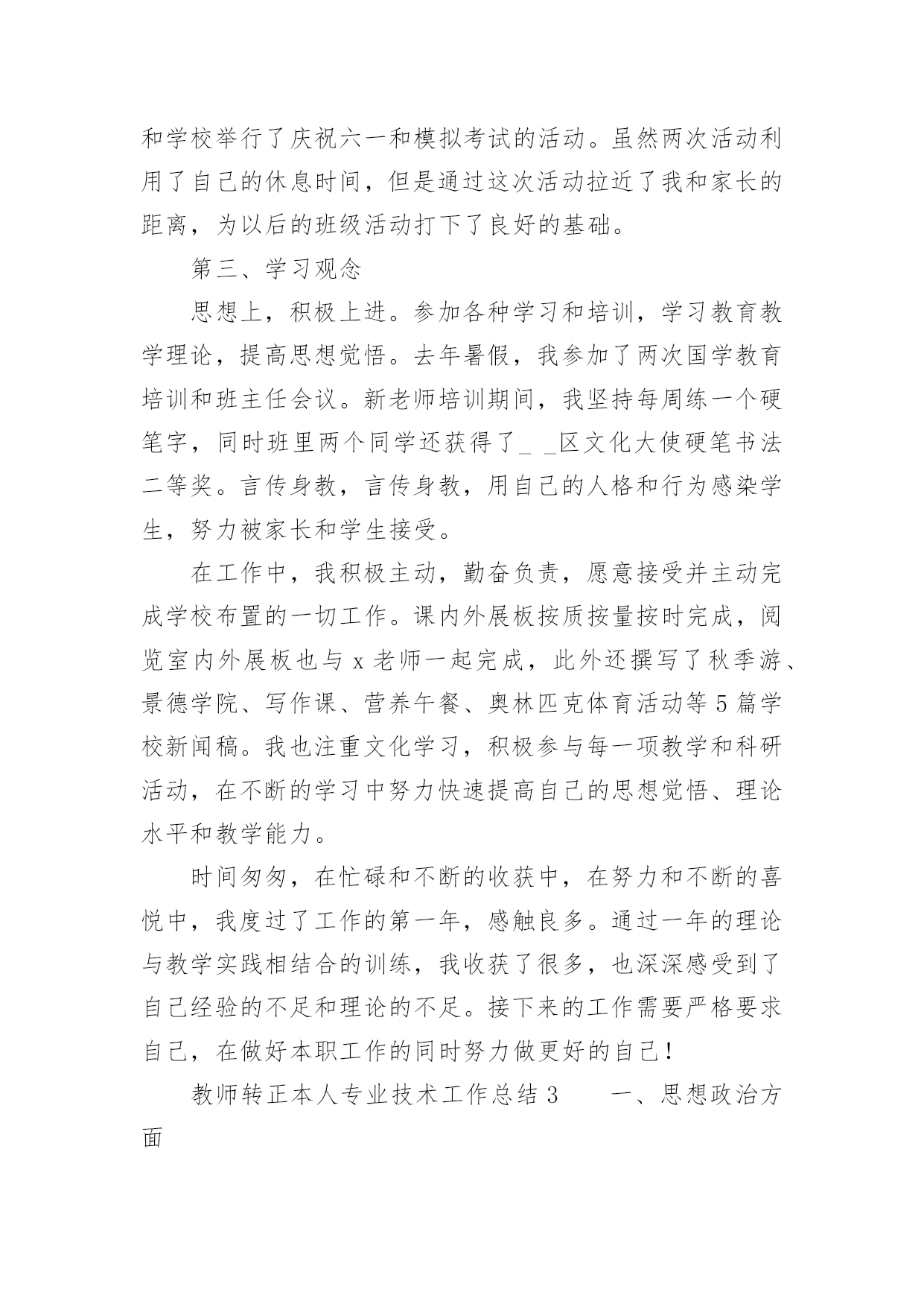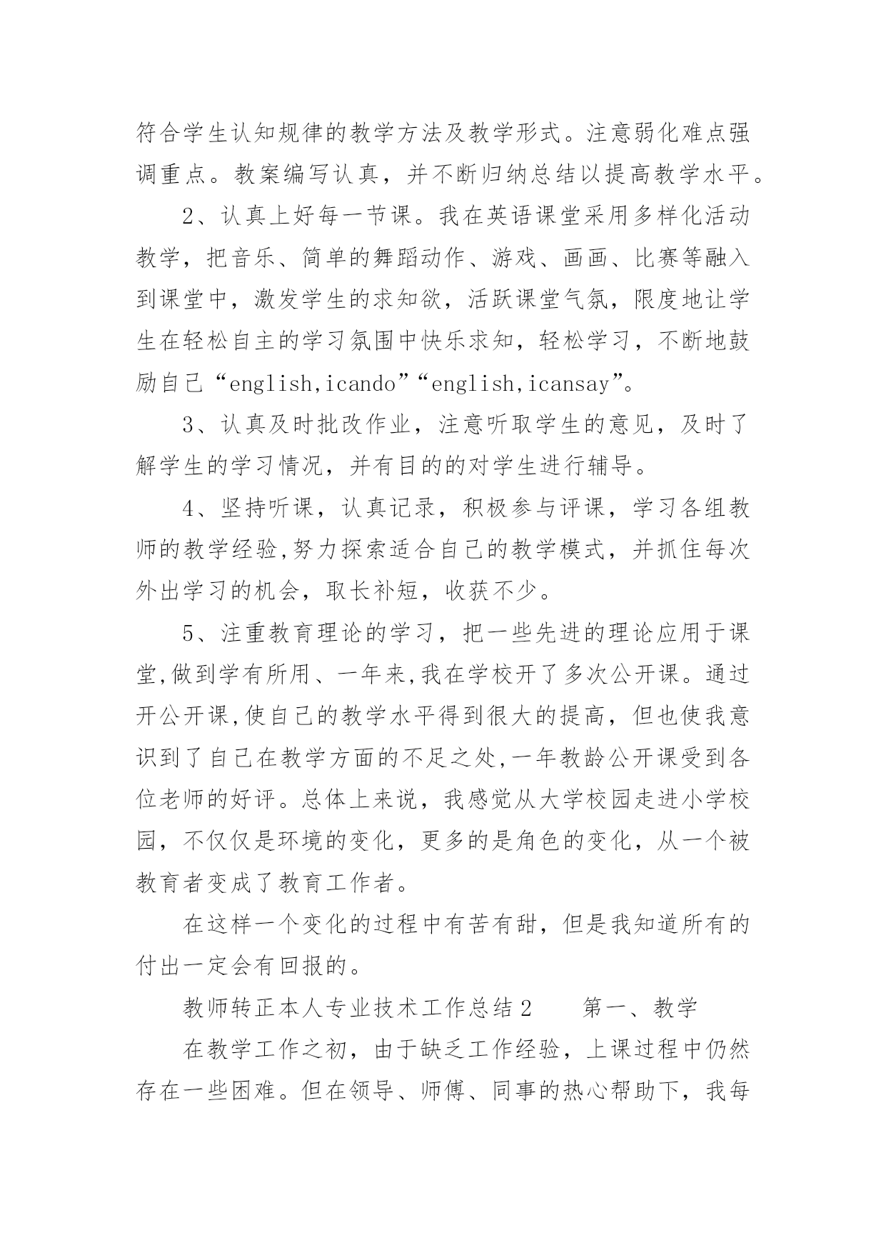 教师转正本人专业技术工作总结教师转正本人专业技术工作总结(精选18篇)时间过得真快,一段时间的工作已经告一段落了,经过过去这段时间的积累和沉淀,我们已然有了很大的提升和改变,需要认真地为此写一份工作总结。你还在为写工作总结而苦恼吗?以下是小编帮大家整理的教师转正本人专业技术工作总结(精选18篇),希望能够帮助到大家。教师转正本人专业技术工作总结1一、师德表现平时积极参加全校教职工大会,认真学习学校下达的上级文件,关心国内外大事,注重政治理论的学习,同时配合组里搞好教研活动。每周按时参加升旗仪式,从不缺勤。服从安排,人际关系融洽。另一方面,教师的言行,学生极易照样接受,很少去鉴别,因而,我本着要对学生的一生负责,认识到必须要正视自己的言行。以身作则,才能为人师表。要求学生做到的,自己必须先做到。如果言行脱节,说做不一,或者是要求学生这样做,自己却那样做,只能引起学生反感,造成恶劣影响。我坚信拥有健康的人格品位,才能在学生中树立威信、得到敬重,起到榜样作用。二、学校班主任工作学校领导出于对我的磨炼与培养,让我一个刚毕业的学生一进校就做五年级的学校班主任。通过向其他优秀学校班主任的学习,我认识到教育上单方面的严和爱都是不行的。学校班主任最主要的是要找到严和爱的切合点。在工作中注意:1、制定切实有效的班规,培养班委自主管理的能力。鼓励干部大胆工作,指点他们工作方法的同时,要更严格要求干部个人在知识、能力上取得更大进步,在纪律上以身作则,力求从各方面给全班起到模范带头作用。2、充分利用课间谈话和班会课。抓住和学生们沟通的时间,了解班级情况和学生们的心理状态,有的放矢的进行教育和解决问题。或讲座、或讨论、或给他们讲充满人生哲理的故事传说的班会课是我对学生进行思想道德建设的有效阵地。3、关怀后进生、行为偏差生。后进生、行为偏差生是有着强大的自卑感难教育的一批。对此,我拿出了极大的耐心,通过家访和谈话等形式逐步使他们有所转变。现在我班已经逐步向着一个既有着严格的制度,又充满团结向上风气的集体靠拢。学校班主任工作精心而又繁琐,是在广阔的心灵世界中播种耕耘的职业,在今后的教育生涯中,我将用我的青春继续耕耘这片园地。三、英语教学工作我所任教的是二年级和六年级共五个班的英语教学工作。面对这两个有一定年龄差距的年段,我根据他们各自不同的特征因材施教,着重注意做到以下几点:1、深入细致的备好每一节课。在备课中,我认真研究教材,力求准确把握重点,难点,并注重参阅各种资料,制定符合学生认知规律的教学方法及教学形式。注意弱化难点强调重点。教案编写认真,并不断归纳总结以提高教学水平。2、认真上好每一节课。我在英语课堂采用多样化活动教学,把音乐、简单的舞蹈动作、游戏、画画、比赛等融入到课堂中,激发学生的求知欲,活跃课堂气氛,限度地让学生在轻松自主的学习氛围中快乐求知,轻松学习,不断地鼓励自己“english,icando”“english,icansay”。3、认真及时批改作业,注意听取学生的意见,及时了解学生的学习情况,并有目的的对学生进行辅导。4、坚持听课,认真记录,积极参与评课,学习各组教师的教学经验,努力探索适合自己的教学模式,并抓住每次外出学习的机会,取长补短,收获不少。5、注重教育理论的学习,把一些先进的理论应用于课堂,做到学有所用、一年来,我在学校开了多次公开课。通过开公开课,使自己的教学水平得到很大的提高,但也使我意识到了自己在教学方面的不足之处,一年教龄公开课受到各位老师的好评。总体上来说,我感觉从大学校园走进小学校园,不仅仅是环境的变化,更多的是角色的变化,从一个被教育者变成了教育工作者。在这样一个变化的过程中有苦有甜,但是我知道所有的付出一定会有回报的。教师转正本人专业技术工作总结2第一、教学在教学工作之初,由于缺乏工作经验,上课过程中仍然存在一些困难。但在领导、师傅、同事的热心帮助下,我每一次都有进步,投身教育近一年。我的教学水平和管理技能有了很大的提高。师徒活动给了我一个很好的师傅,在教育教学和班级管理方面给了我很大的帮助。在师父的指导下,我工作不稳定。在面对工作中的不足和缺点时,师父毫不犹豫地公开指出她给我的教育管理方法,使我在教学中找到了明确的目标,并在第二学期的辅导中得到表扬和肯定。第二、班主任的工作当父母知道我是刚毕业的班主任时,我觉得父母会本能的质疑我,但这些顾虑却成了我努力的动力。开学时,我建立了一个班级微信群,方便与每一位家长及时沟通。这个小微信群极大地促进了班级的凝聚力和孩子们的各种活动,比如背诵古诗、讲故事、晒自己的书、晒自己的打扫学校的小饭盒等等。更有甚者,我和父母对孩子的肯定和鼓励。渐渐地,父母为孩子们准备了各种学习用品来鼓励他们进步。在这样和谐的氛围中,这个小家庭每天都充满着正能量。后来看到十一国庆的家长在朋友
