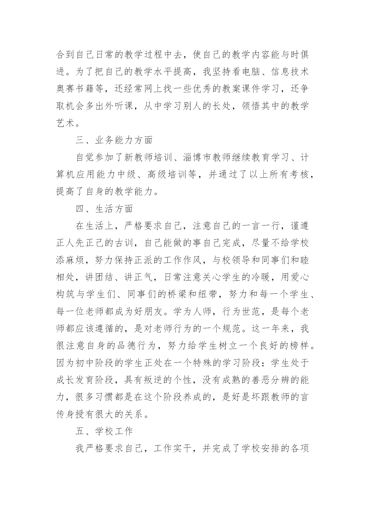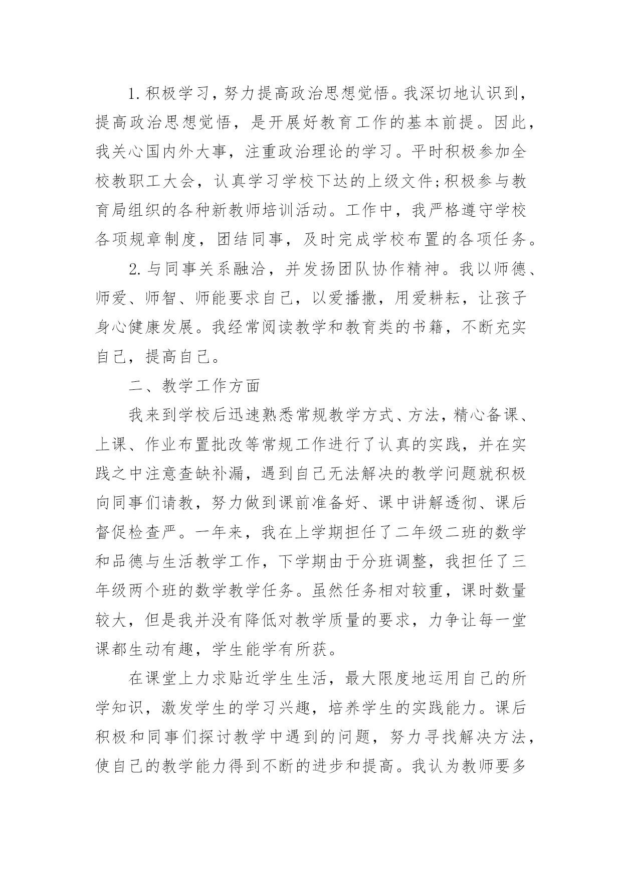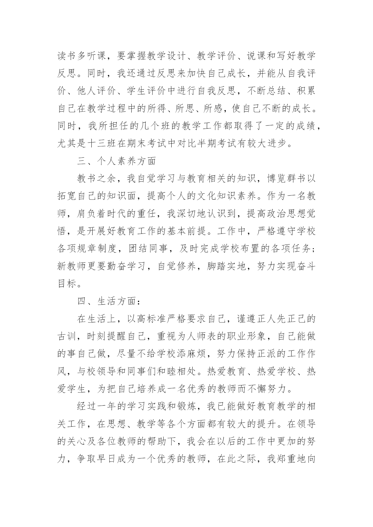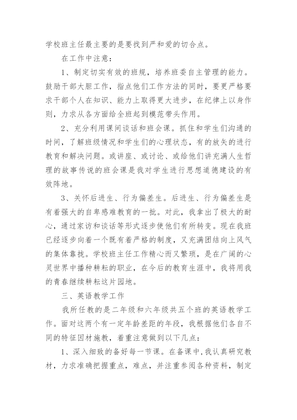 教师转正本人专业技术工作总结教师转正本人专业技术工作总结(精选18篇)时间过得真快,一段时间的工作已经告一段落了,经过过去这段时间的积累和沉淀,我们已然有了很大的提升和改变,需要认真地为此写一份工作总结。你还在为写工作总结而苦恼吗?以下是小编帮大家整理的教师转正本人专业技术工作总结(精选18篇),希望能够帮助到大家。教师转正本人专业技术工作总结1一、师德表现平时积极参加全校教职工大会,认真学习学校下达的上级文件,关心国内外大事,注重政治理论的学习,同时配合组里搞好教研活动。每周按时参加升旗仪式,从不缺勤。服从安排,人际关系融洽。另一方面,教师的言行,学生极易照样接受,很少去鉴别,因而,我本着要对学生的一生负责,认识到必须要正视自己的言行。以身作则,才能为人师表。要求学生做到的,自己必须先做到。如果言行脱节,说做不一,或者是要求学生这样做,自己却那样做,只能引起学生反感,造成恶劣影响。我坚信拥有健康的人格品位,才能在学生中树立威信、得到敬重,起到榜样作用。二、学校班主任工作学校领导出于对我的磨炼与培养,让我一个刚毕业的学生一进校就做五年级的学校班主任。通过向其他优秀学校班主任的学习,我认识到教育上单方面的严和爱都是不行的。学校班主任最主要的是要找到严和爱的切合点。在工作中注意:1、制定切实有效的班规,培养班委自主管理的能力。鼓励干部大胆工作,指点他们工作方法的同时,要更严格要求干部个人在知识、能力上取得更大进步,在纪律上以身作则,力求从各方面给全班起到模范带头作用。2、充分利用课间谈话和班会课。抓住和学生们沟通的时间,了解班级情况和学生们的心理状态,有的放矢的进行教育和解决问题。或讲座、或讨论、或给他们讲充满人生哲理的故事传说的班会课是我对学生进行思想道德建设的有效阵地。3、关怀后进生、行为偏差生。后进生、行为偏差生是有着强大的自卑感难教育的一批。对此,我拿出了极大的耐心,通过家访和谈话等形式逐步使他们有所转变。现在我班已经逐步向着一个既有着严格的制度,又充满团结向上风气的集体靠拢。学校班主任工作精心而又繁琐,是在广阔的心灵世界中播种耕耘的职业,在今后的教育生涯中,我将用我的青春继续耕耘这片园地。三、英语教学工作我所任教的是二年级和六年级共五个班的英语教学工作。面对这两个有一定年龄差距的年段,我根据他们各自不同的特征因材施教,着重注意做到以下几点:1、深入细致的备好每一节课。在备课中,我认真研究教材,力求准确把握重点,难点,并注重参阅各种资料,制定符合学生认知规律的教学方法及教学形式。注意弱化难点强调重点。教案编写认真,并不断归纳总结以提高教学水平。2、认真上好每一节课。我在英语课堂采用多样化活动教学,把音乐、简单的舞蹈动作、游戏、画画、比赛等融入到课堂中,激发学生的求知欲,活跃课堂气氛,限度地让学生在轻松自主的学习氛围中快乐求知,轻松学习,不断地鼓励自己“english,icando”“english,icansay”。3、认真及时批改作业,注意听取学生的意见,及时了解学生的学习情况,并有目的的对学生进行辅导。4、坚持听课,认真记录,积极参与评课,学习各组教师的教学经验,努力探索适合自己的教学模式,并抓住每次外出学习的机会,取长补短,收获不少。5、注重教育理论的学习,把一些先进的理论应用于课堂,做到学有所用、一年来,我在学校开了多次公开课。通过开公开课,使自己的教学水平得到很大的提高,但也使我意识到了自己在教学方面的不足之处,一年教龄公开课受到各位老师的好评。总体上来说,我感觉从大学校园走进小学校园,不仅仅是环境的变化,更多的是角色的变化,从一个被教育者变成了教育工作者。在这样一个变化的过程中有苦有甜,但是我知道所有的付出一定会有回报的。教师转正本人专业技术工作总结2第一、教学在教学工作之初,由于缺乏工作经验,上课过程中仍然存在一些困难。但在领导、师傅、同事的热心帮助下,我每一次都有进步,投身教育近一年。我的教学水平和管理技能有了很大的提高。师徒活动给了我一个很好的师傅,在教育教学和班级管理方面给了我很大的帮助。在师父的指导下,我工作不稳定。在面对工作中的不足和缺点时,师父毫不犹豫地公开指出她给我的教育管理方法,使我在教学中找到了明确的目标,并在第二学期的辅导中得到表扬和肯定。第二、班主任的工作当父母知道我是刚毕业的班主任时,我觉得父母会本能的质疑我,但这些顾虑却成了我努力的动力。开学时,我建立了一个班级微信群,方便与每一位家长及时沟通。这个小微信群极大地促进了班级的凝聚力和孩子们的各种活动,比如背诵古诗、讲故事、晒自己的书、晒自己的打扫学校的小饭盒等等。更有甚者,我和父母对孩子的肯定和鼓励。渐渐地,父母为孩子们准备了各种学习用品来鼓励他们进步。在这样和谐的氛围中,这个小家庭每天都充满着正能量。后来看到十一国庆的家长在朋友