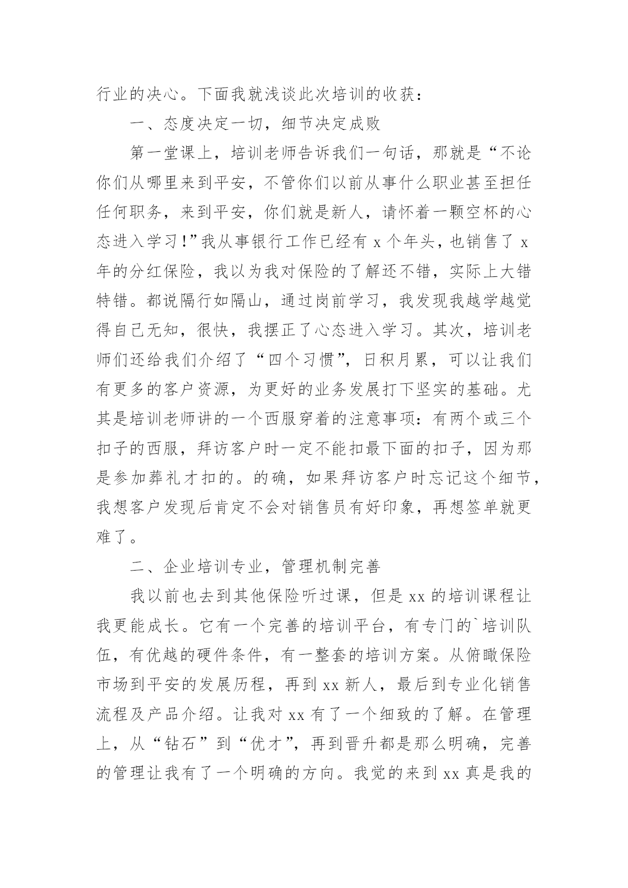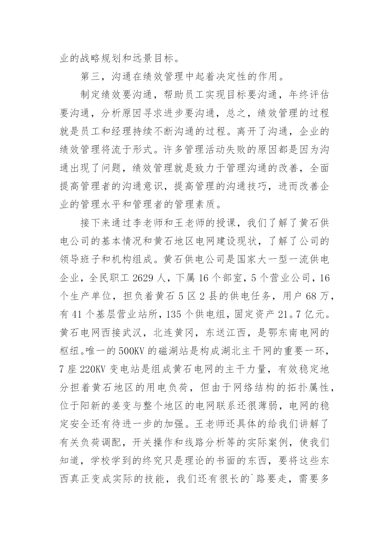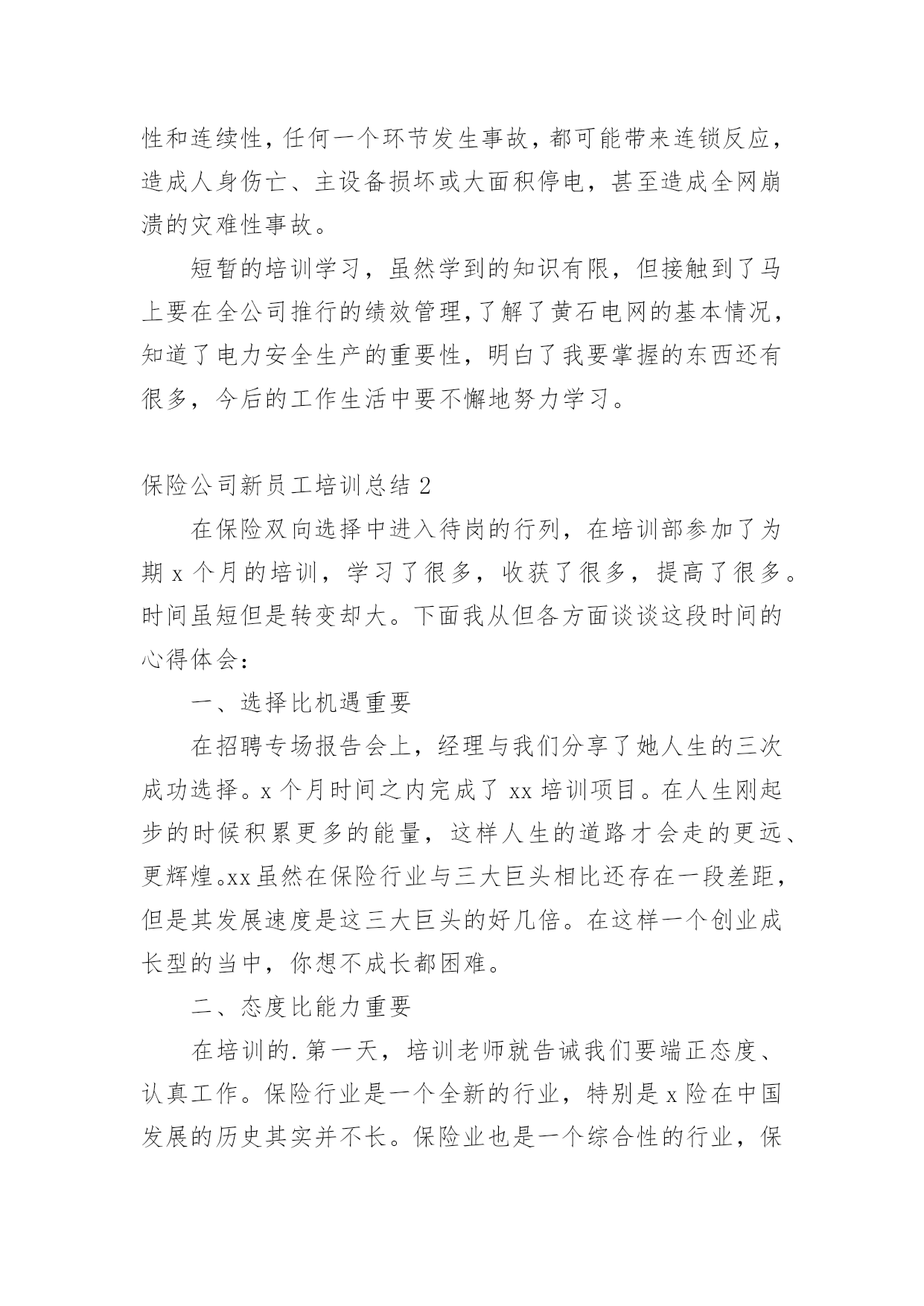 保险公司新员工培训总结总结是指对某一阶段的工作、学习或思想中的经验或情况进行分析研究,做出带有规律性结论的书面材料,它可以明确下一步的工作方向,少走弯路,少犯错误,提高工作效益,让我们来为自己写一份总结吧。那么你真的懂得怎么写总结吗?以下是小编整理的保险公司新员工培训总结,仅供参考,希望能够帮助到大家。保险公司新员工培训总结1时光飞逝,一个星期的培训马上就要结束了。这次培训的目的是帮助我们黄石供电公司的新员工尽快完成角色转变,了解公司企业文化,熟悉公司的管理制度,增强主人翁意识,养成积极主动的工作态度和敬业精神,拓展良好的人际关系,确定正确的发展目标。此次培训主要包括5个部分:绩效管理,厂纪厂规,电网建设,安规和廉政建设。在公司领导的精心组织下,培训井然有序,每一次的讲座都安排了优秀的讲授老师,良好的听课环境,学员们的积极参与,圆满完成培训任务的同时也使我本人感触颇多。首先是彭老师给我们讲解绩效管理。老师把20名新员工安自由组合方式分成4组,讲解概念的同时穿插案例让我们分组讨论,最后做总结发言。灵活的授课方式让沉闷的课堂多彩起来了,充分调动了大家的积极性,使大家很好地吸收了老师的讲解内容。绩效管理是公司管理者与员工之间在目标与如何实现目标上达成共识的过程,是促进员工进行改善,帮助员工成功达到目标,取得优异成绩的管理方法。对公司而言:绩效管理是增强有效沟通,提高管理效率,达成经营目标所采取的系统有效管理手段。对员工而言:绩效管理是检验自我能力,实现与上级有效沟通与提高自我业绩,实现自我发展的重要路径。学完绩效管理,我觉得有几个值得特别注意的地方:第一,绩效管理是一个完整的系统,不是一个简单的步骤。无论是在理论阐述还是管理实践当中,都会遇到这样一个误区:绩效管理=绩效考核,做绩效管理就是做绩效考核表。所以许多的企业在操作绩效管理时,往往断章取义地认为绩效管理就是绩效考核,企业做了绩效考核表,量化了考核指标,年终实施了考核,就是做了绩效管理了。这种误区使得许多企业在操作绩效管理时省略了极为重要的目标制定、沟通管理等过程,忽略了绩效管理中需要掌握和使用的技巧与技能,在实施绩效管理中遇到了很多的困难和障碍,企业的绩效管理的水平也处于低层次徘徊。第二,目标管理的一个最大的好处就是员工明白自己努力的方向,经理明确如何更好地通过员工的目标对员工进行有效管理,提供支持帮助。同样,绩效管理也强调目标管理,目标+沟通的绩效管理模式被广泛提倡和使用。只有绩效管理的目标明确了,经理和员工的努力才会有方向,才会更加地团结一致,共同致力于绩效目标的实现,共同提高绩效能力,更好地服务于企业的战略规划和远景目标。第三,沟通在绩效管理中起着决定性的作用。制定绩效要沟通,帮助员工实现目标要沟通,年终评估要沟通,分析原因寻求进步要沟通,总之,绩效管理的过程就是员工和经理持续不断沟通的过程。离开了沟通,企业的绩效管理将流于形式。许多管理活动失败的原因都是因为沟通出现了问题,绩效管理就是致力于管理沟通的改善,全面提高管理者的沟通意识,提高管理的沟通技巧,进而改善企业的管理水平和管理者的管理素质。接下来通过李老师和王老师的授课,我们了解了黄石供电公司的基本情况和黄石地区电网建设现状,了解了公司的领导班子和机构组成。黄石供电公司是国家大一型一流供电企业,全民职工2629人,下属16个部室,5个营业公司,16个生产单位,担负着黄石5区2县的供电任务,用户68万,有41个基层营业站所,135个供电组,固定资产21。7亿元。黄石电网西接武汉,北连黄冈,东送江西,是鄂东南电网的枢纽。唯一的500KV的磁湖站是构成湖北主干网的重要一环,7座220KV变电站是组成黄石电网的主干力量,有效稳定地分担着黄石地区的用电负荷,但由于网络结构的拓扑属性,位于阳新的姜变与整个地区的电网联系还很薄弱,电网的稳定安全还有待进一步的加强。王老师还具体的给我们讲解了有关负荷调配,开关操作和线路分析等的实际案例,使我们知道,学校学到的终究只是理论的书面的东西,要将这些东西真正变成实际的技能,我们还有很长的`路要走,需要多留心观察学习,多跟师傅们请教,争取早日有所成,为黄石电网的建设贡献自己的力量。最后是安规学习。电力安全生产的重要性是由电力生产、电力基本建设、电力多种经营的客观规律和生产特性及社会作用决定的。随着电力工业迅速发展、电力体制改革和市场化进程加快,电力安全生产的重要性更加突出。(1)电力安全生产影响各行各业和社会稳定。它为各行各业提供电力,如果供电中断,特别是电网事故造成大面积停电,将使各行各业的生产停顿或瘫痪,有的还会产生一系列次生事故,带来一系列次生灾害。另外,供电中断或大面积停电,会给社会和人民生活秩序带来混乱,甚至造成社会灾难,造成极坏的政治影响。(2)电力安全生产影响电力企业本身。