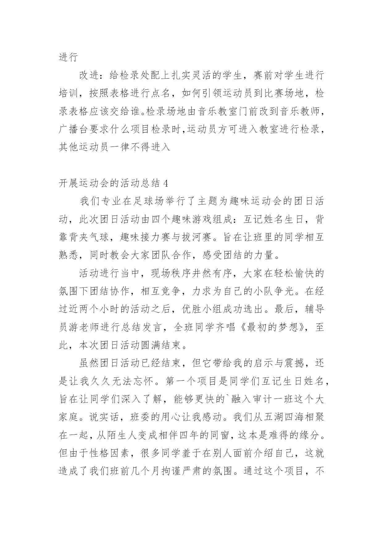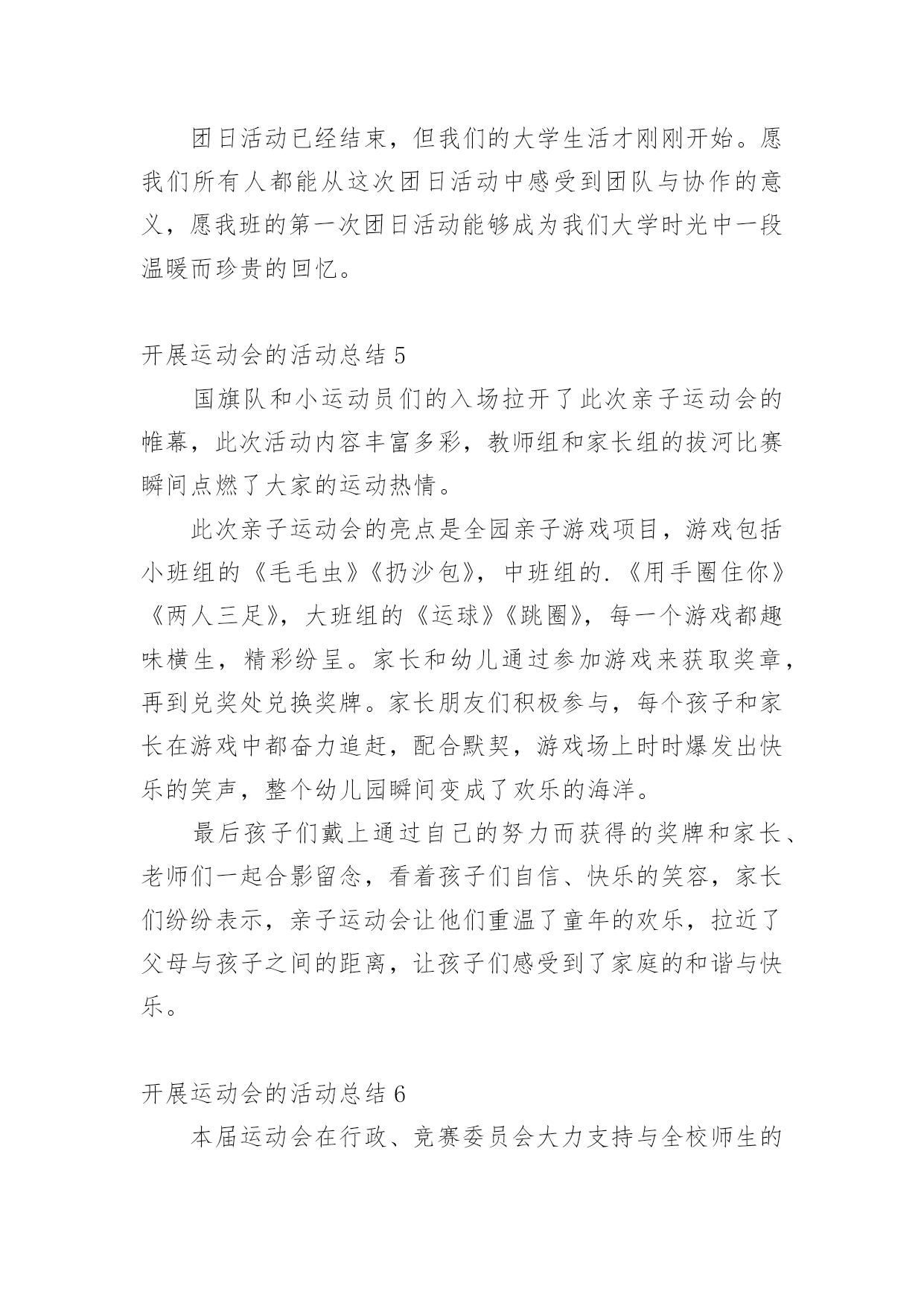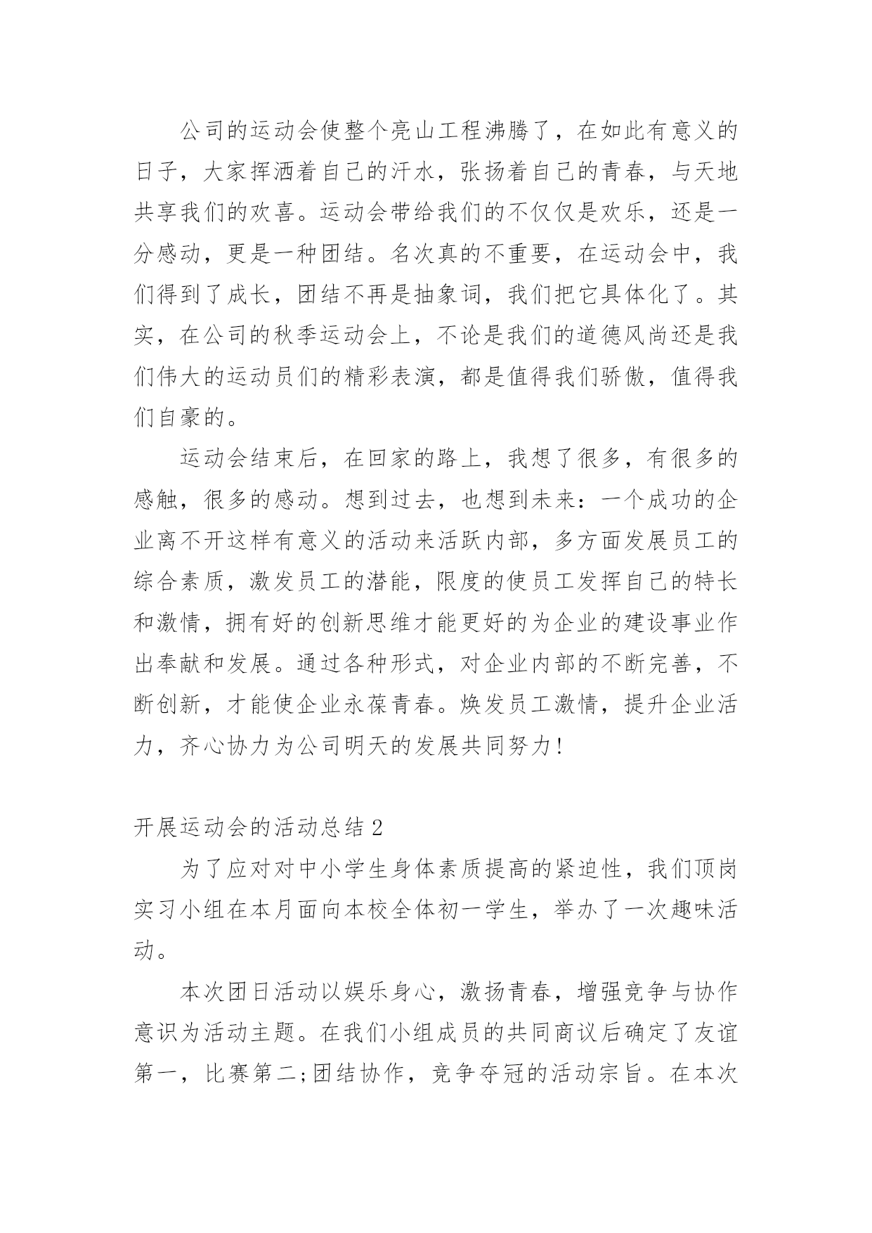 开展运动会的活动总结总结是事后对某一阶段的学习、工作或其完成情况加以回顾和分析的一种书面材料,它可以帮助我们有寻找学习和工作中的规律,让我们抽出时间写写总结吧。但是却发现不知道该写些什么,下面是小编精心整理的开展运动会的活动总结,欢迎阅读,希望大家能够喜欢。开展运动会的活动总结1我们迎着冬日的阳光,在12月x日上午由总经理致词,我们迎来了公司一年一度欢快而精彩的冬季运动会,相信在今年的运动会上,我们将与时俱进,开拓创新,一定会赛出好成绩的!从开幕式到闭幕式的整个过程真的是一种享受。整个场面是那么的激动人心,在整个比赛的过程中我们赛出了风格、赛出了水平。运动员不管是年轻的、中年的发扬顽强拼搏的精神自始至终在和谐的气氛中比赛,本着强身健体的精神,友谊第一,比赛第二的'原则。使整个比赛达到了高潮。运动员竭尽全力投入比赛中,场上为运动员加油的呐喊声此起彼伏,此情此景使我万分激动,同时我为取得优异成绩的运动员深表祝贺,在运动场上使我这个已步入中年的人仿佛回到了青年时代,使自己的心年轻了许多。运动会的内容丰富多采:有拨和、同心协力、跳绳、袋鼠跳、4x50米接力赛;运动会是以部门对赛的形式展开的。回想起运动会情景,运动员们在赛场上的拼搏竞争还历历在目。公司领导以裁判员身份参与其中。他们与员工一起运动,一起赛出风格,赛出精神!不免让运动员的精神更是振奋起来!天虽然转冷,但运动员的情绪一直是高涨的,运动会也在紧张、刺激的拨和大战中拉开帷幕,健儿们将运动精神发挥得淋漓尽致。当天的比赛高潮迭起,异彩纷呈。围观的员工都激动在叫“加油”,“加油”声一浪高过一浪。在各个运动项目中各部门都取得了佳绩。我们综合部门的成绩也比往年出色多了,相继在女子袋鼠跳、男子拨和和男子4x50米竞赛中获得了第一、第二名。尤其在拨和中,我们综合部门更是打了一个漂亮仗,在大家不断加油声的支持,我们几名运动员的体力已不支仍然坚持拼搏下获得了第一名。博得了观众们热烈的掌声,令人如今仍然记忆犹新,那个第一名真是来之不易呀!有胜利自然就会有失败,在拨和比赛中,我看见有运动员在拨和时已经是拨累趴下了,但还是凭着那股不屈不挠的精神,硬是坚持,依旧使尽全力,向胜利艰难的靠近,最终虽然输掉了比赛,可他(她)们同样是我们公司的骄傲。因为他(她)们让大家清楚地看到了一个企业的精神。我们的拉拉队员们,虽然有些人无机会参加此次比赛,但义无返顾地为运动员们呐喊助威,送去的不仅是心灵上的滋润,更是勇气和信心,是运动场上一道亮丽的风景线。他们当之无愧是这次运动会最可爱的人。公司的运动会使整个亮山工程沸腾了,在如此有意义的日子,大家挥洒着自己的汗水,张扬着自己的青春,与天地共享我们的欢喜。运动会带给我们的不仅仅是欢乐,还是一分感动,更是一种团结。名次真的不重要,在运动会中,我们得到了成长,团结不再是抽象词,我们把它具体化了。其实,在公司的秋季运动会上,不论是我们的道德风尚还是我们伟大的运动员们的精彩表演,都是值得我们骄傲,值得我们自豪的。运动会结束后,在回家的路上,我想了很多,有很多的感触,很多的感动。想到过去,也想到未来:一个成功的企业离不开这样有意义的活动来活跃内部,多方面发展员工的综合素质,激发员工的潜能,限度的使员工发挥自己的特长和激情,拥有好的创新思维才能更好的为企业的建设事业作出奉献和发展。通过各种形式,对企业内部的不断完善,不断创新,才能使企业永葆青春。焕发员工激情,提升企业活力,齐心协力为公司明天的发展共同努力!开展运动会的活动总结2为了应对对中小学生身体素质提高的紧迫性,我们顶岗实习小组在本月面向本校全体初一学生,举办了一次趣味活动。本次团日活动以娱乐身心,激扬青春,增强竞争与协作意识为活动主题。在我们小组成员的共同商议后确定了友谊第一,比赛第二;团结协作,竞争夺冠的活动宗旨。在本次活动的开展之前,我们共同努力进行前期准备的工作。首先,确定及明确比赛项目及规则,对本次活动进行策划宣传,并在学生课外活动时间,到初一各个教室进行宣传,鼓励学生积极报名参加。其次在各个班主任的帮助下,进行分配比赛小组的工作,拟定评委,并在学校的体育老师的帮助下完成规则的制定。其次,和学校的老师交流,确定本次活动的时间是在学生们的自习课和课外活动时间。最后,确定及明确比赛规则,在学校体育老师的帮助下准备活动器材、用具,并准备奖状。在学校老师的积极配合下,在我们实习小分队的努力工作下,学生们积极踊跃的参加此次趣味活动,每个活动项目都能调动起学生们的积极性。此次活动的开展共有五项内容,全程采用小组淘汰赛。第一项五人四足,为五人小组赛,每班派出五名同学,班与班之间进行比赛,让同学们感受到小组团结与班级竞争的力量。第二项是锻炼学生们个人竞争意识的跳绳比赛。其次还有保龄球比赛、夹气球比赛,以及班与班之间的拔河比赛。在操场上