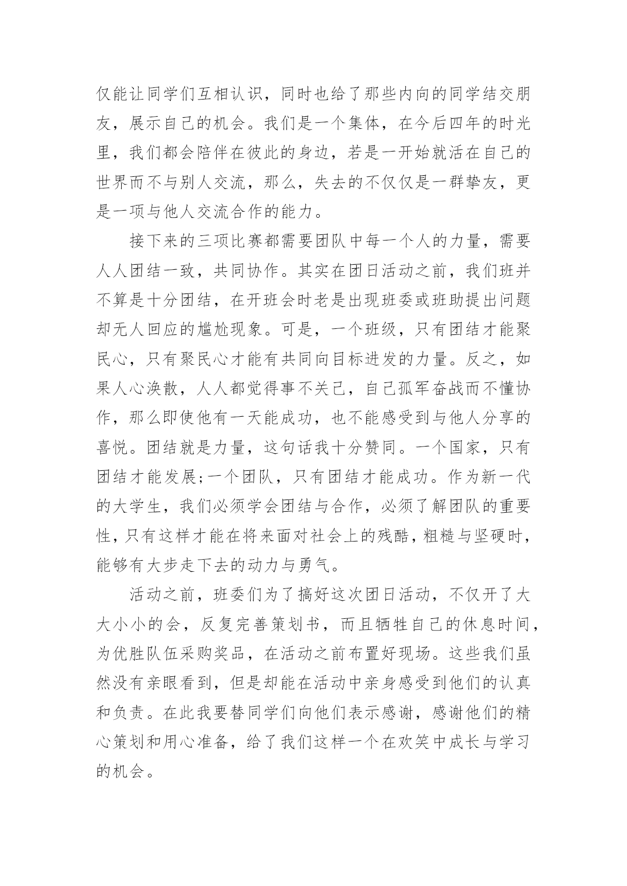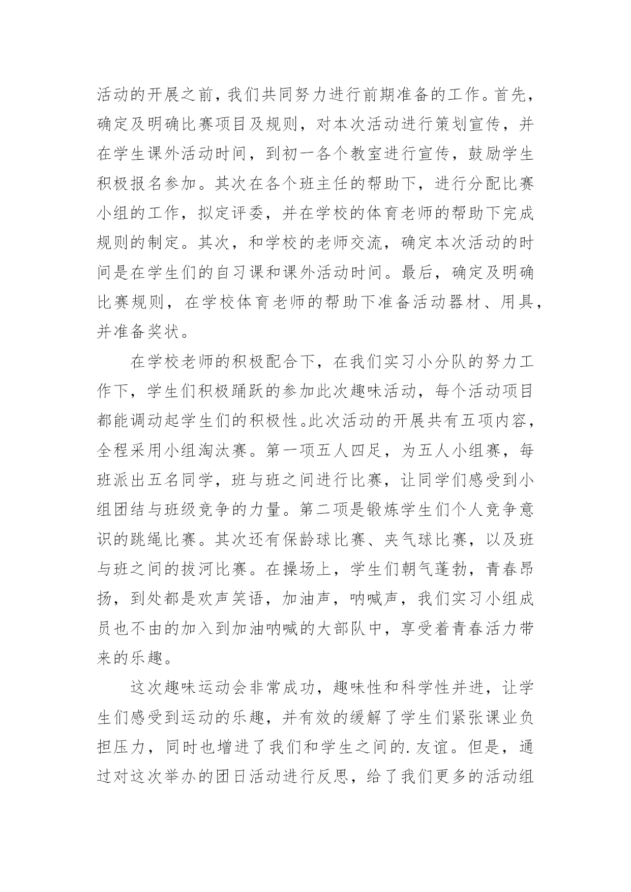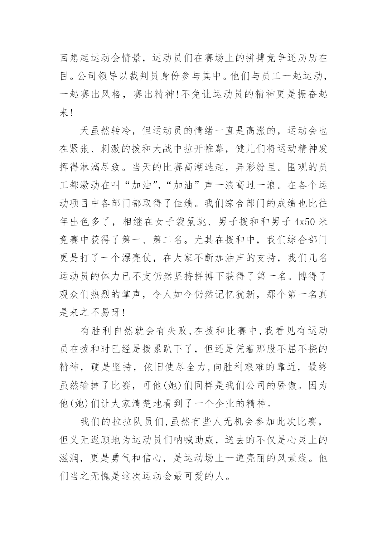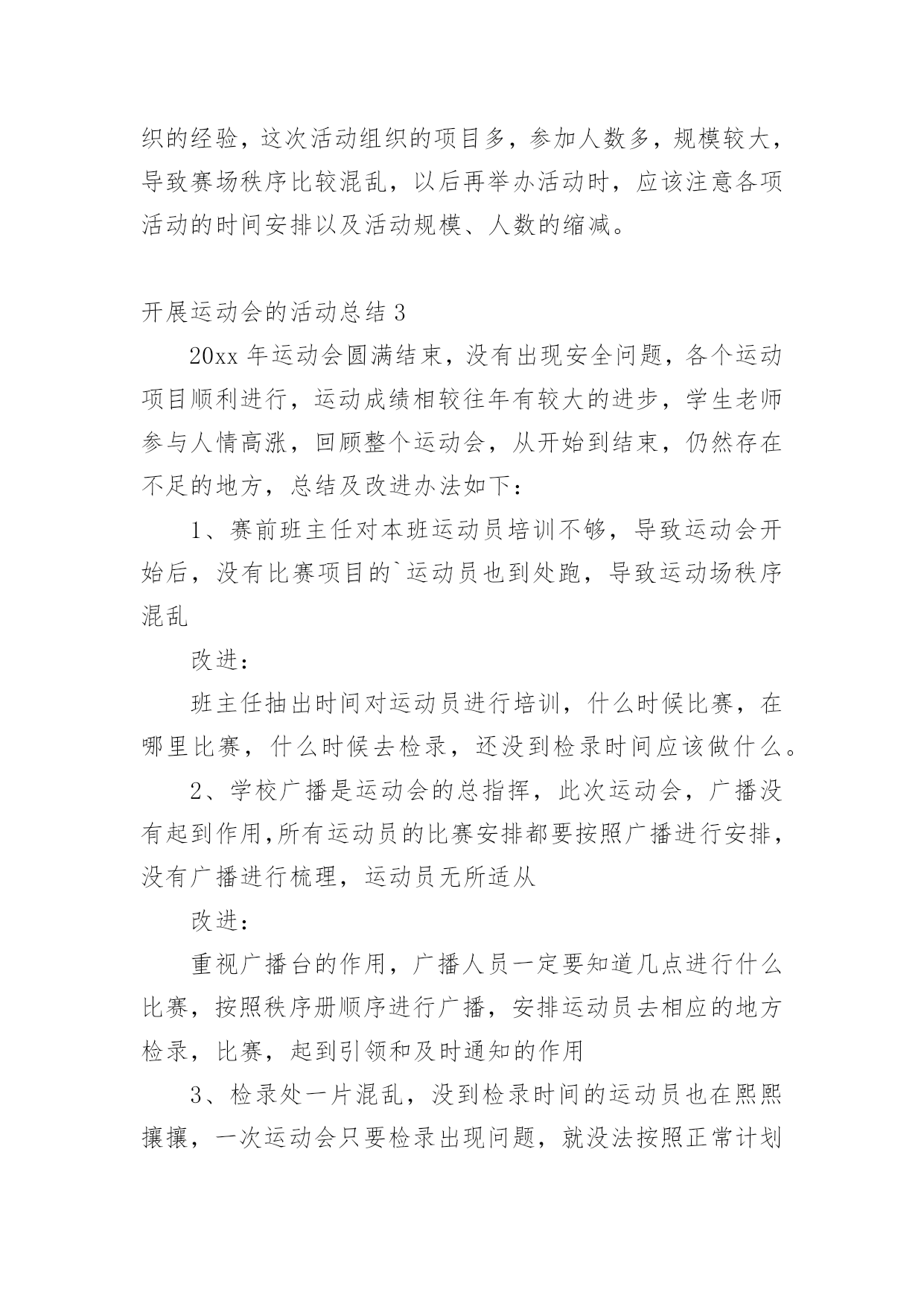 开展运动会的活动总结总结是事后对某一阶段的学习、工作或其完成情况加以回顾和分析的一种书面材料,它可以帮助我们有寻找学习和工作中的规律,让我们抽出时间写写总结吧。但是却发现不知道该写些什么,下面是小编精心整理的开展运动会的活动总结,欢迎阅读,希望大家能够喜欢。开展运动会的活动总结1我们迎着冬日的阳光,在12月x日上午由总经理致词,我们迎来了公司一年一度欢快而精彩的冬季运动会,相信在今年的运动会上,我们将与时俱进,开拓创新,一定会赛出好成绩的!从开幕式到闭幕式的整个过程真的是一种享受。整个场面是那么的激动人心,在整个比赛的过程中我们赛出了风格、赛出了水平。运动员不管是年轻的、中年的发扬顽强拼搏的精神自始至终在和谐的气氛中比赛,本着强身健体的精神,友谊第一,比赛第二的'原则。使整个比赛达到了高潮。运动员竭尽全力投入比赛中,场上为运动员加油的呐喊声此起彼伏,此情此景使我万分激动,同时我为取得优异成绩的运动员深表祝贺,在运动场上使我这个已步入中年的人仿佛回到了青年时代,使自己的心年轻了许多。运动会的内容丰富多采:有拨和、同心协力、跳绳、袋鼠跳、4x50米接力赛;运动会是以部门对赛的形式展开的。回想起运动会情景,运动员们在赛场上的拼搏竞争还历历在目。公司领导以裁判员身份参与其中。他们与员工一起运动,一起赛出风格,赛出精神!不免让运动员的精神更是振奋起来!天虽然转冷,但运动员的情绪一直是高涨的,运动会也在紧张、刺激的拨和大战中拉开帷幕,健儿们将运动精神发挥得淋漓尽致。当天的比赛高潮迭起,异彩纷呈。围观的员工都激动在叫“加油”,“加油”声一浪高过一浪。在各个运动项目中各部门都取得了佳绩。我们综合部门的成绩也比往年出色多了,相继在女子袋鼠跳、男子拨和和男子4x50米竞赛中获得了第一、第二名。尤其在拨和中,我们综合部门更是打了一个漂亮仗,在大家不断加油声的支持,我们几名运动员的体力已不支仍然坚持拼搏下获得了第一名。博得了观众们热烈的掌声,令人如今仍然记忆犹新,那个第一名真是来之不易呀!有胜利自然就会有失败,在拨和比赛中,我看见有运动员在拨和时已经是拨累趴下了,但还是凭着那股不屈不挠的精神,硬是坚持,依旧使尽全力,向胜利艰难的靠近,最终虽然输掉了比赛,可他(她)们同样是我们公司的骄傲。因为他(她)们让大家清楚地看到了一个企业的精神。我们的拉拉队员们,虽然有些人无机会参加此次比赛,但义无返顾地为运动员们呐喊助威,送去的不仅是心灵上的滋润,更是勇气和信心,是运动场上一道亮丽的风景线。他们当之无愧是这次运动会最可爱的人。公司的运动会使整个亮山工程沸腾了,在如此有意义的日子,大家挥洒着自己的汗水,张扬着自己的青春,与天地共享我们的欢喜。运动会带给我们的不仅仅是欢乐,还是一分感动,更是一种团结。名次真的不重要,在运动会中,我们得到了成长,团结不再是抽象词,我们把它具体化了。其实,在公司的秋季运动会上,不论是我们的道德风尚还是我们伟大的运动员们的精彩表演,都是值得我们骄傲,值得我们自豪的。运动会结束后,在回家的路上,我想了很多,有很多的感触,很多的感动。想到过去,也想到未来:一个成功的企业离不开这样有意义的活动来活跃内部,多方面发展员工的综合素质,激发员工的潜能,限度的使员工发挥自己的特长和激情,拥有好的创新思维才能更好的为企业的建设事业作出奉献和发展。通过各种形式,对企业内部的不断完善,不断创新,才能使企业永葆青春。焕发员工激情,提升企业活力,齐心协力为公司明天的发展共同努力!开展运动会的活动总结2为了应对对中小学生身体素质提高的紧迫性,我们顶岗实习小组在本月面向本校全体初一学生,举办了一次趣味活动。本次团日活动以娱乐身心,激扬青春,增强竞争与协作意识为活动主题。在我们小组成员的共同商议后确定了友谊第一,比赛第二;团结协作,竞争夺冠的活动宗旨。在本次活动的开展之前,我们共同努力进行前期准备的工作。首先,确定及明确比赛项目及规则,对本次活动进行策划宣传,并在学生课外活动时间,到初一各个教室进行宣传,鼓励学生积极报名参加。其次在各个班主任的帮助下,进行分配比赛小组的工作,拟定评委,并在学校的体育老师的帮助下完成规则的制定。其次,和学校的老师交流,确定本次活动的时间是在学生们的自习课和课外活动时间。最后,确定及明确比赛规则,在学校体育老师的帮助下准备活动器材、用具,并准备奖状。在学校老师的积极配合下,在我们实习小分队的努力工作下,学生们积极踊跃的参加此次趣味活动,每个活动项目都能调动起学生们的积极性。此次活动的开展共有五项内容,全程采用小组淘汰赛。第一项五人四足,为五人小组赛,每班派出五名同学,班与班之间进行比赛,让同学们感受到小组团结与班级竞争的力量。第二项是锻炼学生们个人竞争意识的跳绳比赛。其次还有保龄球比赛、夹气球比赛,以及班与班之间的拔河比赛。在操场上