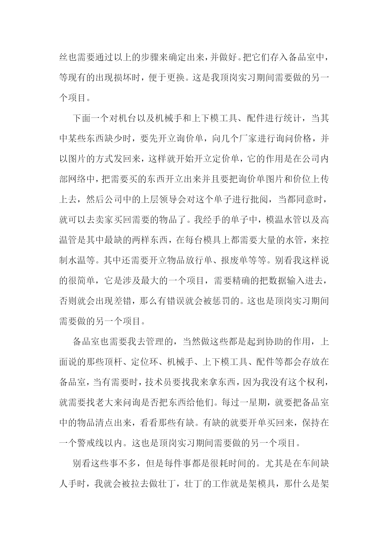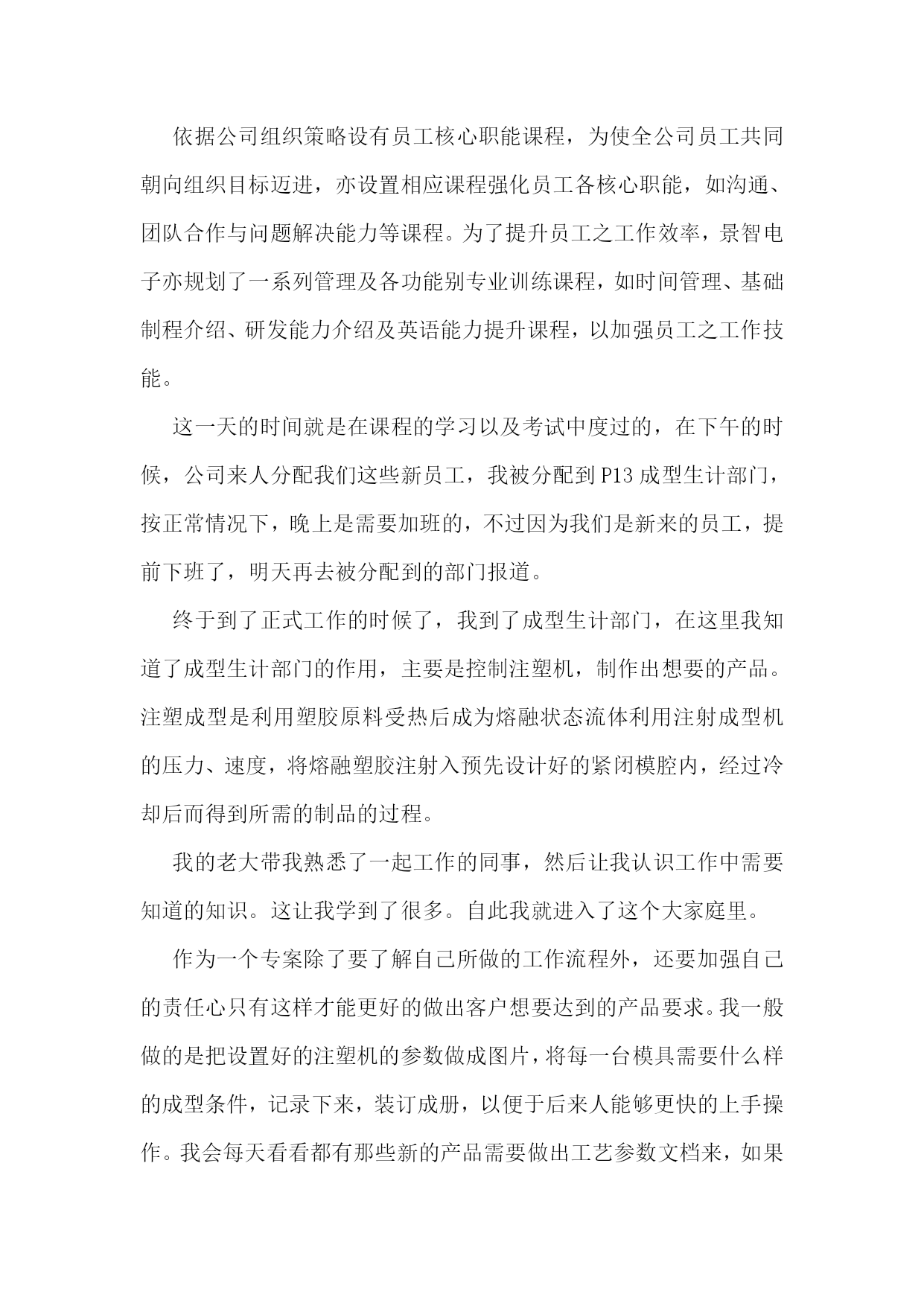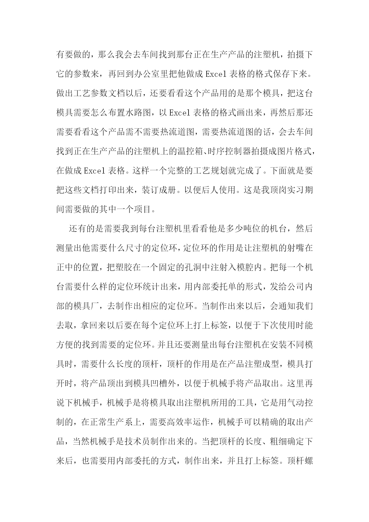 机电一体化实习总结精彩7篇机电一体化实习报告篇一一、实习目的:1、通过工作实习加深了对机电一体化专业认识,巩固了专业思想,激发了学习热情。2.熟悉公司工作流程、专业涉及的工作要领。为以后走上更好的工作岗位积累一定的知识和经验。3、开拓我们的视野,增强了专业知识,锻炼了独立工作的能力,拓展了更广的知识和业务。通过现场的工作实习和企业员工的交流指导,理论联系实际,把所学的理论知识加以印证、深化、巩固和充实,培养分析、解决工程实际问题的能力,为后继的学习以及其他方面的深入了解打下了坚实的基础。二、实习情况介绍:1、公司简介:岗位介绍:专案是一个特殊的将被完成的有限任务,它是在一定的时间内、满足一系列特定目标的多项相关工作的总称。专案是台湾惯用名词,在国内专案相当于项目。专案包括三层含义:(1)专案是一项有待完成的任务,有特定的环境与要求;(2)在一定组织结构内,利用有限的资源(包括人力、物力和财力等)在规定的时间内完成任务;(3)任务是满足一定性能、质量、数量和技术指标等要求。对照IT企业的工作内容,基本都可以称之爲专案,因此对这些工作的管理,均可以采用专案管理的方法。专案就是要完成的一个具体任务,一旦这个任务完成,这个专案的使命就完成了。专案受到周围环境的影响,而且环境对专案的执行有一定的约束,例如考虑到和其他专案的相容,必须采用的技术和开发理念等等。为了完成专案的任务,必须要组建一支团队,团队成员分工合作以完成各个分目标,进而实现总体目标。专案对资源有一定的要求,这些要求包括人力资源的技术能力和数量要求,配备什麽样的设备和数量,完成专案目标需要多少费用,以及这些资金的分配情况等。3、工作介绍:主要工作是协助公司完成后勤规划管理的项目。主要分为(1)机械手配件统计管理;(2)机台定位环统计管理;(3)技术员用备品管理请购;(4)备品室进出管理。其中还兼职架立模具。三、实习时间及地点:20xx年11月----20xx年6月在厦门景智电子股份有限公司进行顶岗实习。四、实习内容:开始的第一天是新人培训,新人培训是为了协助新进人员融入景智大家庭,快速上手工作,不仅由部门资深人员担任辅导员,作为职场生活/专业上的指导者:另有集团文化训练及公司新进人员教育训练,作为熟悉本集团核心价值、文化及基本工作流程须知的引导课程。人力资源部及职业发展辅导员引导员工从学生到职场人的顺利过渡,给员工一个清晰的职业发展方向。依据公司组织策略设有员工核心职能课程,为使全公司员工共同朝向组织目标迈进,亦设置相应课程强化员工各核心职能,如沟通、团队合作与问题解决能力等课程。为了提升员工之工作效率,景智电子亦规划了一系列管理及各功能别专业训练课程,如时间管理、基础制程介绍、研发能力介绍及英语能力提升课程,以加强员工之工作技能。这一天的时间就是在课程的学习以及考试中度过的,在下午的时候,公司来人分配我们这些新员工,我被分配到P13成型生计部门,按正常情况下,晚上是需要加班的,不过因为我们是新来的员工,提前下班了,明天再去被分配到的部门报道。终于到了正式工作的时候了,我到了成型生计部门,在这里我知道了成型生计部门的作用,主要是控制注塑机,制作出想要的产品。注塑成型是利用塑胶原料受热后成为熔融状态流体利用注射成型机的压力、速度,将熔融塑胶注射入预先设计好的紧闭模腔内,经过冷却后而得到所需的制品的过程。我的老大带我熟悉了一起工作的同事,然后让我认识工作中需要知道的知识。这让我学到了很多。自此我就进入了这个大家庭里。作为一个专案除了要了解自己所做的工作流程外,还要加强自己的责任心只有这样才能更好的做出客户想要达到的产品要求。我一般做的是把设置好的注塑机的参数做成图片,将每一台模具需要什么样的成型条件,记录下来,装订成册,以便于后来人能够更快的上手操作。我会每天看看都有那些新的产品需要做出工艺参数文档来,如果有要做的,那么我会去车间找到那台正在生产产品的注塑机,拍摄下它的参数来,再回到办公室里把他做成Excel表格的格式保存下来。做出工艺参数文档以后,还要看看这个产品用的是那个模具,把这台模具需要怎么布置水路图,以Excel表格的格式画出来,再然后那还需要看看这个产品需不需要热流道图,需要热流道图的话,会去车间找到正在生产产品的注塑机上的温控箱、时序控制器拍摄成图片格式,在做成Excel表格。这样一个完整的工艺规划就完成了。下面就是要把这些文档打印出来,装订成册。以便后人使用。这是我顶岗实习期间需要做的其中一个项目。还有的是需要我到每台注塑机里看看他是多少吨位的机台,然后测量出他需要什么尺寸的定位环,定位环的作用是让注塑机的射嘴在正中的位置,把塑胶在一个固定的孔洞中注射入模腔内。把每一个机台需要什么样的定位环统计出来,用内部委托单的
