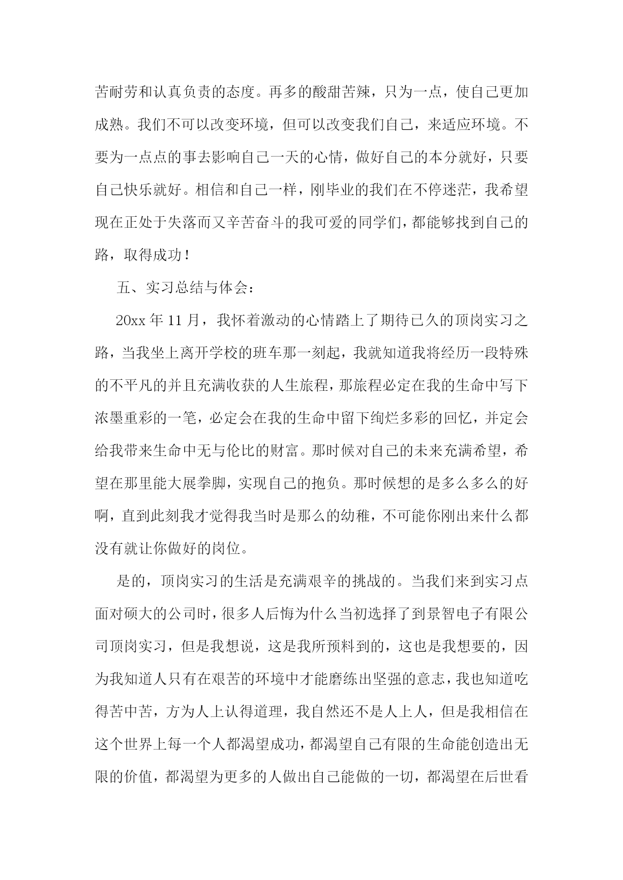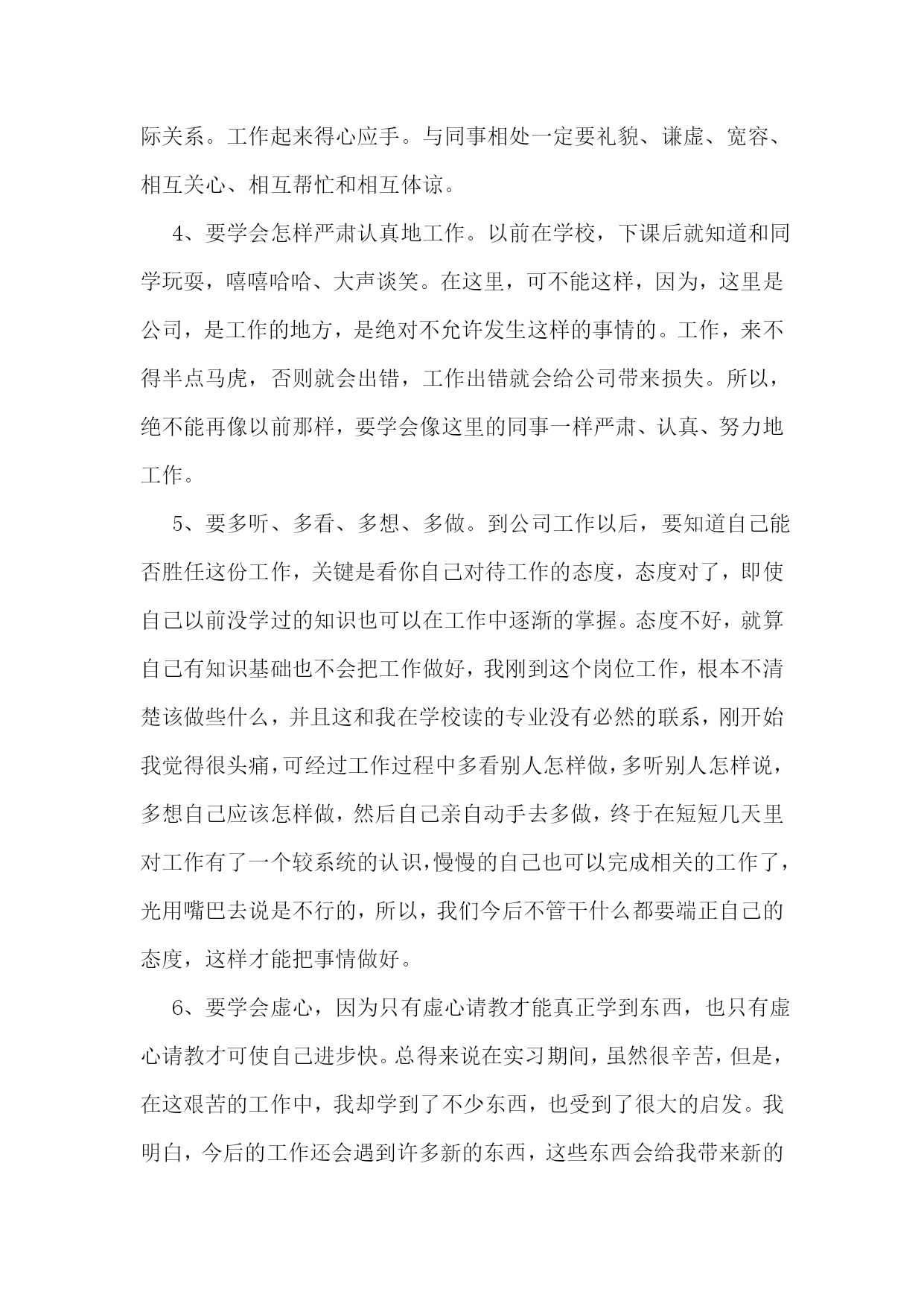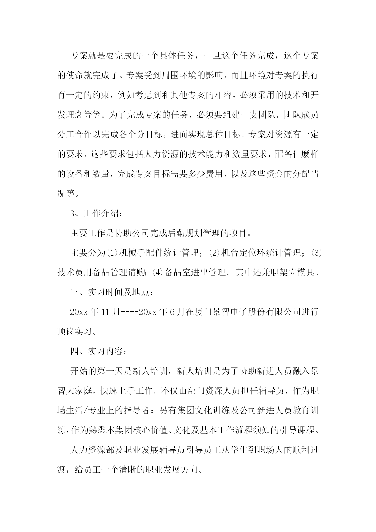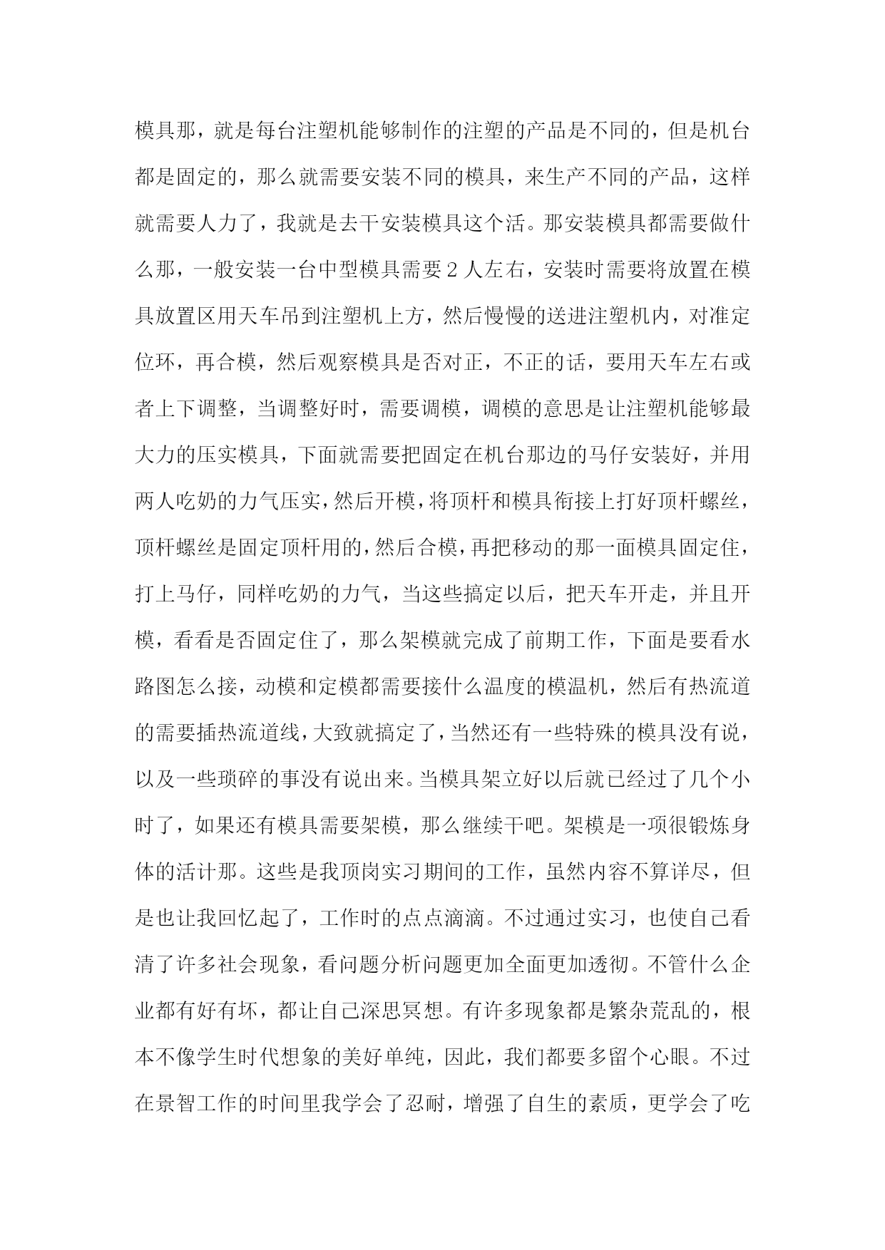 机电一体化实习总结精彩7篇机电一体化实习报告篇一一、实习目的:1、通过工作实习加深了对机电一体化专业认识,巩固了专业思想,激发了学习热情。2.熟悉公司工作流程、专业涉及的工作要领。为以后走上更好的工作岗位积累一定的知识和经验。3、开拓我们的视野,增强了专业知识,锻炼了独立工作的能力,拓展了更广的知识和业务。通过现场的工作实习和企业员工的交流指导,理论联系实际,把所学的理论知识加以印证、深化、巩固和充实,培养分析、解决工程实际问题的能力,为后继的学习以及其他方面的深入了解打下了坚实的基础。二、实习情况介绍:1、公司简介:岗位介绍:专案是一个特殊的将被完成的有限任务,它是在一定的时间内、满足一系列特定目标的多项相关工作的总称。专案是台湾惯用名词,在国内专案相当于项目。专案包括三层含义:(1)专案是一项有待完成的任务,有特定的环境与要求;(2)在一定组织结构内,利用有限的资源(包括人力、物力和财力等)在规定的时间内完成任务;(3)任务是满足一定性能、质量、数量和技术指标等要求。对照IT企业的工作内容,基本都可以称之爲专案,因此对这些工作的管理,均可以采用专案管理的方法。专案就是要完成的一个具体任务,一旦这个任务完成,这个专案的使命就完成了。专案受到周围环境的影响,而且环境对专案的执行有一定的约束,例如考虑到和其他专案的相容,必须采用的技术和开发理念等等。为了完成专案的任务,必须要组建一支团队,团队成员分工合作以完成各个分目标,进而实现总体目标。专案对资源有一定的要求,这些要求包括人力资源的技术能力和数量要求,配备什麽样的设备和数量,完成专案目标需要多少费用,以及这些资金的分配情况等。3、工作介绍:主要工作是协助公司完成后勤规划管理的项目。主要分为(1)机械手配件统计管理;(2)机台定位环统计管理;(3)技术员用备品管理请购;(4)备品室进出管理。其中还兼职架立模具。三、实习时间及地点:20xx年11月----20xx年6月在厦门景智电子股份有限公司进行顶岗实习。四、实习内容:开始的第一天是新人培训,新人培训是为了协助新进人员融入景智大家庭,快速上手工作,不仅由部门资深人员担任辅导员,作为职场生活/专业上的指导者:另有集团文化训练及公司新进人员教育训练,作为熟悉本集团核心价值、文化及基本工作流程须知的引导课程。人力资源部及职业发展辅导员引导员工从学生到职场人的顺利过渡,给员工一个清晰的职业发展方向。依据公司组织策略设有员工核心职能课程,为使全公司员工共同朝向组织目标迈进,亦设置相应课程强化员工各核心职能,如沟通、团队合作与问题解决能力等课程。为了提升员工之工作效率,景智电子亦规划了一系列管理及各功能别专业训练课程,如时间管理、基础制程介绍、研发能力介绍及英语能力提升课程,以加强员工之工作技能。这一天的时间就是在课程的学习以及考试中度过的,在下午的时候,公司来人分配我们这些新员工,我被分配到P13成型生计部门,按正常情况下,晚上是需要加班的,不过因为我们是新来的员工,提前下班了,明天再去被分配到的部门报道。终于到了正式工作的时候了,我到了成型生计部门,在这里我知道了成型生计部门的作用,主要是控制注塑机,制作出想要的产品。注塑成型是利用塑胶原料受热后成为熔融状态流体利用注射成型机的压力、速度,将熔融塑胶注射入预先设计好的紧闭模腔内,经过冷却后而得到所需的制品的过程。我的老大带我熟悉了一起工作的同事,然后让我认识工作中需要知道的知识。这让我学到了很多。自此我就进入了这个大家庭里。作为一个专案除了要了解自己所做的工作流程外,还要加强自己的责任心只有这样才能更好的做出客户想要达到的产品要求。我一般做的是把设置好的注塑机的参数做成图片,将每一台模具需要什么样的成型条件,记录下来,装订成册,以便于后来人能够更快的上手操作。我会每天看看都有那些新的产品需要做出工艺参数文档来,如果有要做的,那么我会去车间找到那台正在生产产品的注塑机,拍摄下它的参数来,再回到办公室里把他做成Excel表格的格式保存下来。做出工艺参数文档以后,还要看看这个产品用的是那个模具,把这台模具需要怎么布置水路图,以Excel表格的格式画出来,再然后那还需要看看这个产品需不需要热流道图,需要热流道图的话,会去车间找到正在生产产品的注塑机上的温控箱、时序控制器拍摄成图片格式,在做成Excel表格。这样一个完整的工艺规划就完成了。下面就是要把这些文档打印出来,装订成册。以便后人使用。这是我顶岗实习期间需要做的其中一个项目。还有的是需要我到每台注塑机里看看他是多少吨位的机台,然后测量出他需要什么尺寸的定位环,定位环的作用是让注塑机的射嘴在正中的位置,把塑胶在一个固定的孔洞中注射入模腔内。把每一个机台需要什么样的定位环统计出来,用内部委托单的
