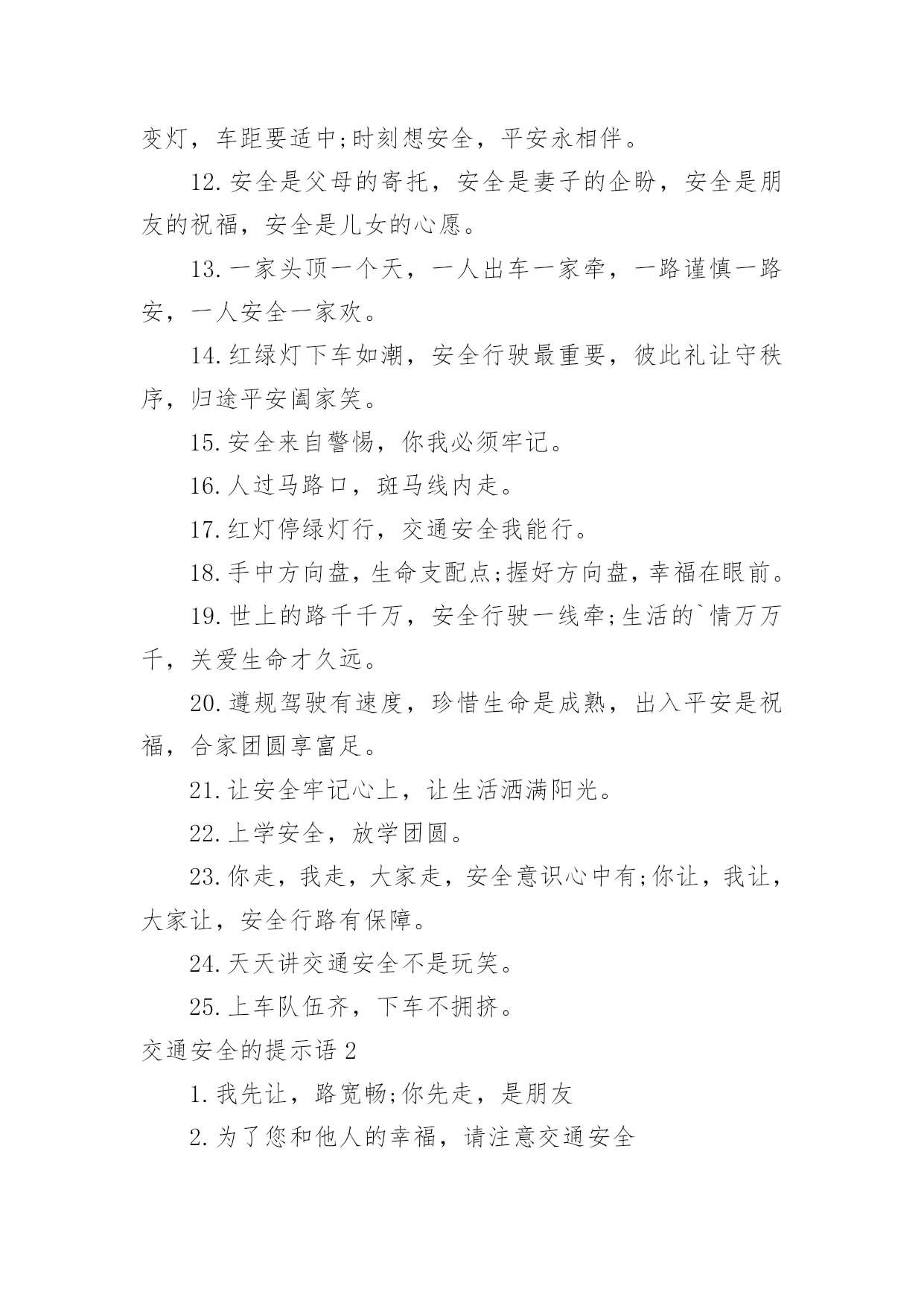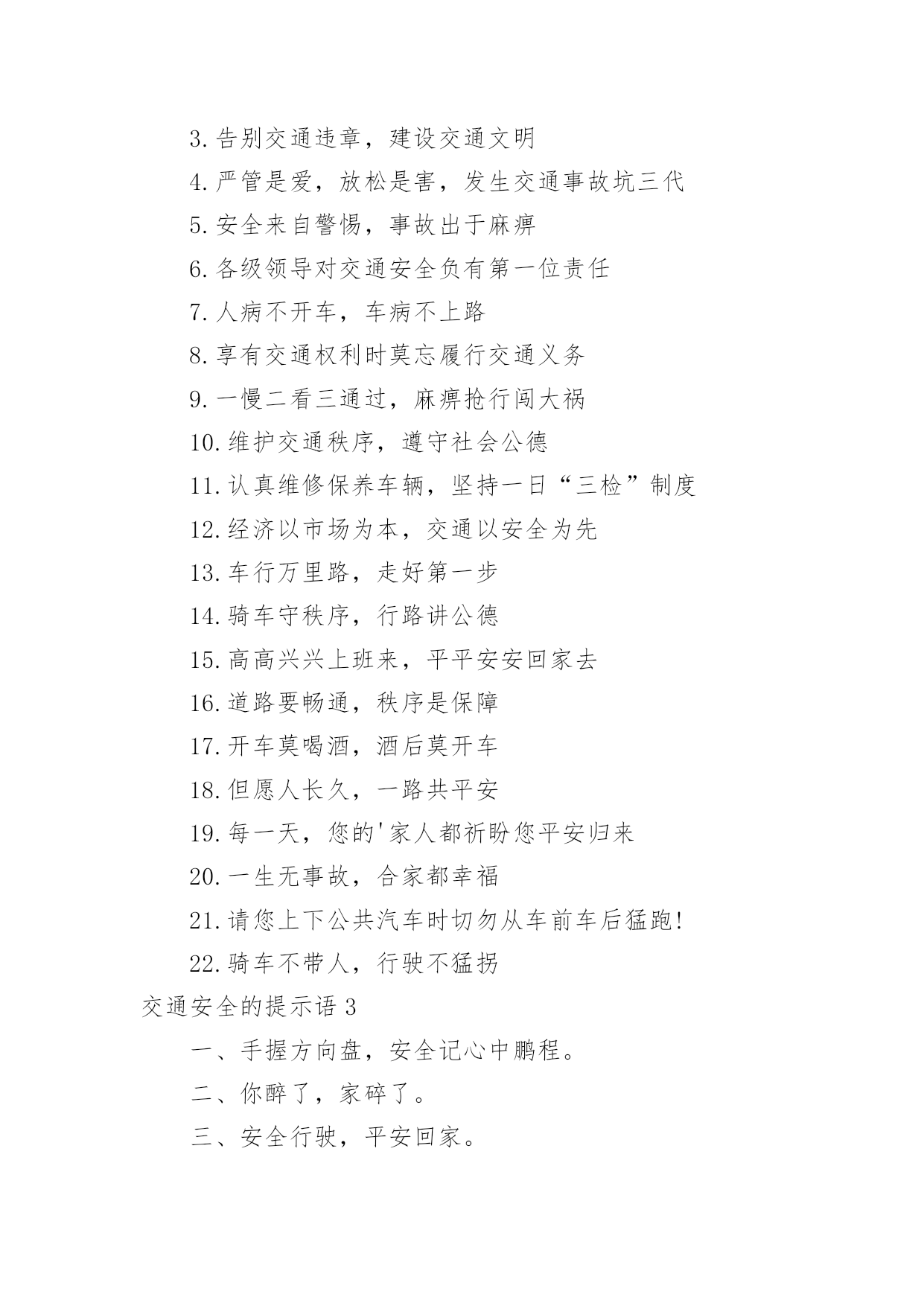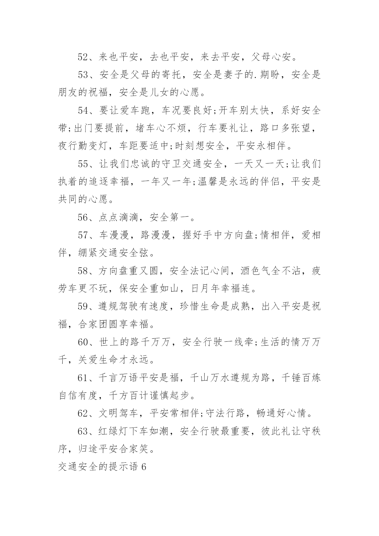 交通安全的提示语交通安全的提示语18篇在日常学习、工作和生活中,大家都看到过提示语吧,用日常通俗朴实的口语、俗语作为提示语。写起提示语来就毫无头绪?下面是小编收集整理的交通安全的提示语,欢迎阅读与收藏。交通安全的提示语11.交通拥挤莫急躁,各行其道勿干扰,大家共创文明路,平安就是连心桥!2.带一分小心上路,携一团温馨回家。3.安全出行,拐弯打铃。4.迈文明步子,行安全车子,做谦让君子,享平安日子。5.安全出行,拐弯打铃。6.头戴小黄帽上学必不可少。7.拐弯慢行,天下太平。8.别拿生命开玩笑,安全第一最重要。9.平安出行每一步,关爱生命每一天;交通安全心中记,幸福生活比蜜甜。10.安全记心中,平安行途中,幸福驻家中。11.要让爱车跑,车况要良好;开车别太快,系好安全带;出门要提前,堵车心不烦;行车要礼让,路口多张望;夜行勤变灯,车距要适中;时刻想安全,平安永相伴。12.安全是父母的寄托,安全是妻子的企盼,安全是朋友的祝福,安全是儿女的心愿。13.一家头顶一个天,一人出车一家牵,一路谨慎一路安,一人安全一家欢。14.红绿灯下车如潮,安全行驶最重要,彼此礼让守秩序,归途平安阖家笑。15.安全来自警惕,你我必须牢记。16.人过马路口,斑马线内走。17.红灯停绿灯行,交通安全我能行。18.手中方向盘,生命支配点;握好方向盘,幸福在眼前。19.世上的路千千万,安全行驶一线牵;生活的`情万万千,关爱生命才久远。20.遵规驾驶有速度,珍惜生命是成熟,出入平安是祝福,合家团圆享富足。21.让安全牢记心上,让生活洒满阳光。22.上学安全,放学团圆。23.你走,我走,大家走,安全意识心中有;你让,我让,大家让,安全行路有保障。24.天天讲交通安全不是玩笑。25.上车队伍齐,下车不拥挤。交通安全的提示语21.我先让,路宽畅;你先走,是朋友2.为了您和他人的幸福,请注意交通安全3.告别交通违章,建设交通文明4.严管是爱,放松是害,发生交通事故坑三代5.安全来自警惕,事故出于麻痹6.各级领导对交通安全负有第一位责任7.人病不开车,车病不上路8.享有交通权利时莫忘履行交通义务9.一慢二看三通过,麻痹抢行闯大祸10.维护交通秩序,遵守社会公德11.认真维修保养车辆,坚持一日“三检”制度12.经济以市场为本,交通以安全为先13.车行万里路,走好第一步14.骑车守秩序,行路讲公德15.高高兴兴上班来,平平安安回家去16.道路要畅通,秩序是保障17.开车莫喝酒,酒后莫开车18.但愿人长久,一路共平安19.每一天,您的'家人都祈盼您平安归来20.一生无事故,合家都幸福21.请您上下公共汽车时切勿从车前车后猛跑!22.骑车不带人,行驶不猛拐交通安全的提示语3一、手握方向盘,安全记心中鹏程。二、你醉了,家碎了。三、安全行驶,平安回家。四、见到妇幼莫鸣笛,行车素质争第一透彻。五、车行万里路,平安是财富。六、猴年莫猴急,安全放第一。七、开车路上行,亲人家中等。八、醉(罪)在酒中,毁(悔)在杯中。九、开车你我他,安全靠大家。十、一人出事,全家崩溃。十一、但愿人长久,千里车畅通。十二、发财致富数条路,莫让事故抢先行。十三、系上安全带,安全防意外王勇。十四、父母妻儿盼,安全把家还。十五、安全气囊是一次性,你也是。十六、时时想安全,年年保平安。十七、安全意识记于心,谨慎驾驶离家近锦绣前程。十八、车好飙的快,阎王在等待。十九、你的平安,家人的幸福。二十、安全带,系安全。二十一、礼让三分,父母放心。二十二、安全行车,快乐生活。二十三、多等一秒,少出事;多看一眼,保安全。二十四、车祸一秒钟,痛苦一辈子欣诚。二十五、人人心中有安全,路路畅通无隐患。二十六、莫把生命当儿戏,双手紧握方向盘。二十七、若要家人不牵挂,开车不要打电话。二十八、赌,败家的源头;酒,肇事的祸首。二十九、让三分安全通行,争一秒悔恨终生。三十一、近光暖灯行,平安你我他。三十二、开车玩手机,生命当儿戏。三十三、珍爱生命,莫闯红灯。三十四、您一路的.安全,亲人一生的期盼。三十五、遵法出行你我他,平安郯城靠大家。三十六、开车千般好,就怕松一秒。三十七、星有轨,车有道;看清标线,走正道冰红茶。三十八、钢铁可以回收,生命岂能重来。四十、你的一个不小心,亲人为你操碎心。四十一、过路口东张西望,就不会家破人亡。四十二、守交规享春夏秋冬福,保平安聚东西南北财。四十三、关注交通安全、构建和谐社会。四十四、减速慢行勿争先,关照生命到永远。四十五、开车之前把酒端,发生事故悔已晚。四十六、日复一日年复一年,时时刻刻谨记交通安全。四十七、开车开得快,危险加危害。四十八、交通法规记心中,行车安全伴一生。四十九、系上安全带,幸福一直在。五十、心记交通法,平安伴我行。交通安全的提示语41、穿上暖和的衣服,不然又要感冒了。我知道你是最烦吃药和打针了。所