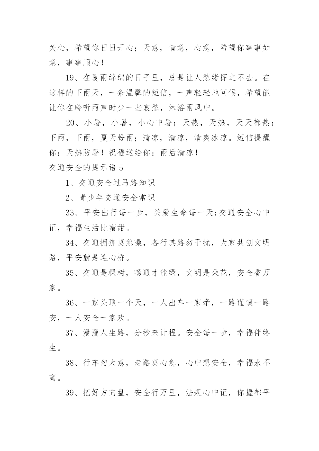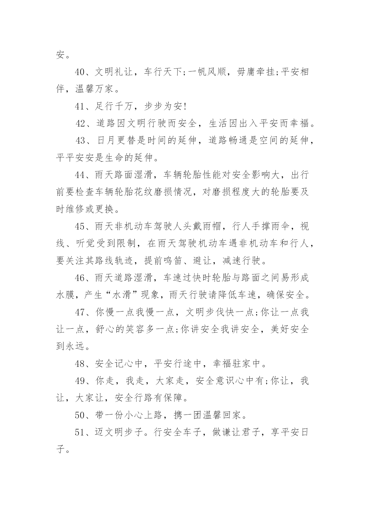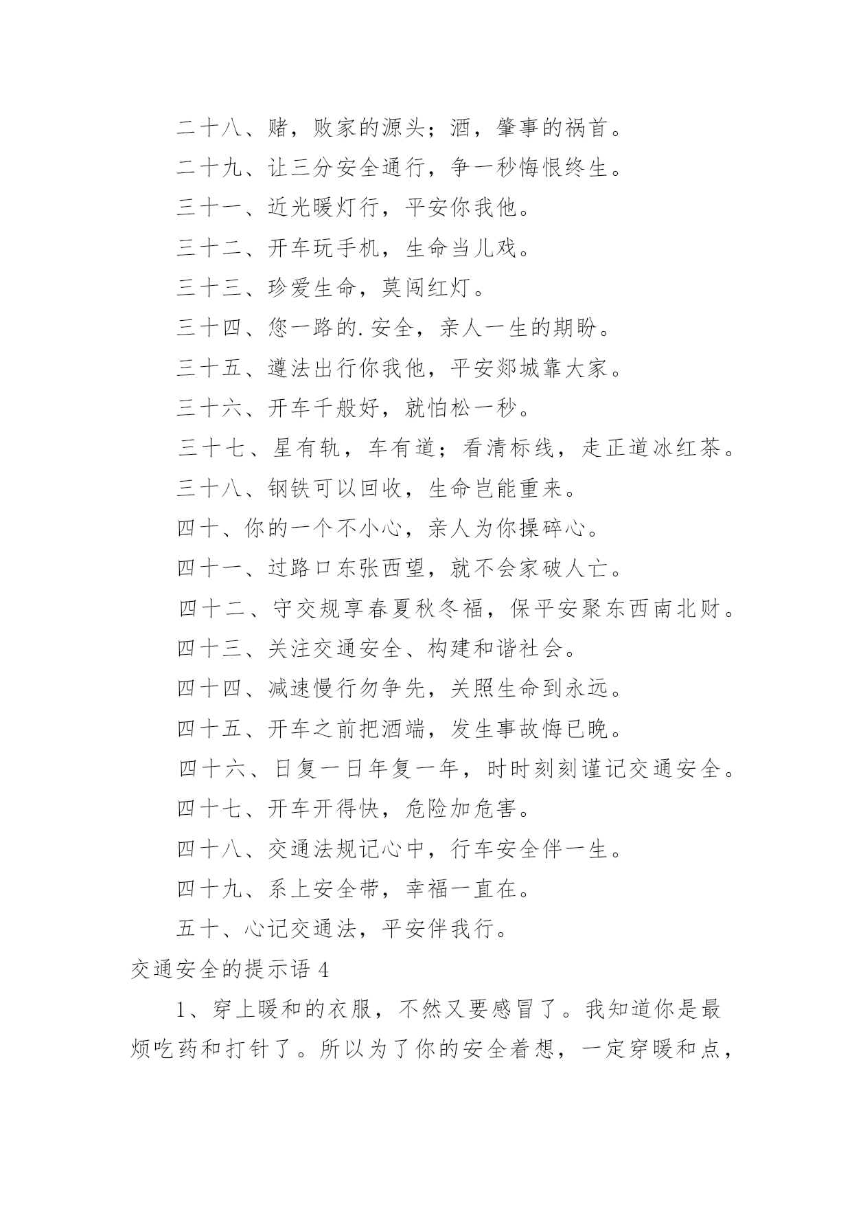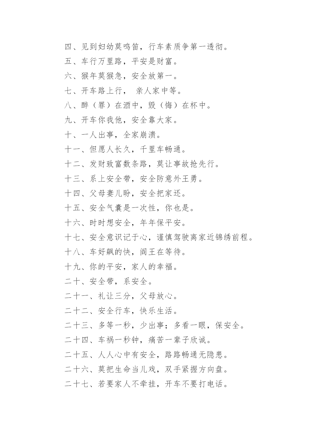 交通安全的提示语交通安全的提示语18篇在日常学习、工作和生活中,大家都看到过提示语吧,用日常通俗朴实的口语、俗语作为提示语。写起提示语来就毫无头绪?下面是小编收集整理的交通安全的提示语,欢迎阅读与收藏。交通安全的提示语11.交通拥挤莫急躁,各行其道勿干扰,大家共创文明路,平安就是连心桥!2.带一分小心上路,携一团温馨回家。3.安全出行,拐弯打铃。4.迈文明步子,行安全车子,做谦让君子,享平安日子。5.安全出行,拐弯打铃。6.头戴小黄帽上学必不可少。7.拐弯慢行,天下太平。8.别拿生命开玩笑,安全第一最重要。9.平安出行每一步,关爱生命每一天;交通安全心中记,幸福生活比蜜甜。10.安全记心中,平安行途中,幸福驻家中。11.要让爱车跑,车况要良好;开车别太快,系好安全带;出门要提前,堵车心不烦;行车要礼让,路口多张望;夜行勤变灯,车距要适中;时刻想安全,平安永相伴。12.安全是父母的寄托,安全是妻子的企盼,安全是朋友的祝福,安全是儿女的心愿。13.一家头顶一个天,一人出车一家牵,一路谨慎一路安,一人安全一家欢。14.红绿灯下车如潮,安全行驶最重要,彼此礼让守秩序,归途平安阖家笑。15.安全来自警惕,你我必须牢记。16.人过马路口,斑马线内走。17.红灯停绿灯行,交通安全我能行。18.手中方向盘,生命支配点;握好方向盘,幸福在眼前。19.世上的路千千万,安全行驶一线牵;生活的`情万万千,关爱生命才久远。20.遵规驾驶有速度,珍惜生命是成熟,出入平安是祝福,合家团圆享富足。21.让安全牢记心上,让生活洒满阳光。22.上学安全,放学团圆。23.你走,我走,大家走,安全意识心中有;你让,我让,大家让,安全行路有保障。24.天天讲交通安全不是玩笑。25.上车队伍齐,下车不拥挤。交通安全的提示语21.我先让,路宽畅;你先走,是朋友2.为了您和他人的幸福,请注意交通安全3.告别交通违章,建设交通文明4.严管是爱,放松是害,发生交通事故坑三代5.安全来自警惕,事故出于麻痹6.各级领导对交通安全负有第一位责任7.人病不开车,车病不上路8.享有交通权利时莫忘履行交通义务9.一慢二看三通过,麻痹抢行闯大祸10.维护交通秩序,遵守社会公德11.认真维修保养车辆,坚持一日“三检”制度12.经济以市场为本,交通以安全为先13.车行万里路,走好第一步14.骑车守秩序,行路讲公德15.高高兴兴上班来,平平安安回家去16.道路要畅通,秩序是保障17.开车莫喝酒,酒后莫开车18.但愿人长久,一路共平安19.每一天,您的'家人都祈盼您平安归来20.一生无事故,合家都幸福21.请您上下公共汽车时切勿从车前车后猛跑!22.骑车不带人,行驶不猛拐交通安全的提示语3一、手握方向盘,安全记心中鹏程。二、你醉了,家碎了。三、安全行驶,平安回家。四、见到妇幼莫鸣笛,行车素质争第一透彻。五、车行万里路,平安是财富。六、猴年莫猴急,安全放第一。七、开车路上行,亲人家中等。八、醉(罪)在酒中,毁(悔)在杯中。九、开车你我他,安全靠大家。十、一人出事,全家崩溃。十一、但愿人长久,千里车畅通。十二、发财致富数条路,莫让事故抢先行。十三、系上安全带,安全防意外王勇。十四、父母妻儿盼,安全把家还。十五、安全气囊是一次性,你也是。十六、时时想安全,年年保平安。十七、安全意识记于心,谨慎驾驶离家近锦绣前程。十八、车好飙的快,阎王在等待。十九、你的平安,家人的幸福。二十、安全带,系安全。二十一、礼让三分,父母放心。二十二、安全行车,快乐生活。二十三、多等一秒,少出事;多看一眼,保安全。二十四、车祸一秒钟,痛苦一辈子欣诚。二十五、人人心中有安全,路路畅通无隐患。二十六、莫把生命当儿戏,双手紧握方向盘。二十七、若要家人不牵挂,开车不要打电话。二十八、赌,败家的源头;酒,肇事的祸首。二十九、让三分安全通行,争一秒悔恨终生。三十一、近光暖灯行,平安你我他。三十二、开车玩手机,生命当儿戏。三十三、珍爱生命,莫闯红灯。三十四、您一路的.安全,亲人一生的期盼。三十五、遵法出行你我他,平安郯城靠大家。三十六、开车千般好,就怕松一秒。三十七、星有轨,车有道;看清标线,走正道冰红茶。三十八、钢铁可以回收,生命岂能重来。四十、你的一个不小心,亲人为你操碎心。四十一、过路口东张西望,就不会家破人亡。四十二、守交规享春夏秋冬福,保平安聚东西南北财。四十三、关注交通安全、构建和谐社会。四十四、减速慢行勿争先,关照生命到永远。四十五、开车之前把酒端,发生事故悔已晚。四十六、日复一日年复一年,时时刻刻谨记交通安全。四十七、开车开得快,危险加危害。四十八、交通法规记心中,行车安全伴一生。四十九、系上安全带,幸福一直在。五十、心记交通法,平安伴我行。交通安全的提示语41、穿上暖和的衣服,不然又要感冒了。我知道你是最烦吃药和打针了。所