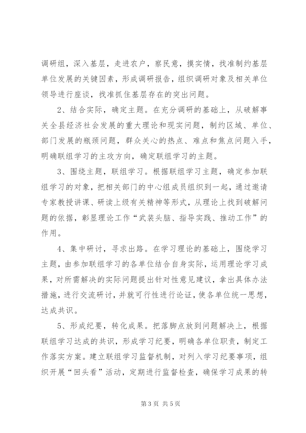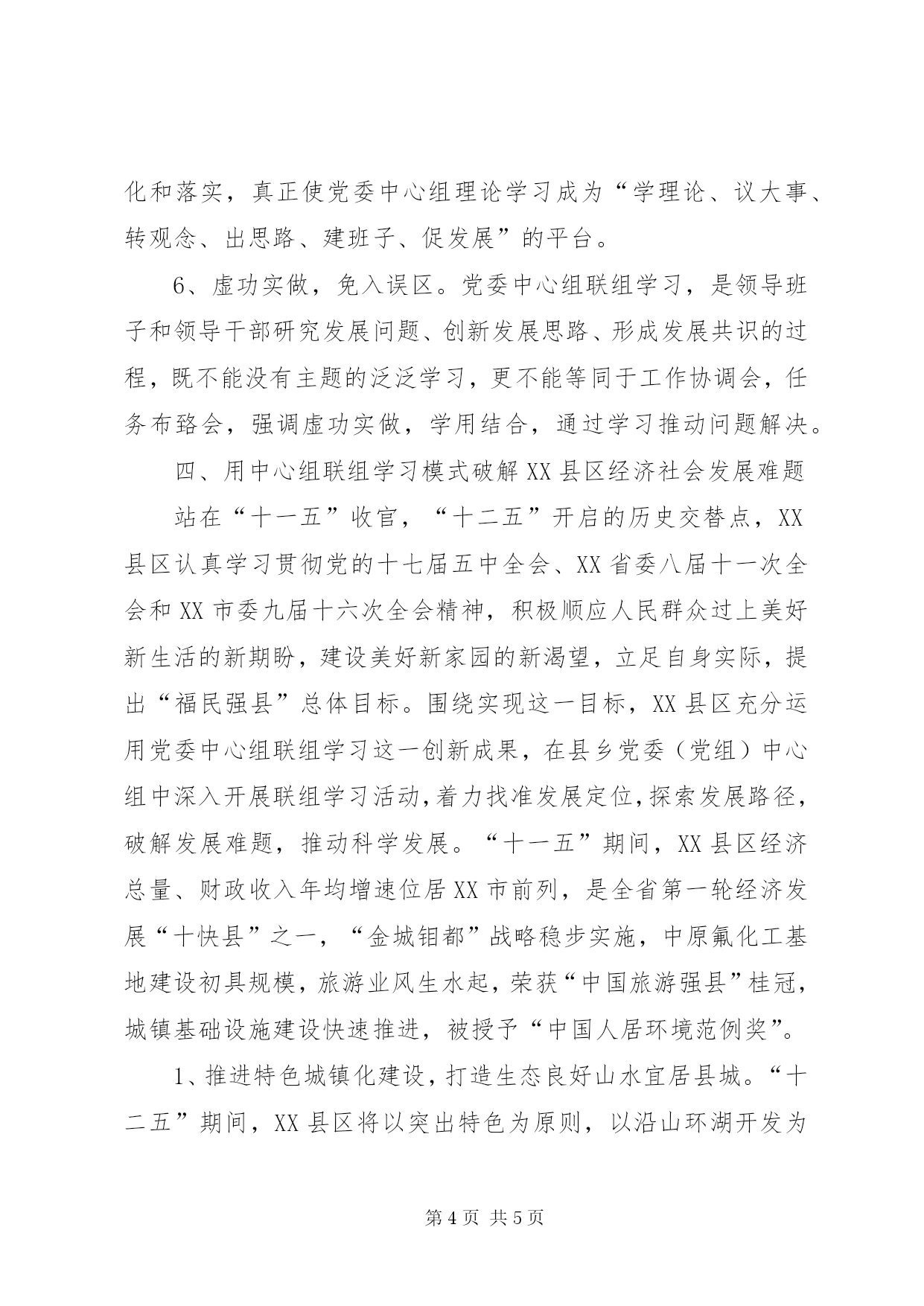 第PAGE\*Arabic\*MERGEFORMAT5页共NUMPAGES\*MERGEFORMAT5页理论武装工作总结20XX年,XX县区在扎实推进理论武装工作中,紧紧抓住县乡党委(党组)中心组学习龙头,创新中心组学习形式,用联组学习模式带动学习型党组织建设,提高各级领导班子和领导干部能力素质,破解XX县区经济社会发展中的难题,取得了显著成效。一、积极探索党委中心组联组学习新路子1、党委中心组联组学习的基本含义。XX县区党委中心组联组学习,是围绕一个主题,将几个关联单位中心组成员集中在一起,通过深入调研、集中学习和交流研讨等环节,使参学人员在深入调研中发现实际问题,在集体学习中掌握理论知识,在专题研讨中理清工作思路,在交流碰撞中转变思想观念,从而找准解决问题的办法,促使问题解决的一种新的学习模式。2、党委中心组联组学习的方法途径。XX县区分对上、对下和平行三个方向,在县委与市直单位之间,乡镇与县直单位之间,县直单位相互之间、企业党委与政府相关部门之间、乡镇与村支部之间,以及单位内部党组织之间,围绕转变经济发展方式、推进福民强县总体目标、建设生态良好山水宜居县城、打造XX县区百里文明长廊等主题,分别进行联组学习,在实践中不断拓宽联组学习活动的途径,推动联组学习在不同层级、不同行业、不同单位党委中心组之间广泛进行。同时,在联组学习方法上,XX县区充分运用实地调研、现场观摩、学习讲坛、专家辅导、座谈讨论、典型示范等多种方法,把联组学。门、哪一个单位能独自完成的,需要几个甚至多个部门形成合力。通过联组学习的形式,将相关单位中心组成员集中到一起,围绕一个主题进行学习研讨,变为学而学、坐而论道为言之有物、主题鲜明,变单一学习、工学脱钩为学用结合、解决问题,变各自为战、势单力薄为有机整合、形成合力,克服了一个单位单打独斗组织的弱点,实现了师资资源和学习对象的整合,达到集中力量智慧,找准问题症结,寻求破解良策,推动问题解决的目的。3、党委中心组联组学习,是提升党员领导干部理论水平和实践能力,推进学习型党组织建设的重要载体。参加联组学习的同志,基本上都是副科级以上领导干部。大家带着问题学习,学习为了解决问题,通过联组学习,集思广益、理清思路,统一思想,提高认识,找到解决问题的办法,促使问题最终得到解决。并且随着联组学习活动的深入开展,参学人员会不断接触新的联组学习单位,接受新的思想观念,接纳新的思路举措,在解决联组学习提出的实际问题的同时,对提升党员领导干部自身理论水平和实践能力,大力推进学习型党组织建设,也是一个良好的活动载体。三、党委中心组联组学习的组织方式1、深入调研,发现问题。联组学习前,联组单位成立专题调研组,深入基层,走进农户,察民意,摸实情,找准制约基层单位发展的关键因素,形成调研报告,组织调研对象及相关单位领导进行座谈,找准抓住基层存在的突出问题。2、结合实际,确定主题。在充分调研的基础上,从破解事关全县经济社会发展的重大理论和现实问题,制约区域、单位、部门发展的瓶颈问题,群众关心的热点、难点和焦点问题入手,明确联组学习的主攻方向,确定联组学习的主题。3、围绕主题,联组学习。根据联组学习主题,确定参加联组学习的对象,把相关部门的中心组成员组织到一起,通过邀请专家教授讲课、研读上级有关精神等形式,从理论上找到破解问题的依据,彰显理论工作“武装头脑、指导实践、推动工作”的作用。4、集中研讨,寻求出路。在学习理论的基础上,围绕学习主题,由参加联组学习的各单位结合自身实际,运用理论学习成果,对所需解决的实际问题提出针对性意见建议,拿出具体办法措施,进行交流研讨,并就可行性进行论证,使各单位统一思想,达成共识。5、形成纪要,转化成果。把落脚点放到问题解决上,根据联组学习达成的共识,形成学习纪要,明确各单位职责,制定工作落实方案。建立联组学习监督机制,对列入学习纪要事项,组织开展“回头看”活动,定期进行监督检查,确保学习成果的转化和落实,真正使党委中心组理论学习成为“学理论、议大事、转观念、出思路、建班子、促发展”的平台。6、虚功实做,免入误区。党委中心组联组学习,是领导班子和领导干部研究发展问题、创新发展思路、形成发展共识的过程,既不能没有主题的泛泛学习,更不能等同于工作协调会,任务布臵会,强调虚功实做,学用结合,通过学习推动问题解决。四、用中心组联组学习模式破解XX县区经济社会发展难题站在“十一五”收官,“十二五”开启的历史交替点,XX县区认真学习贯彻党的十七届五中全会、XX省委八届十一次全会和XX市委九届十六次全会精神,积极顺应人民群众过上美好新生活的新期盼,建设美好新家园的新渴望,立足自身实际,提出“福民强县”总体目标。围绕实现这一目标,XX县区充分运用党委中心组联组学习这一创新成果,在县乡党委(党组)中