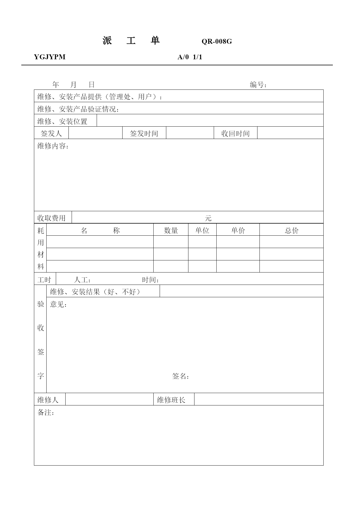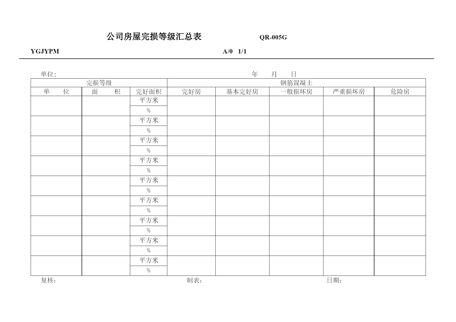 公共建筑设施保养计划QR-001GYGJYPMA/01/1单位:日期:序号保养项目保养周期上次保养时间计划保养时间保养人备注注:备注栏中应填写完成的时间及有关保养情况。公共建筑设施保养记录QR-002GYGJYPMA/01/1序号保养项目保养时间保养人保养内容备注注:备注栏中应填写完成保养情况。房屋分幢完损等级评定表QR-003GYGJYPMA/01/1名称:地址:编号:房屋情况完损标准分类结构部分装修部分设备部分评定等级地基基础承重结构非承重墙屋面楼地面门窗外墙面内墙面顶棚细木装修水卫电照特种设备阁名完好产别基本完好结构类别一般损坏建筑面积严重损坏建筑年代危险附记复核人:评定人:评定日期:房屋完损等级汇总表QR-004GYGJYPMA/01/1单位:地址:编号房屋名称建筑面积平方米产别钢筋混凝土结构(平方米)完好房基本完好房一般损坏房严重损坏房危险房复核:制表:日期:公司房屋完损等级汇总表QR-005GYGJYPMA/01/1单位:年月日完损等级钢筋混凝土单位面积完好面积完好房基本完好房一般损坏房严重损坏房危险房平方米%平方米%平方米%平方米%平方米%平方米%平方米%平方米%平方米%复核:制表:日期:维修回访记录QR-006GYGJYPMA/01/1单位:年月序号回访项目地点派工单号派工日期回访情况回访人回访日期业主意见(签名)备注维修记录QR-007GYGJYPMA/01/1单位:年月序号日期时间地点维修项目维修人维修结果备注注:此表格与派工单联合使用。派工单QR-008GYGJYPMA/01/1年月日编号:维修、安装产品提供(管理处、用户):维修、安装产品验证情况:维修、安装位置签发人签发时间收回时间维修内容:收取费用元耗用材料名称数量单位单价总价工时人工:时间:验收签字维修、安装结果(好、不好)意见:签名:维修人维修班长备注:维修统计表QR-009GYGJYPMA/01/1单位:年月派工单编号报修签发时间维修上楼时间派工单收回时间工时维修时间要求维修结果有无返修业主意见人次时间统计:本月维修及时率=及时维修次数/总派工单数=/=%维修合格率=合格维修次数/总派工单数=/=%维修返修率=维修返修次数/总派工单数=/=%注:“维修时间要求”参照《维修服务标准》周巡视记录QR-010GYGJYPMA/01/1日期:巡视人:序号巡视项目巡视情况备注01水泵房02低压配电房03发电机房04消防中心05大堂06标准层楼道07天台08地下室09车道10人行道11公共天线12公共照明13公共开关、插座14公共墙(地)面15天花、吊顶16公共门窗17车场路线及标牌18花园护栏19喷水池20管线21阀门22油漆23污水井24雨水井25化粪池262728分包商初审记录QR-011GYGJYPMA/01/1分包商名称:项目名称:初审时间:评审地点:参加人员:初审内容合格不合格①分包商具有资质证书或营业执照。②分包商现有的施工机械、设备及人员素质情况良好。③分包商组织机构可靠。④分包商有一定的固定资产。⑤分包商有同类工程的施工经验。⑥分包商价格合理、工期能保证。⑦分包商在质量及安全方面具有良好信誉。⑧分包商所用的材料质量可靠。⑨施工方案充分考虑对环境影响。工程部主管意见:签名:日期:分管副总经理意见:签名:日期:注:初审时,只要有一项评审为否,则不能列入合格供应商名单。分包商复审记录QR-012GYGJYPMA/01/1分包商名称:项目名称:复审周期:复审日期:评审地点:参加人员:复审内容合格不合格①分包商具有资质证书或营业执照。②分包商现有的施工机械、设备及人员素质情况良好。③分包商组织机构可靠。④分包商有一定的固定资产。⑤分包商有同类工程的施工经验。⑥分包商价格合理,能按期完成工程。⑦分包商工程质量可靠,能安全施工。⑧分包商所用的材料质量可靠。⑨对所做工程按项目标准验收合格。⑩专项检验记录中不合格率11施工期间有无对环境造成严重不良影响,有无投投诉工程部主管意见:签名:日期:分管副总经理意见:签名:日期:注:复审时,只要有一项评审为不合格,则不能列入合格供应商名单。专项检验记录不合格率达到20%,则此项为不合格。合格分包商名单QR-013GYGJYPMA/01/1单位:年月日分包商编号分包商名称所做工程项目评审日期评审结果负责人审核人备注说明:评审结果填写合格、不合格。工程竣工验收证明QR-014GYGJYPMA/01