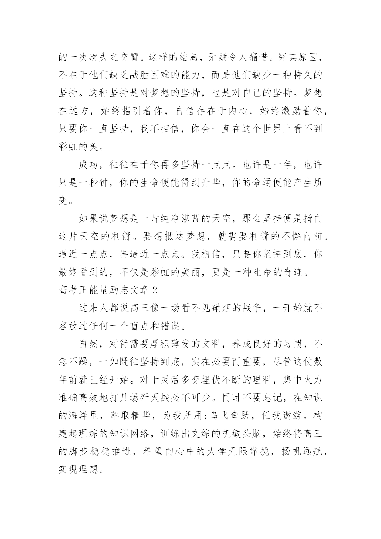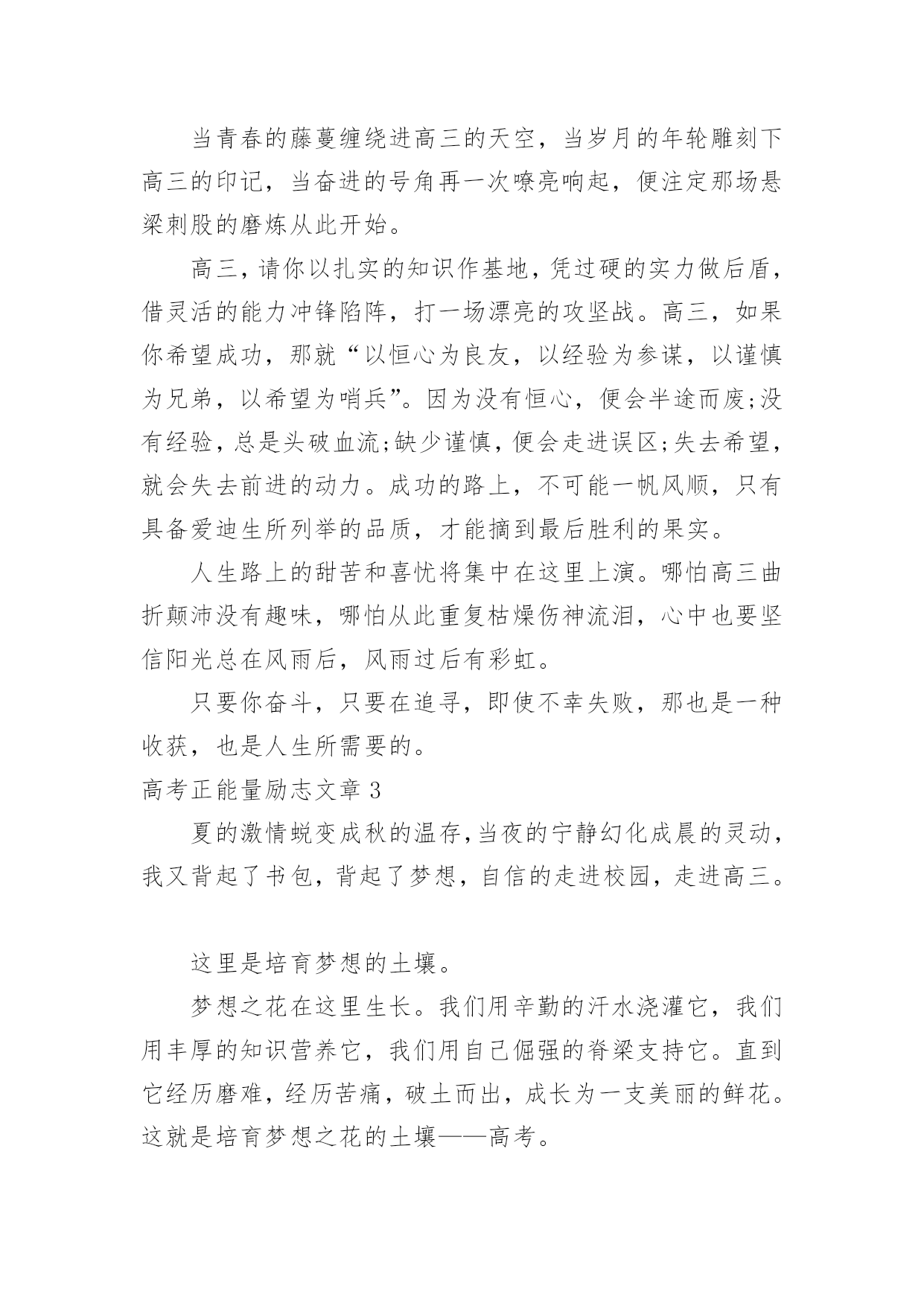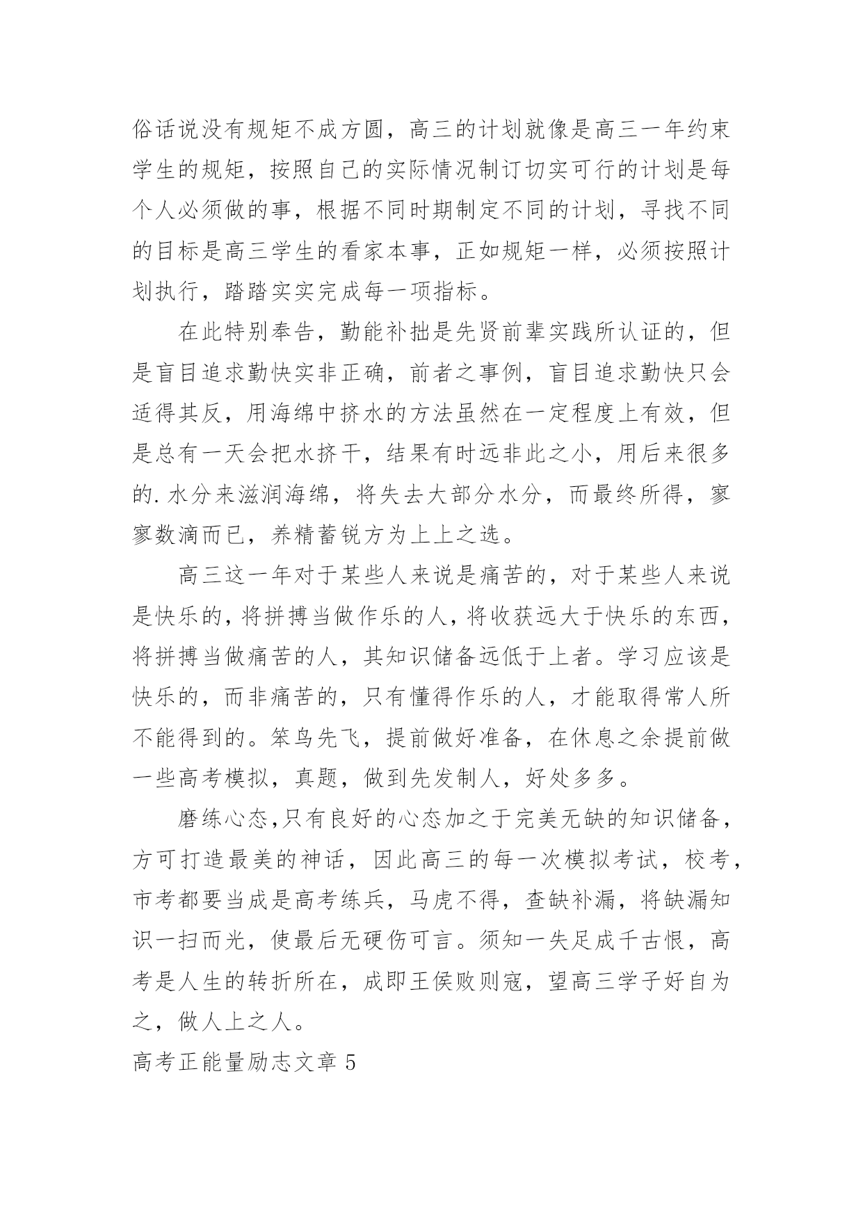 高考正能量励志文章高考正能量励志文章高考正能量励志文章1青春,是一个寻梦的过程。我们十几岁的生命中,总是充满五彩斑斓的梦境,沿着各种对未来的憧憬指向远方,给我们指明前进的道路。这些梦境就仿佛暗夜中的灯火,即便不能带来足够的明亮和温暖,但已足以带给我们无限的希望。有时候,心中能始终存有一线希望,便很珍贵。因为在青春这条明媚而又略带迷茫的道路上,总少不了雨打风吹,总绕不过各种弯路和挫折,总是难以避免失败和疼痛的侵袭。我们往往容易在这样的时刻放弃了对困苦的忍耐,放弃了对远方的追逐,也最终放弃了仅剩的希望。这个时候,我们就很需要对梦想的坚持。我们的内心深处需要始终留下这样一份空间,来永久存放我们的梦想。无论风有多狂,雨有多大,我们都需要坚定地仰望那一片梦想的天空,相信它一如既往的湛蓝,相信风雨之后,那里会出现绚丽的彩虹,来慰藉我们曾经的伤痕累累,来慰藉那些坚强的永不破灭的梦。然而,虽然很多人也明白,风雨过后会有美丽的彩虹,但是他们往往容易在大雨中迷失方向,在困难的重压下开始一蹶不振,在失败面前选择了止步不前。这样下去,他们就永远丧失了欣赏彩虹的美丽的机会,也就等于选择了与成功的一次次失之交臂。这样的结局,无疑令人痛惜。究其原因,不在于他们缺乏战胜困难的能力,而是他们缺少一种持久的坚持。这种坚持是对梦想的坚持,也是对自己的坚持。梦想在远方,始终指引着你,自信存在于内心,始终激励着你,只要你一直坚持,我不相信,你会一直在这个世界上看不到彩虹的美。成功,往往在于你再多坚持一点点。也许是一年,也许只是一秒钟,你的生命便能得到升华,你的命运便能产生质变。如果说梦想是一片纯净湛蓝的天空,那么坚持便是指向这片天空的利箭。要想抵达梦想,就需要利箭的不懈向前。逼近一点点,再逼近一点点。我相信,只要你坚持到底,你最终看到的,不仅是彩虹的美丽,更是一种生命的奇迹。高考正能量励志文章2过来人都说高三像一场看不见硝烟的战争,一开始就不容放过任何一个盲点和错误。自然,对待需要厚积薄发的文科,养成良好的习惯,不急不躁,一如既往坚持到底,实在必要而重要,尽管这仗数年前就已经开始。对于灵活多变埋伏不断的理科,集中火力准确高效地打几场歼灭战必不可少。同时不要忘记,在知识的海洋里,萃取精华,为我所用;鸟飞鱼跃,任我遨游。构建起理综的知识网络,训练出文综的机敏头脑,始终将高三的脚步稳稳推进,希望向心中的大学无限靠拢,扬帆远航,实现理想。当青春的藤蔓缠绕进高三的天空,当岁月的年轮雕刻下高三的印记,当奋进的号角再一次嘹亮响起,便注定那场悬梁刺股的磨炼从此开始。高三,请你以扎实的知识作基地,凭过硬的实力做后盾,借灵活的能力冲锋陷阵,打一场漂亮的攻坚战。高三,如果你希望成功,那就“以恒心为良友,以经验为参谋,以谨慎为兄弟,以希望为哨兵”。因为没有恒心,便会半途而废;没有经验,总是头破血流;缺少谨慎,便会走进误区;失去希望,就会失去前进的动力。成功的路上,不可能一帆风顺,只有具备爱迪生所列举的品质,才能摘到最后胜利的果实。人生路上的甜苦和喜忧将集中在这里上演。哪怕高三曲折颠沛没有趣味,哪怕从此重复枯燥伤神流泪,心中也要坚信阳光总在风雨后,风雨过后有彩虹。只要你奋斗,只要在追寻,即使不幸失败,那也是一种收获,也是人生所需要的。高考正能量励志文章3夏的激情蜕变成秋的温存,当夜的宁静幻化成晨的灵动,我又背起了书包,背起了梦想,自信的走进校园,走进高三。这里是培育梦想的土壤。梦想之花在这里生长。我们用辛勤的汗水浇灌它,我们用丰厚的知识营养它,我们用自己倔强的脊梁支持它。直到它经历磨难,经历苦痛,破土而出,成长为一支美丽的鲜花。这就是培育梦想之花的土壤——高考。我不得不承认,在高考面前我们都显得如履薄冰。因为我们的梦想之花能否美丽动人都要看能否冲出土壤的束缚。我们背负的不仅是自己的前程,还有众多关心和爱护我们的人的殷切期盼。基于这些,破土而出就更显得意义非凡。高强度的学习让我们疲惫不堪,多种类的压力让我们战战兢兢。但是,风雨不能将阳光打败。尽管求学之路备尝艰辛,但在这孤独与寂寞中我们也看到、听到、体会到充实的快乐:老师的敬业奉献,和蔼可亲;同学的友善鼓励,互帮互助;还有学习过程中获得的小小成就。这不就是痛苦并快乐着吗?其实,面对高三,面对高考,为何不将它们理解成是完美人生的宝贵历程。在孤独而寂寞的高三中,我们懂得珍惜昔日以及未来的幸福,我们铭记了奋斗与汗水。这些在别的地方所获得不了的真谛,经历高三后才会得到。其实,高考也很可爱。它就像我们在金字塔中玩的一种叫高考的游戏,这是一种要求勇士们全副武装、全力拼搏的探险游戏。在游戏中,我们明白了什么是奋斗,什么是坚持。有人说高考是魔鬼,它让你倾尽全力却一无所得。但我说,高考是天使,它让你在努力中成就梦想,在困厄中指明方向,即使失败了,天使也会为你人