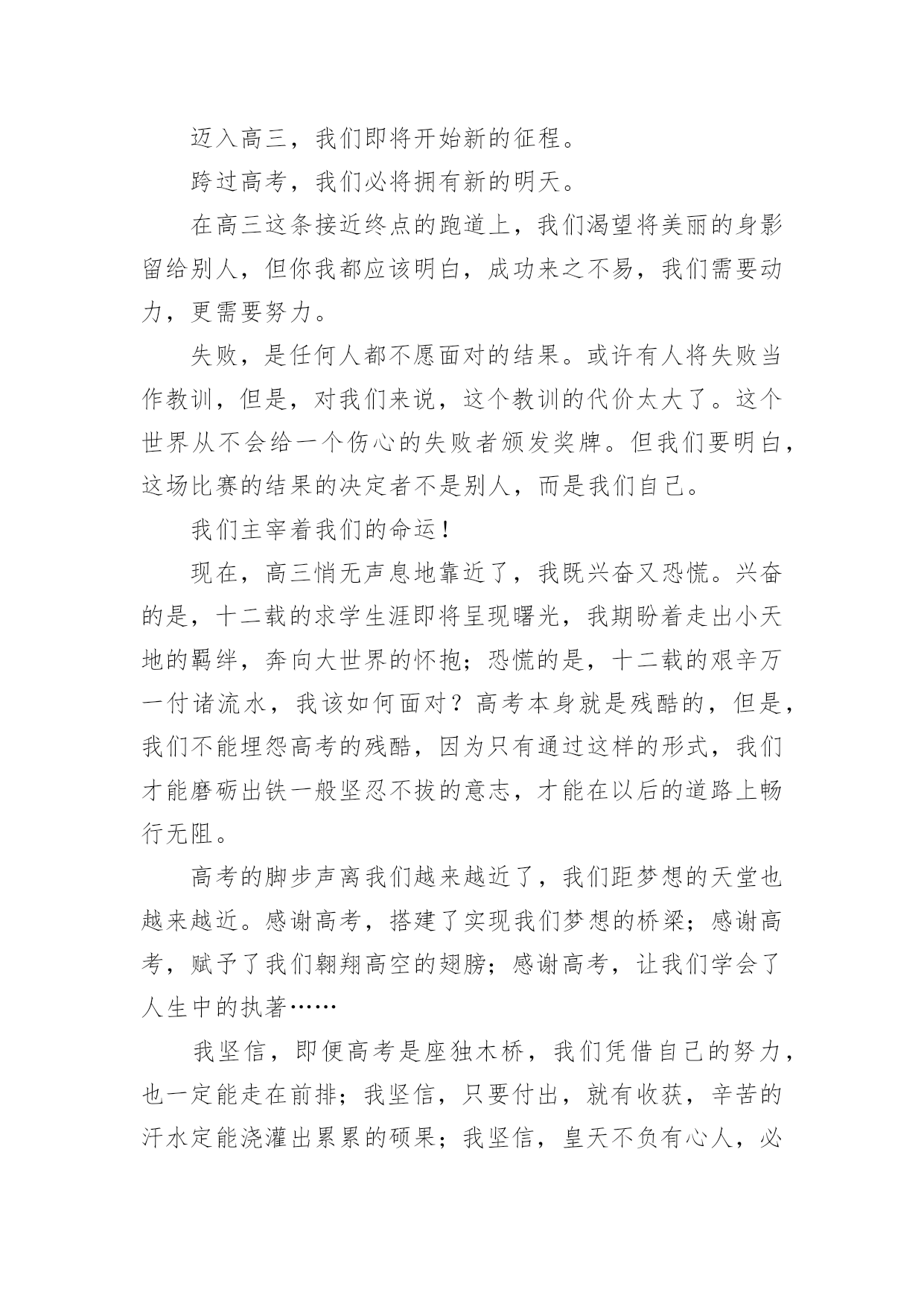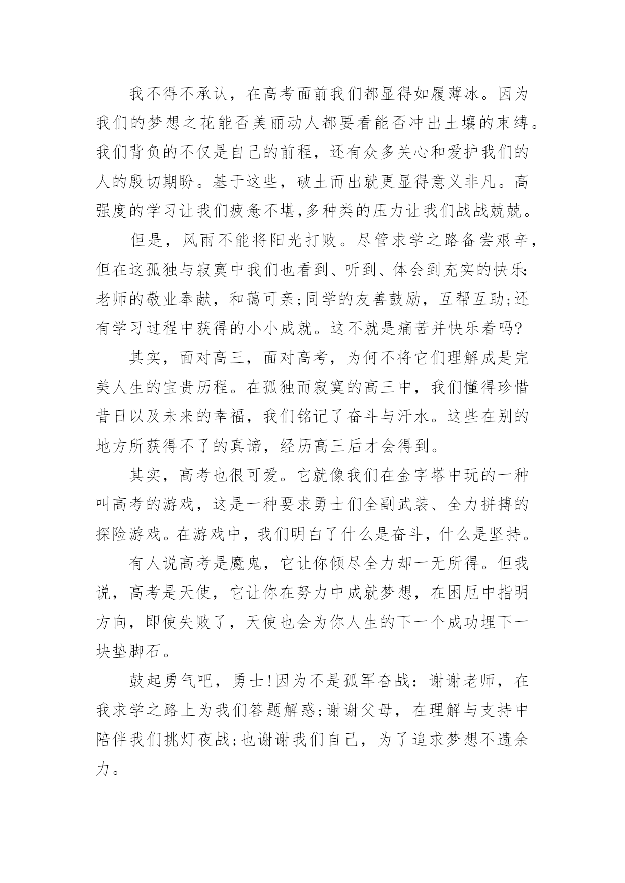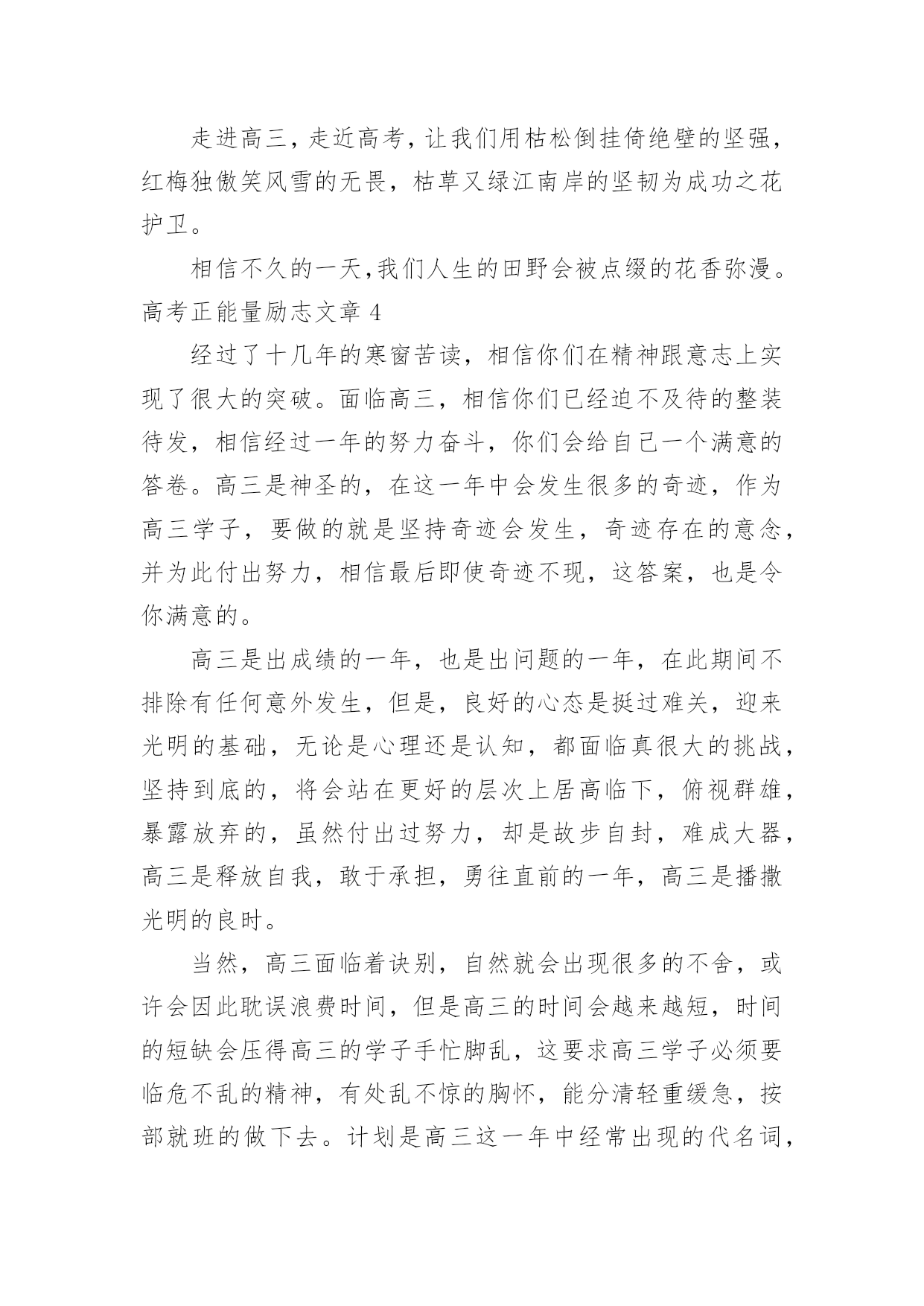 高考正能量励志文章高考正能量励志文章高考正能量励志文章1青春,是一个寻梦的过程。我们十几岁的生命中,总是充满五彩斑斓的梦境,沿着各种对未来的憧憬指向远方,给我们指明前进的道路。这些梦境就仿佛暗夜中的灯火,即便不能带来足够的明亮和温暖,但已足以带给我们无限的希望。有时候,心中能始终存有一线希望,便很珍贵。因为在青春这条明媚而又略带迷茫的道路上,总少不了雨打风吹,总绕不过各种弯路和挫折,总是难以避免失败和疼痛的侵袭。我们往往容易在这样的时刻放弃了对困苦的忍耐,放弃了对远方的追逐,也最终放弃了仅剩的希望。这个时候,我们就很需要对梦想的坚持。我们的内心深处需要始终留下这样一份空间,来永久存放我们的梦想。无论风有多狂,雨有多大,我们都需要坚定地仰望那一片梦想的天空,相信它一如既往的湛蓝,相信风雨之后,那里会出现绚丽的彩虹,来慰藉我们曾经的伤痕累累,来慰藉那些坚强的永不破灭的梦。然而,虽然很多人也明白,风雨过后会有美丽的彩虹,但是他们往往容易在大雨中迷失方向,在困难的重压下开始一蹶不振,在失败面前选择了止步不前。这样下去,他们就永远丧失了欣赏彩虹的美丽的机会,也就等于选择了与成功的一次次失之交臂。这样的结局,无疑令人痛惜。究其原因,不在于他们缺乏战胜困难的能力,而是他们缺少一种持久的坚持。这种坚持是对梦想的坚持,也是对自己的坚持。梦想在远方,始终指引着你,自信存在于内心,始终激励着你,只要你一直坚持,我不相信,你会一直在这个世界上看不到彩虹的美。成功,往往在于你再多坚持一点点。也许是一年,也许只是一秒钟,你的生命便能得到升华,你的命运便能产生质变。如果说梦想是一片纯净湛蓝的天空,那么坚持便是指向这片天空的利箭。要想抵达梦想,就需要利箭的不懈向前。逼近一点点,再逼近一点点。我相信,只要你坚持到底,你最终看到的,不仅是彩虹的美丽,更是一种生命的奇迹。高考正能量励志文章2过来人都说高三像一场看不见硝烟的战争,一开始就不容放过任何一个盲点和错误。自然,对待需要厚积薄发的文科,养成良好的习惯,不急不躁,一如既往坚持到底,实在必要而重要,尽管这仗数年前就已经开始。对于灵活多变埋伏不断的理科,集中火力准确高效地打几场歼灭战必不可少。同时不要忘记,在知识的海洋里,萃取精华,为我所用;鸟飞鱼跃,任我遨游。构建起理综的知识网络,训练出文综的机敏头脑,始终将高三的脚步稳稳推进,希望向心中的大学无限靠拢,扬帆远航,实现理想。当青春的藤蔓缠绕进高三的天空,当岁月的年轮雕刻下高三的印记,当奋进的号角再一次嘹亮响起,便注定那场悬梁刺股的磨炼从此开始。高三,请你以扎实的知识作基地,凭过硬的实力做后盾,借灵活的能力冲锋陷阵,打一场漂亮的攻坚战。高三,如果你希望成功,那就“以恒心为良友,以经验为参谋,以谨慎为兄弟,以希望为哨兵”。因为没有恒心,便会半途而废;没有经验,总是头破血流;缺少谨慎,便会走进误区;失去希望,就会失去前进的动力。成功的路上,不可能一帆风顺,只有具备爱迪生所列举的品质,才能摘到最后胜利的果实。人生路上的甜苦和喜忧将集中在这里上演。哪怕高三曲折颠沛没有趣味,哪怕从此重复枯燥伤神流泪,心中也要坚信阳光总在风雨后,风雨过后有彩虹。只要你奋斗,只要在追寻,即使不幸失败,那也是一种收获,也是人生所需要的。高考正能量励志文章3夏的激情蜕变成秋的温存,当夜的宁静幻化成晨的灵动,我又背起了书包,背起了梦想,自信的走进校园,走进高三。这里是培育梦想的土壤。梦想之花在这里生长。我们用辛勤的汗水浇灌它,我们用丰厚的知识营养它,我们用自己倔强的脊梁支持它。直到它经历磨难,经历苦痛,破土而出,成长为一支美丽的鲜花。这就是培育梦想之花的土壤——高考。我不得不承认,在高考面前我们都显得如履薄冰。因为我们的梦想之花能否美丽动人都要看能否冲出土壤的束缚。我们背负的不仅是自己的前程,还有众多关心和爱护我们的人的殷切期盼。基于这些,破土而出就更显得意义非凡。高强度的学习让我们疲惫不堪,多种类的压力让我们战战兢兢。但是,风雨不能将阳光打败。尽管求学之路备尝艰辛,但在这孤独与寂寞中我们也看到、听到、体会到充实的快乐:老师的敬业奉献,和蔼可亲;同学的友善鼓励,互帮互助;还有学习过程中获得的小小成就。这不就是痛苦并快乐着吗?其实,面对高三,面对高考,为何不将它们理解成是完美人生的宝贵历程。在孤独而寂寞的高三中,我们懂得珍惜昔日以及未来的幸福,我们铭记了奋斗与汗水。这些在别的地方所获得不了的真谛,经历高三后才会得到。其实,高考也很可爱。它就像我们在金字塔中玩的一种叫高考的游戏,这是一种要求勇士们全副武装、全力拼搏的探险游戏。在游戏中,我们明白了什么是奋斗,什么是坚持。有人说高考是魔鬼,它让你倾尽全力却一无所得。但我说,高考是天使,它让你在努力中成就梦想,在困厄中指明方向,即使失败了,天使也会为你人