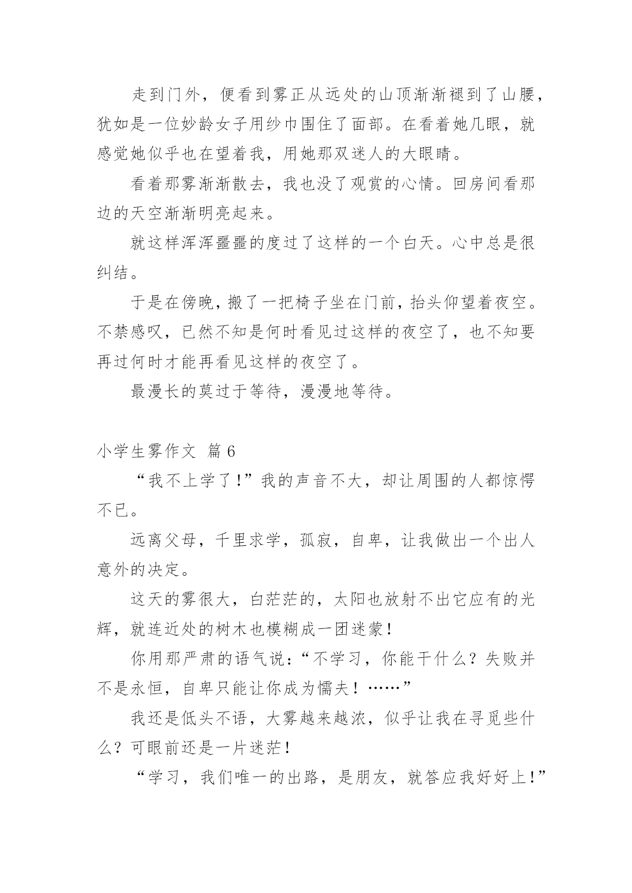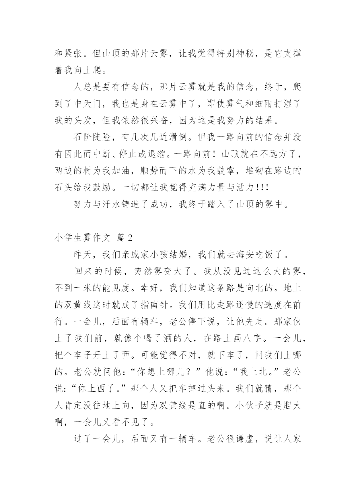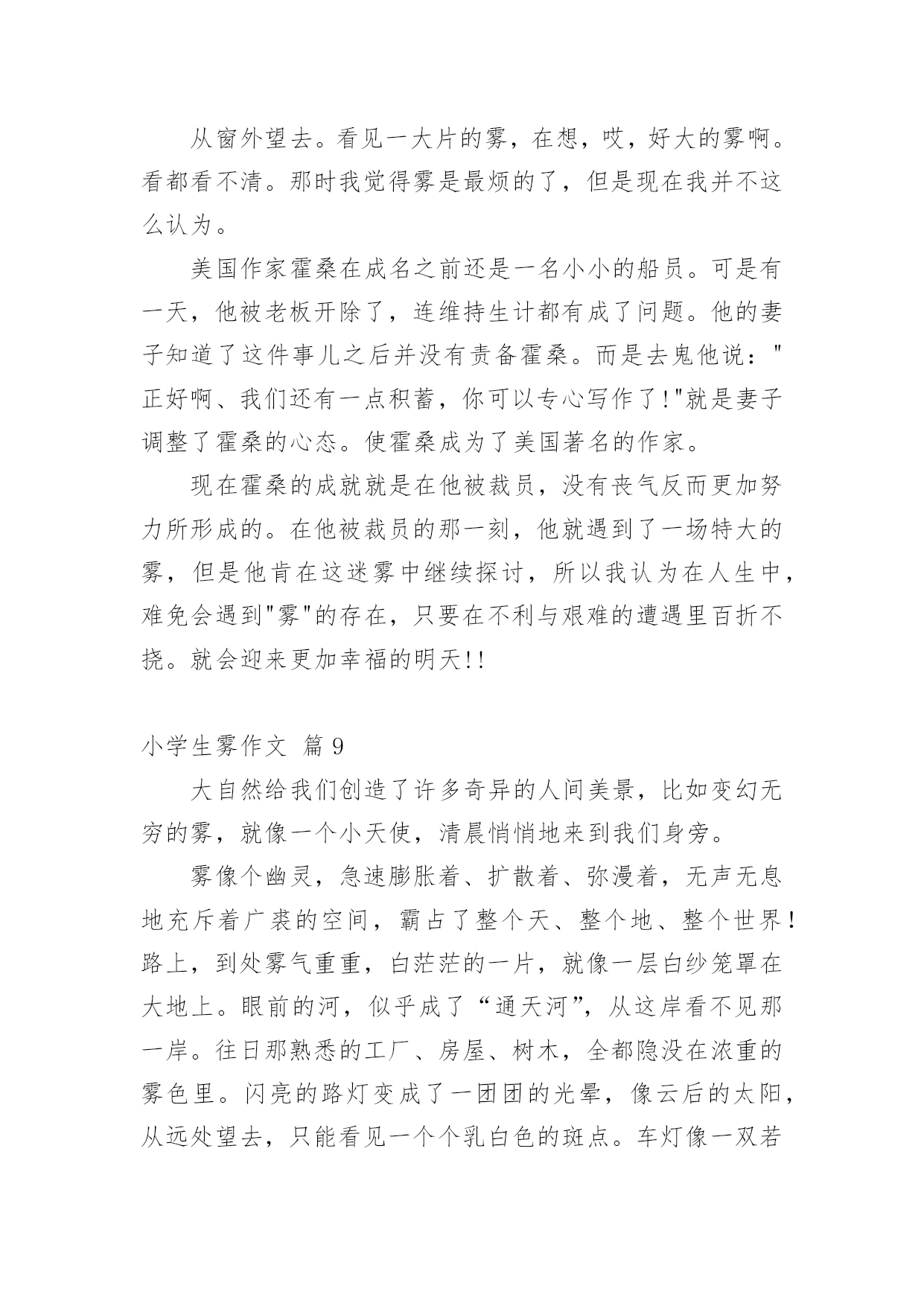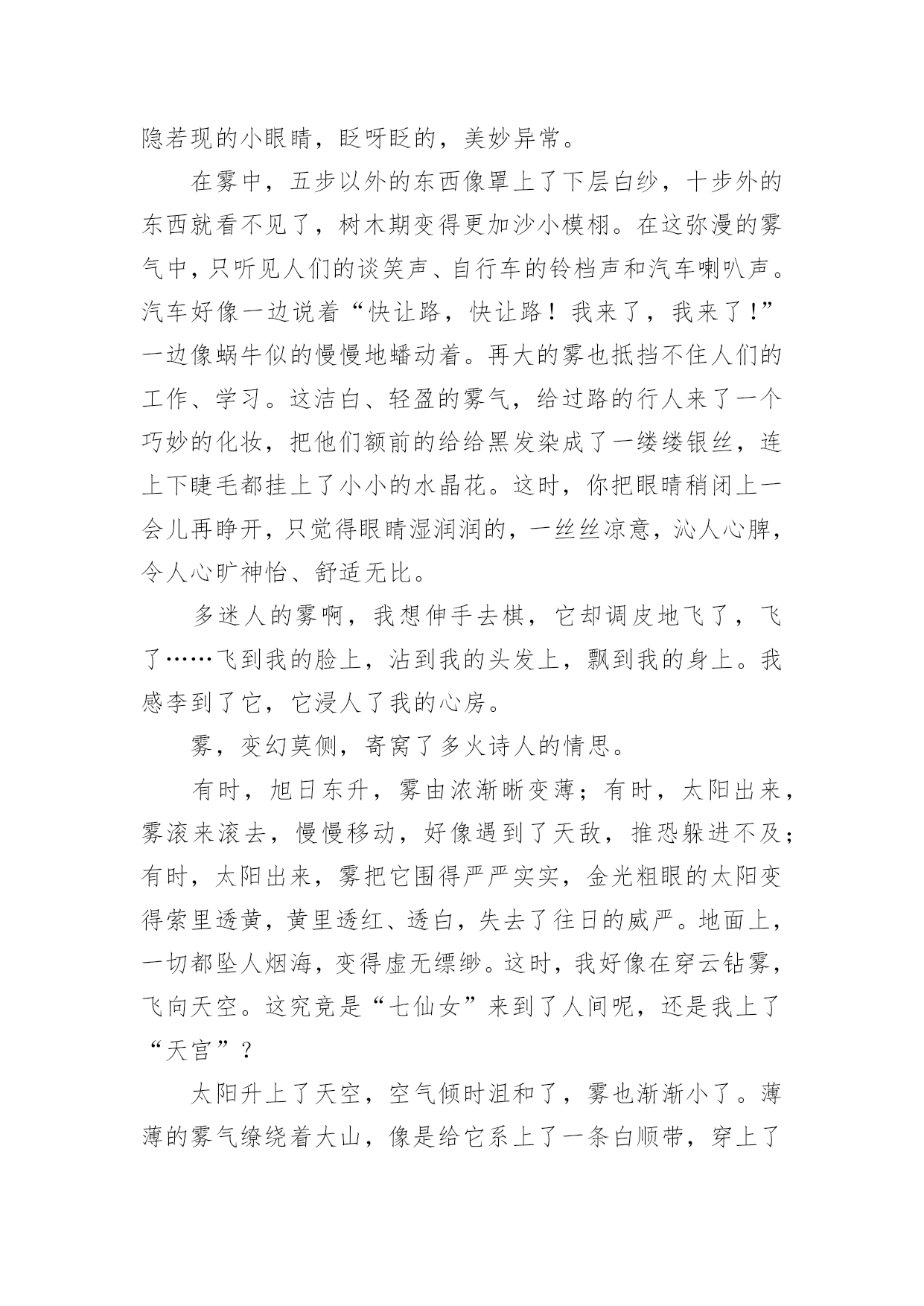 小学生雾作文精选小学生雾作文合集9篇无论在学习、工作或是生活中,大家对作文都再熟悉不过了吧,借助作文人们可以实现文化交流的目的。作文的注意事项有许多,你确定会写吗?以下是小编整理的小学生雾作文9篇,供大家参考借鉴,希望可以帮助到有需要的朋友。小学生雾作文篇1雾凇沆砀,山顶云雾缭绕,不见曦月。题记几天的准备后,我们终于踏上了旅程。天空中几片乌云,随风飘移,淅淅沥沥的小雨终于还是落下,路旁的树被染得碧绿,这时的树,比新生时浓郁,比苍老时富有活力。目光移动着,欣赏着富有生机的绿色;车在移动着,飞驰过片片绿色。到达了我们的目的地泰山。在山脚下吃过午饭后,我们开始了登山。妈妈说,原来她的姥姥来爬山时,4000多次台阶,一级一级的磕头,直到山顶。我都不敢想象,到了山顶时他们的样子,那是封建思想带给他们的痛苦。知识改变命运,真的是这样的,无论在什么时候,什么地方。不知不觉,已至山腰,山雨开始下起来了,密密的,就像是一张密织的网,天空的阴暗,山雨的细密,抬头是一望无际的台阶和巨大的山石,这一切都让我觉得有莫名的恐惧和紧张。但山顶的那片云雾,让我觉得特别神秘,是它支撑着我向上爬。人总是要有信念的,那片云雾就是我的信念,终于,爬到了中天门,我也是身在云雾中了,即使雾气和细雨打湿了我的头发,但我依然很兴奋,因为这是我努力的结果。石阶陡险,有几次几近滑倒。但我一路向前的信念并没有因此而中断、停止或退缩。一路向前!山顶就在不远方了,两边的树为我加油,顺势而下的水为我鼓掌,堆砌在路边的石头给我鼓励。一切都让我觉得充满力量与活力!!!努力与汗水铸造了成功,我终于踏入了山顶的雾中。小学生雾作文篇2昨天,我们亲戚家小孩结婚,我们就去海安吃饭了。回来的时候,突然雾变大了。我从没见过这么大的雾,不到一米的能见度。幸好,我们知道这条路是向北的。地上的双黄线这时就成了指南针。我们用比走路还慢的速度在前行。一会儿,后面有辆车,老公停下说,让他先走。那家伙上了我们前,就像个喝了酒的人,在路上画八字。一会儿,把个车子开上了西。可能觉得不对,就下车了,问我们上哪的。老公就问他:“你想上哪儿?”他说:“我上北。”老公说:“你上西了。”那个人又把车掉过头来。我们就猜,那个人肯定没往地上向,因为双黄线是直的啊。小伙子就是胆大啊,一会儿又看不见了。过了一会儿,后面又有一辆车。老公很谦虚,说让人家先走,看见人家的尾灯我们就看见路了。后面的人见我们歇下来了,他也停了下来,问我们:“你们怎么不走呢?”我们一听,原来是跟我们一起吃饭的人。老公说:“你们上前吧。”这个人也没推让,说:“我就按着双黄线走的啊。”跟在别人后面就是好啊,可以看见前方一点的路,不要担心前面有什么。老公说:“如果来的时候,有这么大的雾,我一定不来吃这顿饭。”没有在黑夜的雾霾中走过的人,真的没法理解这种恐惧!小学生雾作文篇3今天打开门一看,起雾了,雾好大啊,到处白茫茫的,美丽极了。我穿上外套,跑到屋外和大雾来了个亲密接触,远处的大树·楼房、都消失了,路边的小草上有许多小水珠,轻轻一吹水珠滚走了,到处都湿漉漉的。今天的雾太浓了,几米远的地方就看不清楚,走在大街上,只听见脚步声却看不到人,路上的车子也都打开了灯,放慢了速度,不时地向喇叭,象蜗牛一样前进的。骑自行车的人们,眉毛都白了,真是太有趣了。八点左右的时候,太阳慢慢出来了,今天的太阳一点也不刺眼,慢慢的不知不觉雾悄悄地溜走了。今天的雾真是太美了。小学生雾作文篇4早上我刚一起床,就被窗外的风景迷住了。在浓雾的笼照下,整个城市都被一层白茫茫的面纱所笼照,看不清他的真面目。几座巨大的建筑物若隐若现,远处的山峰在雾气中露出模糊的身影,显得那么的神秘,似乎隐藏着巨大的秘密。在那白色的世界里有神仙在游玩吗?马路上行驶的汽车好象是神仙用法力改装过的玩具,我很想跟随他们穿过那片白茫茫的世界,可惜那地方就是躲着我,就象二块同性相斥的磁铁,永远无法靠近。慢慢地,太阳出来了,雾气也逐渐的散去,天地又露出来原来的模样。篇四:清晨的雾_200字早晨,我透过窗户,看见外面模模糊糊的,我用手指在窗户上写字,咦!原来外面起雾了,雾像一层薄薄的白纱,连近处的房子和屋前的大树都变得隐隐约约的,有点“人间仙境”的感觉。我去上学的路上,忽然下起雨来,雨就像一个“魔术师”,刚才还觉得若隐若现的街道,马上变得清晰起来,一开始路上的行人都东张西望,慢慢的行走,现在一下子都加快了步伐,街道又像平日里一样热闹了!篇五:雾_250字早晨推开门一看,“哇,好美呀!”门前的树木呀,房屋呀隐隐约约地站立在那儿,以往,地球妈妈会穿上一件蓝纱衣,今天怎么变成白纱裙啦?哦,原来地球妈妈昨天去宇宙多多衣城了,她被那里的新款式——白纱裙深深吸引住了,她把它买下来了,本来是想参加舞会穿的,可她和我一样耐不住性子,今天一大早就穿上了。咦,