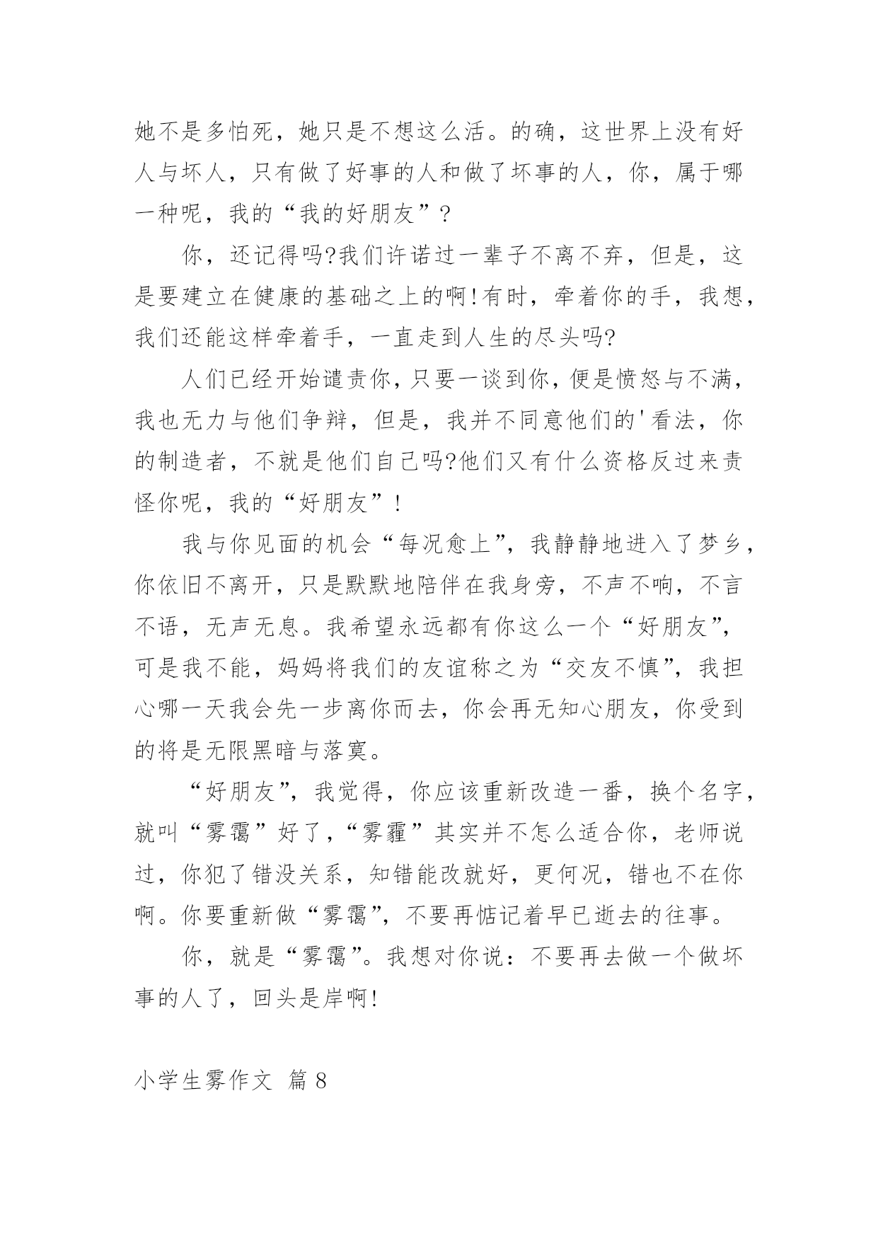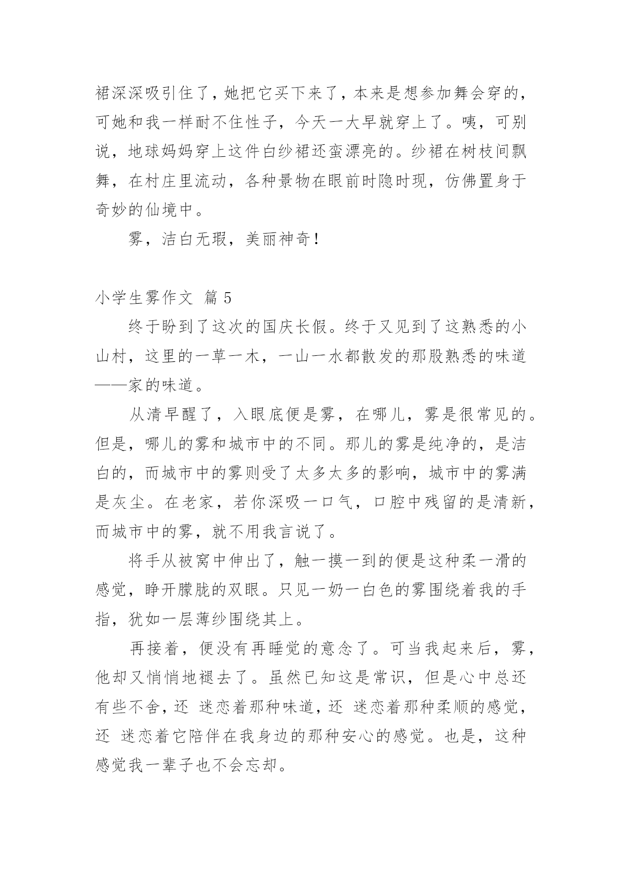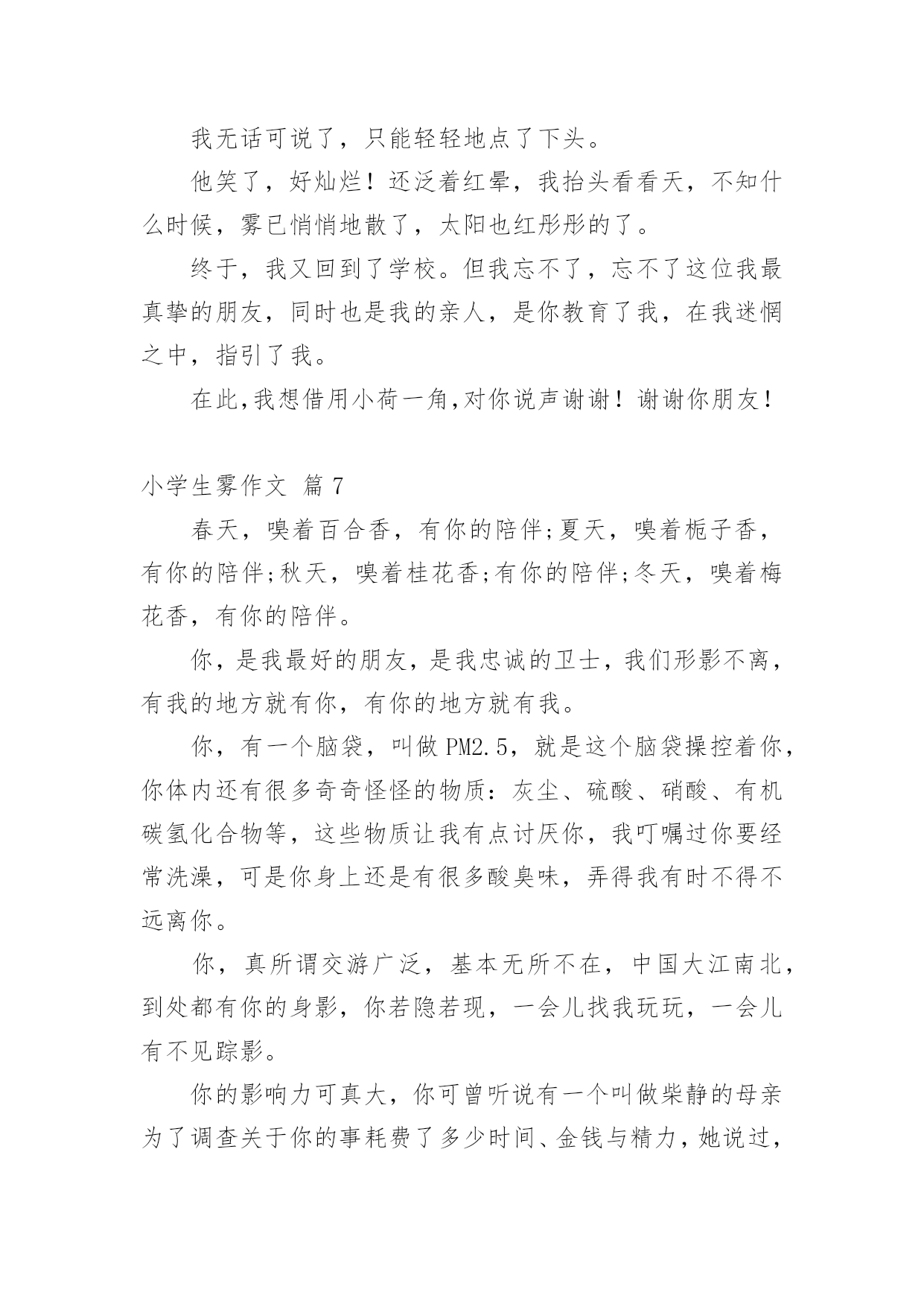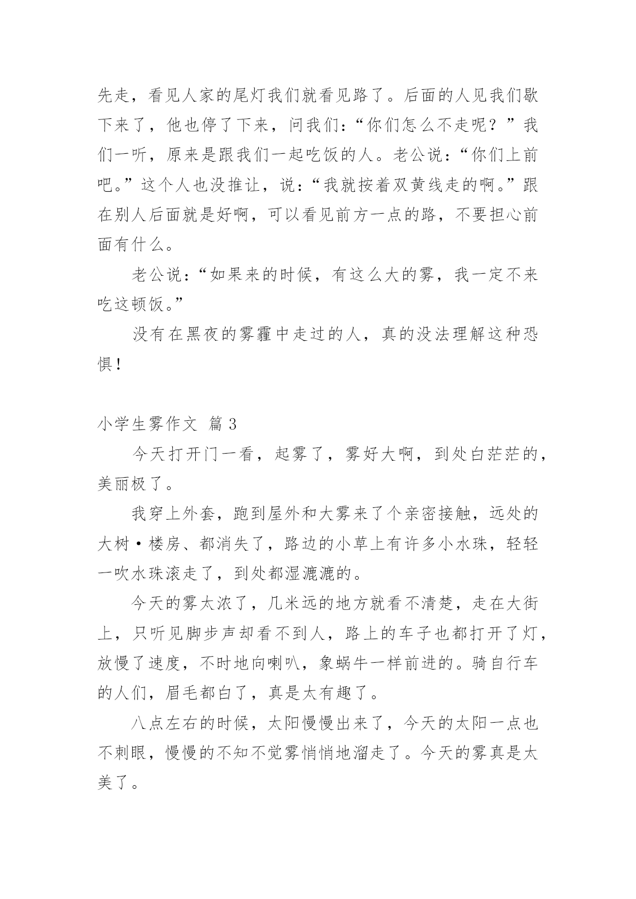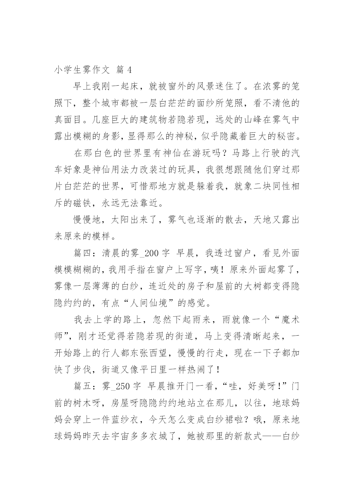 小学生雾作文精选小学生雾作文合集9篇无论在学习、工作或是生活中,大家对作文都再熟悉不过了吧,借助作文人们可以实现文化交流的目的。作文的注意事项有许多,你确定会写吗?以下是小编整理的小学生雾作文9篇,供大家参考借鉴,希望可以帮助到有需要的朋友。小学生雾作文篇1雾凇沆砀,山顶云雾缭绕,不见曦月。题记几天的准备后,我们终于踏上了旅程。天空中几片乌云,随风飘移,淅淅沥沥的小雨终于还是落下,路旁的树被染得碧绿,这时的树,比新生时浓郁,比苍老时富有活力。目光移动着,欣赏着富有生机的绿色;车在移动着,飞驰过片片绿色。到达了我们的目的地泰山。在山脚下吃过午饭后,我们开始了登山。妈妈说,原来她的姥姥来爬山时,4000多次台阶,一级一级的磕头,直到山顶。我都不敢想象,到了山顶时他们的样子,那是封建思想带给他们的痛苦。知识改变命运,真的是这样的,无论在什么时候,什么地方。不知不觉,已至山腰,山雨开始下起来了,密密的,就像是一张密织的网,天空的阴暗,山雨的细密,抬头是一望无际的台阶和巨大的山石,这一切都让我觉得有莫名的恐惧和紧张。但山顶的那片云雾,让我觉得特别神秘,是它支撑着我向上爬。人总是要有信念的,那片云雾就是我的信念,终于,爬到了中天门,我也是身在云雾中了,即使雾气和细雨打湿了我的头发,但我依然很兴奋,因为这是我努力的结果。石阶陡险,有几次几近滑倒。但我一路向前的信念并没有因此而中断、停止或退缩。一路向前!山顶就在不远方了,两边的树为我加油,顺势而下的水为我鼓掌,堆砌在路边的石头给我鼓励。一切都让我觉得充满力量与活力!!!努力与汗水铸造了成功,我终于踏入了山顶的雾中。小学生雾作文篇2昨天,我们亲戚家小孩结婚,我们就去海安吃饭了。回来的时候,突然雾变大了。我从没见过这么大的雾,不到一米的能见度。幸好,我们知道这条路是向北的。地上的双黄线这时就成了指南针。我们用比走路还慢的速度在前行。一会儿,后面有辆车,老公停下说,让他先走。那家伙上了我们前,就像个喝了酒的人,在路上画八字。一会儿,把个车子开上了西。可能觉得不对,就下车了,问我们上哪的。老公就问他:“你想上哪儿?”他说:“我上北。”老公说:“你上西了。”那个人又把车掉过头来。我们就猜,那个人肯定没往地上向,因为双黄线是直的啊。小伙子就是胆大啊,一会儿又看不见了。过了一会儿,后面又有一辆车。老公很谦虚,说让人家先走,看见人家的尾灯我们就看见路了。后面的人见我们歇下来了,他也停了下来,问我们:“你们怎么不走呢?”我们一听,原来是跟我们一起吃饭的人。老公说:“你们上前吧。”这个人也没推让,说:“我就按着双黄线走的啊。”跟在别人后面就是好啊,可以看见前方一点的路,不要担心前面有什么。老公说:“如果来的时候,有这么大的雾,我一定不来吃这顿饭。”没有在黑夜的雾霾中走过的人,真的没法理解这种恐惧!小学生雾作文篇3今天打开门一看,起雾了,雾好大啊,到处白茫茫的,美丽极了。我穿上外套,跑到屋外和大雾来了个亲密接触,远处的大树·楼房、都消失了,路边的小草上有许多小水珠,轻轻一吹水珠滚走了,到处都湿漉漉的。今天的雾太浓了,几米远的地方就看不清楚,走在大街上,只听见脚步声却看不到人,路上的车子也都打开了灯,放慢了速度,不时地向喇叭,象蜗牛一样前进的。骑自行车的人们,眉毛都白了,真是太有趣了。八点左右的时候,太阳慢慢出来了,今天的太阳一点也不刺眼,慢慢的不知不觉雾悄悄地溜走了。今天的雾真是太美了。小学生雾作文篇4早上我刚一起床,就被窗外的风景迷住了。在浓雾的笼照下,整个城市都被一层白茫茫的面纱所笼照,看不清他的真面目。几座巨大的建筑物若隐若现,远处的山峰在雾气中露出模糊的身影,显得那么的神秘,似乎隐藏着巨大的秘密。在那白色的世界里有神仙在游玩吗?马路上行驶的汽车好象是神仙用法力改装过的玩具,我很想跟随他们穿过那片白茫茫的世界,可惜那地方就是躲着我,就象二块同性相斥的磁铁,永远无法靠近。慢慢地,太阳出来了,雾气也逐渐的散去,天地又露出来原来的模样。篇四:清晨的雾_200字早晨,我透过窗户,看见外面模模糊糊的,我用手指在窗户上写字,咦!原来外面起雾了,雾像一层薄薄的白纱,连近处的房子和屋前的大树都变得隐隐约约的,有点“人间仙境”的感觉。我去上学的路上,忽然下起雨来,雨就像一个“魔术师”,刚才还觉得若隐若现的街道,马上变得清晰起来,一开始路上的行人都东张西望,慢慢的行走,现在一下子都加快了步伐,街道又像平日里一样热闹了!篇五:雾_250字早晨推开门一看,“哇,好美呀!”门前的树木呀,房屋呀隐隐约约地站立在那儿,以往,地球妈妈会穿上一件蓝纱衣,今天怎么变成白纱裙啦?哦,原来地球妈妈昨天去宇宙多多衣城了,她被那里的新款式——白纱裙深深吸引住了,她把它买下来了,本来是想参加舞会穿的,可她和我一样耐不住性子,今天一大早就穿上了。咦,